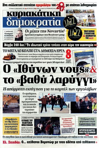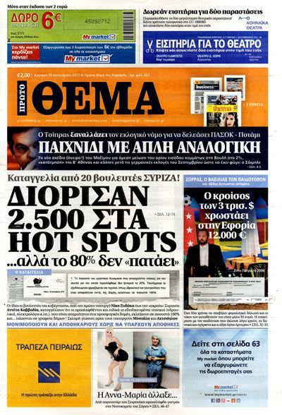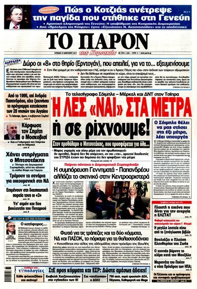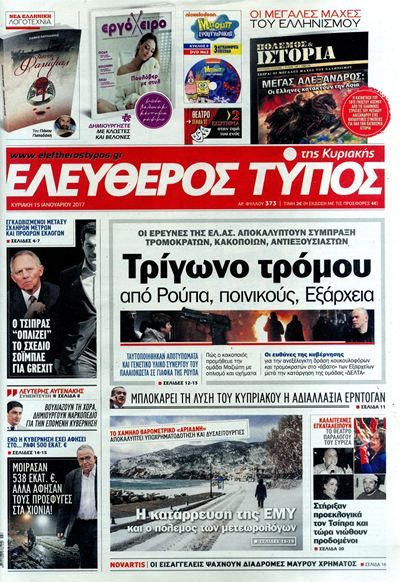 Οι πολιτικές εφημερίδες 15/01/2017 Κώστας Τεό 04:44, Κυριακή 15 Ιανουαρίου 2017 Media Διαβάστε τα σημερινά πρωτοσέλιδα των πολιτικών εφημερίδων: ΠΟΛΙΤΙΚΕΣ ΕΦΗΜΕΡΙΔΕΣ ΠΡΩΤΟΣΕΛΙΔΑ Μοιράσου το: σχολίασε κι εσύ (0 σχόλια) Ακολουθήστε το enikos.gr στο Google News και μάθετε πρώτοι όλες τις ειδήσεις Δείτε όλες τις τελευταίες ειδήσεις από την Ελλάδα και τον Κόσμο στο enikos.gr Ειδήσεις Ροή Ειδήσεων 2 ώρες πριν Αυξάνουν την πίεση προς την κυβέρνηση οι αγρότες: Κλείνουν παρακαμπτήριους και ανοίγουν διόδια – Τι θα γίνει τις γιορτές 40 λεπτά πριν ΟΠΕΚΕΠΕ: Προφυλακιστέος ο φερόμενος αρχηγός και ο λογιστής της εγκληματικής οργάνωσης 2 ώρες πριν Φοινικούντα: Το Σάββατο απολογείται ο 30χρονος γιος γνωστού επιχειρηματία της Πλάκας που παραδόθηκε – Όσα είπε στους αστυνομικούς και ο ρόλος του στο έγκλημα 1 ώρα πριν Μπορεί ο Μαδούρο να αντέξει τον αποκλεισμό του Τραμπ; Τι θα χρειαστεί η Ουάσινγκτον για να τον ανατρέψει 3 ώρες πριν Πρίγκιπας Ουίλιαμ – Κέιτ: Η νέα οικογενειακή φωτογραφία για τις Χριστουγεννιάτικες κάρτες του 2025 2 ώρες πριν Ύπνος: Η απλή βραδινή ρουτίνα για να προστατεύσετε τα μαλλιά σας από το κρύο κατά τη διάρκεια του χειμώνα 3 ώρες πριν Manifesting: Πώς να συναντήσετε τον σύντροφο της ζωής σας, ανάλογα με τον μήνα γέννησής σας 2 ημέρες πριν 20 χρόνια τα Χριστούγεννα ξεκινούν στα Public με μεγάλη ποικιλία σε δώρα! 1 ώρα πριν Αρχαιολόγοι ανακάλυψαν ρωμαϊκά τεχνουργήματα από μια πόλη που δεν υπήρξε ποτέ – Τα τρία εντυπωσιακά κτίρια και ο αμφορέας με τις… σαρδέλες 19 λεπτά πριν ΑΕΚ – Κραϊόβα 3-2: Επική ανατροπή και πρόκριση στους «16» του Conference League η Ένωση 40 λεπτά πριν ΟΠΕΚΕΠΕ: Προφυλακιστέος ο φερόμενος αρχηγός και ο λογιστής της εγκληματικής οργάνωσης 50 λεπτά πριν Αθηνά Μαξίμου: Η τρυφερή ανάρτηση για τα γενέθλια του Αιμίλιου Χειλάκη – «Είναι η εκλεκτική συγγένειά μου, η επιλογή και η ευθύνη μου» 1 ώρα πριν Παναθηναϊκός – Χάποελ Τελ Αβίβ 93-82: Με… φόρα από την Κωνσταντινούπολη 1 ώρα πριν Μπορεί ο Μαδούρο να αντέξει τον αποκλεισμό του Τραμπ; Τι θα χρειαστεί η Ουάσινγκτον για να τον ανατρέψει ENIKOS NETWORK Σε περίοδο αυξημένης δραστηριότητας η γρίπη στην Ελλάδα-Μέτρα προστασίας από τον ΕΟΔΥ Σκέφτεστε συνέχεια συζητήσεις που έχετε κάνει; Τι σημαίνει αυτό, σύμφωνα με ειδικό Στεγαστικό: Τι λέει η ΠΟΜΙΔΑ για τα νέα μέτρα που ανακοίνωσε ο Κυριάκος Μητσοτάκης Λαγκάρντ: Αισιόδοξη για την ανάπτυξη της Ευρωζώνης, αβέβαιη για τον πληθωρισμό Χαρτογραφώντας το «σημείο χωρίς επιστροφή»: Για πρώτη φορά αποκαλύπτεται με λεπτομέρεια το ακανθώδες όριο της ατμόσφαιρας τ... Η Google καταργεί τη λειτουργία «dark web report» – Πώς θα μπορούν οι χρήστες να διαγράφουν τα δεδομένα τους περισσότερα 17:45 , Πέμπτη 18 Δεκεμβρίου 2025 ROUK ZOUK: Εορταστικό επεισόδιο με καλεσμένους τους πρωταγωνιστές του «Γιατί ρε πατέρα» Το Σάββατο 20 Δεκεμβρίου στις 21:00, η Ζέτα Μακρυπούλια υποδέχεται εκλεκτούς ηθοποιούς που όλο... 17:20 , Πέμπτη 18 Δεκεμβρίου 2025 Άγιος έρωτας: Η Χριστίνα εξομολογείται στον πατέρα Νικόλαο, απόψε στις 21:00 στον Alpha Η Νότα αποφασίζει να εκδικηθεί τον Πέτρο και τον Στέφανο, για χάρη του Λούη, όμως τα πράγματα ... 16:50 , Πέμπτη 18 Δεκεμβρίου 2025 Να μ’ αγαπάς: Ζωή και Φωτεινή συμφιλιώνονται ως μάνα με κόρη, απόψε στις 20:00 Η ταυτότητα του Άγγελου αποκαλύπτεται στο νέο επεισόδιο της σειράς “Να μ’ αγαπάς... 15:52 , Πέμπτη 18 Δεκεμβρίου 2025 Το Σπίτι Δίπλα Στο Ποτάμι: Το καθηλωτικό τελευταίο επεισόδιο για το 2025 απόψε στις 22:30 Καθηλώνει το σημερινό