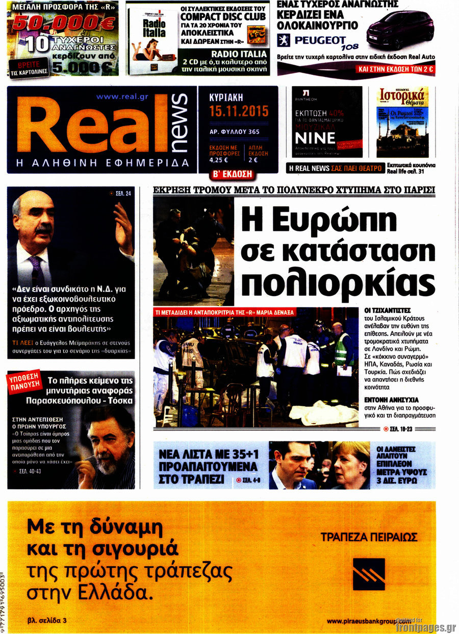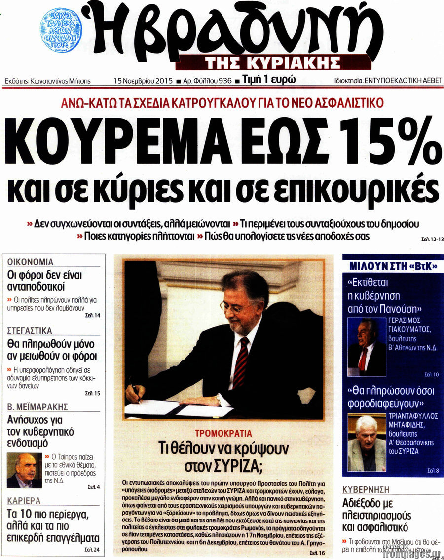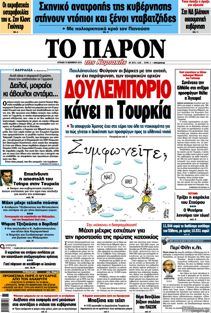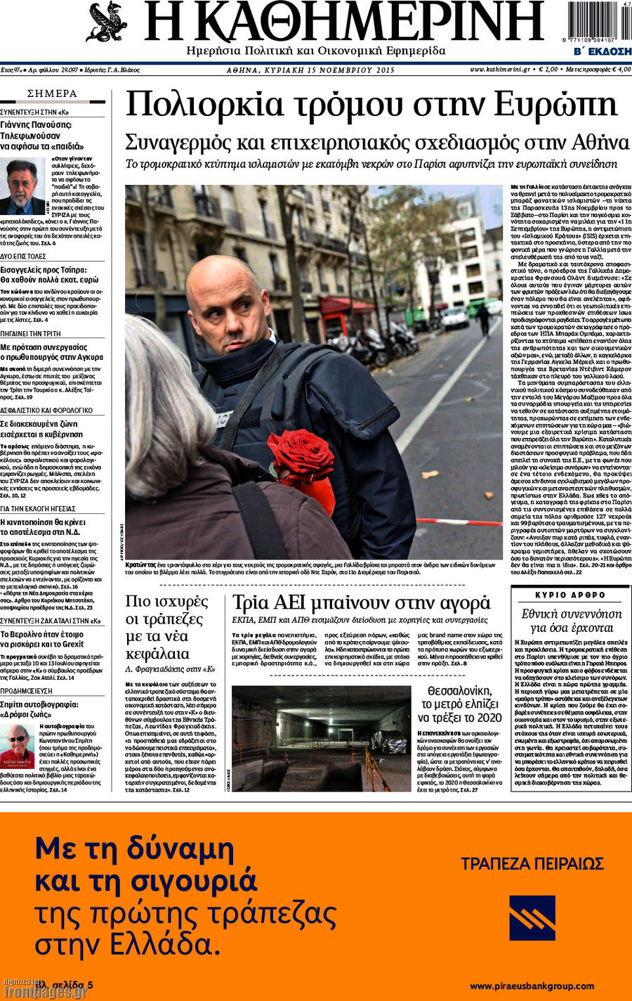 Οι πολιτικές εφημερίδες 15/11/2015 Enikos Newsroom 07:57, Κυριακή 15 Νοεμβρίου 2015 Media Διαβάστε τα σημερινά πρωτοσέλιδα των πολιτικών εφημερίδων: ΠΟΛΙΤΙΚΕΣ ΕΦΗΜΕΡΙΔΕΣ ΠΡΩΤΟΣΕΛΙΔΑ Μοιράσου το: σχολίασε κι εσύ (0 σχόλια) Ακολουθήστε το enikos.gr στο Google News και μάθετε πρώτοι όλες τις ειδήσεις Δείτε όλες τις τελευταίες ειδήσεις από την Ελλάδα και τον Κόσμο στο enikos.gr Ειδήσεις Ροή Ειδήσεων 1 ώρα πριν Χριστούγεννα στα μπλόκα: Επιμένουν στις κινητοποιήσεις τους οι αγρότες – Ανοίγουν τα διόδια το Σαββατοκύριακο 2 ώρες πριν Ουκρανία: Η άνευ προηγουμένου επίθεση σε ρωσικό τάνκερ στη Μεσόγειο και το μήνυμα προς στον Πούτιν – Το «μακρύ χέρι» του Κιέβου 1 ώρα πριν Πούτιν: Τα μηνύματα σε Ευρώπη και ΝΑΤΟ από το μαραθώνιο «σόου» του – Η απαίτηση για «σεβασμό» και η ειρήνη «με τους όρους» της Μόσχας 2 ώρες πριν Τραμπ: Δεν αποκλείει την πιθανότητα ενός πολέμου στη Βενεζουέλα – «Ο Μαδούρο ξέρει καλύτερα από τον καθένα τι ακριβώς θέλω» 3 ώρες πριν Συνεχίζει να προκαλεί ο Μίτσκοσκι: «Για μένα το όνομα Μακεδονία είναι ιερό» 1 ώρα πριν Ανακαλύφθηκαν αρχαία χρυσά νομίσματα 2.200 ετών που απεικονίζουν τον θεό Απόλλωνα – Η άγνωστη σύνδεση με τον Φίλιππο Β΄ της Μακεδονίας 2 ώρες πριν Ύπνος: Μια κρυφή κατάσταση του εγκεφάλου πριν από τον ύπνο μπορεί να είναι το “κλειδί” για υψηλή ευφυΐα και δημιουργικότητα 3 ώρες πριν Αριθμολογία: Οι άνθρωποι που έχουν γεννηθεί αυτές τις 4 ημερομηνίες, συχνά παρεξηγούνται – «Η καλοσύνη τους κρύβει τεράστια δύναμη» 4 ώρες πριν Ξεχάστε το καθάρισμα το Σαββατοκύριακο: Ο «κανόνας των 20 λεπτών» που θα σας λύσει τα χέρια 5 λεπτά πριν Πόλεμος στην Ουκρανία: Εφτά νεκροί από ρωσική πυραυλική επίθεση στο λιμάνι της Οδησσού 9 λεπτά πριν ΗΠΑ: Η κυβέρνηση του Ντόναλντ Τραμπ άρχισε να δημοσιοποιεί τα αρχεία Έπσταϊν 20 λεπτά πριν Σάμος: Άνοιξε το μπλόκο των αγροτών στον κόμβο Κοκκαρίου – Σε νέα συνεδρίαση θα καθορίσουν την στάση τους 28 λεπτά πριν Άνω Λιόσια: Πυροβολισμοί σε επιχείρηση με χαλιά – Εντοπίστηκαν 10 κάλυκες 36 λεπτά πριν Γάζα: Ισραηλινό πλήγμα σε σχολείο που είχαν καταφύγει εκτοπισμένοι – Τουλάχιστον έξι νεκροί ENIKOS NETWORK Το ΕΚΑΒ τιμήθηκε από την Ακαδημία Αθηνών για τα 40 χρόνια προσφοράς του Έχετε πραγματικά μεγάλη καρδιά; 10 χαρακτηριστικά όσων έχουν καλοσύνη Αναστολή μέτρων αναγκαστικής εκτέλεσης για κτηνοτρόφους που πλήττονται από την ευλογιά των αιγοπροβάτων Πλήρης επάρκεια προϊόντων στις λαϊκές της Αττικής, παρά τις αγροτικές κινητοποιήσεις – Τι απαντούν οι πωλητές Χαρτογραφώντας το «σημείο χωρίς επιστροφή»: Για πρώτη φορά αποκαλύπτεται με λεπτομέρεια το ακανθώδες όριο της ατμόσφαιρας τ... Η Google καταργεί τη λειτουργία «dark web report» – Πώς θα μπορούν οι χρήστες να διαγράφουν τα δεδομένα τους περισσότερα 22:42 , Παρασκευή 19 Δεκεμβρίου 2025 Γιώργος Γιαννόπουλος για “Το σόι σου”: “Είναι ευτυχία και ευλογία αυτή η σειρά” «Είναι ευτυχία και ευλογία η συγκυρία αυτής της σειράς», θα πει ο Γιώργος Γιαννόπουλος -ο αγαπ... 20:37 , Παρασκευή 19 Δεκεμβρίου 2025 Don’t Forget The Lyrics: Η Έλλη Κοκκίνου υποδέχεται 4 παίκτες που θα κάνουν τα πάντα για να μη χάσουν ούτε… μισή λέξη από τους στίχους Το «Don’t Forget The Lyrics» επιστρέφει απόψε, Παρασκευή 19 Δεκεμβρίου, στις 21:00 με νέο επει... 19:31 , Παρασκευή 19 Δεκεμβρίου 2025 GNTM: Απόψε ο μεγάλος τελικός για τους 4 φιναλίστ Έπειτα από μήνες γεμάτους μόδα, δημιουργία και έντονες αναμετρήσεις, το GNTM 2025 κορυφώνεται,... 18:11 , Παρασκευή 19 Δεκεμβρίου 2025 Το σόι σου: Ο Ά