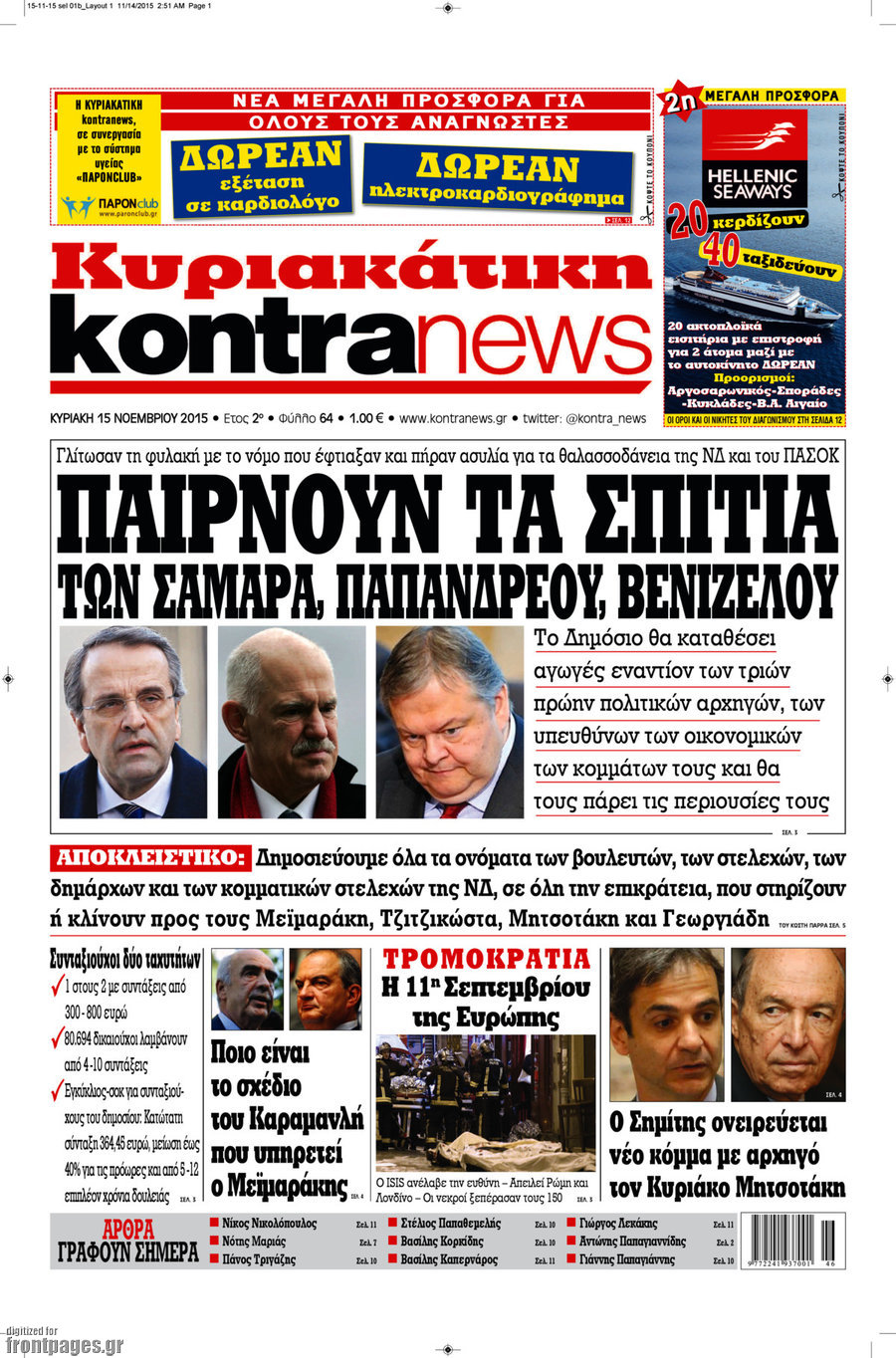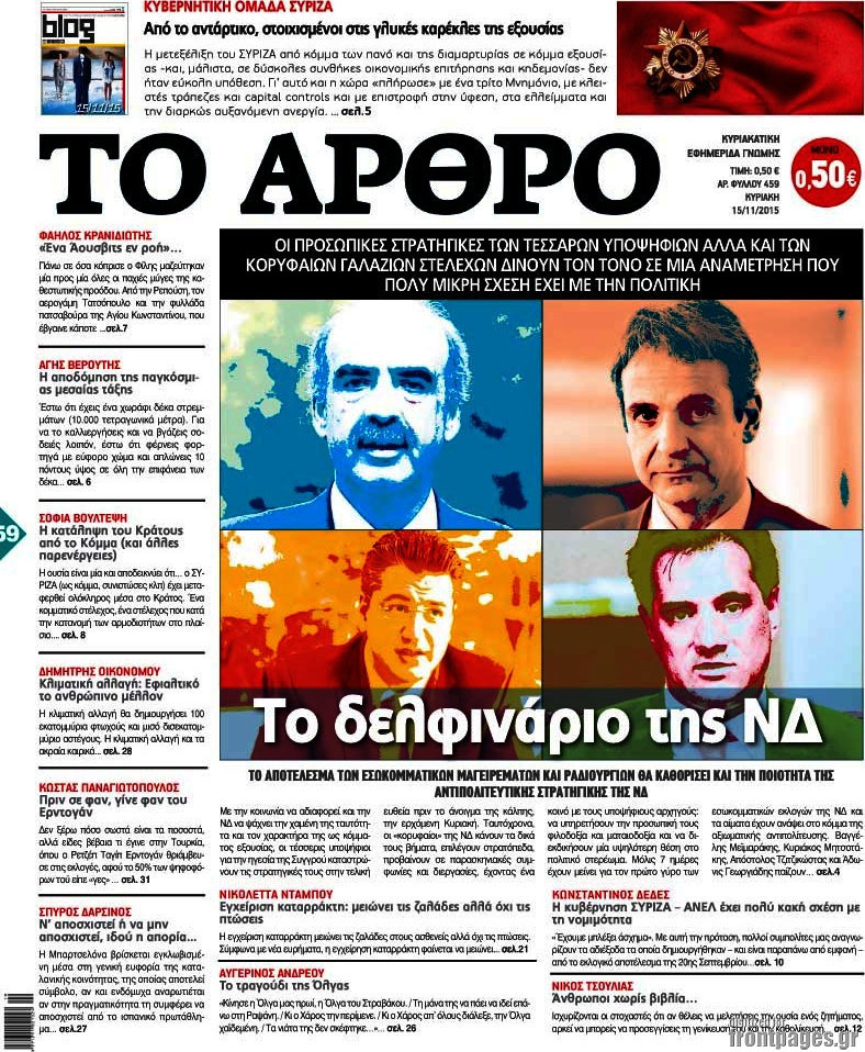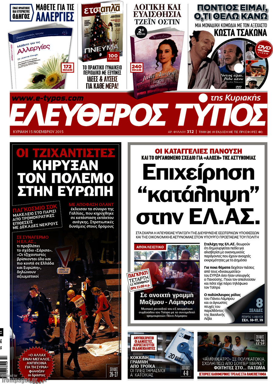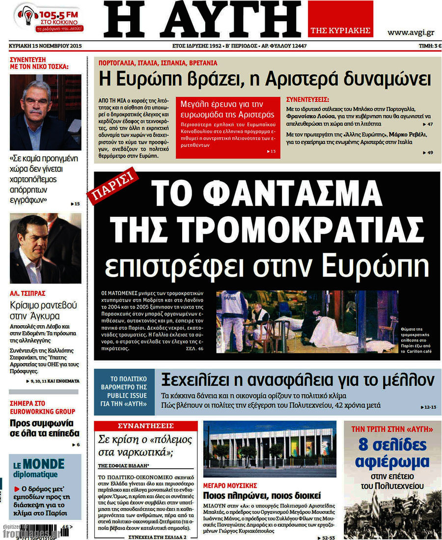 Οι πολιτικές εφημερίδες 15/11/2015 Enikos Newsroom 07:57, Κυριακή 15 Νοεμβρίου 2015 Media Διαβάστε τα σημερινά πρωτοσέλιδα των πολιτικών εφημερίδων: ΠΟΛΙΤΙΚΕΣ ΕΦΗΜΕΡΙΔΕΣ ΠΡΩΤΟΣΕΛΙΔΑ Μοιράσου το: σχολίασε κι εσύ (0 σχόλια) Ακολουθήστε το enikos.gr στο Google News και μάθετε πρώτοι όλες τις ειδήσεις Δείτε όλες τις τελευταίες ειδήσεις από την Ελλάδα και τον Κόσμο στο enikos.gr Ειδήσεις Ροή Ειδήσεων 1 ώρα πριν Χριστούγεννα στα μπλόκα: Επιμένουν στις κινητοποιήσεις τους οι αγρότες – Ανοίγουν τα διόδια το Σαββατοκύριακο 2 ώρες πριν Ουκρανία: Η άνευ προηγουμένου επίθεση σε ρωσικό τάνκερ στη Μεσόγειο και το μήνυμα προς στον Πούτιν – Το «μακρύ χέρι» του Κιέβου 1 ώρα πριν Πούτιν: Τα μηνύματα σε Ευρώπη και ΝΑΤΟ από το μαραθώνιο «σόου» του – Η απαίτηση για «σεβασμό» και η ειρήνη «με τους όρους» της Μόσχας 2 ώρες πριν Τραμπ: Δεν αποκλείει την πιθανότητα ενός πολέμου στη Βενεζουέλα – «Ο Μαδούρο ξέρει καλύτερα από τον καθένα τι ακριβώς θέλω» 3 ώρες πριν Συνεχίζει να προκαλεί ο Μίτσκοσκι: «Για μένα το όνομα Μακεδονία είναι ιερό» 1 ώρα πριν Ανακαλύφθηκαν αρχαία χρυσά νομίσματα 2.200 ετών που απεικονίζουν τον θεό Απόλλωνα – Η άγνωστη σύνδεση με τον Φίλιππο Β΄ της Μακεδονίας 2 ώρες πριν Ύπνος: Μια κρυφή κατάσταση του εγκεφάλου πριν από τον ύπνο μπορεί να είναι το “κλειδί” για υψηλή ευφυΐα και δημιουργικότητα 3 ώρες πριν Αριθμολογία: Οι άνθρωποι που έχουν γεννηθεί αυτές τις 4 ημερομηνίες, συχνά παρεξηγούνται – «Η καλοσύνη τους κρύβει τεράστια δύναμη» 4 ώρες πριν Ξεχάστε το καθάρισμα το Σαββατοκύριακο: Ο «κανόνας των 20 λεπτών» που θα σας λύσει τα χέρια 5 λεπτά πριν Πόλεμος στην Ουκρανία: Εφτά νεκροί από ρωσική πυραυλική επίθεση στο λιμάνι της Οδησσού 9 λεπτά πριν ΗΠΑ: Η κυβέρνηση του Ντόναλντ Τραμπ άρχισε να δημοσιοποιεί τα αρχεία Έπσταϊν 20 λεπτά πριν Σάμος: Άνοιξε το μπλόκο των αγροτών στον κόμβο Κοκκαρίου – Σε νέα συνεδρίαση θα καθορίσουν την στάση τους 28 λεπτά πριν Άνω Λιόσια: Πυροβολισμοί σε επιχείρηση με χαλιά – Εντοπίστηκαν 10 κάλυκες 36 λεπτά πριν Γάζα: Ισραηλινό πλήγμα σε σχολείο που είχαν καταφύγει εκτοπισμένοι – Τουλάχιστον έξι νεκροί ENIKOS NETWORK Το ΕΚΑΒ τιμήθηκε από την Ακαδημία Αθηνών για τα 40 χρόνια προσφοράς του Έχετε πραγματικά μεγάλη καρδιά; 10 χαρακτηριστικά όσων έχουν καλοσύνη Αναστολή μέτρων αναγκαστικής εκτέλεσης για κτηνοτρόφους που πλήττονται από την ευλογιά των αιγοπροβάτων Πλήρης επάρκεια προϊόντων στις λαϊκές της Αττικής, παρά τις αγροτικές κινητοποιήσεις – Τι απαντούν οι πωλητές Χαρτογραφώντας το «σημείο χωρίς επιστροφή»: Για πρώτη φορά αποκαλύπτεται με λεπτομέρεια το ακανθώδες όριο της ατμόσφαιρας τ... Η Google καταργεί τη λειτουργία «dark web report» – Πώς θα μπορούν οι χρήστες να διαγράφουν τα δεδομένα τους περισσότερα 22:42 , Παρασκευή 19 Δεκεμβρίου 2025 Γιώργος Γιαννόπουλος για “Το σόι σου”: “Είναι ευτυχία και ευλογία αυτή η σειρά” «Είναι ευτυχία και ευλογία η συγκυρία αυτής της σειράς», θα πει ο Γιώργος Γιαννόπουλος -ο αγαπ... 20:37 , Παρασκευή 19 Δεκεμβρίου 2025 Don’t Forget The Lyrics: Η Έλλη Κοκκίνου υποδέχεται 4 παίκτες που θα κάνουν τα πάντα για να μη χάσουν ούτε… μισή λέξη από τους στίχους Το «Don’t Forget The Lyrics» επιστρέφει απόψε, Παρασκευή 19 Δεκεμβρίου, στις 21:00 με νέο επει... 19:31 , Παρασκευή 19 Δεκεμβρίου 2025 GNTM: Απόψε ο μεγάλος τελικός για τους 4 φιναλίστ Έπειτα από μήνες γεμάτους μόδα, δημιουργία και έντονες αναμετρήσεις, το GNTM 2025 κορυφώνεται,... 18:11 , Παρασκευή 19 Δεκεμβρίου 2025 Το σόι σου: Ο Ά