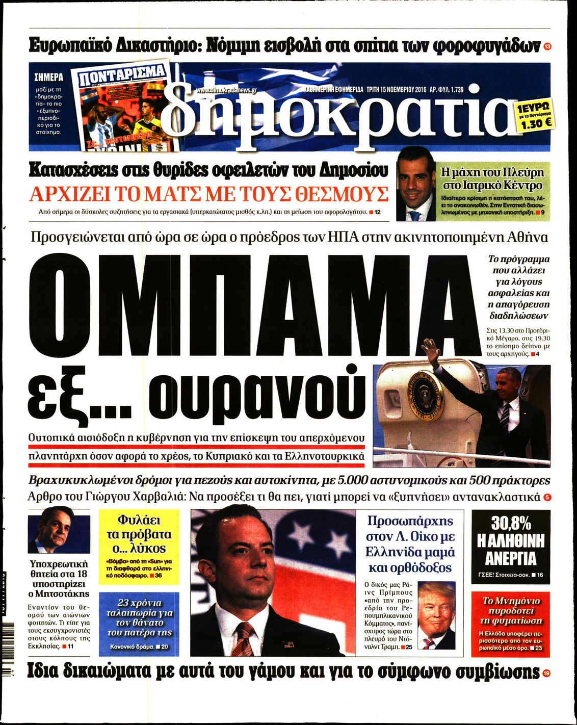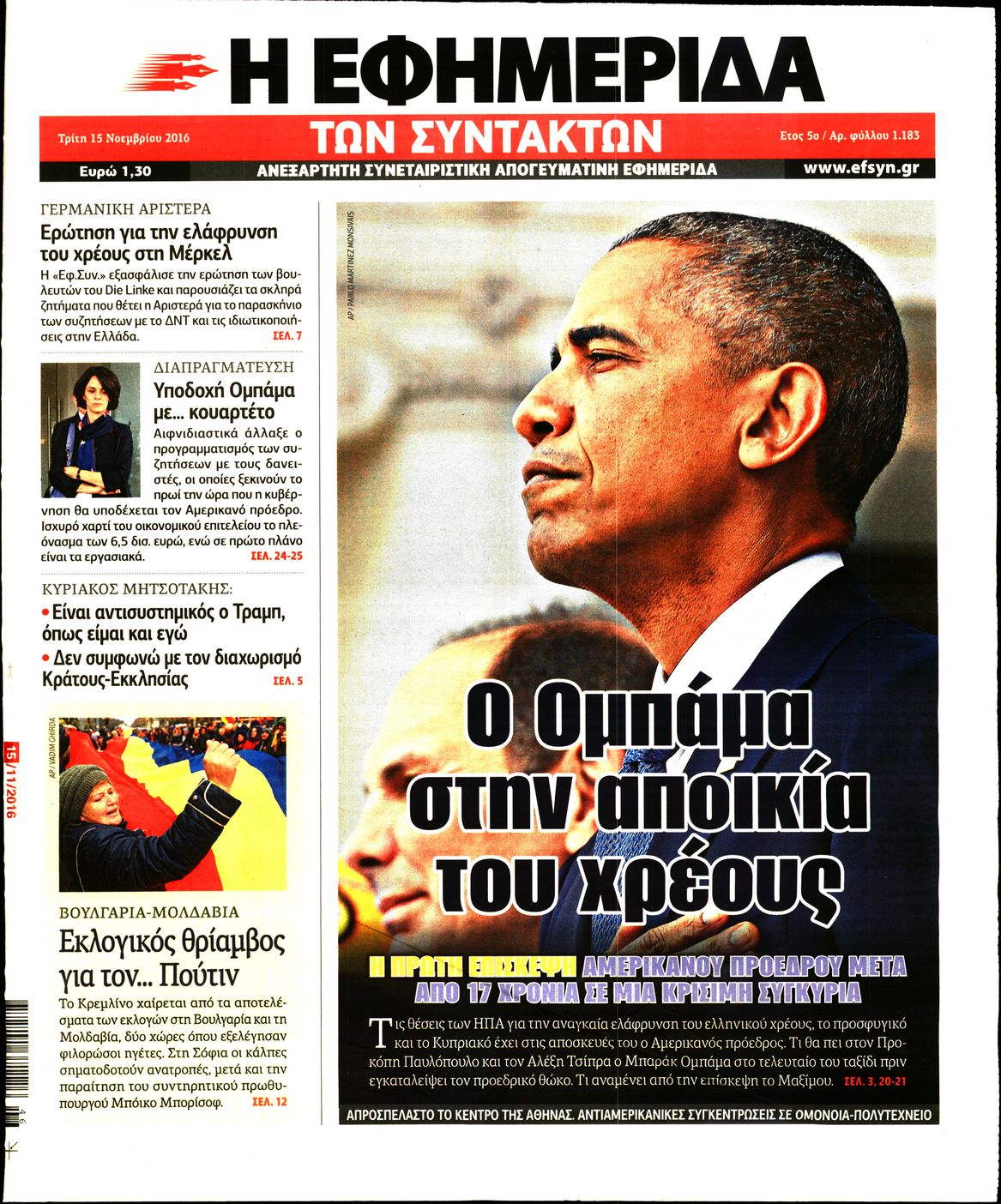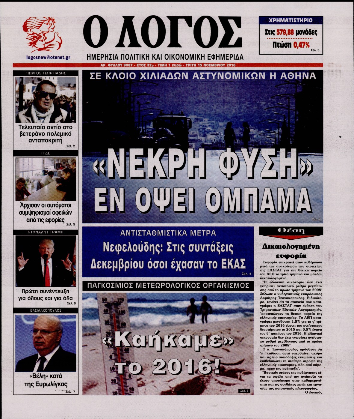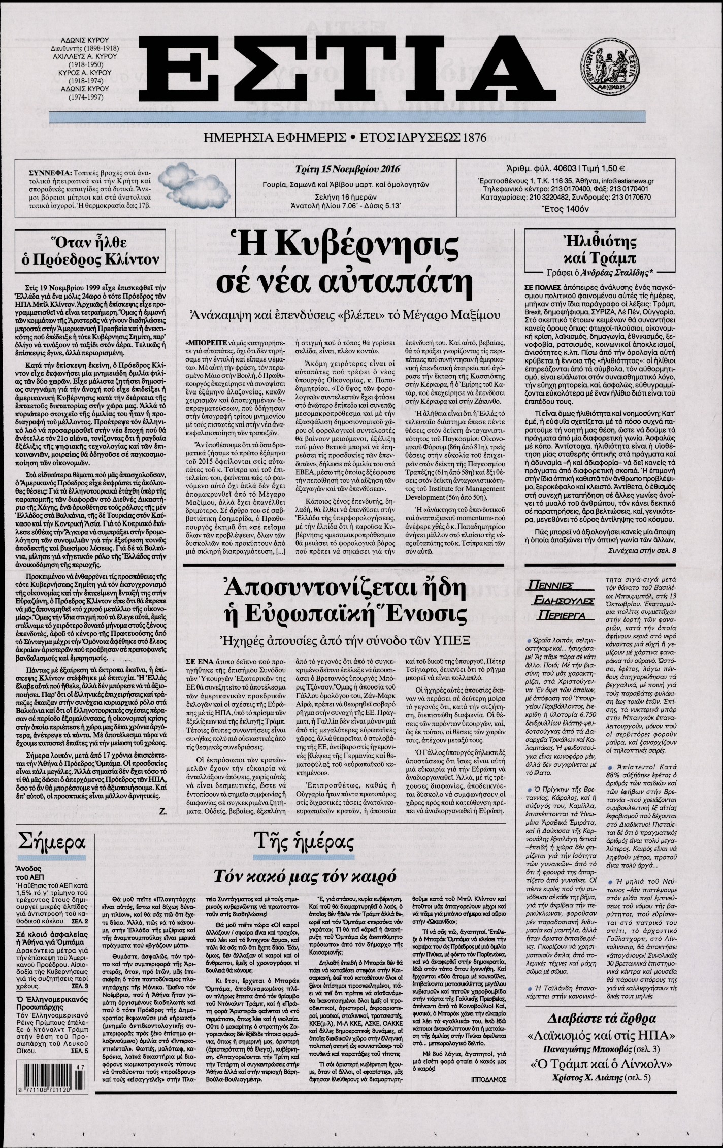 Οι πολιτικές εφημερίδες 15/11/2016 Enikos Newsroom 03:53, Τρίτη 15 Νοεμβρίου 2016 Media Διαβάστε τα σημερινά πρωτοσέλιδα των πολιτικών εφημερίδων: ΠΟΛΙΤΙΚΕΣ ΕΦΗΜΕΡΙΔΕΣ ΠΡΩΤΟΣΕΛΙΔΑ Μοιράσου το: σχολίασε κι εσύ (0 σχόλια) Ακολουθήστε το enikos.gr στο Google News και μάθετε πρώτοι όλες τις ειδήσεις Δείτε όλες τις τελευταίες ειδήσεις από την Ελλάδα και τον Κόσμο στο enikos.gr Ειδήσεις Ροή Ειδήσεων 51 λεπτά πριν Χριστούγεννα στα μπλόκα: Επιμένουν στις κινητοποιήσεις τους οι αγρότες – Ανοίγουν τα διόδια το Σαββατοκύριακο 1 ώρα πριν Ουκρανία: Η άνευ προηγουμένου επίθεση σε ρωσικό τάνκερ στη Μεσόγειο και το μήνυμα προς στον Πούτιν – Το «μακρύ χέρι» του Κιέβου 29 λεπτά πριν Πούτιν: Τα μηνύματα σε Ευρώπη και ΝΑΤΟ από το μαραθώνιο «σόου» του – Η απαίτηση για «σεβασμό» και η ειρήνη «με τους όρους» της Μόσχας 1 ώρα πριν Τραμπ: Δεν αποκλείει την πιθανότητα ενός πολέμου στη Βενεζουέλα – «Ο Μαδούρο ξέρει καλύτερα από τον καθένα τι ακριβώς θέλω» 2 ώρες πριν Συνεχίζει να προκαλεί ο Μίτσκοσκι: «Για μένα το όνομα Μακεδονία είναι ιερό» 4 ώρες πριν Πούτιν: «Ναι, είμαι ερωτευμένος» – Βίντεο από τη σπάνια προσωπική παραδοχή του 2 ώρες πριν Αριθμολογία: Οι άνθρωποι που έχουν γεννηθεί αυτές τις 4 ημερομηνίες, συχνά παρεξηγούνται – «Η καλοσύνη τους κρύβει τεράστια δύναμη» 1 ώρα πριν Ύπνος: Μια κρυφή κατάσταση του εγκεφάλου πριν από τον ύπνο μπορεί να είναι το “κλειδί” για υψηλή ευφυΐα και δημιουργικότητα 3 ώρες πριν Ξεχάστε το καθάρισμα το Σαββατοκύριακο: Ο «κανόνας των 20 λεπτών» που θα σας λύσει τα χέρια 30 λεπτά πριν Ανακαλύφθηκαν αρχαία χρυσά νομίσματα 2.200 ετών που απεικονίζουν τον θεό Απόλλωνα – Η άγνωστη σύνδεση με τον Φίλιππο Β΄ της Μακεδονίας 14 λεπτά πριν Ολυμπιακός – Βιλερμπάν 107-84: Επιστροφή στις νίκες με… προπόνηση 20 λεπτά πριν Νέος Κόσμος: Συνελήφθη 41χρονος με ένταλμα από την Τουρκία για εμπόριο ναρκωτικών και ληστεία 29 λεπτά πριν Πούτιν: Τα μηνύματα σε Ευρώπη και ΝΑΤΟ από το μαραθώνιο «σόου» του – Η απαίτηση για «σεβασμό» και η ειρήνη «με τους όρους» της Μόσχας 30 λεπτά πριν Ανακαλύφθηκαν αρχαία χρυσά νομίσματα 2.200 ετών που απεικονίζουν τον θεό Απόλλωνα – Η άγνωστη σύνδεση με τον Φίλιππο Β΄ της Μακεδονίας 35 λεπτά πριν Νίκος Ξυλούρης: Συγκινεί η χήρα του σπουδαίου καλλιτέχνη – «Ευχαριστώ όλο τον κόσμο που τον κρατάει ζωντανό 45 χρόνια» ENIKOS NETWORK Το ΕΚΑΒ τιμήθηκε από την Ακαδημία Αθηνών για τα 40 χρόνια προσφοράς του Έχετε πραγματικά μεγάλη καρδιά; 10 χαρακτηριστικά όσων έχουν καλοσύνη Αναστολή μέτρων αναγκαστικής εκτέλεσης για κτηνοτρόφους που πλήττονται από την ευλογιά των αιγοπροβάτων Πλήρης επάρκεια προϊόντων στις λαϊκές της Αττικής, παρά τις αγροτικές κινητοποιήσεις – Τι απαντούν οι πωλητές Χαρτογραφώντας το «σημείο χωρίς επιστροφή»: Για πρώτη φορά αποκαλύπτεται με λεπτομέρεια το ακανθώδες όριο της ατμόσφαιρας τ... Η Google καταργεί τη λειτουργία «dark web report» – Πώς θα μπορούν οι χρήστες να διαγράφουν τα δεδομένα τους περισσότερα 22:42 , Παρασκευή 19 Δεκεμβρίου 2025 Γιώργος Γιαννόπουλος για “Το σόι σου”: “Είναι ευτυχία και ευλογία αυτή η σειρά” «Είναι ευτυχία και ευλογία η συγκυρία αυτής της σειράς», θα πει ο Γιώργος Γιαννόπουλος -ο αγαπ... 20:37 , Παρασκευή 19 Δεκεμβρίου 2025 Don’t Forget The Lyrics: Η Έλλη Κοκκίνου υποδέχεται 4 παίκτες που θα κάνουν τα πάντα για να μη χάσουν ούτε… μισή λέξη από τους στίχους Το «Don’t Forget The Lyrics» επιστρέφει απόψε, Παρασκευή 19 Δεκεμβρίου, στις 21:00 με νέο επει... 19:31 , Παρασκευή 