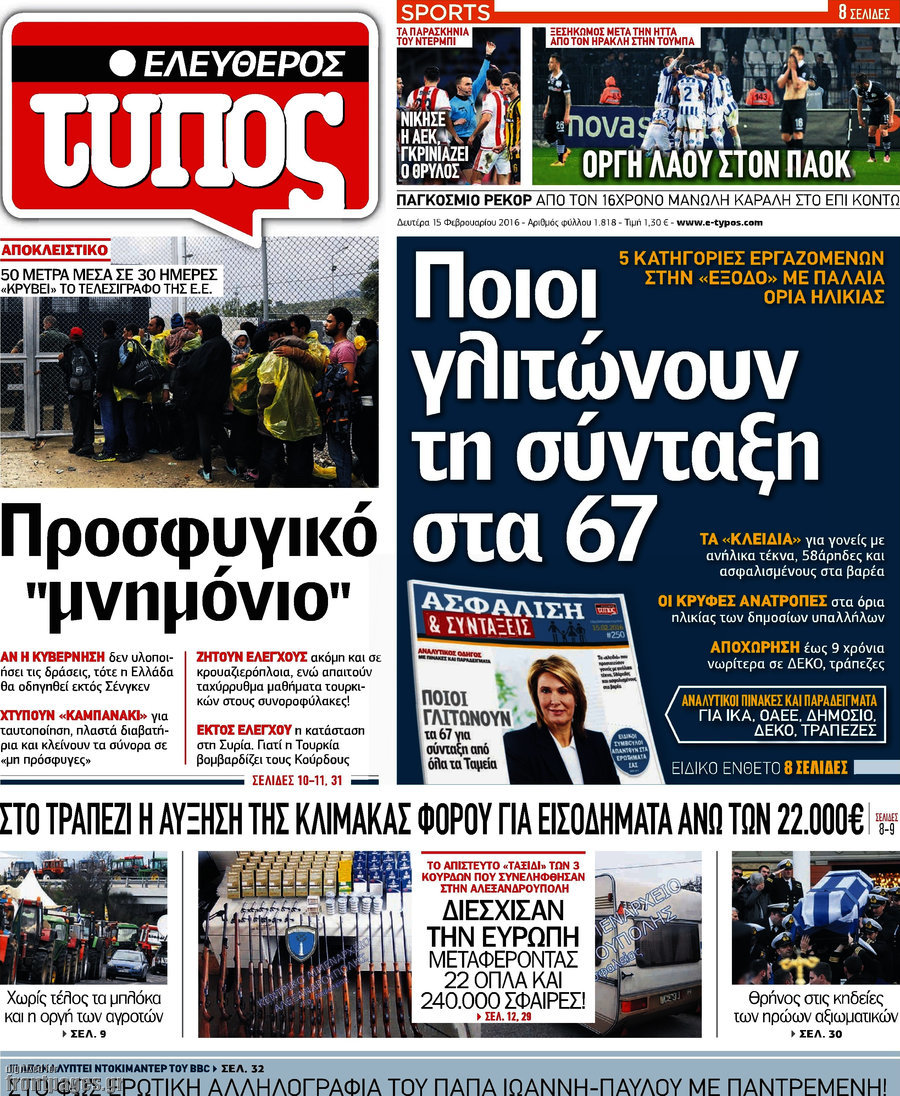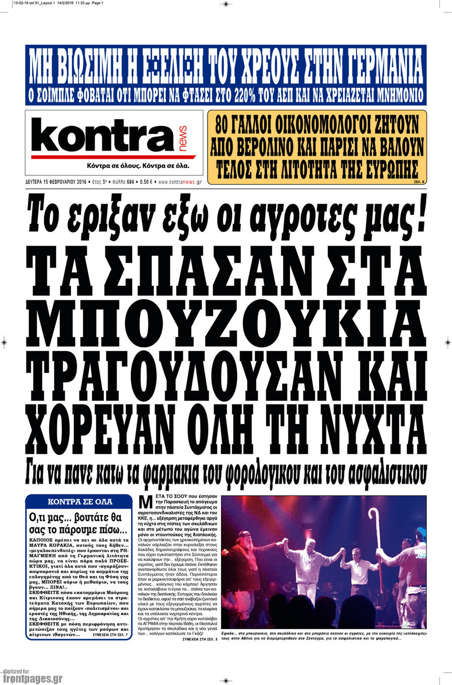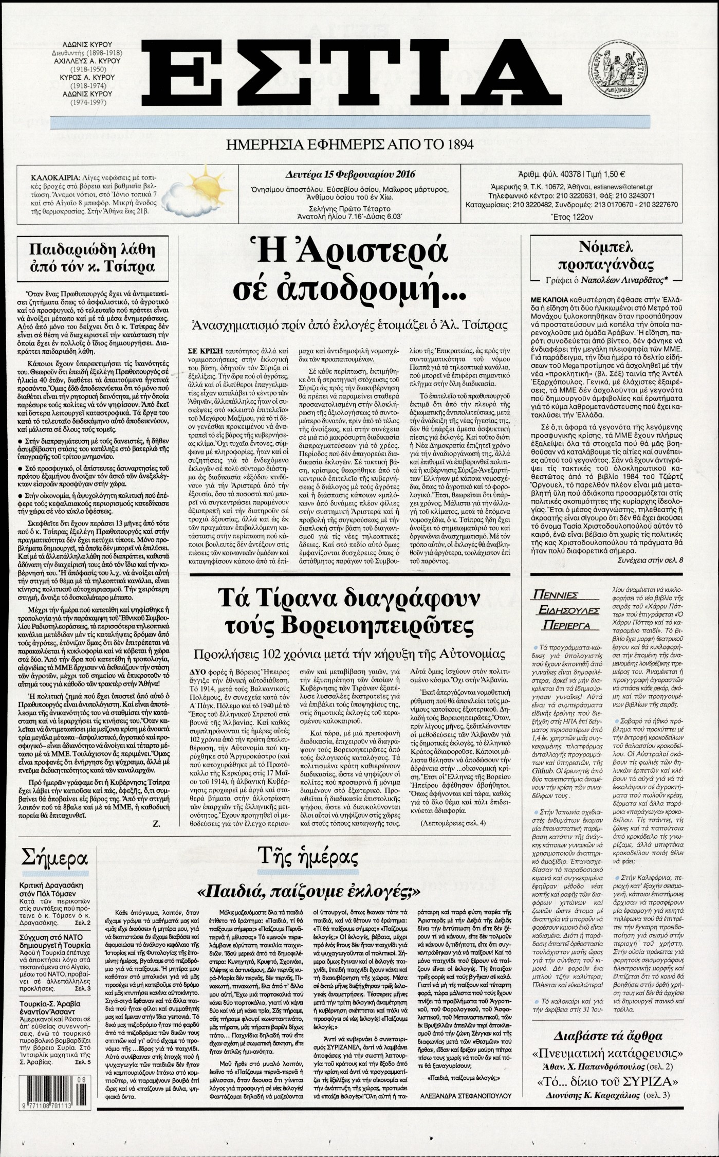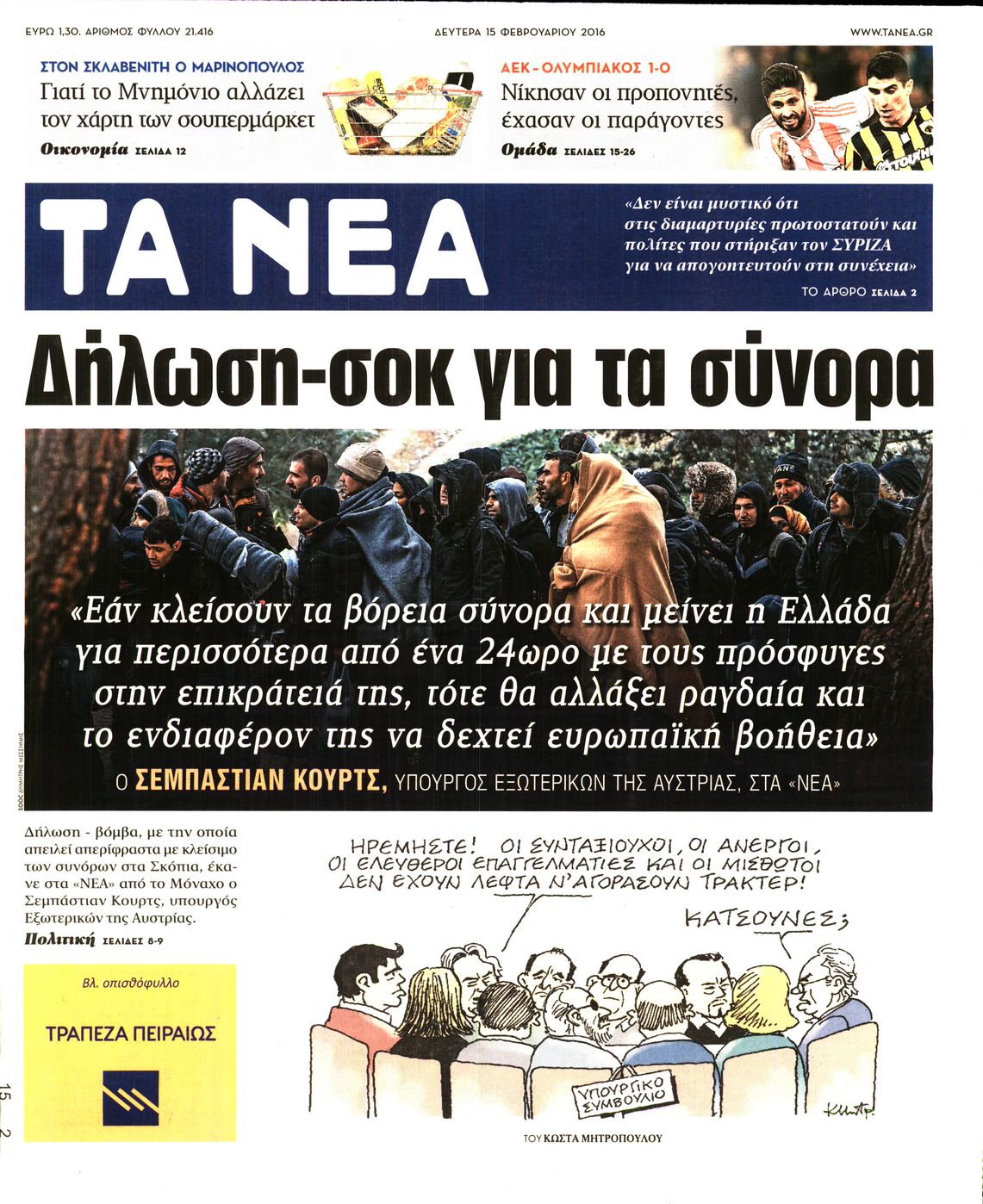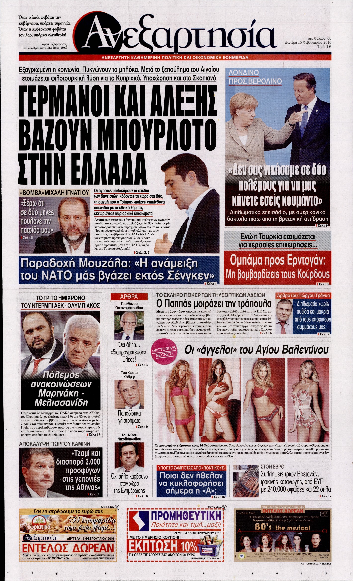 Οι πολιτικές εφημερίδες 15/2/2016 Enikos Newsroom 06:56, Δευτέρα 15 Φεβρουαρίου 2016 Media Διαβάστε τα σημερινά πρωτοσέλιδα των πολιτικών εφημερίδων. ΕΦΗΜΕΡΙΔΕΣ ΠΟΛΙΤΙΚΕΣ ΕΦΗΜΕΡΙΔΕΣ ΠΡΩΤΟΣΕΛΙΔΑ Μοιράσου το: σχολίασε κι εσύ (0 σχόλια) Ακολουθήστε το enikos.gr στο Google News και μάθετε πρώτοι όλες τις ειδήσεις Δείτε όλες τις τελευταίες ειδήσεις από την Ελλάδα και τον Κόσμο στο enikos.gr Ειδήσεις Ροή Ειδήσεων 20 λεπτά πριν Χριστούγεννα στα μπλόκα: Επιμένουν στις κινητοποιήσεις τους οι αγρότες – Ανοίγουν τα διόδια το Σαββατοκύριακο 49 λεπτά πριν Τραμπ: Δεν αποκλείει την πιθανότητα ενός πολέμου στη Βενεζουέλα – «Ο Μαδούρο ξέρει καλύτερα από τον καθένα τι ακριβώς θέλω» 43 λεπτά πριν Ουκρανία: Η άνευ προηγουμένου επίθεση σε ρωσικό τάνκερ στη Μεσόγειο και το μήνυμα προς στον Πούτιν – Το «μακρύ χέρι» του Κιέβου 3 ώρες πριν Πούτιν: «Ναι, είμαι ερωτευμένος» – Βίντεο από τη σπάνια προσωπική παραδοχή του 1 ώρα πριν Συνεχίζει να προκαλεί ο Μίτσκοσκι: «Για μένα το όνομα Μακεδονία είναι ιερό» 2 ώρες πριν Αριθμολογία: Οι άνθρωποι που έχουν γεννηθεί αυτές τις 4 ημερομηνίες, συχνά παρεξηγούνται – «Η καλοσύνη τους κρύβει τεράστια δύναμη» 4 ώρες πριν Μήπως έχετε χάσει τον εαυτό σας στη σχέση σας; 7 «αθόρυβες» υποχωρήσεις που μάλλον κάνατε, χωρίς να το συνειδητοποιήσετε 3 ώρες πριν Ξεχάστε το καθάρισμα το Σαββατοκύριακο: Ο «κανόνας των 20 λεπτών» που θα σας λύσει τα χέρια 58 λεπτά πριν Ύπνος: Μια κρυφή κατάσταση του εγκεφάλου πριν από τον ύπνο μπορεί να είναι το “κλειδί” για υψηλή ευφυΐα και δημιουργικότητα 3 λεπτά πριν Νίκος Ξυλούρης: Συγκινεί η χήρα του σπουδαίου καλλιτέχνη – «Ευχαριστώ όλο τον κόσμο που τον κρατάει ζωντανό 45 χρόνια» 10 λεπτά πριν Παναθηναϊκός: «Μέσα» οι Σφιντέρσκι και Τουμπά για το ματς με τον ΠΑΟΚ – Τι έδειξε η μαγνητική του Πάντοβιτς 16 λεπτά πριν Γιώργος Γιαννόπουλος για “Το σόι σου”: “Είναι ευτυχία και ευλογία αυτή η σειρά” 20 λεπτά πριν Χριστούγεννα στα μπλόκα: Επιμένουν στις κινητοποιήσεις τους οι αγρότες – Ανοίγουν τα διόδια το Σαββατοκύριακο 32 λεπτά πριν Χάρι και Μέγκαν: Η σπάνια οικογενειακή φωτογραφία με τον Άρτσι και τη Λίλιμπετ – Τι σχεδιάζουν για τα Χριστούγεννα ENIKOS NETWORK Το ΕΚΑΒ τιμήθηκε από την Ακαδημία Αθηνών για τα 40 χρόνια προσφοράς του Έχετε πραγματικά μεγάλη καρδιά; 10 χαρακτηριστικά όσων έχουν καλοσύνη Πλήρης επάρκεια προϊόντων στις λαϊκές της Αττικής, παρά τις αγροτικές κινητοποιήσεις – Τι απαντούν οι πωλητές ΑΑΔΕ: Νέες αναβαθμίσεις στο Ψηφιακό Πελατολόγιο και την εφαρμογή myDATAapp – Τι πρέπει να γνωρίζετε Χαρτογραφώντας το «σημείο χωρίς επιστροφή»: Για πρώτη φορά αποκαλύπτεται με λεπτομέρεια το ακανθώδες όριο της ατμόσφαιρας τ... Η Google καταργεί τη λειτουργία «dark web report» – Πώς θα μπορούν οι χρήστες να διαγράφουν τα δεδομένα τους περισσότερα 22:42 , Παρασκευή 19 Δεκεμβρίου 2025 Γιώργος Γιαννόπουλος για “Το σόι σου”: “Είναι ευτυχία και ευλογία αυτή η σειρά” «Είναι ευτυχία και ευλογία η συγκυρία αυτής της σειράς», θα πει ο Γιώργος Γιαννόπουλος -ο αγαπ... 20:37 , Παρασκευή 19 Δεκεμβρίου 2025 Don’t Forget The Lyrics: Η Έλλη Κοκκίνου υποδέχεται 4 παίκτες που θα κάνουν τα πάντα για να μη χάσουν ούτε… μισή λέξη από τους στίχους Το «Don’t Forget The Lyrics» επιστρέφει απόψε, Παρασκευή 19 Δεκεμβρίου, στις 21:00 με νέο επει... 19:31 , Παρασκευή 19 Δεκεμβρίου 2025 GNTM: Απόψε ο μεγάλος τελικός για τους 4 φιναλίστ Έπειτα από μήνες γεμάτους μόδα, δημιουργία και έντονες αναμετρήσεις, το GNTM 2025 κορυφώνεται,... 18:1