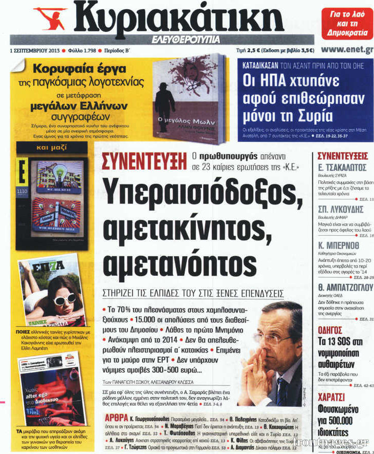 Οι πολιτικές εφημερίδες Enikos Newsroom 08:28, Κυριακή 01 Σεπτεμβρίου 2013 Media Οι πολιτικές εφημερίδες Διαβάστε τα πρωτοσέλιδα των πολιτικών εφημερίδων: ΕΦΗΜΕΡΙΔΕΣ ΠΟΛΙΤΙΚΕΣ ΕΦΗΜΕΡΙΔΕΣ ΠΡΩΤΟΣΕΛΙΔΑ Μοιράσου το: σχολίασε κι εσύ (0 σχόλια) Ακολουθήστε το enikos.gr στο Google News και μάθετε πρώτοι όλες τις ειδήσεις Δείτε όλες τις τελευταίες ειδήσεις από την Ελλάδα και τον Κόσμο στο enikos.gr Ειδήσεις Ροή Ειδήσεων 2 ώρες πριν Κύκλωμα διακίνησης ναρκωτικών σε σχολεία: Βίντεο ντοκουμέντο από τα βασανιστήρια στους ανήλικους – Συζητούσαν για το πώς θα κάνουν «ξέπλυμα χρήματος» 1 ώρα πριν Κλιμακώνουν τις κινητοποιήσεις τους οι αγρότες: Κλείνουν τη Δευτέρα τις σήραγγες των Τεμπών για τα φορτηγά – Ανοίγουν την Τρίτη τους δρόμους για τους εκδρομείς 2 ώρες πριν Αιματηρό επεισόδιο στον Άγιο Παντελεήμονα – Δύο τραυματίες, αναζητείται ο δράστης 1 ώρα πριν ΗΠΑ: Αυξάνουν την πίεση στην Βενεζουέλα – Το νέο ρεσάλτο σε τάνκερ και ο στόχος του Τραμπ 2 ώρες πριν Κασσελάκης για παραίτηση Μάλαμα: «Η πορεία μας δεν θα καθοριστεί από μεμονωμένα πρόσωπα, μηχανισμούς και προσωπικές ατζέντες» 2 ώρες πριν Ύπνος: Τι είναι ο «κανόνας 3-3-3» που χρησιμοποιεί ένας γιατρός για να ξεχωρίσει την κόπωση από την αϋπνία 3 ώρες πριν Αριθμολογία: Οι άνθρωποι που έχουν γεννηθεί αυτές τις 4 ημερομηνίες, είναι οι πιο πιστοί και αφοσιωμένοι σύντροφοι 1 ώρα πριν Αρχαιολογικό θρίλερ στην καρδιά της Ευρώπης: Παράξενο θραύσμα με ανάγλυφα και σφηνοειδή γραφή ανακαλύφθηκε σε μέρος που δεν περίμενε κανείς 2 ημέρες πριν Enerwave: Το νέο «ρεύμα» στη λιανική ενέργειας που αλλάζει την εμπειρία του καταναλωτή 4 λεπτά πριν Περιστέρι: Έφοδος της Αστυνομίας σε νυχτερινό κέντρο που σέρβιρε αλκοόλ σε ανήλικους – Μία σύλληψη 12 λεπτά πριν Γουατεμάλα: 12 νεκροί κοντά στην πρωτεύουσα – Για ξεκαθάρισμα λογαριασμών κάνουν λόγο οι Αρχές 26 λεπτά πριν Μαρόκο – Κομόρες 2-0: Ιδανική πρεμιέρα στο Copa Africa με… αριστούργημα του Ελ Κααμπί – Δείτε Βίντεο 42 λεπτά πριν Super League: Καλά… ΑΕΚούγεννα με «κιτρινόμαυρη» κορυφή, σε απόσταση αναπνοής ο Ολυμπιακός, στο -2 ο ΠΑΟΚ – Τα αποτελέσματα και η βαθμολογία 58 λεπτά πριν ΑΕΚ – ΟΦΗ 2-1: Γιορτές στην κορυφή με… ανατροπή ENIKOS NETWORK Οι γυναίκες έχουν βρει μια νέα απόλαυση στην κρεβατοκάμαρα που οι περισσότεροι άνδρες αγνοούν Christmas glow: 5 χρυσές συμβουλές για επιδερμίδα που λάμπει από ομορφιά τα Χριστούγεννα Νέο έτος ρεκόρ για τον ελληνικό τουρισμό το 2025: «Είμαστε μέσα στους 10 πλέον επισκέψιμους προορισμούς παγκοσμίως» λέει η ... Τιμές καυσίμων: Πόσο θα πληρώσουν οι εκδρομείς των Χριστουγέννων – Το κόστος μετακινήσεων σε δημοφιλείς προορισμούς Χαρτογραφώντας το «σημείο χωρίς επιστροφή»: Για πρώτη φορά αποκαλύπτεται με λεπτομέρεια το ακανθώδες όριο της ατμόσφαιρας τ... Η Google καταργεί τη λειτουργία «dark web report» – Πώς θα μπορούν οι χρήστες να διαγράφουν τα δεδομένα τους περισσότερα 21:30 , Κυριακή 21 Δεκεμβρίου 2025 Ο Δικαστής: Στα χέρια της Αστυνομίας βίντεο, που ανατρέπει όλα τα δεδομένα – Στενεύει ο κλοιός γύρω από τον Δικαστή Καταιγιστικές εξελίξεις στο τελευταίο επεισόδιο της χρονιάς της σειράς “Ο Δικαστής”... 17:18 , Κυριακή 21 Δεκεμβρίου 2025 «Η Μεγάλη Χίμαιρα»: Μάγεψε το κοινό κατά την avant-première της προβολής της Την Πρωτοχρονιά (Πέμπτη 1η Ιανουαρίου 2026) στο ERTFLIX θα γίνει η πρεμιέρα της πολυαναμενόμεν... 15:08 , Κυριακή 21 Δεκεμβρίου 2025 Μια νύχτα μόνο: Η Αρετή και ο Οδυσσέας έρχονται και πάλι κοντά Το νέο επεισόδιο της δραματι