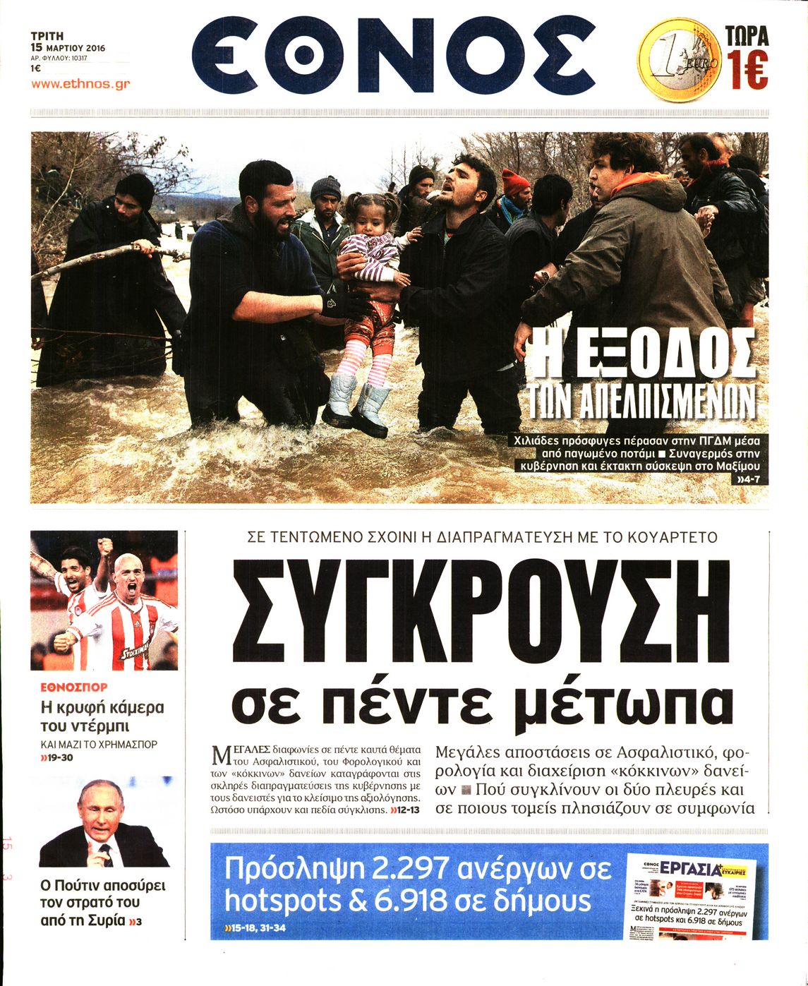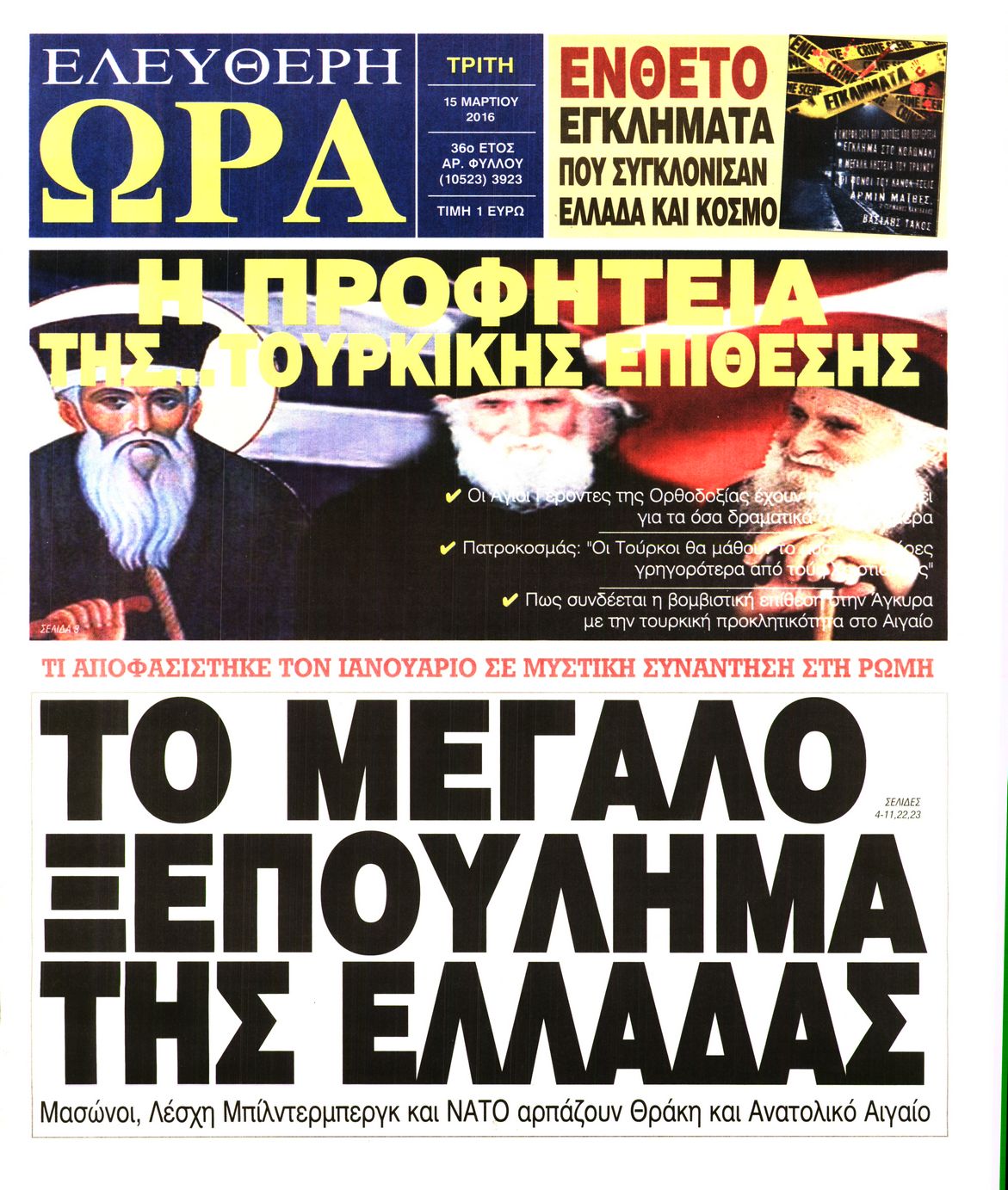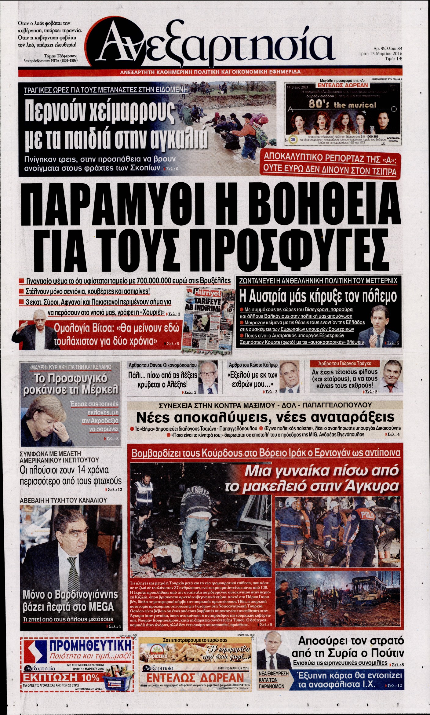 Oι πολιτικές εφημερίδες 15/3/2016 Enikos Newsroom 06:53, Τρίτη 15 Μαρτίου 2016 Media Διαβάστε τα σημερινά πρωτοσέλιδα των πολιτικών εφημερίδων… Μοιράσου το: σχολίασε κι εσύ (0 σχόλια) Ακολουθήστε το enikos.gr στο Google News και μάθετε πρώτοι όλες τις ειδήσεις Δείτε όλες τις τελευταίες ειδήσεις από την Ελλάδα και τον Κόσμο στο enikos.gr Ειδήσεις Ροή Ειδήσεων 3 ώρες πριν Χριστούγεννα στα μπλόκα: Επιμένουν στις κινητοποιήσεις τους οι αγρότες – Ανοίγουν τα διόδια το Σαββατοκύριακο 3 ώρες πριν Ουκρανία: Η άνευ προηγουμένου επίθεση σε ρωσικό τάνκερ στη Μεσόγειο και το μήνυμα προς στον Πούτιν – Το «μακρύ χέρι» του Κιέβου 2 ώρες πριν Πούτιν: Τα μηνύματα σε Ευρώπη και ΝΑΤΟ από το μαραθώνιο «σόου» του – Η απαίτηση για «σεβασμό» και η ειρήνη «με τους όρους» της Μόσχας 3 ώρες πριν Τραμπ: Δεν αποκλείει την πιθανότητα ενός πολέμου στη Βενεζουέλα – «Ο Μαδούρο ξέρει καλύτερα από τον καθένα τι ακριβώς θέλω» 4 ώρες πριν Συνεχίζει να προκαλεί ο Μίτσκοσκι: «Για μένα το όνομα Μακεδονία είναι ιερό» 2 ώρες πριν Ανακαλύφθηκαν αρχαία χρυσά νομίσματα 2.200 ετών που απεικονίζουν τον θεό Απόλλωνα – Η άγνωστη σύνδεση με τον Φίλιππο Β΄ της Μακεδονίας 3 ώρες πριν Ύπνος: Μια κρυφή κατάσταση του εγκεφάλου πριν από τον ύπνο μπορεί να είναι το “κλειδί” για υψηλή ευφυΐα και δημιουργικότητα 4 ώρες πριν Αριθμολογία: Οι άνθρωποι που έχουν γεννηθεί αυτές τις 4 ημερομηνίες, συχνά παρεξηγούνται – «Η καλοσύνη τους κρύβει τεράστια δύναμη» 5 ώρες πριν Ξεχάστε το καθάρισμα το Σαββατοκύριακο: Ο «κανόνας των 20 λεπτών» που θα σας λύσει τα χέρια 6 λεπτά πριν Συρία: Μαζικά πλήγματα των ΗΠΑ σε θέσεις του Ισλαμικού Κράτους – Χέγκσεθ: «Δεν είναι αρχή πολέμου, είναι μια δήλωση εκδίκησης» για το θάνατο των στρατιωτών μας 18 λεπτά πριν Ουκρανία: Ολοκληρώθηκαν οι συνομιλίες με τους Αμερικανούς κι Ευρωπαίους διαπραγματευτές 33 λεπτά πριν Μπαρτσελόνα – Μπασκόνια 134-124: Οι «μπλαουγκράνα» πήραν το ματς της χρονιάς ύστερα από τρεις παρατάσεις 48 λεπτά πριν Φαίη Σκορδά: «Παλιότερα τα κομπλιμέντα τα προσπερνούσα, τώρα τα έχω ανάγκη» 1 ώρα πριν Βασίλης Σπανούλης: Δεν εμφανίστηκε ούτε ένας δημοσιογράφος στην συνέντευξη Τύπου – «Καλησπέρα στον… κανέναν», δείτε βίντεο ENIKOS NETWORK Το ΕΚΑΒ τιμήθηκε από την Ακαδημία Αθηνών για τα 40 χρόνια προσφοράς του Έχετε πραγματικά μεγάλη καρδιά; 10 χαρακτηριστικά όσων έχουν καλοσύνη Αναστολή μέτρων αναγκαστικής εκτέλεσης για κτηνοτρόφους που πλήττονται από την ευλογιά των αιγοπροβάτων Πλήρης επάρκεια προϊόντων στις λαϊκές της Αττικής, παρά τις αγροτικές κινητοποιήσεις – Τι απαντούν οι πωλητές Χαρτογραφώντας το «σημείο χωρίς επιστροφή»: Για πρώτη φορά αποκαλύπτεται με λεπτομέρεια το ακανθώδες όριο της ατμόσφαιρας τ... Η Google καταργεί τη λειτουργία «dark web report» – Πώς θα μπορούν οι χρήστες να διαγράφουν τα δεδομένα τους περισσότερα 22:42 , Παρασκευή 19 Δεκεμβρίου 2025 Γιώργος Γιαννόπουλος για “Το σόι σου”: “Είναι ευτυχία και ευλογία αυτή η σειρά” «Είναι ευτυχία και ευλογία η συγκυρία αυτής της σειράς», θα πει ο Γιώργος Γιαννόπουλος -ο αγαπ... 20:37 , Παρασκευή 19 Δεκεμβρίου 2025 Don’t Forget The Lyrics: Η Έλλη Κοκκίνου υποδέχεται 4 παίκτες που θα κάνουν τα πάντα για να μη χάσουν ούτε… μισή λέξη από τους στίχους Το «Don’t Forget The Lyrics» επιστρέφει απόψε, Παρασκευή 19 Δεκεμβρίου, στις 21:00 με νέο επει... 19:31 , Παρασκευή 19 Δεκεμβρίου 2025 GNTM: Απόψε ο μεγάλος τελικός για τους 4 φιναλίστ Έπειτα από μήνες γεμάτους μόδα, δημιουργία και έντονες ανα