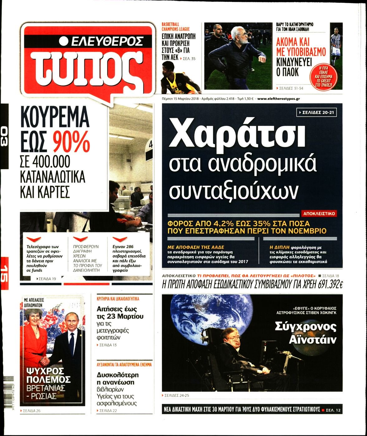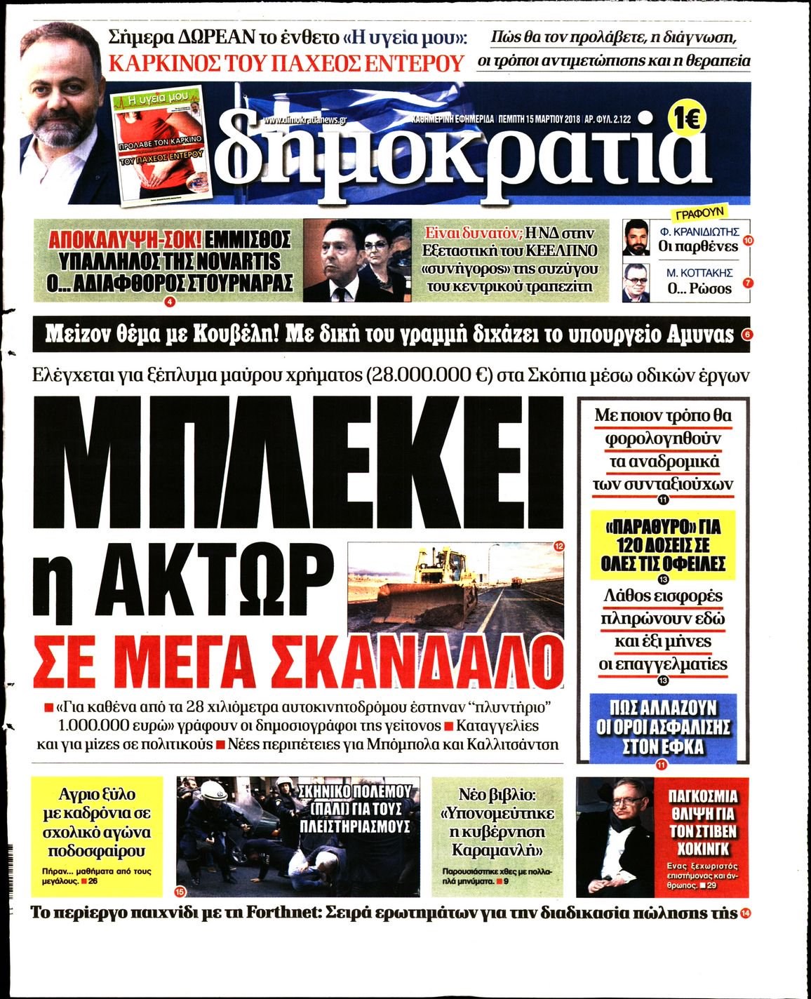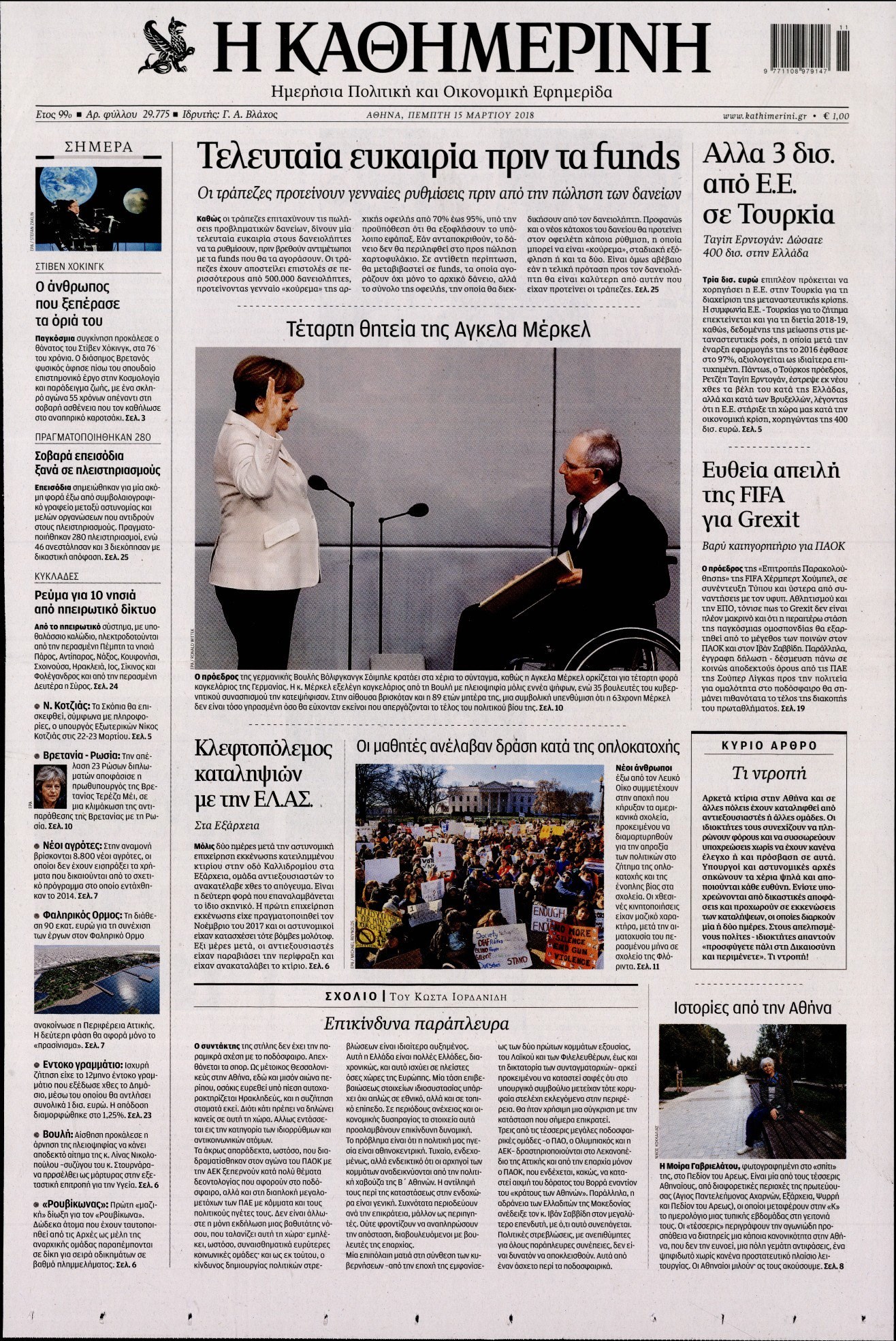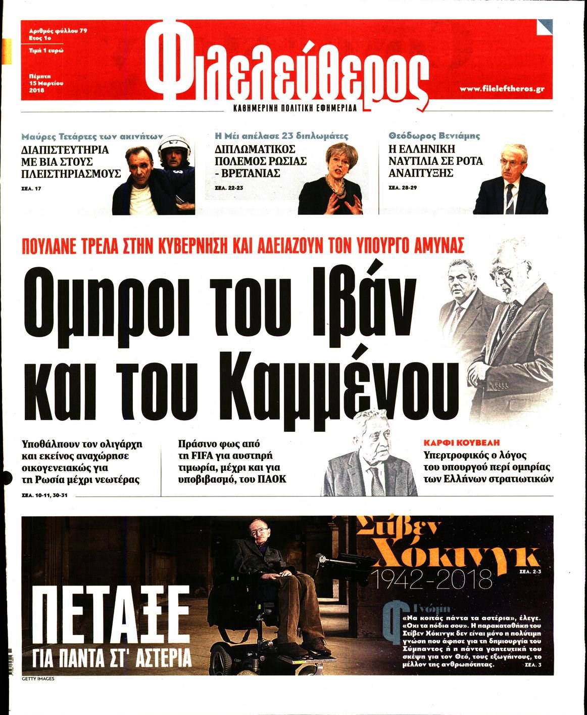 Οι πολιτικές εφημερίδες 15/3/2018 Enikos Newsroom 07:34, Πέμπτη 15 Μαρτίου 2018 Media Διαβάστε τα σημερινά πρωτοσέλιδα των πολιτικών εφημερίδων: ΠΟΛΙΤΙΚΕΣ ΕΦΗΜΕΡΙΔΕΣ ΠΡΩΤΟΣΕΛΙΔΑ Μοιράσου το: σχολίασε κι εσύ (0 σχόλια) Ακολουθήστε το enikos.gr στο Google News και μάθετε πρώτοι όλες τις ειδήσεις Δείτε όλες τις τελευταίες ειδήσεις από την Ελλάδα και τον Κόσμο στο enikos.gr Ειδήσεις Ροή Ειδήσεων 30 λεπτά πριν Υπόθεση Έπσταϊν: Το Υπουργείο Δικαιοσύνης δημοσιοποίησε μια σειρά από εξαιρετικά επεξεργασμένα αρχεία – «Λείπουν τα πιο σημαντικά έγγραφα», λένε οι Δημοκρατικοί 2 ώρες πριν Σαρωτικοί οι έλεγχοι στους δρόμους ενόψει εορτών – Μπλόκα της τροχαίας σε κεντρικές αρτηρίες της Αττικής 41 λεπτά πριν ΟΝΕΧ – MEGATUGS: Ξεκίνησε η ναυπήγηση ρυμουλκών στην Ελλάδα – Προθάλαμος πολεμικών πλοίων – Δείτε φωτογραφίες και βίντεο 10 ώρες πριν Χριστούγεννα στα μπλόκα: Επιμένουν στις κινητοποιήσεις τους οι αγρότες – Ανοίγουν τα διόδια το Σαββατοκύριακο 9 ώρες πριν Πούτιν: Τα μηνύματα σε Ευρώπη και ΝΑΤΟ από το μαραθώνιο «σόου» του – Η απαίτηση για «σεβασμό» και η ειρήνη «με τους όρους» της Μόσχας 2 ώρες πριν Αυγά: Πόσα μπορείτε να τρώτε την ημέρα με ασφάλεια για μέγιστη πρόσληψη πρωτεΐνης 3 ώρες πριν Τα ζώδια σήμερα, Σάββατο 20 Δεκεμβρίου: Παρθένοι, το σύμπαν σας δίνει το κλειδί 9 ώρες πριν Ανακαλύφθηκαν αρχαία χρυσά νομίσματα 2.200 ετών που απεικονίζουν τον θεό Απόλλωνα – Η άγνωστη σύνδεση με τον Φίλιππο Β΄ της Μακεδονίας 2 ώρες πριν Οπτική ψευδαίσθηση: Μόνο αν είσαι ο Σέρλοκ Χολμς θα βρεις τον αριθμό «87» σε 7 δευτερόλεπτα 3 λεπτά πριν Τρομεροί γονείς: Η Μαρία Καβογιάννη εισβάλλει στο σπίτι της οικογένειας Στεφανίδη 10 λεπτά πριν Αρχαιολόγοι ανακάλυψαν σε χωράφι απεικόνιση 600 ετών ενός Αγίου – Τα στοιχεία που δείχνουν ότι μαρτύρησε 18 λεπτά πριν Mega χριστουγεννιάτικη φορολοταρία: «Κλείδωσε» η ημερομηνία για την κλήρωση – Ερωτήσεις και απαντήσεις 25 λεπτά πριν ΗΠΑ: Τέσσερις μετανάστες πέθαναν σε κέντρα κράτησης – Αύξηση θανάτων σε επίπεδο ρεκόρ το 2025 30 λεπτά πριν Υπόθεση Έπσταϊν: Το Υπουργείο Δικαιοσύνης δημοσιοποίησε μια σειρά από εξαιρετικά επεξεργασμένα αρχεία – «Λείπουν τα πιο σημαντικά έγγραφα», λένε οι Δημοκρατικοί ENIKOS NETWORK Το τεστ των 10 δευτερολέπτων που μπορεί να προβλέψει το προσδόκιμο ζωής σας – Τι λέει ειδικός του Cleveland Επιλέξτε καρέκλα για να μάθετε ποια είναι τα κρυφά χαρακτηριστικά σας – Τι αποκάλυψε για εσάς αυτό το τεστ προσωπικότητας; Mega χριστουγεννιάτικη φορολοταρία: «Κλείδωσε» η ημερομηνία για την κλήρωση – Ερωτήσεις και απαντήσεις Αναστολή μέτρων αναγκαστικής εκτέλεσης για κτηνοτρόφους που πλήττονται από την ευλογιά των αιγοπροβάτων Χαρτογραφώντας το «σημείο χωρίς επιστροφή»: Για πρώτη φορά αποκαλύπτεται με λεπτομέρεια το ακανθώδες όριο της ατμόσφαιρας τ... Η Google καταργεί τη λειτουργία «dark web report» – Πώς θα μπορούν οι χρήστες να διαγράφουν τα δεδομένα τους περισσότερα 08:14 , Σάββατο 20 Δεκεμβρίου 2025 Τρομεροί γονείς: Η Μαρία Καβογιάννη εισβάλλει στο σπίτι της οικογένειας Στεφανίδη Όσα θα δούμε στο νέο διπλό επεισόδιο της σειράς «Τρομεροί γονείς», σήμερα Σάββατο 20 Δεκεμβρίο... 05:48 , Σάββατο 20 Δεκεμβρίου 2025 Οι οικονομικές εφημερίδες 20/12/2025 Διαβάστε τα πρωτοσέλιδα από τις οικονομικές εφημερίδες, σήμερα 20/12/2025. 05:43 , Σάββατο 20 Δεκεμβρίου 2025 Οι αθλητικές εφημερίδες 20/12/2025 Διαβάστε τα πρωτοσέλιδα από τις αθλητικές εφημερίδες, σήμερα 20/12/2025. 05:38 , Σάββατο 20 Δεκεμβρίου 2025 Οι πολιτικέ
