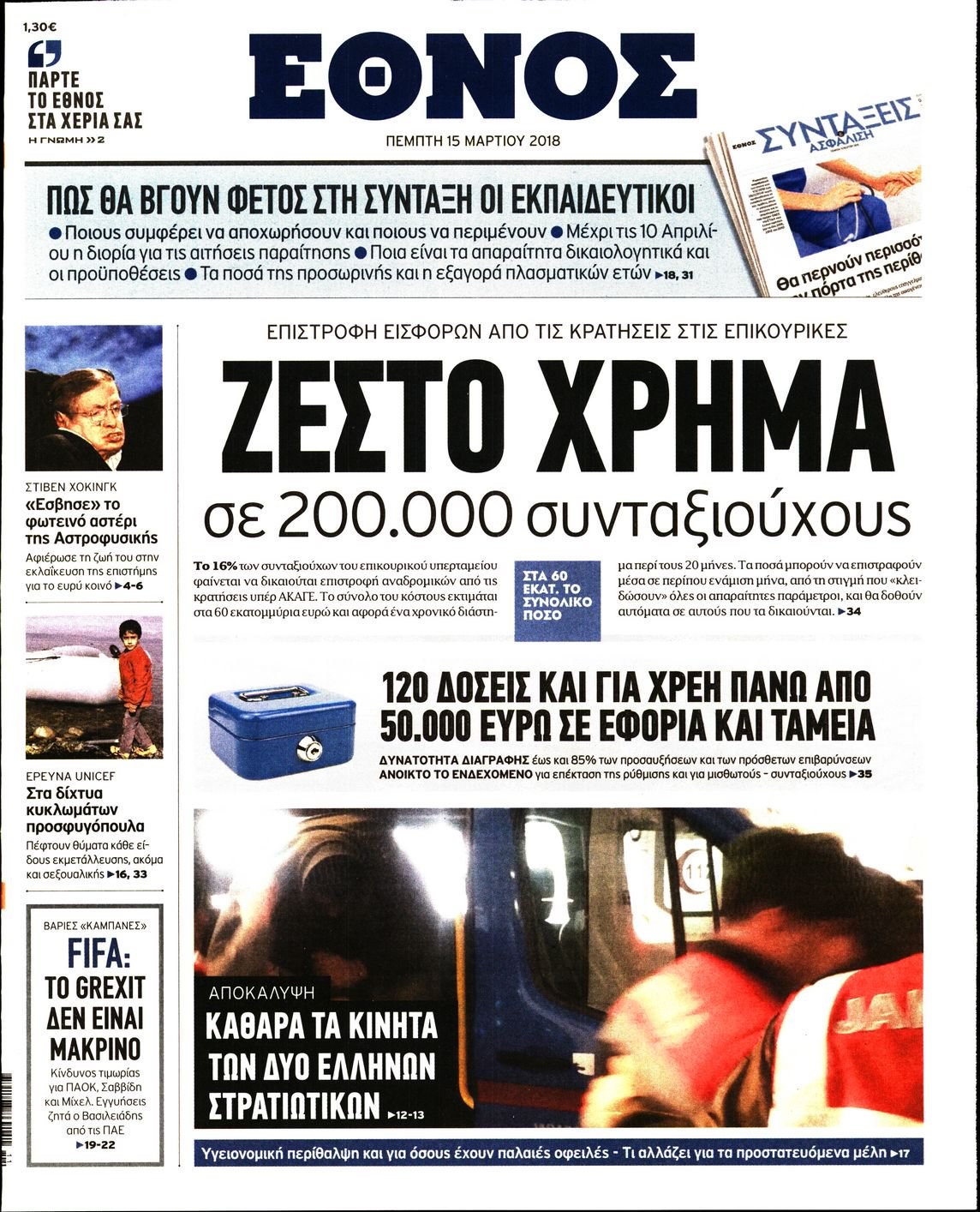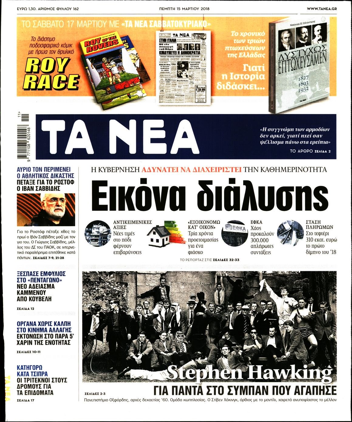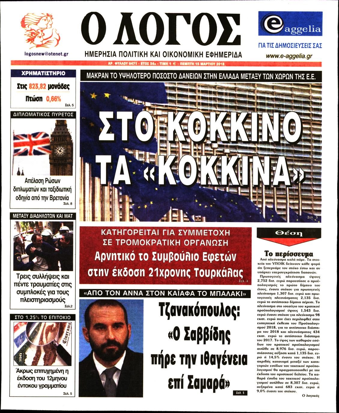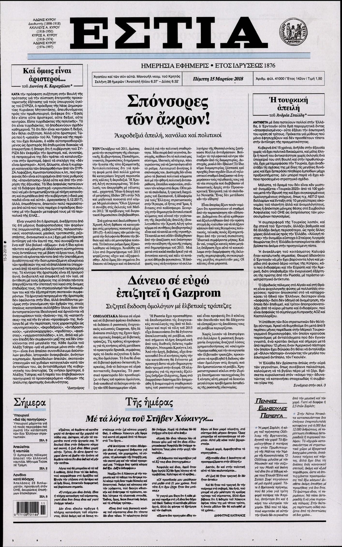 Οι πολιτικές εφημερίδες 15/3/2018 Enikos Newsroom 07:34, Πέμπτη 15 Μαρτίου 2018 Media Διαβάστε τα σημερινά πρωτοσέλιδα των πολιτικών εφημερίδων: ΠΟΛΙΤΙΚΕΣ ΕΦΗΜΕΡΙΔΕΣ ΠΡΩΤΟΣΕΛΙΔΑ Μοιράσου το: σχολίασε κι εσύ (0 σχόλια) Ακολουθήστε το enikos.gr στο Google News και μάθετε πρώτοι όλες τις ειδήσεις Δείτε όλες τις τελευταίες ειδήσεις από την Ελλάδα και τον Κόσμο στο enikos.gr Ειδήσεις Ροή Ειδήσεων 30 λεπτά πριν Υπόθεση Έπσταϊν: Το Υπουργείο Δικαιοσύνης δημοσιοποίησε μια σειρά από εξαιρετικά επεξεργασμένα αρχεία – «Λείπουν τα πιο σημαντικά έγγραφα», λένε οι Δημοκρατικοί 2 ώρες πριν Σαρωτικοί οι έλεγχοι στους δρόμους ενόψει εορτών – Μπλόκα της τροχαίας σε κεντρικές αρτηρίες της Αττικής 41 λεπτά πριν ΟΝΕΧ – MEGATUGS: Ξεκίνησε η ναυπήγηση ρυμουλκών στην Ελλάδα – Προθάλαμος πολεμικών πλοίων – Δείτε φωτογραφίες και βίντεο 10 ώρες πριν Χριστούγεννα στα μπλόκα: Επιμένουν στις κινητοποιήσεις τους οι αγρότες – Ανοίγουν τα διόδια το Σαββατοκύριακο 9 ώρες πριν Πούτιν: Τα μηνύματα σε Ευρώπη και ΝΑΤΟ από το μαραθώνιο «σόου» του – Η απαίτηση για «σεβασμό» και η ειρήνη «με τους όρους» της Μόσχας 2 ώρες πριν Αυγά: Πόσα μπορείτε να τρώτε την ημέρα με ασφάλεια για μέγιστη πρόσληψη πρωτεΐνης 3 ώρες πριν Τα ζώδια σήμερα, Σάββατο 20 Δεκεμβρίου: Παρθένοι, το σύμπαν σας δίνει το κλειδί 9 ώρες πριν Ανακαλύφθηκαν αρχαία χρυσά νομίσματα 2.200 ετών που απεικονίζουν τον θεό Απόλλωνα – Η άγνωστη σύνδεση με τον Φίλιππο Β΄ της Μακεδονίας 2 ώρες πριν Οπτική ψευδαίσθηση: Μόνο αν είσαι ο Σέρλοκ Χολμς θα βρεις τον αριθμό «87» σε 7 δευτερόλεπτα 3 λεπτά πριν Τρομεροί γονείς: Η Μαρία Καβογιάννη εισβάλλει στο σπίτι της οικογένειας Στεφανίδη 10 λεπτά πριν Αρχαιολόγοι ανακάλυψαν σε χωράφι απεικόνιση 600 ετών ενός Αγίου – Τα στοιχεία που δείχνουν ότι μαρτύρησε 18 λεπτά πριν Mega χριστουγεννιάτικη φορολοταρία: «Κλείδωσε» η ημερομηνία για την κλήρωση – Ερωτήσεις και απαντήσεις 25 λεπτά πριν ΗΠΑ: Τέσσερις μετανάστες πέθαναν σε κέντρα κράτησης – Αύξηση θανάτων σε επίπεδο ρεκόρ το 2025 30 λεπτά πριν Υπόθεση Έπσταϊν: Το Υπουργείο Δικαιοσύνης δημοσιοποίησε μια σειρά από εξαιρετικά επεξεργασμένα αρχεία – «Λείπουν τα πιο σημαντικά έγγραφα», λένε οι Δημοκρατικοί ENIKOS NETWORK Το τεστ των 10 δευτερολέπτων που μπορεί να προβλέψει το προσδόκιμο ζωής σας – Τι λέει ειδικός του Cleveland Επιλέξτε καρέκλα για να μάθετε ποια είναι τα κρυφά χαρακτηριστικά σας – Τι αποκάλυψε για εσάς αυτό το τεστ προσωπικότητας; Mega χριστουγεννιάτικη φορολοταρία: «Κλείδωσε» η ημερομηνία για την κλήρωση – Ερωτήσεις και απαντήσεις Αναστολή μέτρων αναγκαστικής εκτέλεσης για κτηνοτρόφους που πλήττονται από την ευλογιά των αιγοπροβάτων Χαρτογραφώντας το «σημείο χωρίς επιστροφή»: Για πρώτη φορά αποκαλύπτεται με λεπτομέρεια το ακανθώδες όριο της ατμόσφαιρας τ... Η Google καταργεί τη λειτουργία «dark web report» – Πώς θα μπορούν οι χρήστες να διαγράφουν τα δεδομένα τους περισσότερα 08:14 , Σάββατο 20 Δεκεμβρίου 2025 Τρομεροί γονείς: Η Μαρία Καβογιάννη εισβάλλει στο σπίτι της οικογένειας Στεφανίδη Όσα θα δούμε στο νέο διπλό επεισόδιο της σειράς «Τρομεροί γονείς», σήμερα Σάββατο 20 Δεκεμβρίο... 05:48 , Σάββατο 20 Δεκεμβρίου 2025 Οι οικονομικές εφημερίδες 20/12/2025 Διαβάστε τα πρωτοσέλιδα από τις οικονομικές εφημερίδες, σήμερα 20/12/2025. 05:43 , Σάββατο 20 Δεκεμβρίου 2025 Οι αθλητικές εφημερίδες 20/12/2025 Διαβάστε τα πρωτοσέλιδα από τις αθλητικές εφημερίδες, σήμερα 20/12/2025. 05:38 , Σάββατο 20 Δεκεμβρίου 2025 Οι πολιτικέ