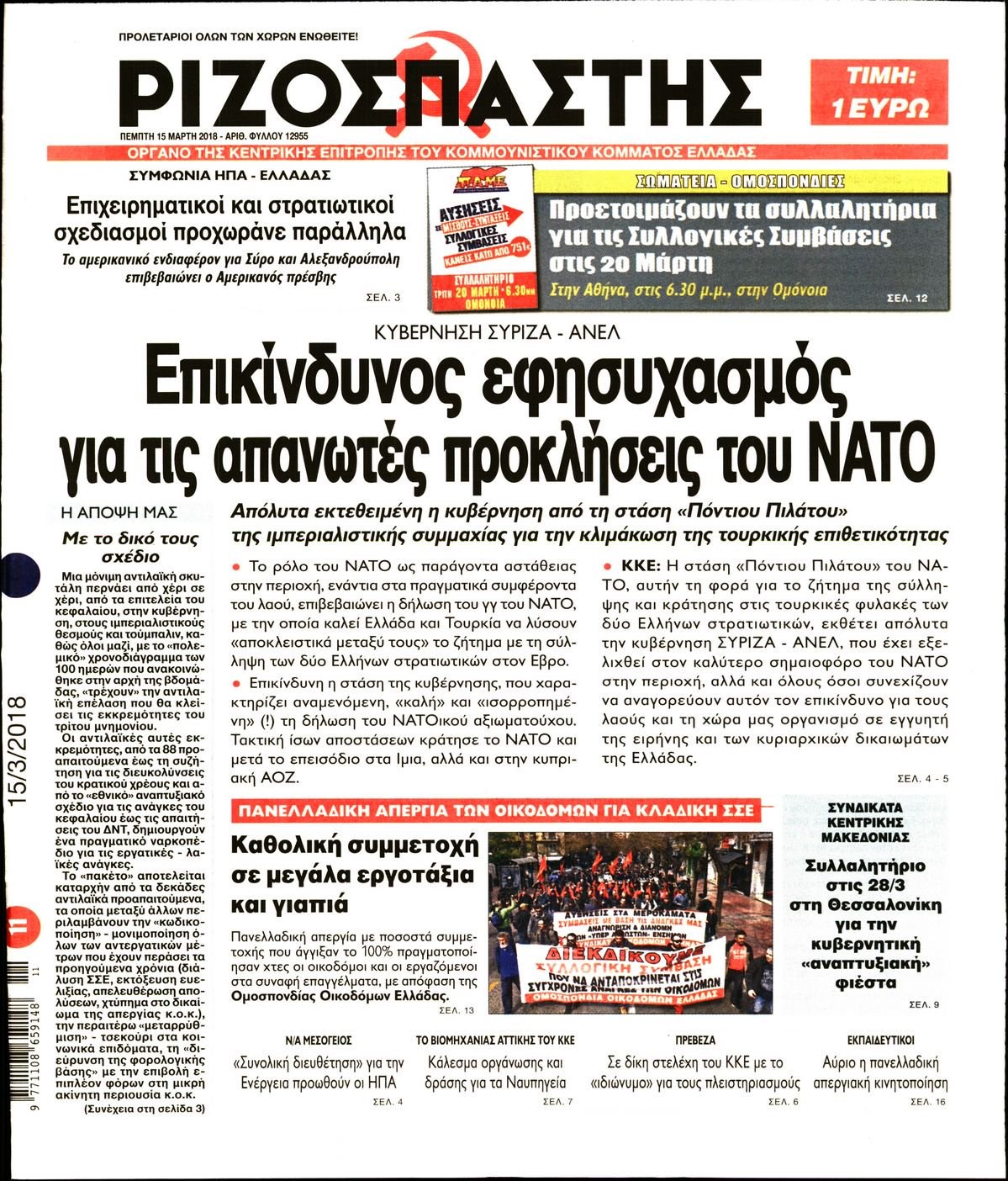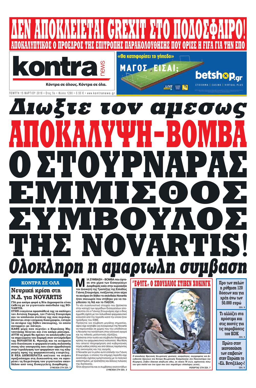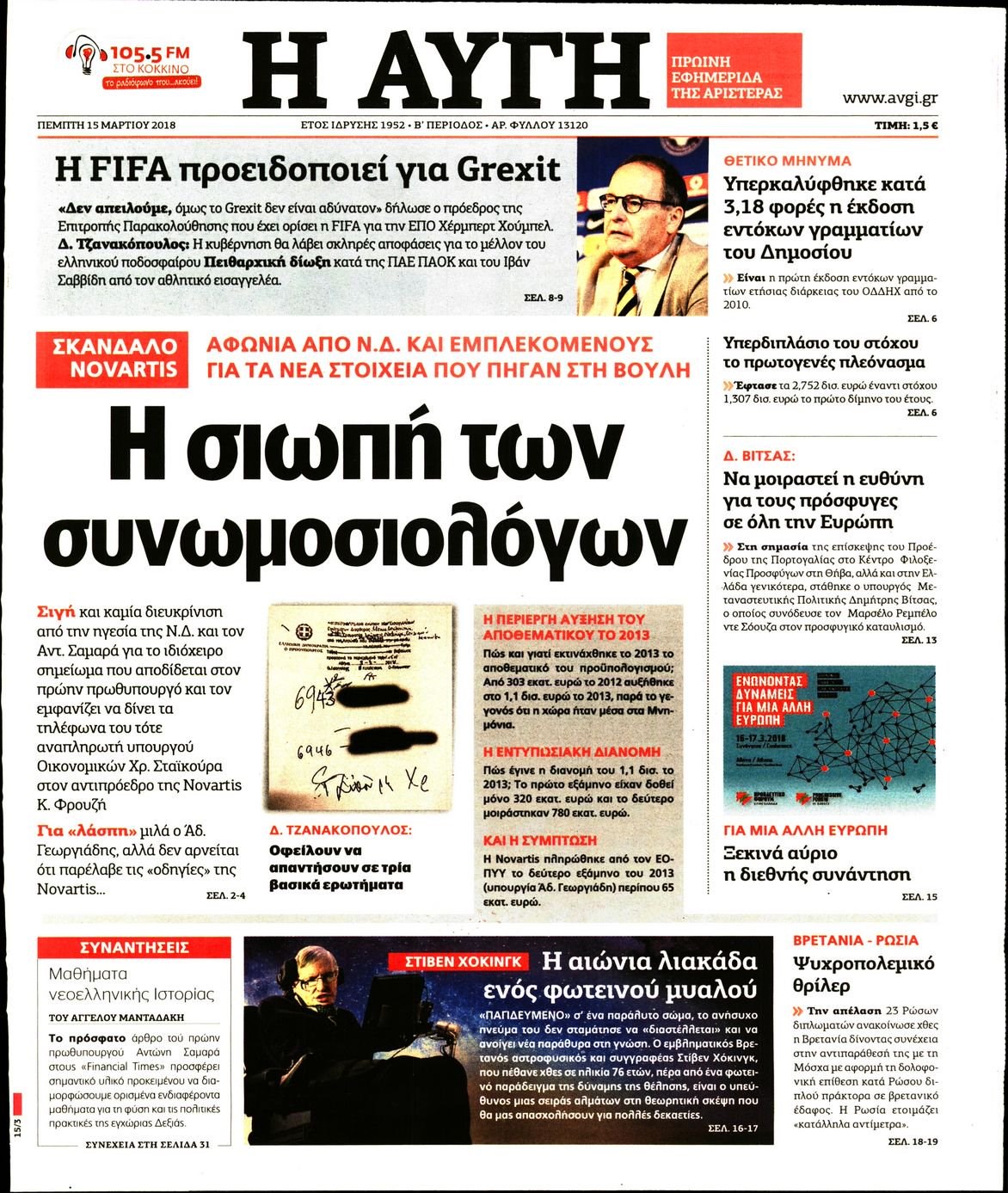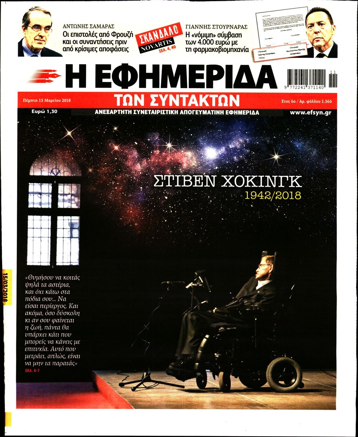 Οι πολιτικές εφημερίδες 15/3/2018 Enikos Newsroom 07:34, Πέμπτη 15 Μαρτίου 2018 Media Διαβάστε τα σημερινά πρωτοσέλιδα των πολιτικών εφημερίδων: ΠΟΛΙΤΙΚΕΣ ΕΦΗΜΕΡΙΔΕΣ ΠΡΩΤΟΣΕΛΙΔΑ Μοιράσου το: σχολίασε κι εσύ (0 σχόλια) Ακολουθήστε το enikos.gr στο Google News και μάθετε πρώτοι όλες τις ειδήσεις Δείτε όλες τις τελευταίες ειδήσεις από την Ελλάδα και τον Κόσμο στο enikos.gr Ειδήσεις Ροή Ειδήσεων 30 λεπτά πριν Υπόθεση Έπσταϊν: Το Υπουργείο Δικαιοσύνης δημοσιοποίησε μια σειρά από εξαιρετικά επεξεργασμένα αρχεία – «Λείπουν τα πιο σημαντικά έγγραφα», λένε οι Δημοκρατικοί 2 ώρες πριν Σαρωτικοί οι έλεγχοι στους δρόμους ενόψει εορτών – Μπλόκα της τροχαίας σε κεντρικές αρτηρίες της Αττικής 41 λεπτά πριν ΟΝΕΧ – MEGATUGS: Ξεκίνησε η ναυπήγηση ρυμουλκών στην Ελλάδα – Προθάλαμος πολεμικών πλοίων – Δείτε φωτογραφίες και βίντεο 10 ώρες πριν Χριστούγεννα στα μπλόκα: Επιμένουν στις κινητοποιήσεις τους οι αγρότες – Ανοίγουν τα διόδια το Σαββατοκύριακο 9 ώρες πριν Πούτιν: Τα μηνύματα σε Ευρώπη και ΝΑΤΟ από το μαραθώνιο «σόου» του – Η απαίτηση για «σεβασμό» και η ειρήνη «με τους όρους» της Μόσχας 2 ώρες πριν Αυγά: Πόσα μπορείτε να τρώτε την ημέρα με ασφάλεια για μέγιστη πρόσληψη πρωτεΐνης 3 ώρες πριν Τα ζώδια σήμερα, Σάββατο 20 Δεκεμβρίου: Παρθένοι, το σύμπαν σας δίνει το κλειδί 9 ώρες πριν Ανακαλύφθηκαν αρχαία χρυσά νομίσματα 2.200 ετών που απεικονίζουν τον θεό Απόλλωνα – Η άγνωστη σύνδεση με τον Φίλιππο Β΄ της Μακεδονίας 2 ώρες πριν Οπτική ψευδαίσθηση: Μόνο αν είσαι ο Σέρλοκ Χολμς θα βρεις τον αριθμό «87» σε 7 δευτερόλεπτα 3 λεπτά πριν Τρομεροί γονείς: Η Μαρία Καβογιάννη εισβάλλει στο σπίτι της οικογένειας Στεφανίδη 10 λεπτά πριν Αρχαιολόγοι ανακάλυψαν σε χωράφι απεικόνιση 600 ετών ενός Αγίου – Τα στοιχεία που δείχνουν ότι μαρτύρησε 18 λεπτά πριν Mega χριστουγεννιάτικη φορολοταρία: «Κλείδωσε» η ημερομηνία για την κλήρωση – Ερωτήσεις και απαντήσεις 25 λεπτά πριν ΗΠΑ: Τέσσερις μετανάστες πέθαναν σε κέντρα κράτησης – Αύξηση θανάτων σε επίπεδο ρεκόρ το 2025 30 λεπτά πριν Υπόθεση Έπσταϊν: Το Υπουργείο Δικαιοσύνης δημοσιοποίησε μια σειρά από εξαιρετικά επεξεργασμένα αρχεία – «Λείπουν τα πιο σημαντικά έγγραφα», λένε οι Δημοκρατικοί ENIKOS NETWORK Το τεστ των 10 δευτερολέπτων που μπορεί να προβλέψει το προσδόκιμο ζωής σας – Τι λέει ειδικός του Cleveland Επιλέξτε καρέκλα για να μάθετε ποια είναι τα κρυφά χαρακτηριστικά σας – Τι αποκάλυψε για εσάς αυτό το τεστ προσωπικότητας; Mega χριστουγεννιάτικη φορολοταρία: «Κλείδωσε» η ημερομηνία για την κλήρωση – Ερωτήσεις και απαντήσεις Αναστολή μέτρων αναγκαστικής εκτέλεσης για κτηνοτρόφους που πλήττονται από την ευλογιά των αιγοπροβάτων Χαρτογραφώντας το «σημείο χωρίς επιστροφή»: Για πρώτη φορά αποκαλύπτεται με λεπτομέρεια το ακανθώδες όριο της ατμόσφαιρας τ... Η Google καταργεί τη λειτουργία «dark web report» – Πώς θα μπορούν οι χρήστες να διαγράφουν τα δεδομένα τους περισσότερα 08:14 , Σάββατο 20 Δεκεμβρίου 2025 Τρομεροί γονείς: Η Μαρία Καβογιάννη εισβάλλει στο σπίτι της οικογένειας Στεφανίδη Όσα θα δούμε στο νέο διπλό επεισόδιο της σειράς «Τρομεροί γονείς», σήμερα Σάββατο 20 Δεκεμβρίο... 05:48 , Σάββατο 20 Δεκεμβρίου 2025 Οι οικονομικές εφημερίδες 20/12/2025 Διαβάστε τα πρωτοσέλιδα από τις οικονομικές εφημερίδες, σήμερα 20/12/2025. 05:43 , Σάββατο 20 Δεκεμβρίου 2025 Οι αθλητικές εφημερίδες 20/12/2025 Διαβάστε τα πρωτοσέλιδα από τις αθλητικές εφημερίδες, σήμερα 20/12/2025. 05:38 , Σάββατο 20 Δεκεμβρίου 2025 Οι πολιτικέ