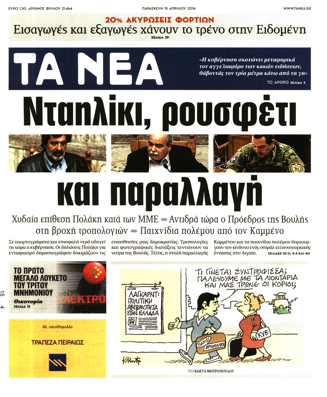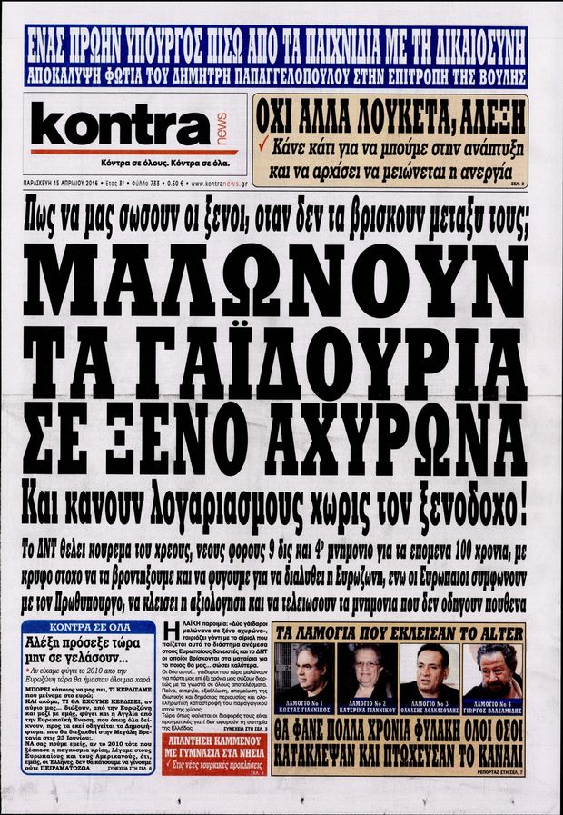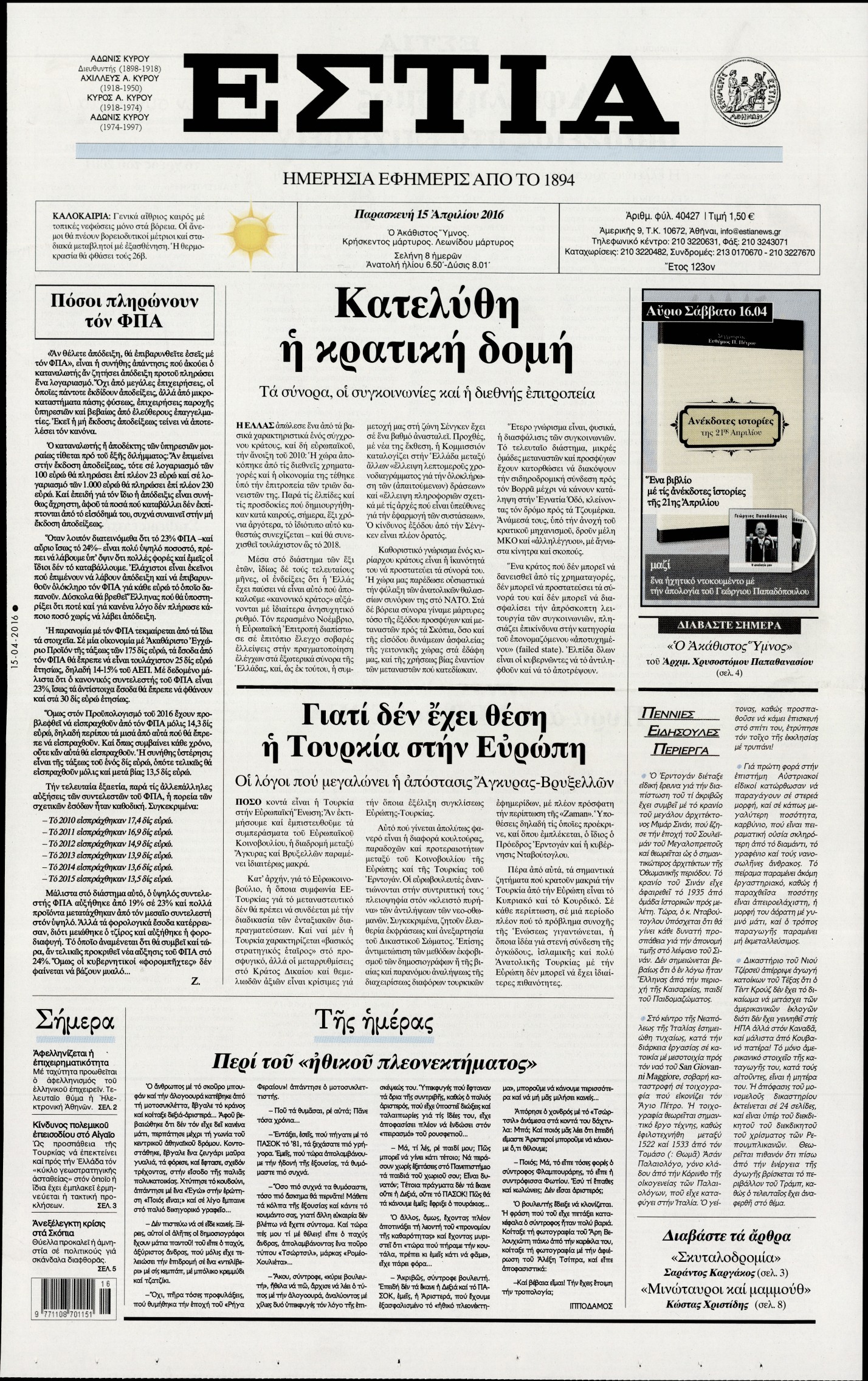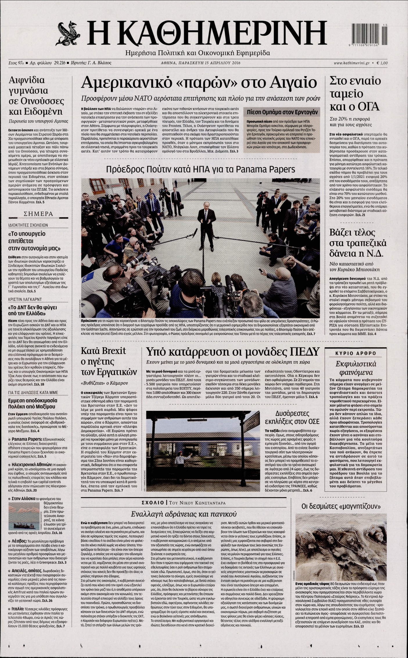 Οι πολιτικές εφημερίδες 15/4/2016 Enikos Newsroom 05:30, Παρασκευή 15 Απριλίου 2016 Media Διαβάστε τα σημερινά πρωτοσέλιδα των πολιτικών εφημερίδων: ΠΟΛΙΤΙΚΕΣ ΕΦΗΜΕΡΙΔΕΣ ΠΡΩΤΟΣΕΛΙΔΑ Μοιράσου το: σχολίασε κι εσύ (0 σχόλια) Ακολουθήστε το enikos.gr στο Google News και μάθετε πρώτοι όλες τις ειδήσεις Δείτε όλες τις τελευταίες ειδήσεις από την Ελλάδα και τον Κόσμο στο enikos.gr Ειδήσεις Ροή Ειδήσεων 1 ώρα πριν Μεσόγειος: Η διαδρομή του ρωσικού τάνκερ «Qendil» και η στοχευμένη επίθεση της Ουκρανίας με drone – Ο Πούτιν προειδοποίησε για αντίποινα 54 λεπτά πριν Αττική: Θρίλερ με νεκρό βρέφος 5 μηνών – Κοιμόταν στο ίδιο κρεβάτι με τους γονείς του 2 ώρες πριν Από το Ορμένιο ως τα Μάλγαρα κι από τη Σιάτιστα μέχρι τη Νίκαια: Μπλόκα σε όλη την Ελλάδα – Το Σάββατο ανοίγουν τα διόδια οι αγρότες 2 ώρες πριν «Έλληνας Εσκομπάρ»: Φωτογραφίες με τους 4 τόνους κοκαΐνης που κατασχέθηκαν από το σκάφος «Ουρανία» 3 ώρες πριν Πούτιν: Σαρκαστικά μηνύματα, παράπονα και απρόοπτα στη συνέντευξη Τύπου – Η πρόταση γάμου on air και οι ερωτήσεις για τα αγγούρια και τους… εξωγήινους 3 ώρες πριν Τα 5 ζώδια που ευνοούνται στην ερωτική ζωή τους την επόμενη εβδομάδα – «Η ενέργεια του Αιγόκερου φέρνει αγάπη και σταθερότητα» 7 ώρες πριν Ειδικός μοιράζεται 6 κόλπα για να διατηρείστε σε φόρμα με πάνω από 40 ώρες εργασίας την εβδομάδα: «Προπονηθείτε πριν από τη δουλειά, όχι μετά» 4 ώρες πριν Αυτό το έξυπνο μαθηματικό κόλπο θα μπορούσε να αλλάξει τον τρόπο με τον οποίο οι επιστήμονες μελετούν τους σεισμούς 2 ώρες πριν Κουίζ για την παλιά Αθήνα: Αναγνωρίζετε την περιοχή; Έχετε περάσει 100% από εκεί 44 δευτερόλεπτα πριν Λάρισα: Ασθενοφόρο έπεσε πάνω σε κλούβα της ΕΛ.ΑΣ στον Πλατύκαμπο – Τραυματίστηκε ο συνοδηγός – ΒΙΝΤΕΟ 7 λεπτά πριν Τέμπη: Διεκόπη για τις 9 Ιανουαρίου η δίκη για τα χαμένα βίντεο της εμπορικής αμαξοστοιχίας – «Απαιτούμε να μας σέβονται» 12 λεπτά πριν Hellenic Train: Αλλαγές και καταργήσεις δρομολογίων λεωφορείων λόγω των αγροτικών κινητοποιήσεων 18 λεπτά πριν Ζελένσκι: «Δεν χρειάζεται αναθεώρηση του Συντάγματος» για να εγκαταλείψει η Ουκρανία τον στόχο ένταξης στο ΝΑΤΟ 23 λεπτά πριν Παναγιώτα Βλαντή: Η τρυφερή εξομολόγηση για τον σύζυγό της – «Πραγματικά ήταν για μένα αυτό που ήθελα σε όλη μου τη ζωή» ENIKOS NETWORK «Η σούπερ» γρίπη εξαπλώνεται στην Ευρώπη-Στοιχεία από το ECDC για την αποτελεσματικότητα του εμβολίου ΕΛΣΤΑΤ: Αύξηση κατά 1,7% των επαγγελματιών υγείας το 2024 Η απάντηση της κυβέρνησης στα αιτήματα των αγροτών: 16 έχουν ικανοποιηθεί, 4 βρίσκονται υπό επεξεργασία και 7 δεν είναι εφι... Μισθολογική διαφάνεια: Το 68% των εργαζομένων αγνοεί τη νέα οδηγία – Αναλυτικά τα στοιχεία έρευνας Χαρτογραφώντας το «σημείο χωρίς επιστροφή»: Για πρώτη φορά αποκαλύπτεται με λεπτομέρεια το ακανθώδες όριο της ατμόσφαιρας τ... Η Google καταργεί τη λειτουργία «dark web report» – Πώς θα μπορούν οι χρήστες να διαγράφουν τα δεδομένα τους περισσότερα 18:11 , Παρασκευή 19 Δεκεμβρίου 2025 Το σόι σου: Ο Άρης έρχεται στην Ελλάδα για τις γιορτές των Χριστουγέννων – Τι θα δούμε στο αποψινό εορταστικό επεισόδιο Ένα απολαυστικό, εορταστικό επεισόδιο της σειράς “Το σόι σου”, γεμάτο ευτράπελα αλ... 15:15 , Παρασκευή 19 Δεκεμβρίου 2025 Την Κυριακή με τη Realnews: Ό,τι και αν αγοράσεις, σκανάρεις και κερδίζεις! Την Κυριακή με τη Realnews: Ό,τι και αν αγοράσεις, σκανάρεις και κερδίζεις! Με το PADU app, το... 08:00 , Παρασκευή 19 Δεκεμβρίου 2025 Την Κυριακή με τη Realnews: Δωροεπιταγή 10€ Δωροεπιταγή αξίας 10
