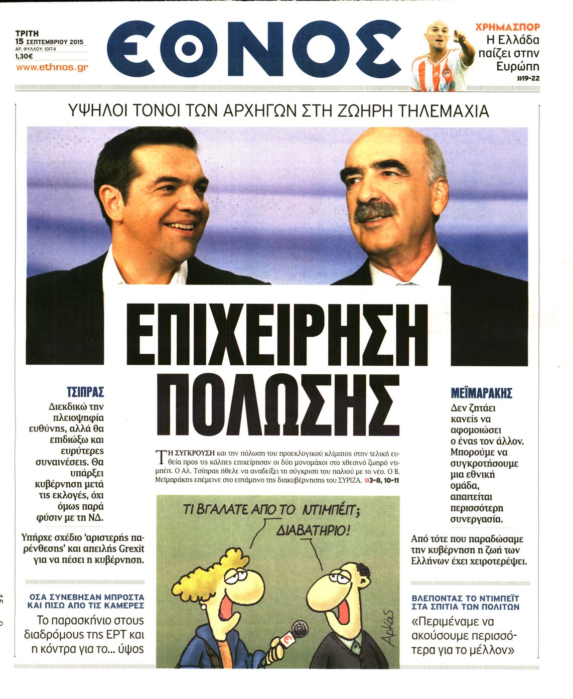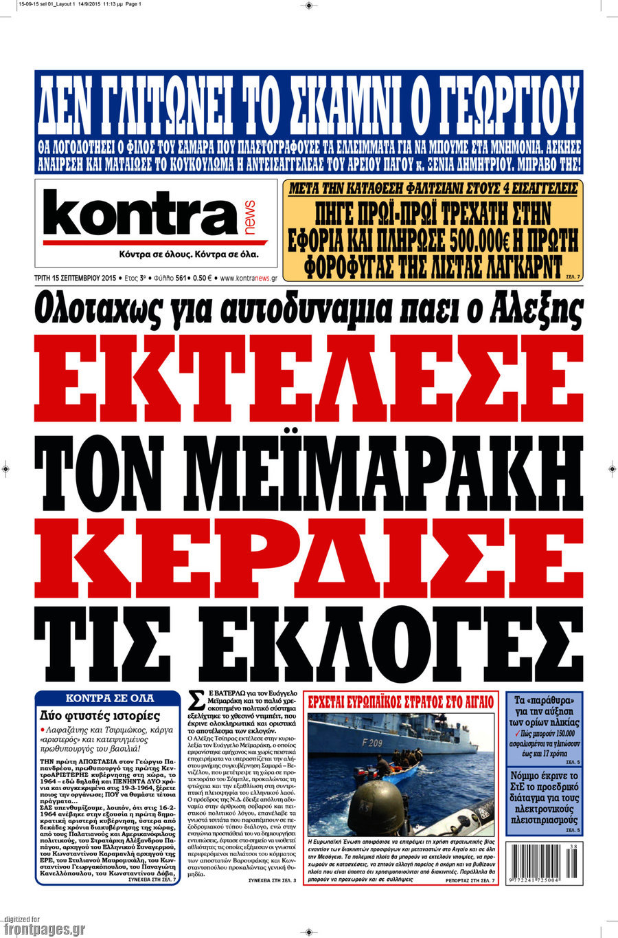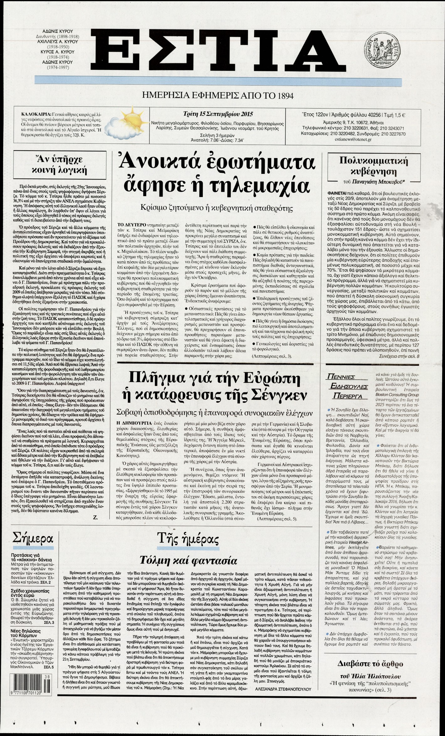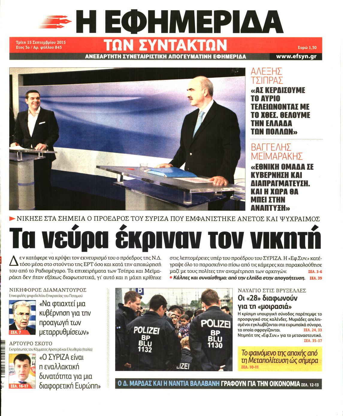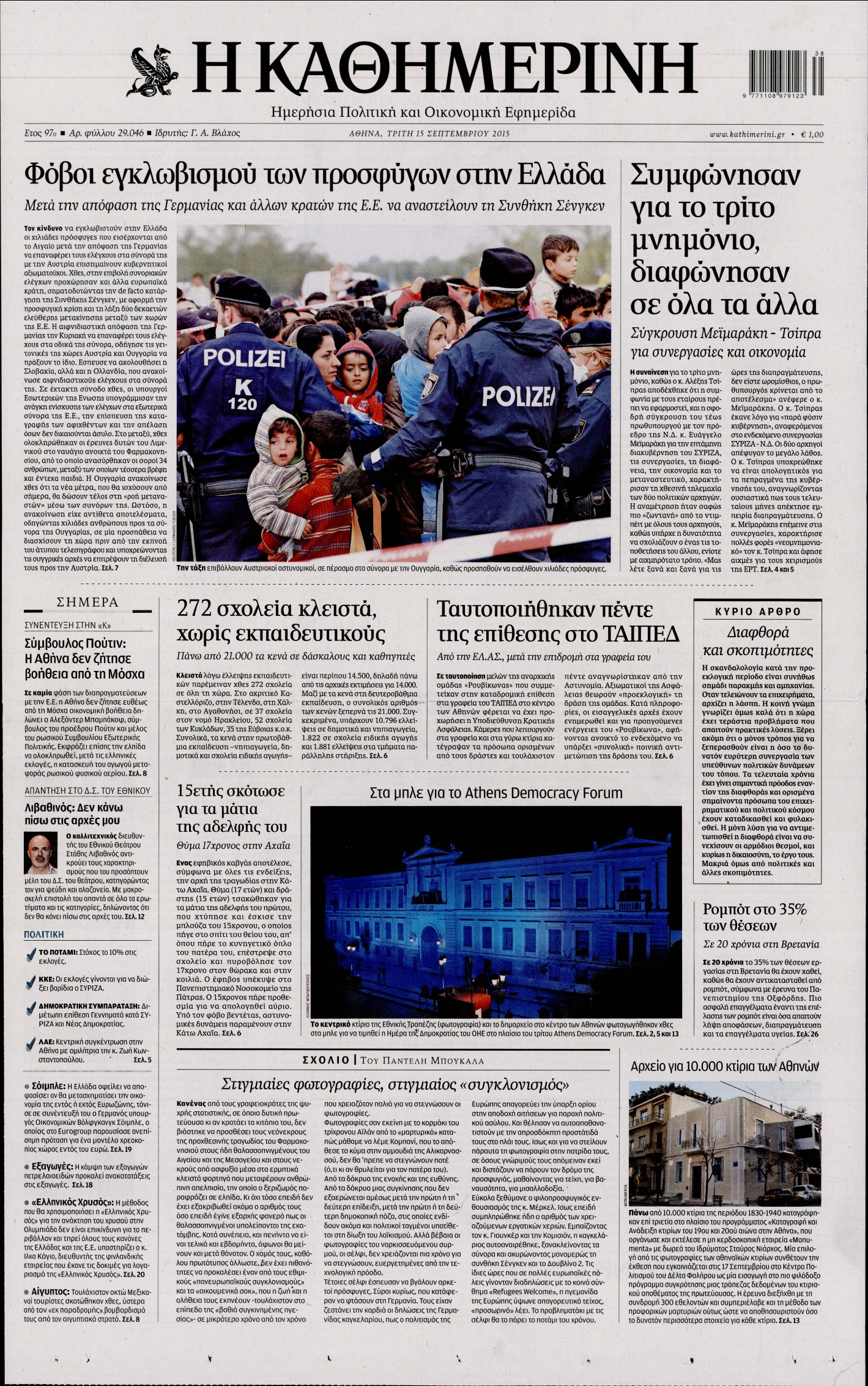 Oι πολιτικές εφημερίδες 15/9/2015 Enikos Newsroom 07:20, Τρίτη 15 Σεπτεμβρίου 2015 Media Διαβάστε τα σημερινά πρωτοσέλιδα των πολιτικών εφημερίδων: ΠΟΛΙΤΙΚΕΣ ΕΦΗΜΕΡΙΔΕΣ ΠΡΩΤΟΣΕΛΙΔΑ Μοιράσου το: σχολίασε κι εσύ (0 σχόλια) Ακολουθήστε το enikos.gr στο Google News και μάθετε πρώτοι όλες τις ειδήσεις Δείτε όλες τις τελευταίες ειδήσεις από την Ελλάδα και τον Κόσμο στο enikos.gr Ειδήσεις Ροή Ειδήσεων 2 ώρες πριν Χριστούγεννα στα μπλόκα: Επιμένουν στις κινητοποιήσεις τους οι αγρότες – Ανοίγουν τα διόδια το Σαββατοκύριακο 3 ώρες πριν Ουκρανία: Η άνευ προηγουμένου επίθεση σε ρωσικό τάνκερ στη Μεσόγειο και το μήνυμα προς στον Πούτιν – Το «μακρύ χέρι» του Κιέβου 2 ώρες πριν Πούτιν: Τα μηνύματα σε Ευρώπη και ΝΑΤΟ από το μαραθώνιο «σόου» του – Η απαίτηση για «σεβασμό» και η ειρήνη «με τους όρους» της Μόσχας 3 ώρες πριν Τραμπ: Δεν αποκλείει την πιθανότητα ενός πολέμου στη Βενεζουέλα – «Ο Μαδούρο ξέρει καλύτερα από τον καθένα τι ακριβώς θέλω» 3 ώρες πριν Συνεχίζει να προκαλεί ο Μίτσκοσκι: «Για μένα το όνομα Μακεδονία είναι ιερό» 2 ώρες πριν Ανακαλύφθηκαν αρχαία χρυσά νομίσματα 2.200 ετών που απεικονίζουν τον θεό Απόλλωνα – Η άγνωστη σύνδεση με τον Φίλιππο Β΄ της Μακεδονίας 3 ώρες πριν Ύπνος: Μια κρυφή κατάσταση του εγκεφάλου πριν από τον ύπνο μπορεί να είναι το “κλειδί” για υψηλή ευφυΐα και δημιουργικότητα 4 ώρες πριν Αριθμολογία: Οι άνθρωποι που έχουν γεννηθεί αυτές τις 4 ημερομηνίες, συχνά παρεξηγούνται – «Η καλοσύνη τους κρύβει τεράστια δύναμη» 5 ώρες πριν Ξεχάστε το καθάρισμα το Σαββατοκύριακο: Ο «κανόνας των 20 λεπτών» που θα σας λύσει τα χέρια 4 λεπτά πριν Μπαρτσελόνα – Μπασκόνια 134-124: Οι «μπλαουγκράνα» πήραν το ματς της χρονιάς ύστερα από τρεις παρατάσεις 19 λεπτά πριν Φαίη Σκορδά: «Παλιότερα τα κομπλιμέντα τα προσπερνούσα, τώρα τα έχω ανάγκη» 35 λεπτά πριν Βασίλης Σπανούλης: Δεν εμφανίστηκε ούτε ένας δημοσιογράφος στην συνέντευξη Τύπου – «Καλησπέρα στον… κανέναν», δείτε βίντεο 46 λεπτά πριν Πόλεμος στην Ουκρανία: Εφτά νεκροί από ρωσική πυραυλική επίθεση στο λιμάνι της Οδησσού 50 λεπτά πριν ΗΠΑ: Η κυβέρνηση του Ντόναλντ Τραμπ άρχισε να δημοσιοποιεί τα αρχεία Έπσταϊν ENIKOS NETWORK Το ΕΚΑΒ τιμήθηκε από την Ακαδημία Αθηνών για τα 40 χρόνια προσφοράς του Έχετε πραγματικά μεγάλη καρδιά; 10 χαρακτηριστικά όσων έχουν καλοσύνη Αναστολή μέτρων αναγκαστικής εκτέλεσης για κτηνοτρόφους που πλήττονται από την ευλογιά των αιγοπροβάτων Πλήρης επάρκεια προϊόντων στις λαϊκές της Αττικής, παρά τις αγροτικές κινητοποιήσεις – Τι απαντούν οι πωλητές Χαρτογραφώντας το «σημείο χωρίς επιστροφή»: Για πρώτη φορά αποκαλύπτεται με λεπτομέρεια το ακανθώδες όριο της ατμόσφαιρας τ... Η Google καταργεί τη λειτουργία «dark web report» – Πώς θα μπορούν οι χρήστες να διαγράφουν τα δεδομένα τους περισσότερα 22:42 , Παρασκευή 19 Δεκεμβρίου 2025 Γιώργος Γιαννόπουλος για “Το σόι σου”: “Είναι ευτυχία και ευλογία αυτή η σειρά” «Είναι ευτυχία και ευλογία η συγκυρία αυτής της σειράς», θα πει ο Γιώργος Γιαννόπουλος -ο αγαπ... 20:37 , Παρασκευή 19 Δεκεμβρίου 2025 Don’t Forget The Lyrics: Η Έλλη Κοκκίνου υποδέχεται 4 παίκτες που θα κάνουν τα πάντα για να μη χάσουν ούτε… μισή λέξη από τους στίχους Το «Don’t Forget The Lyrics» επιστρέφει απόψε, Παρασκευή 19 Δεκεμβρίου, στις 21:00 με νέο επει... 19:31 , Παρασκευή 19 Δεκεμβρίου 2025 GNTM: Απόψε ο μεγάλος τελικός για τους 4 φιναλίστ Έπειτα από μήνες γεμάτους μόδα, δημιουργία και έντονες αναμετρήσεις, το GNTM 2025 κορυφώνεται,... 18:11 , Παρασκ