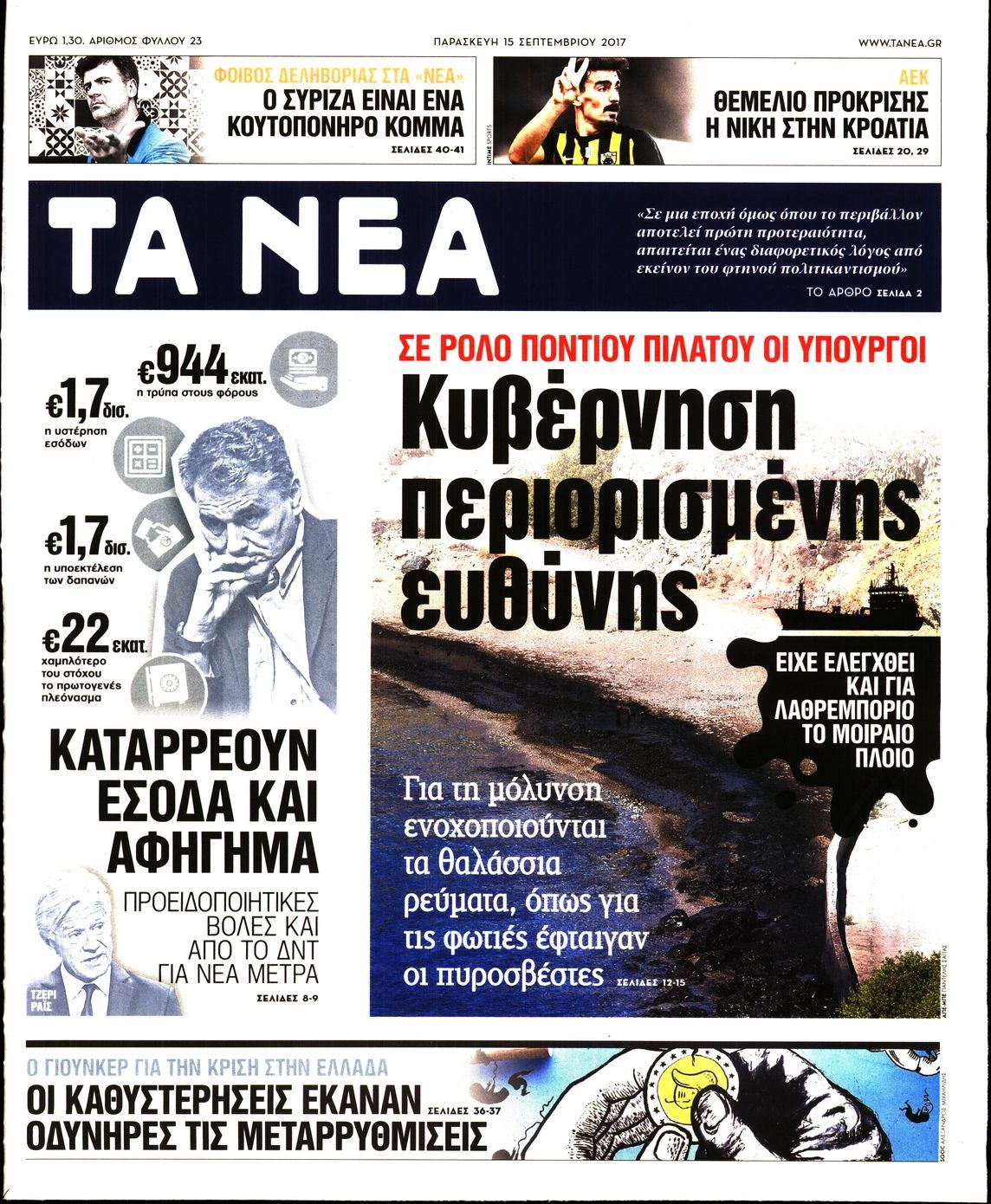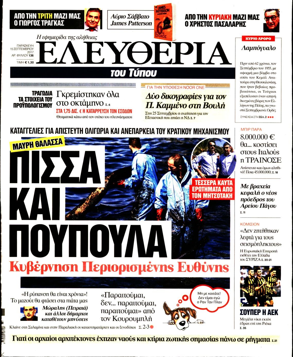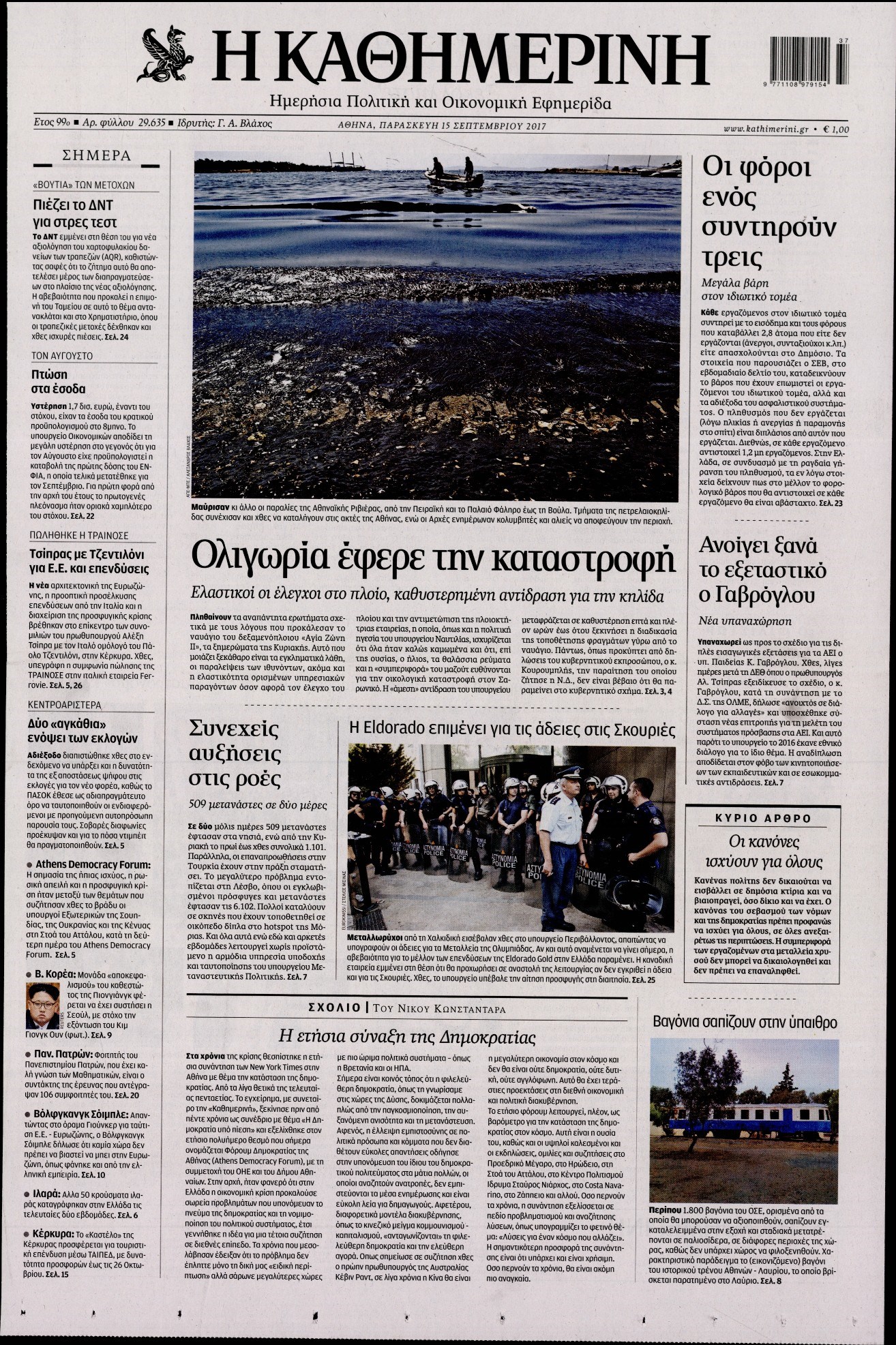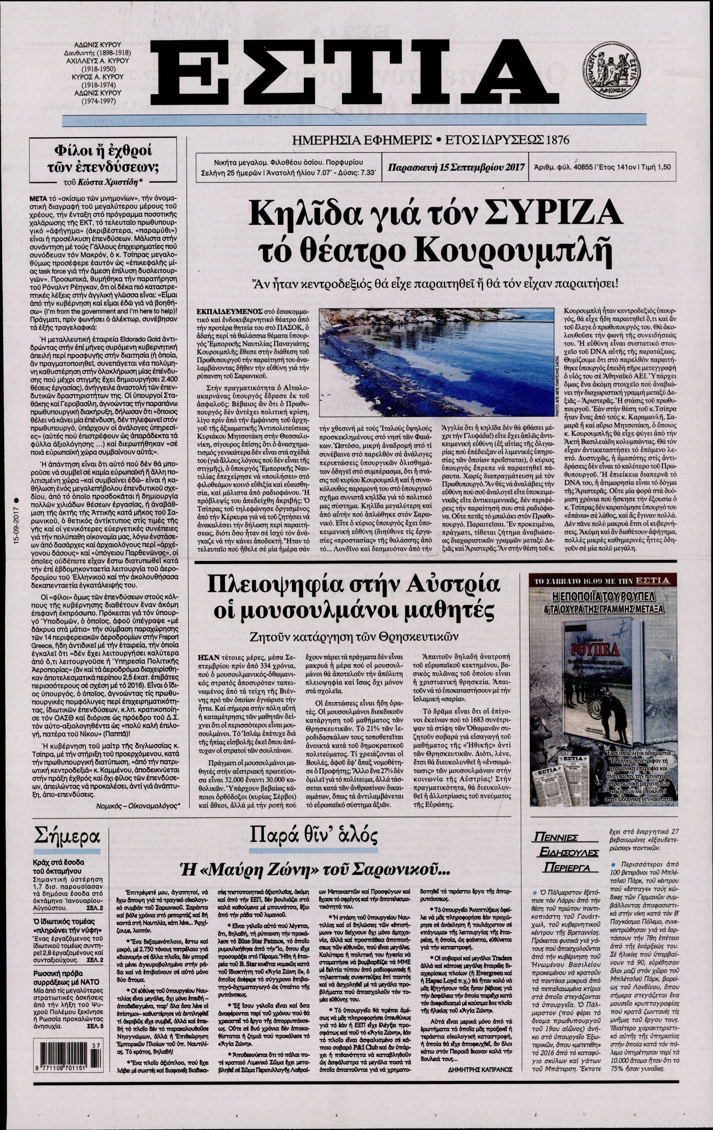 Οι πολιτικές εφημερίδες 15/9/2017 Enikos Newsroom 07:37, Παρασκευή 15 Σεπτεμβρίου 2017 Media Διαβάστε τα σημερινά πρωτοσέλιδα των πολιτικών εφημερίδων: ΠΟΛΙΤΙΚΕΣ ΕΦΗΜΕΡΙΔΕΣ ΠΡΩΤΟΣΕΛΙΔΑ Μοιράσου το: σχολίασε κι εσύ (0 σχόλια) Ακολουθήστε το enikos.gr στο Google News και μάθετε πρώτοι όλες τις ειδήσεις Δείτε όλες τις τελευταίες ειδήσεις από την Ελλάδα και τον Κόσμο στο enikos.gr Ειδήσεις Ροή Ειδήσεων 23 λεπτά πριν Τραμπ: Δεν αποκλείει την πιθανότητα ενός πολέμου στη Βενεζουέλα – «Ο Μαδούρο ξέρει καλύτερα από τον καθένα τι ακριβώς θέλω» 17 λεπτά πριν Ουκρανία: Η άνευ προηγουμένου επίθεση σε ρωσικό τάνκερ στη Μεσόγειο και το μήνυμα προς στον Πούτιν – Το «μακρύ χέρι» του Κιέβου 3 ώρες πριν Εμπλοκή και αερομαχίες με οπλισμένα τουρκικά F-16 στο Αιγαίο 3 ώρες πριν Πούτιν: «Ναι, είμαι ερωτευμένος» – Βίντεο από τη σπάνια προσωπική παραδοχή του 1 ώρα πριν Ανδρέας Λυκουρέντζος: Υπέβαλε την παραίτησή του ο πρόεδρος του ΕΛΓΑ, αλλά δεν έγινε δεκτή – Όλο το παρασκήνιο 2 ώρες πριν Αριθμολογία: Οι άνθρωποι που έχουν γεννηθεί αυτές τις 4 ημερομηνίες, συχνά παρεξηγούνται – «Η καλοσύνη τους κρύβει τεράστια δύναμη» 4 ώρες πριν Μήπως έχετε χάσει τον εαυτό σας στη σχέση σας; 7 «αθόρυβες» υποχωρήσεις που μάλλον κάνατε, χωρίς να το συνειδητοποιήσετε 3 ώρες πριν Ξεχάστε το καθάρισμα το Σαββατοκύριακο: Ο «κανόνας των 20 λεπτών» που θα σας λύσει τα χέρια 32 λεπτά πριν Ύπνος: Μια κρυφή κατάσταση του εγκεφάλου πριν από τον ύπνο μπορεί να είναι το “κλειδί” για υψηλή ευφυΐα και δημιουργικότητα 6 λεπτά πριν Χάρι και Μέγκαν: Η σπάνια οικογενειακή φωτογραφία με τον Άρτσι και τη Λίλιμπετ – Τι σχεδιάζουν για τα Χριστούγεννα 13 λεπτά πριν Βασίλης Καρράς: «Είναι πάντα δίπλα μου, δεν έφυγε…», λέει ο αδελφός του 17 λεπτά πριν Ουκρανία: Η άνευ προηγουμένου επίθεση σε ρωσικό τάνκερ στη Μεσόγειο και το μήνυμα προς στον Πούτιν – Το «μακρύ χέρι» του Κιέβου 23 λεπτά πριν Τραμπ: Δεν αποκλείει την πιθανότητα ενός πολέμου στη Βενεζουέλα – «Ο Μαδούρο ξέρει καλύτερα από τον καθένα τι ακριβώς θέλω» 24 λεπτά πριν Κηφισιά: Με πολλές απουσίες κόντρα στον Ολυμπιακό – «Last dance» για τον Τεττέη ENIKOS NETWORK Το ΕΚΑΒ τιμήθηκε από την Ακαδημία Αθηνών για τα 40 χρόνια προσφοράς του Έχετε πραγματικά μεγάλη καρδιά; 10 χαρακτηριστικά όσων έχουν καλοσύνη ΑΑΔΕ: Νέες αναβαθμίσεις στο Ψηφιακό Πελατολόγιο και την εφαρμογή myDATAapp – Τι πρέπει να γνωρίζετε Όμιλος ΔΕΗ: Νέα ορόσημα και ενισχυμένη διαφάνεια στην ετήσια Έκθεση Βιώσιμης Ανάπτυξης Χαρτογραφώντας το «σημείο χωρίς επιστροφή»: Για πρώτη φορά αποκαλύπτεται με λεπτομέρεια το ακανθώδες όριο της ατμόσφαιρας τ... Η Google καταργεί τη λειτουργία «dark web report» – Πώς θα μπορούν οι χρήστες να διαγράφουν τα δεδομένα τους περισσότερα 20:37 , Παρασκευή 19 Δεκεμβρίου 2025 Don’t Forget The Lyrics: Η Έλλη Κοκκίνου υποδέχεται 4 παίκτες που θα κάνουν τα πάντα για να μη χάσουν ούτε… μισή λέξη από τους στίχους Το «Don’t Forget The Lyrics» επιστρέφει απόψε, Παρασκευή 19 Δεκεμβρίου, στις 21:00 με νέο επει... 19:31 , Παρασκευή 19 Δεκεμβρίου 2025 GNTM: Απόψε ο μεγάλος τελικός για τους 4 φιναλίστ Έπειτα από μήνες γεμάτους μόδα, δημιουργία και έντονες αναμετρήσεις, το GNTM 2025 κορυφώνεται,... 18:11 , Παρασκευή 19 Δεκεμβρίου 2025 Το σόι σου: Ο Άρης έρχεται στην Ελλάδα για τις γιορτές των Χριστουγέννων – Τι θα δούμε στο αποψινό εορταστικό επεισόδιο Ένα απολαυστικό, εορταστικό επεισόδιο της σειράς “Το σόι σου”, γεμάτο ευτράπελα αλ... 15:15 , Παρασκευή 19 Δεκεμβρίου 2025 Την Κυριακή με τη R
