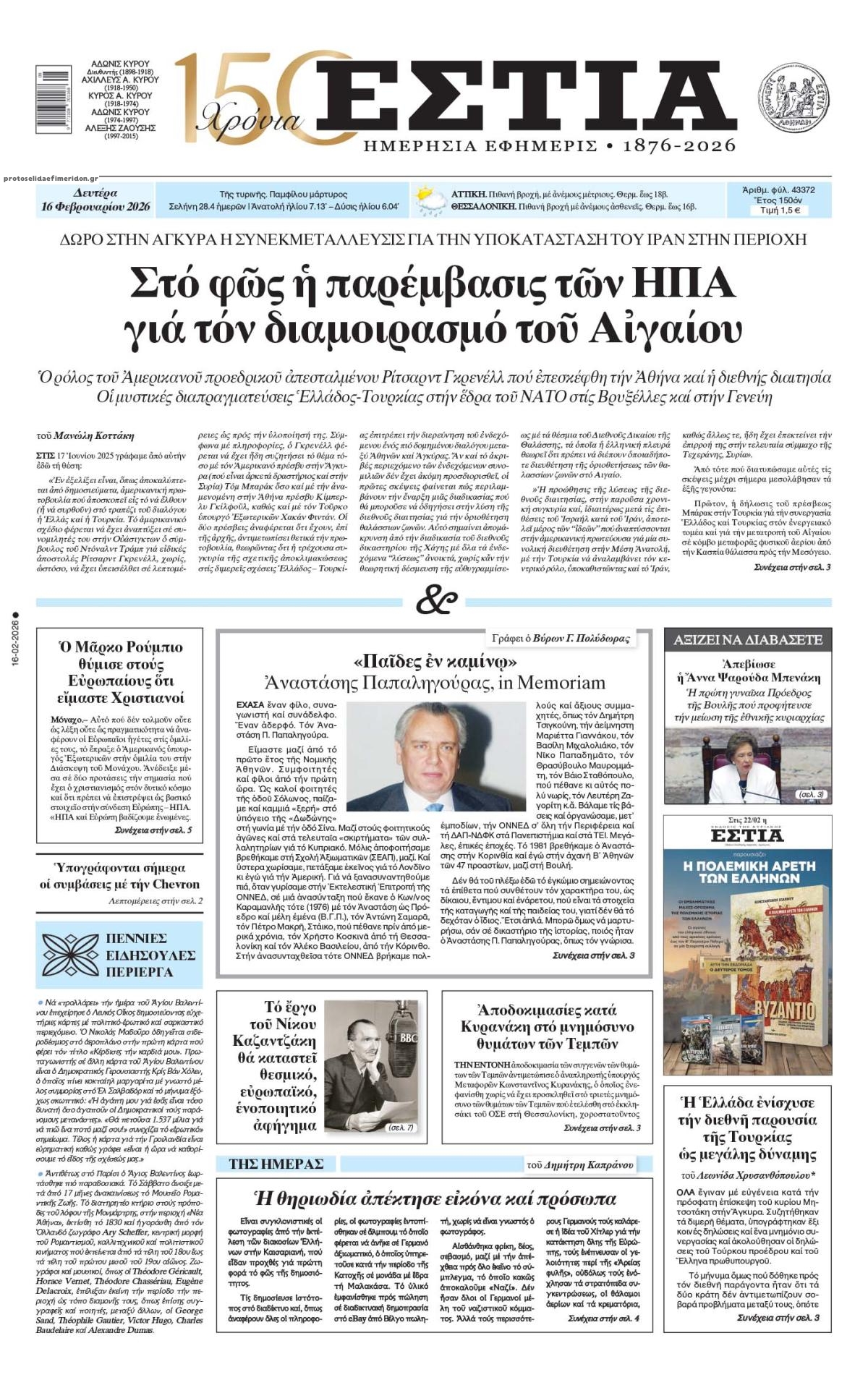 Οι πολιτικές εφημερίδες 16/2/2026 Enikos Newsroom 05:38, Δευτέρα 16 Φεβρουαρίου 2026 Media Διαβάστε τα πρωτοσέλιδα από τις πολιτικές εφημερίδες, σήμερα 16/2/2026. ΕΦΗΜΕΡΙΔΕΣ ΠΟΛΙΤΙΚΕΣ ΕΦΗΜΕΡΙΔΕΣ ΠΡΩΤΟΣΕΛΙΔΑ Μοιράσου το: CBS News: Ο Τραμπ είπε στον Νετανιάχου ότι θα υποστηρίξει ισραηλινά πλήγματα στο Ιράν, αν δεν υπάρξει συμφωνία Αρχεία Έπσταϊν: Μπιγιόνσε, Σερ, Καρντάσιαν, Ομπάμα, Μέγκαν Μαρκλ, Ρόμπερτ ντε Νιρο και πολλοί άλλοι διάσημοι σε λίστα 305 αναφερόμενων ονομάτων Στη Σομαλία το νέο γεωτρύπανο 7ης γενιάς της Τουρκίας για την πρώτη επιχείρηση εκτός τουρκικών υδάτων σχολίασε κι εσύ (0 σχόλια) Ακολουθήστε το enikos.gr στο Google News και μάθετε πρώτοι όλες τις ειδήσεις Δείτε όλες τις τελευταίες ειδήσεις από την Ελλάδα και τον Κόσμο στο enikos.gr Ειδήσεις Ροή Ειδήσεων 9 ώρες πριν Κρήτη: «Τον έσφαξα σαν τον χοίρο» είπε ο 64χρονος αδελφοκτόνος στους αστυνομικούς – Είχε πυροβολήσει πισώπλατα συγχωριανό του το 2011 7 ώρες πριν Βιολάντα: Το έγγραφο που «καίει» τον ιδιοκτήτη και η μαρτυρία του υδραυλικού – Μυστήριο με εκσκαφές σε άλλο εργοστάσιο της εταιρείας 8 ώρες πριν Φυλακές Δομοκού: Ισοβίτης σκότωσε βαρυποινίτη στο γραφείο του αρχιφύλακα 5 ώρες πριν Πολιτικές παρεμβάσεις ώστε τα φωτογραφικά ντοκουμέντα από τις εκτελέσεις στο Σκοπευτήριο της Καισαριανής να μείνουν στη χώρα 6 ώρες πριν Eurovision – Sing for Greece 2026: Ο Akylas με το «Ferto» θα εκπροσωπήσει την Ελλάδα στη Βιέννη 8 ώρες πριν Οι επιστήμονες εντόπισαν 5 τύπους ύπνου: Οι επιπτώσεις τους στην υγεία και τη συμπεριφορά, σύμφωνα με μελέτη 11 ώρες πριν Οργάνωση ψυγείου: Πώς να αποθηκεύσετε σωστά τα τρόφιμα χρησιμοποιώντας τις ζώνες θερμοκρασίας της συσκευής 9 ώρες πριν Αριθμολογία: Οι 4 τυχερές ημερομηνίες γέννησης που οδηγούν στην επιτυχία 7 ώρες πριν Ένας «θησαυρός» θαμμένος για χιλιετίες – Ανακαλύφθηκε σπουδαίος αρχαίος οικισμός μέσα σε πανεπιστήμιο 5 λεπτά πριν Χοληστερίνη: Η απλή αλλαγή στη διατροφή που βοηθάει στην μείωσή της, σύμφωνα με μελέτη 13 λεπτά πριν Σαν σήμερα 16 Φεβρουαρίου: Τα σημαντικότερα γεγονότα της ημέρας 17 λεπτά πριν Οι οικονομικές εφημερίδες 16/2/2026 22 λεπτά πριν Οι αθλητικές εφημερίδες 16/2/2026 ENIKOS NETWORK Προληπτική αντιγήρανση: Η νέα τάση στην αισθητική που ξεκινά από τα 25 – Ποιες θεραπείες πρέπει να γίνονται Οι επιστήμονες ανακάλυψαν το χαρακτηριστικό που έχουν οι πιο ευφυείς άνθρωποι – Τι είναι ο δείκτης AQ «Χαμόγελα» στη Διώρυγα του Σουέζ: Τα έσοδα και η κίνηση πλοίων σε ανοδική πορεία Παπασταύρου: Η Ευρώπη να επενδύσει στην ενεργειακή της ασφάλεια – Επιτακτικός στόχος οι προσιτές τιμές για νοικοκυριά και ε... Ευπάθεια στο moltbook ai αποκαλύπτει email, tokens σύνδεσης και api keys Αυτός είναι ο ρόλος της μικρής τρύπας στους νυχοκόπτες – «Είμαι ο μόνος που δεν το ήξερε;»» περισσότερα 04:52 , Δευτέρα 16 Φεβρουαρίου 2026 Αφροδίτη Γραμμέλη για Eurovision 2026: «Με ποια κριτήρια επιλέχθηκαν τα μέλη της επιτροπής;» Για τα κριτήρια επιλογής των μελών της ελληνικής επιτροπής της Eurovision 2026 αναρωτιέται η δ... 03:20 , Δευτέρα 16 Φεβρουαρίου 2026 «Φέρτο μας»: Χαμός στα social media για τη νίκη του Akyla στον ελληνικό τελικό της Eurovision Ο Akylas τα… πήρε όλα στον ελληνικό τελικό για τη Eurovision 2026 και θα εκπροσωπήσει τη... 00:05 , Δευτέρα 16 Φεβρουαρίου 2026 Eurovision – Sing for Greece 2026: Ο Akylas με το «Ferto» θα εκπροσωπήσει την Ελλάδα στη Βιέννη Γνωστός έγινε ο τραγουδιστής που θα εκπροσωπήσει τη χώρα μας στον μουσικό διαγωνισμό της Eurov... 09:59 , Κυριακή 15 Φεβρουαρίου 2026 Τηλεθέαση (14/2): Τι νούμερα έκανε στην 