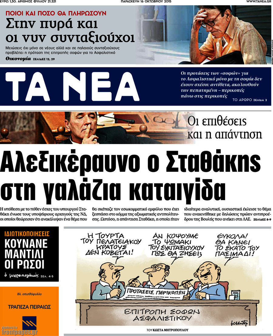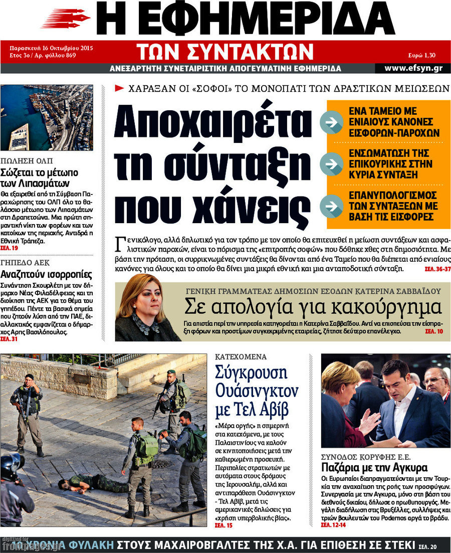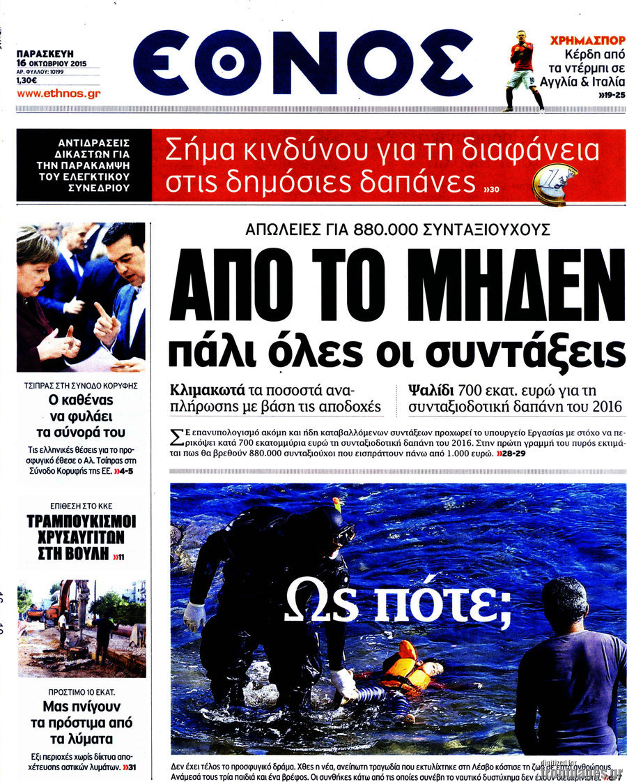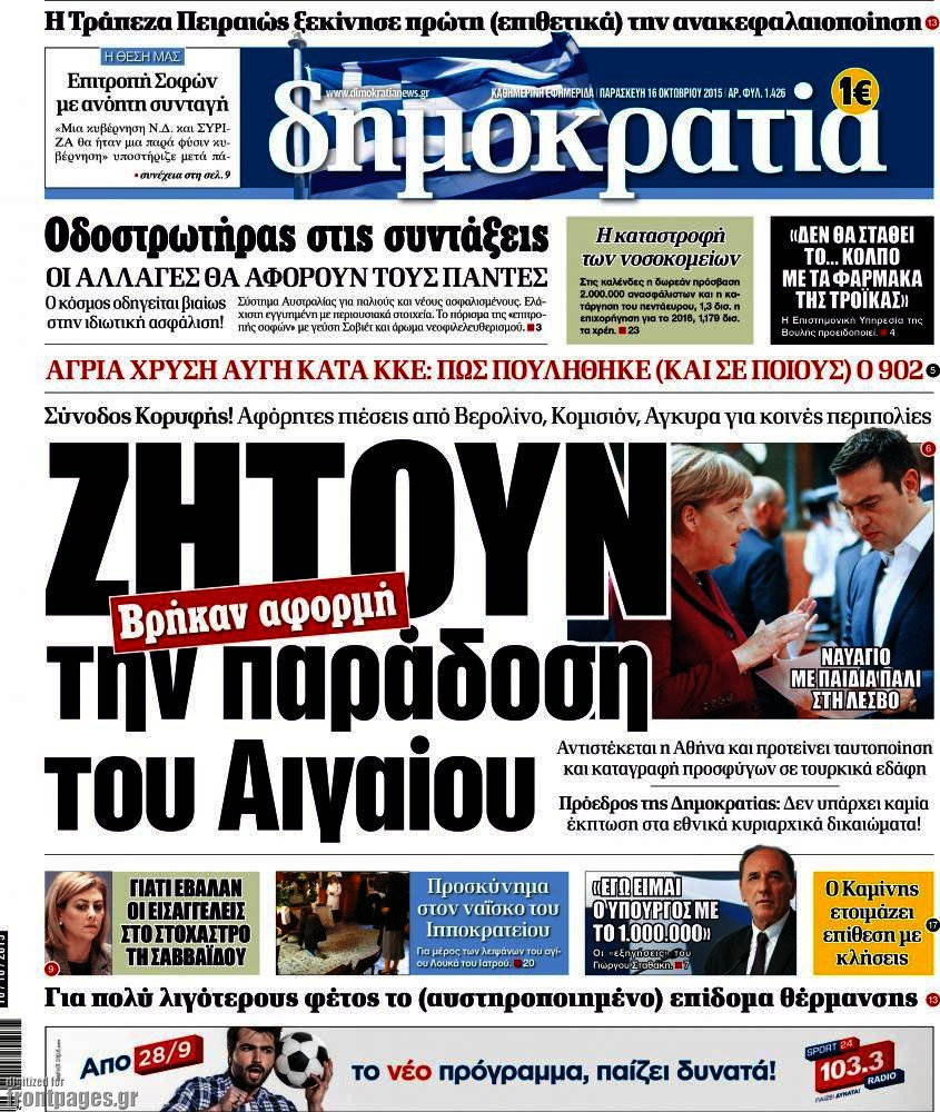 Οι πολιτικές εφημερίδες 16/10/2015 Enikos Newsroom 08:11, Παρασκευή 16 Οκτωβρίου 2015 Media Διαβάστε τα σημερινά πρωτοσέλιδα των πολιτικών εφημερίδων: ΠΟΛΙΤΙΚΕΣ ΕΦΗΜΕΡΙΔΕΣ ΠΡΩΤΟΣΕΛΙΔΑ Μοιράσου το: σχολίασε κι εσύ (0 σχόλια) Ακολουθήστε το enikos.gr στο Google News και μάθετε πρώτοι όλες τις ειδήσεις Δείτε όλες τις τελευταίες ειδήσεις από την Ελλάδα και τον Κόσμο στο enikos.gr Ειδήσεις Ροή Ειδήσεων 2 ώρες πριν Χριστούγεννα στα μπλόκα: Επιμένουν στις κινητοποιήσεις τους οι αγρότες – Ανοίγουν τα διόδια το Σαββατοκύριακο 2 ώρες πριν Ουκρανία: Η άνευ προηγουμένου επίθεση σε ρωσικό τάνκερ στη Μεσόγειο και το μήνυμα προς στον Πούτιν – Το «μακρύ χέρι» του Κιέβου 1 ώρα πριν Πούτιν: Τα μηνύματα σε Ευρώπη και ΝΑΤΟ από το μαραθώνιο «σόου» του – Η απαίτηση για «σεβασμό» και η ειρήνη «με τους όρους» της Μόσχας 2 ώρες πριν Τραμπ: Δεν αποκλείει την πιθανότητα ενός πολέμου στη Βενεζουέλα – «Ο Μαδούρο ξέρει καλύτερα από τον καθένα τι ακριβώς θέλω» 3 ώρες πριν Συνεχίζει να προκαλεί ο Μίτσκοσκι: «Για μένα το όνομα Μακεδονία είναι ιερό» 1 ώρα πριν Ανακαλύφθηκαν αρχαία χρυσά νομίσματα 2.200 ετών που απεικονίζουν τον θεό Απόλλωνα – Η άγνωστη σύνδεση με τον Φίλιππο Β΄ της Μακεδονίας 2 ώρες πριν Ύπνος: Μια κρυφή κατάσταση του εγκεφάλου πριν από τον ύπνο μπορεί να είναι το “κλειδί” για υψηλή ευφυΐα και δημιουργικότητα 3 ώρες πριν Αριθμολογία: Οι άνθρωποι που έχουν γεννηθεί αυτές τις 4 ημερομηνίες, συχνά παρεξηγούνται – «Η καλοσύνη τους κρύβει τεράστια δύναμη» 4 ώρες πριν Ξεχάστε το καθάρισμα το Σαββατοκύριακο: Ο «κανόνας των 20 λεπτών» που θα σας λύσει τα χέρια 14 λεπτά πριν Βασίλης Σπανούλης: Δεν εμφανίστηκε ούτε ένας δημοσιογράφος στην συνέντευξη Τύπου – «Καλησπέρα στον… κανέναν», δείτε βίντεο 25 λεπτά πριν Πόλεμος στην Ουκρανία: Εφτά νεκροί από ρωσική πυραυλική επίθεση στο λιμάνι της Οδησσού 28 λεπτά πριν ΗΠΑ: Η κυβέρνηση του Ντόναλντ Τραμπ άρχισε να δημοσιοποιεί τα αρχεία Έπσταϊν 40 λεπτά πριν Σάμος: Άνοιξε το μπλόκο των αγροτών στον κόμβο Κοκκαρίου – Σε νέα συνεδρίαση θα καθορίσουν την στάση τους 48 λεπτά πριν Άνω Λιόσια: Πυροβολισμοί σε επιχείρηση με χαλιά – Εντοπίστηκαν 10 κάλυκες ENIKOS NETWORK Το ΕΚΑΒ τιμήθηκε από την Ακαδημία Αθηνών για τα 40 χρόνια προσφοράς του Έχετε πραγματικά μεγάλη καρδιά; 10 χαρακτηριστικά όσων έχουν καλοσύνη Αναστολή μέτρων αναγκαστικής εκτέλεσης για κτηνοτρόφους που πλήττονται από την ευλογιά των αιγοπροβάτων Πλήρης επάρκεια προϊόντων στις λαϊκές της Αττικής, παρά τις αγροτικές κινητοποιήσεις – Τι απαντούν οι πωλητές Χαρτογραφώντας το «σημείο χωρίς επιστροφή»: Για πρώτη φορά αποκαλύπτεται με λεπτομέρεια το ακανθώδες όριο της ατμόσφαιρας τ... Η Google καταργεί τη λειτουργία «dark web report» – Πώς θα μπορούν οι χρήστες να διαγράφουν τα δεδομένα τους περισσότερα 22:42 , Παρασκευή 19 Δεκεμβρίου 2025 Γιώργος Γιαννόπουλος για “Το σόι σου”: “Είναι ευτυχία και ευλογία αυτή η σειρά” «Είναι ευτυχία και ευλογία η συγκυρία αυτής της σειράς», θα πει ο Γιώργος Γιαννόπουλος -ο αγαπ... 20:37 , Παρασκευή 19 Δεκεμβρίου 2025 Don’t Forget The Lyrics: Η Έλλη Κοκκίνου υποδέχεται 4 παίκτες που θα κάνουν τα πάντα για να μη χάσουν ούτε… μισή λέξη από τους στίχους Το «Don’t Forget The Lyrics» επιστρέφει απόψε, Παρασκευή 19 Δεκεμβρίου, στις 21:00 με νέο επει... 19:31 , Παρασκευή 19 Δεκεμβρίου 2025 GNTM: Απόψε ο μεγάλος τελικός για τους 4 φιναλίστ Έπειτα από μήνες γεμάτους μόδα, δημιουργία και έντονες αναμετρήσεις, το GNTM 2025 κορυφώνεται,... 18:11 , Παρ