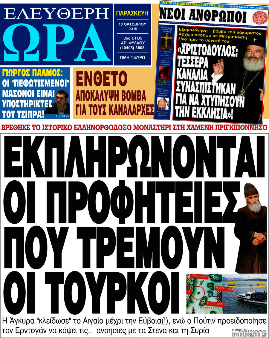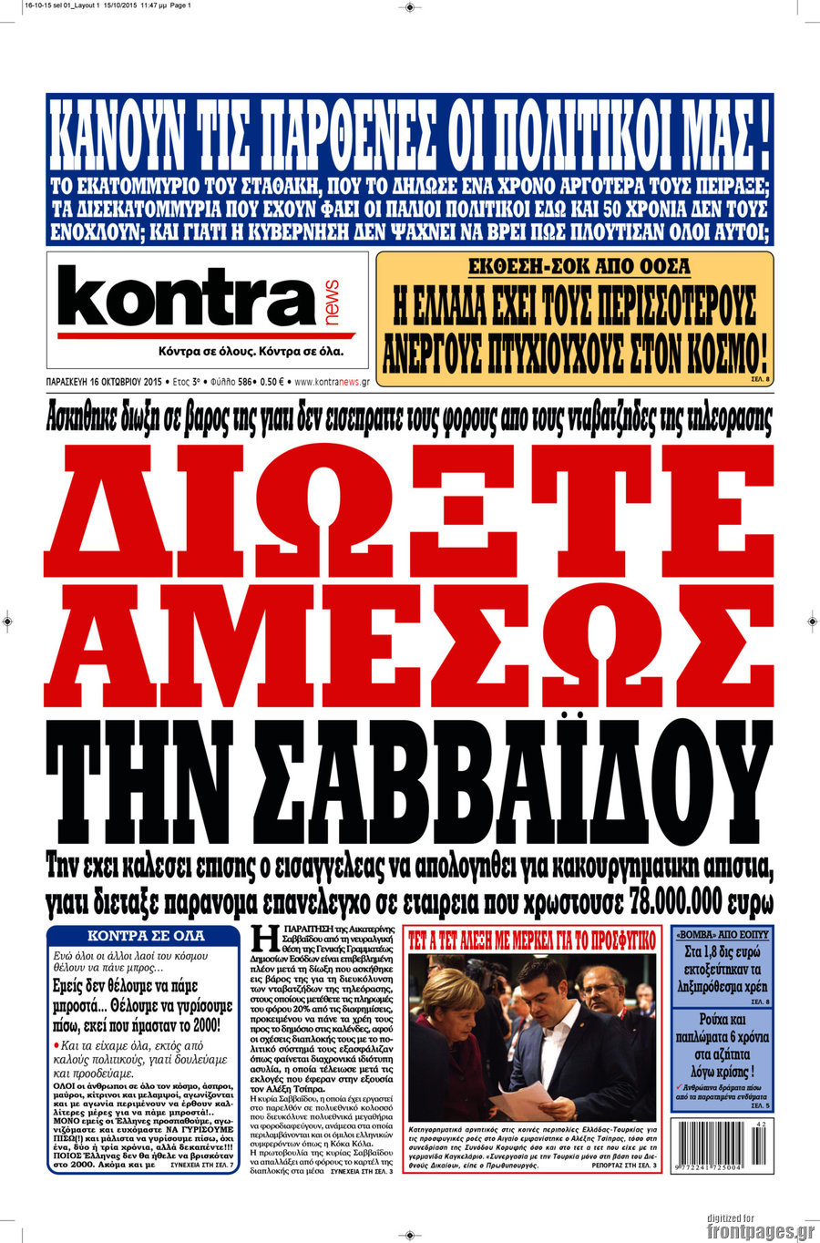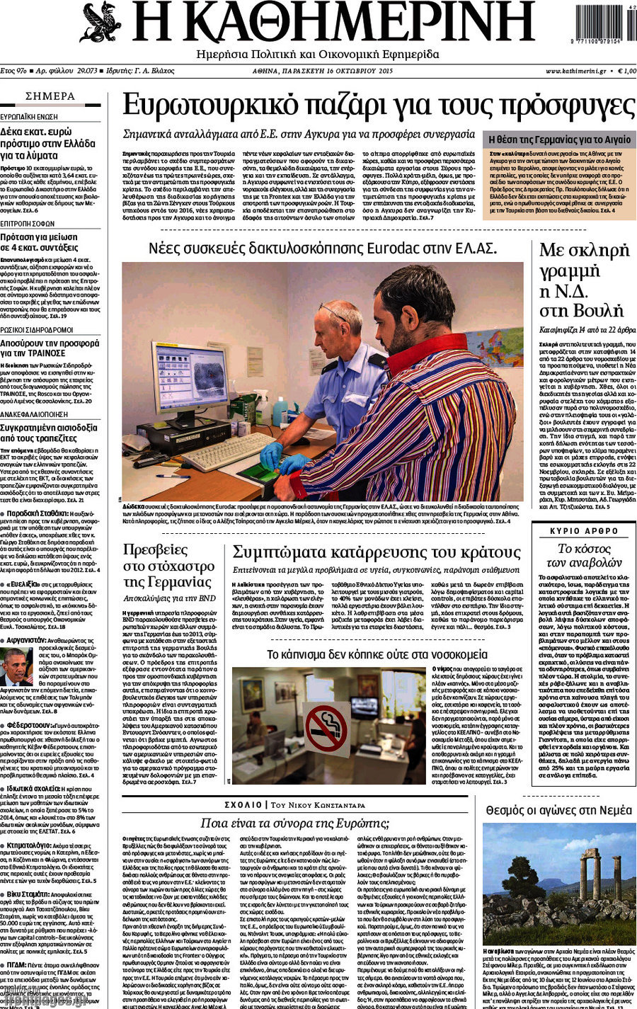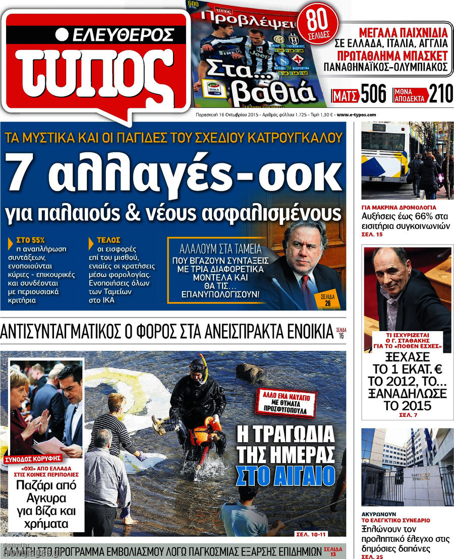 Οι πολιτικές εφημερίδες 16/10/2015 Enikos Newsroom 08:11, Παρασκευή 16 Οκτωβρίου 2015 Media Διαβάστε τα σημερινά πρωτοσέλιδα των πολιτικών εφημερίδων: ΠΟΛΙΤΙΚΕΣ ΕΦΗΜΕΡΙΔΕΣ ΠΡΩΤΟΣΕΛΙΔΑ Μοιράσου το: σχολίασε κι εσύ (0 σχόλια) Ακολουθήστε το enikos.gr στο Google News και μάθετε πρώτοι όλες τις ειδήσεις Δείτε όλες τις τελευταίες ειδήσεις από την Ελλάδα και τον Κόσμο στο enikos.gr Ειδήσεις Ροή Ειδήσεων 2 ώρες πριν Χριστούγεννα στα μπλόκα: Επιμένουν στις κινητοποιήσεις τους οι αγρότες – Ανοίγουν τα διόδια το Σαββατοκύριακο 2 ώρες πριν Ουκρανία: Η άνευ προηγουμένου επίθεση σε ρωσικό τάνκερ στη Μεσόγειο και το μήνυμα προς στον Πούτιν – Το «μακρύ χέρι» του Κιέβου 1 ώρα πριν Πούτιν: Τα μηνύματα σε Ευρώπη και ΝΑΤΟ από το μαραθώνιο «σόου» του – Η απαίτηση για «σεβασμό» και η ειρήνη «με τους όρους» της Μόσχας 2 ώρες πριν Τραμπ: Δεν αποκλείει την πιθανότητα ενός πολέμου στη Βενεζουέλα – «Ο Μαδούρο ξέρει καλύτερα από τον καθένα τι ακριβώς θέλω» 3 ώρες πριν Συνεχίζει να προκαλεί ο Μίτσκοσκι: «Για μένα το όνομα Μακεδονία είναι ιερό» 1 ώρα πριν Ανακαλύφθηκαν αρχαία χρυσά νομίσματα 2.200 ετών που απεικονίζουν τον θεό Απόλλωνα – Η άγνωστη σύνδεση με τον Φίλιππο Β΄ της Μακεδονίας 2 ώρες πριν Ύπνος: Μια κρυφή κατάσταση του εγκεφάλου πριν από τον ύπνο μπορεί να είναι το “κλειδί” για υψηλή ευφυΐα και δημιουργικότητα 3 ώρες πριν Αριθμολογία: Οι άνθρωποι που έχουν γεννηθεί αυτές τις 4 ημερομηνίες, συχνά παρεξηγούνται – «Η καλοσύνη τους κρύβει τεράστια δύναμη» 4 ώρες πριν Ξεχάστε το καθάρισμα το Σαββατοκύριακο: Ο «κανόνας των 20 λεπτών» που θα σας λύσει τα χέρια 14 λεπτά πριν Βασίλης Σπανούλης: Δεν εμφανίστηκε ούτε ένας δημοσιογράφος στην συνέντευξη Τύπου – «Καλησπέρα στον… κανέναν», δείτε βίντεο 25 λεπτά πριν Πόλεμος στην Ουκρανία: Εφτά νεκροί από ρωσική πυραυλική επίθεση στο λιμάνι της Οδησσού 28 λεπτά πριν ΗΠΑ: Η κυβέρνηση του Ντόναλντ Τραμπ άρχισε να δημοσιοποιεί τα αρχεία Έπσταϊν 40 λεπτά πριν Σάμος: Άνοιξε το μπλόκο των αγροτών στον κόμβο Κοκκαρίου – Σε νέα συνεδρίαση θα καθορίσουν την στάση τους 48 λεπτά πριν Άνω Λιόσια: Πυροβολισμοί σε επιχείρηση με χαλιά – Εντοπίστηκαν 10 κάλυκες ENIKOS NETWORK Το ΕΚΑΒ τιμήθηκε από την Ακαδημία Αθηνών για τα 40 χρόνια προσφοράς του Έχετε πραγματικά μεγάλη καρδιά; 10 χαρακτηριστικά όσων έχουν καλοσύνη Αναστολή μέτρων αναγκαστικής εκτέλεσης για κτηνοτρόφους που πλήττονται από την ευλογιά των αιγοπροβάτων Πλήρης επάρκεια προϊόντων στις λαϊκές της Αττικής, παρά τις αγροτικές κινητοποιήσεις – Τι απαντούν οι πωλητές Χαρτογραφώντας το «σημείο χωρίς επιστροφή»: Για πρώτη φορά αποκαλύπτεται με λεπτομέρεια το ακανθώδες όριο της ατμόσφαιρας τ... Η Google καταργεί τη λειτουργία «dark web report» – Πώς θα μπορούν οι χρήστες να διαγράφουν τα δεδομένα τους περισσότερα 22:42 , Παρασκευή 19 Δεκεμβρίου 2025 Γιώργος Γιαννόπουλος για “Το σόι σου”: “Είναι ευτυχία και ευλογία αυτή η σειρά” «Είναι ευτυχία και ευλογία η συγκυρία αυτής της σειράς», θα πει ο Γιώργος Γιαννόπουλος -ο αγαπ... 20:37 , Παρασκευή 19 Δεκεμβρίου 2025 Don’t Forget The Lyrics: Η Έλλη Κοκκίνου υποδέχεται 4 παίκτες που θα κάνουν τα πάντα για να μη χάσουν ούτε… μισή λέξη από τους στίχους Το «Don’t Forget The Lyrics» επιστρέφει απόψε, Παρασκευή 19 Δεκεμβρίου, στις 21:00 με νέο επει... 19:31 , Παρασκευή 19 Δεκεμβρίου 2025 GNTM: Απόψε ο μεγάλος τελικός για τους 4 φιναλίστ Έπειτα από μήνες γεμάτους μόδα, δημιουργία και έντονες αναμετρήσεις, το GNTM 2025 κορυφώνεται,... 18:11 , Παρ