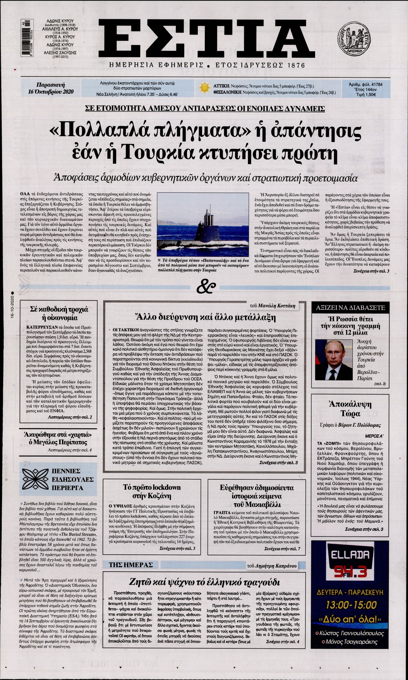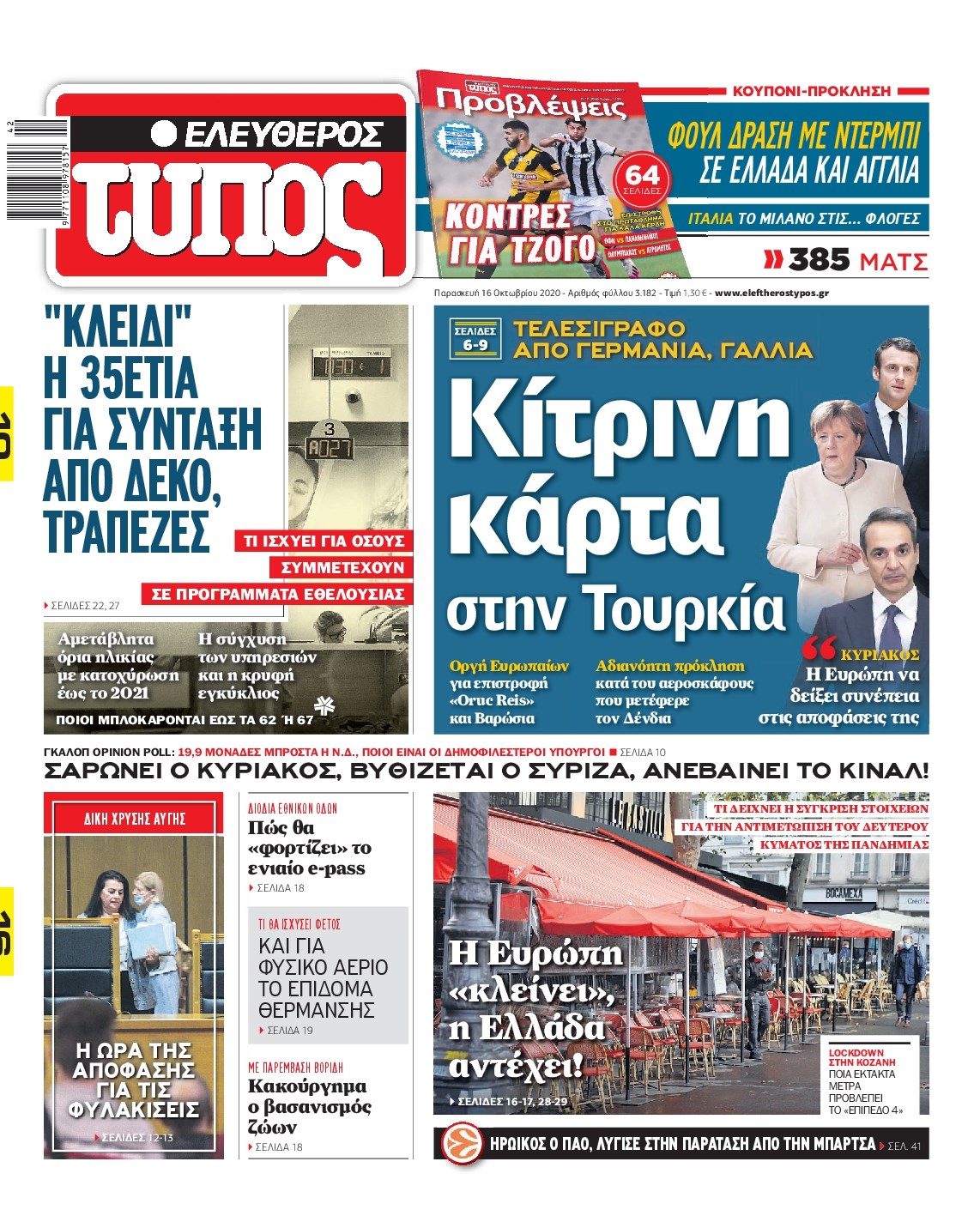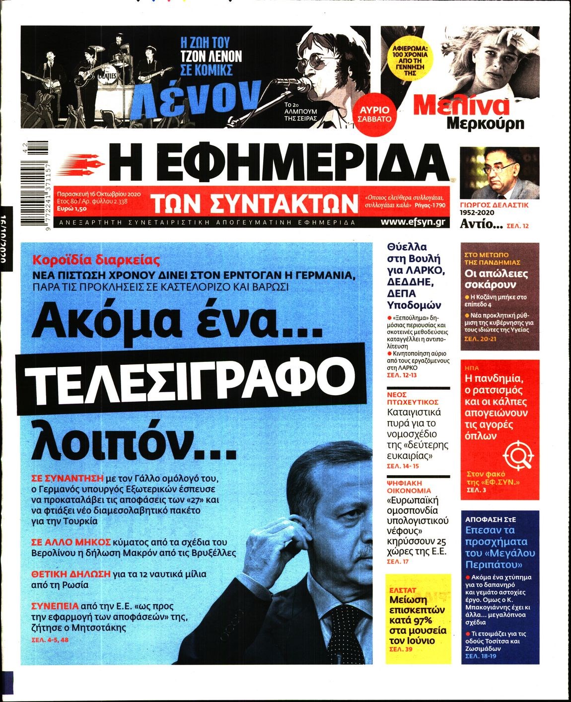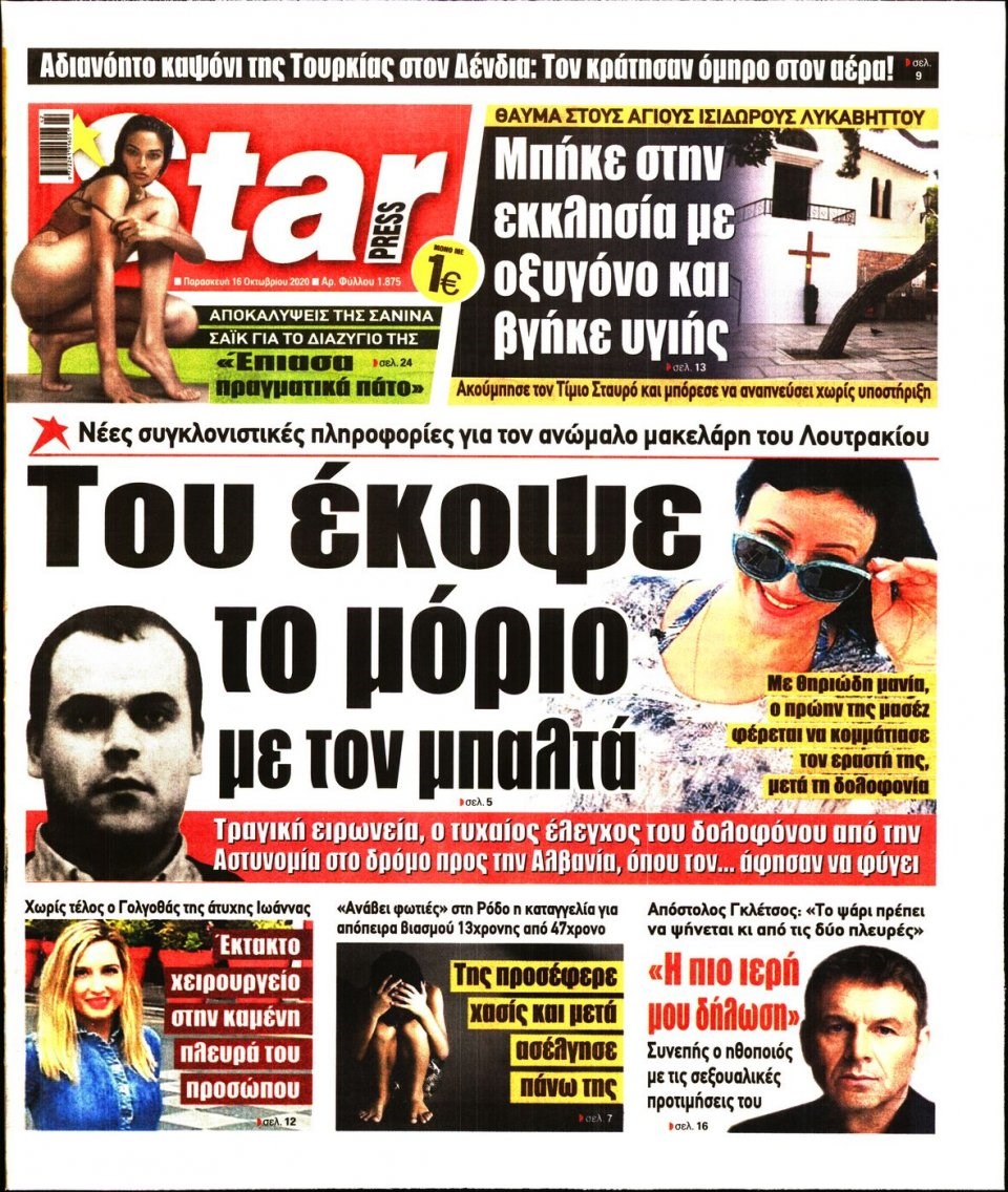 Οι πολιτικές εφημερίδες 16/10/2020 Διονύσης Νίκκας 06:08, Παρασκευή 16 Οκτωβρίου 2020 Media Διαβάστε τα πρωτοσέλιδα των πολιτικών εφημερίδων… ΠΟΛΙΤΙΚΕΣ ΕΦΗΜΕΡΙΔΕΣ ΠΡΩΤΟΣΕΛΙΔΑ Μοιράσου το: σχολίασε κι εσύ (0 σχόλια) Ακολουθήστε το enikos.gr στο Google News και μάθετε πρώτοι όλες τις ειδήσεις Δείτε όλες τις τελευταίες ειδήσεις από την Ελλάδα και τον Κόσμο στο enikos.gr Ειδήσεις Ροή Ειδήσεων 2 ώρες πριν Χριστούγεννα στα μπλόκα: Επιμένουν στις κινητοποιήσεις τους οι αγρότες – Ανοίγουν τα διόδια το Σαββατοκύριακο 2 ώρες πριν Ουκρανία: Η άνευ προηγουμένου επίθεση σε ρωσικό τάνκερ στη Μεσόγειο και το μήνυμα προς στον Πούτιν – Το «μακρύ χέρι» του Κιέβου 2 ώρες πριν Πούτιν: Τα μηνύματα σε Ευρώπη και ΝΑΤΟ από το μαραθώνιο «σόου» του – Η απαίτηση για «σεβασμό» και η ειρήνη «με τους όρους» της Μόσχας 3 ώρες πριν Τραμπ: Δεν αποκλείει την πιθανότητα ενός πολέμου στη Βενεζουέλα – «Ο Μαδούρο ξέρει καλύτερα από τον καθένα τι ακριβώς θέλω» 3 ώρες πριν Συνεχίζει να προκαλεί ο Μίτσκοσκι: «Για μένα το όνομα Μακεδονία είναι ιερό» 2 ώρες πριν Ανακαλύφθηκαν αρχαία χρυσά νομίσματα 2.200 ετών που απεικονίζουν τον θεό Απόλλωνα – Η άγνωστη σύνδεση με τον Φίλιππο Β΄ της Μακεδονίας 3 ώρες πριν Ύπνος: Μια κρυφή κατάσταση του εγκεφάλου πριν από τον ύπνο μπορεί να είναι το “κλειδί” για υψηλή ευφυΐα και δημιουργικότητα 4 ώρες πριν Αριθμολογία: Οι άνθρωποι που έχουν γεννηθεί αυτές τις 4 ημερομηνίες, συχνά παρεξηγούνται – «Η καλοσύνη τους κρύβει τεράστια δύναμη» 5 ώρες πριν Ξεχάστε το καθάρισμα το Σαββατοκύριακο: Ο «κανόνας των 20 λεπτών» που θα σας λύσει τα χέρια 15 λεπτά πριν Φαίη Σκορδά: «Παλιότερα τα κομπλιμέντα τα προσπερνούσα, τώρα τα έχω ανάγκη» 31 λεπτά πριν Βασίλης Σπανούλης: Δεν εμφανίστηκε ούτε ένας δημοσιογράφος στην συνέντευξη Τύπου – «Καλησπέρα στον… κανέναν», δείτε βίντεο 42 λεπτά πριν Πόλεμος στην Ουκρανία: Εφτά νεκροί από ρωσική πυραυλική επίθεση στο λιμάνι της Οδησσού 45 λεπτά πριν ΗΠΑ: Η κυβέρνηση του Ντόναλντ Τραμπ άρχισε να δημοσιοποιεί τα αρχεία Έπσταϊν 57 λεπτά πριν Σάμος: Άνοιξε το μπλόκο των αγροτών στον κόμβο Κοκκαρίου – Σε νέα συνεδρίαση θα καθορίσουν την στάση τους ENIKOS NETWORK Το ΕΚΑΒ τιμήθηκε από την Ακαδημία Αθηνών για τα 40 χρόνια προσφοράς του Έχετε πραγματικά μεγάλη καρδιά; 10 χαρακτηριστικά όσων έχουν καλοσύνη Αναστολή μέτρων αναγκαστικής εκτέλεσης για κτηνοτρόφους που πλήττονται από την ευλογιά των αιγοπροβάτων Πλήρης επάρκεια προϊόντων στις λαϊκές της Αττικής, παρά τις αγροτικές κινητοποιήσεις – Τι απαντούν οι πωλητές Χαρτογραφώντας το «σημείο χωρίς επιστροφή»: Για πρώτη φορά αποκαλύπτεται με λεπτομέρεια το ακανθώδες όριο της ατμόσφαιρας τ... Η Google καταργεί τη λειτουργία «dark web report» – Πώς θα μπορούν οι χρήστες να διαγράφουν τα δεδομένα τους περισσότερα 22:42 , Παρασκευή 19 Δεκεμβρίου 2025 Γιώργος Γιαννόπουλος για “Το σόι σου”: “Είναι ευτυχία και ευλογία αυτή η σειρά” «Είναι ευτυχία και ευλογία η συγκυρία αυτής της σειράς», θα πει ο Γιώργος Γιαννόπουλος -ο αγαπ... 20:37 , Παρασκευή 19 Δεκεμβρίου 2025 Don’t Forget The Lyrics: Η Έλλη Κοκκίνου υποδέχεται 4 παίκτες που θα κάνουν τα πάντα για να μη χάσουν ούτε… μισή λέξη από τους στίχους Το «Don’t Forget The Lyrics» επιστρέφει απόψε, Παρασκευή 19 Δεκεμβρίου, στις 21:00 με νέο επει... 19:31 , Παρασκευή 19 Δεκεμβρίου 2025 GNTM: Απόψε ο μεγάλος τελικός για τους 4 φιναλίστ Έπειτα από μήνες γεμάτους μόδα, δημιουργία και έντονες αναμετρήσεις, το GNTM 2025 κορυφώνεται,... 18:11 , 