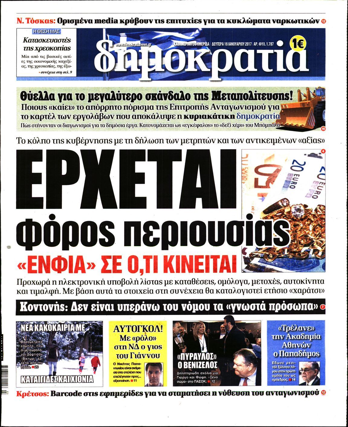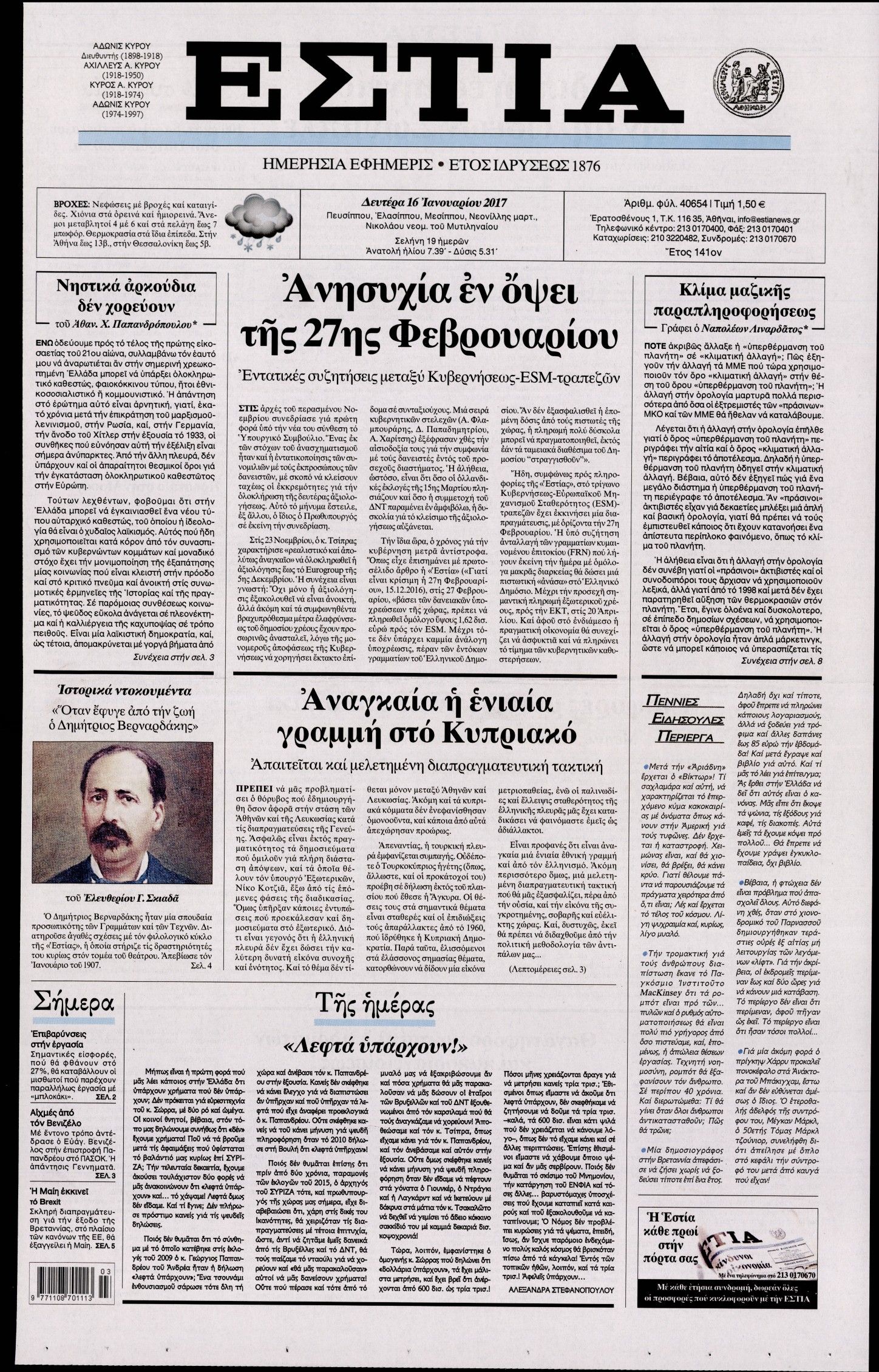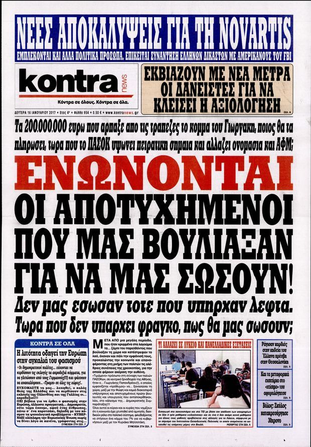 Οι πολιτικές εφημερίδες 16/1/2017 Κώστας Τεό 05:15, Δευτέρα 16 Ιανουαρίου 2017 Media Διαβάστε τα σημερινά πρωτοσέλιδα των πολιτικών εφημερίδων: ΠΟΛΙΤΙΚΕΣ ΕΦΗΜΕΡΙΔΕΣ ΠΡΩΤΟΣΕΛΙΔΑ Μοιράσου το: σχολίασε κι εσύ (0 σχόλια) Ακολουθήστε το enikos.gr στο Google News και μάθετε πρώτοι όλες τις ειδήσεις Δείτε όλες τις τελευταίες ειδήσεις από την Ελλάδα και τον Κόσμο στο enikos.gr Ειδήσεις Ροή Ειδήσεων 2 ώρες πριν Μπλόκα: Οι αγρότες σηκώνουν τις μπάρες σε διόδια για τους εκδρομείς των Χριστουγέννων και μοιράζουν προϊόντα – Βίντεο 3 ώρες πριν Τσιάρας προς αγρότες: Τα μπλόκα και τα πείσματα δεν ωφελούν – Οι λύσεις περνούν μέσα από τον διάλογο 4 ώρες πριν Αρχεία Έπσταϊν: Οι συγκλονιστικές φωτογραφίες – Ο Μάικλ Τζάκσον, ο Μικ Τζάγκερ και ο Κέβιν Σπέισι ανάμεσα στους διάσημους που απεικονίζονται 2 ώρες πριν Μαθητές διακινούσαν κοκαΐνη και χασίς σε σχολείο της Αττικής – 12 συλλήψεις 2 ώρες πριν Βέλγιο: Άγνωστοι έριξαν κόκκινη μπογιά στο προξενείο της Πολωνίας στις Βρυξέλλες 6 ώρες πριν Μία νέα «χρυσή» περίοδος αρχίζει για 3 ζώδια από σήμερα – «Μία αναπάντεχη ευκαιρία οδηγεί στην επιτυχία» 4 ώρες πριν Διαιτολόγος αποκαλύπτει 9 πρωινές συνήθειες που «λιώνουν» το κοιλιακό λίπος – «Υποστηρίζουν την υγιεινή απώλεια βάρους» 5 ώρες πριν Οι 7 φράσεις που δεν λένε ποτέ οι συναισθηματικά έξυπνοι άνθρωποι κατά τη διάρκεια ενός καβγά 7 ώρες πριν Enerwave: Το νέο «ρεύμα» στη λιανική ενέργειας που αλλάζει την εμπειρία του καταναλωτή 9 λεπτά πριν Στο νοσοκομείο ο Λευτέρης Πανταζής – Τι συνέβη 18 λεπτά πριν Super League: Με Κηφισιά ο Ολυμπιακός για να «κλείσει» το 2025 στην κορυφή – Αναλυτικά το πρόγραμμα της 15ης αγωνιστικής 23 λεπτά πριν ΕΛΑΣ: Συνελήφθησαν Υπαρχιπυροσβέστης και δύο ακόμη άτομα για κατοχή και διακίνηση ναρκωτικών ουσιών – Η καταγγελία και ο τιμοκατάλογος 31 λεπτά πριν Πακιστάν: Σε κάθειρξη 17 ετών καταδικάστηκαν ο πρώην πρωθυπουργός Ίμραν Χαν και η σύζυγός του 39 λεπτά πριν Μαρινάκης στον Realfm 97,8: Η κυβέρνηση σέβεται κάθε λογική διεκδίκηση των αγροτών, αλλά και το αίτημα των πολιτών να μην ταλαιπωρούνται ENIKOS NETWORK Η αποχή από την αναπαραγωγή παρατείνει τη ζωή στα ζώα, σύμφωνα με μελέτη – Τι ισχύει για τους ανθρώπους; Σημαντικές επαφές στις ΗΠΑ είχε ο υπουργός Υγείας Άδωνις Γεωργιάδης Επιτροπή Ανταγωνισμού: Στο μικροσκόπιο σχολικές τσάντες και επώνυμα brands – Τι ερευνάται Ευλογιά αιγοπροβάτων: Παρατεταμένη επιζωοτία, αυστηρά μέτρα – Τι ισχύει για τον εμβολιασμό και την ανασύσταση του ζωικού κε... Χαρτογραφώντας το «σημείο χωρίς επιστροφή»: Για πρώτη φορά αποκαλύπτεται με λεπτομέρεια το ακανθώδες όριο της ατμόσφαιρας τ... Η Google καταργεί τη λειτουργία «dark web report» – Πώς θα μπορούν οι χρήστες να διαγράφουν τα δεδομένα τους περισσότερα 14:04 , Σάββατο 20 Δεκεμβρίου 2025 Η Realnews αυτής της Κυριακής (21/12/2025) Με τίτλο: «Ασπίδα προστασίας για την Ελλάδα» κυκλοφορεί, αυτήν την Κυριακή, η Realnews. Σημαντ... 12:53 , Σάββατο 20 Δεκεμβρίου 2025 Να μ’ αγαπάς: Το παρελθόν έρχεται στο φως – Καταιγιστικές εξελίξεις στα τελευταία επεισόδια του 2025 Ο Άγγελος αποκαλύπτεται, η Φωτεινή ανησυχεί για τον Λευτέρη και η Ζωή έρχεται αντιμέτωπη με το... 11:41 , Σάββατο 20 Δεκεμβρίου 2025 «Η αγάπη δεν χάνεται ποτέ»: Η μικρού μήκους ταινία κινουμένων σχεδίων που θέτει ερωτήματα για τη ζωή και τον θάνατο Ο θάνατος είναι ένα από τα πιο σκληρά θέματα που καλείται να διαχειριστεί κάποιος στη διάρκεια... 09:30 , Σάββατο 20 Δεκεμβρίου 2025 «Porto Leone: Στη γειτονιά με 