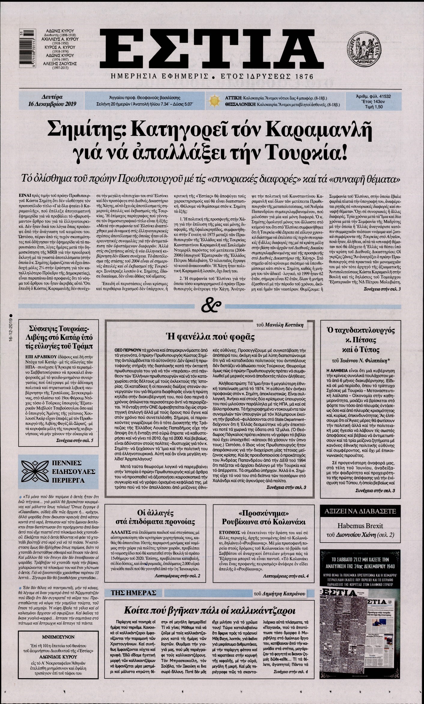 Οι πολιτικές εφημερίδες 16/12/19 Διονύσης Νίκκας 06:30, Δευτέρα 16 Δεκεμβρίου 2019 Media Διαβάστε τα πρωτοσέλιδα των πολιτικών εφημερίδων… ΕΦΗΜΕΡΙΔΕΣ ΠΟΛΙΤΙΚΕΣ ΠΡΩΤΟΣΕΛΙΔΑ Μοιράσου το: σχολίασε κι εσύ (0 σχόλια) Ακολουθήστε το enikos.gr στο Google News και μάθετε πρώτοι όλες τις ειδήσεις Δείτε όλες τις τελευταίες ειδήσεις από την Ελλάδα και τον Κόσμο στο enikos.gr Ειδήσεις Ροή Ειδήσεων 17 λεπτά πριν Τρομοκρατική επίθεση στο Σίδνεϊ: Νεκροί 11 πολίτες και ένας δράστης – Εντοπίστηκε αυτοσχέδιος εκρηκτικός μηχανισμός 1 ώρα πριν ΟΠΕΚΕΠΕ: Ποινική δίωξη με βαρύτατες κατηγορίες για τους 15 συλληφθέντες στην Κρήτη για τις παράνομες επιδοτήσεις 3 ώρες πριν Σκληραίνουν τη στάση τους οι αγρότες: Αποφασίζουν τις δράσεις της εβδομάδας – Αύριο το συλλαλητήριο στα δικαστήρια της Λάρισας 3 ώρες πριν Στιγμές τρόμου για επιβάτες λεωφορείου στη Θεσσαλονίκη: Ο οδηγός πέρασε με κόκκινο σε σιδηροδρομική διάβαση ενώ ερχόταν τρένο και έσπασε την μπάρα 5 ώρες πριν Κυριάκος Μητσοτάκης μετά το «όχι» των αγροτών: Διάλογος δεν γίνεται με τελεσίγραφα και οι λύσεις προκύπτουν μόνο από συζήτηση 13 λεπτά πριν Γεωλογική αποκάλυψη: Επιστήμονες εξηγούν πώς η Ιβηρική Χερσόνησος περιστρέφεται σαν… ρολόι 3 ώρες πριν Προπονήτρια ευεξίας που έχασε 24 κιλά αποκαλύπτει: «Αυτά είναι τα 6 ανησυχητικά σημάδια της υψηλής κορτιζόλης» 5 ώρες πριν Η ζωή γίνεται πολύ καλύτερη για 3 ζώδια – «Ίσως έχει έρθει η ώρα να κάνετε μια πραγματική και μόνιμη αλλαγή» 4 ώρες πριν Τα 8 πράγματα που τα ευτυχισμένα ζευγάρια δεν κάνουν ποτέ μπροστά στα παιδιά τους 8 λεπτά πριν IQ160: Η Μαρίνα στέλνει το φούτερ του Τηλέμαχου για το τεστ πατρότητας 13 λεπτά πριν Γεωλογική αποκάλυψη: Επιστήμονες εξηγούν πώς η Ιβηρική Χερσόνησος περιστρέφεται σαν… ρολόι 17 λεπτά πριν Τρομοκρατική επίθεση στο Σίδνεϊ: Νεκροί 11 πολίτες και ένας δράστης – Εντοπίστηκε αυτοσχέδιος εκρηκτικός μηχανισμός 25 λεπτά πριν Λαμία: Τραυματίστηκε 15χρονος με ηλεκτρικό πατίνι – Έπεσε πάνω σε σταθμευμένο αυτοκίνητο 31 λεπτά πριν Συνέδριο: «Ελληνικός Τουρισμός, Μια Εθνική Υπόθεση!» ENIKOS NETWORK Άσκηση ή περισσότερος ύπνος: Τι είναι πιο σημαντικό για την υγεία όταν δεν έχετε χρόνο και για τα δύο; Σπλαχνικό λίπος: 3 υδατάνθρακες που μπορεί να σας βοηθήσουν να το χάσετε, σύμφωνα με ειδικό Βαρύς ο λογαριασμός για τους φορολογούμενους – Τι πρέπει να πληρώσετε έως το τέλος του μήνα Αντέχουν οι ευρωπαϊκές και οι ελληνικές εξαγωγές στους δασμούς Τραμπ – Αυξάνονται οι εισαγωγές από Κίνα Σύγχρονος Νοστράδαμος: Προειδοποιεί για «μεγάλο γεγονός» τους επόμενους μήνες που θα συγκλονίσει τη Βρετανία και τον κόσμο Τεστ παρατηρητικότητας: Μπορείτε να βρείτε τις 3 διαφορές στις εικόνες με έναν πιγκουίνο σε 14 δευτερόλεπτα περισσότερα 15:07 , Κυριακή 14 Δεκεμβρίου 2025 IQ160: Η Μαρίνα στέλνει το φούτερ του Τηλέμαχου για το τεστ πατρότητας Η Πηνελόπη αποφασίζει να κάνει αμνιοπαρακέντηση, για να βεβαιωθεί για την υγεία του μωρού της ... 12:46 , Κυριακή 14 Δεκεμβρίου 2025 Η Realnews στο www.pressreader.com Διαβάστε την ψηφιακή έκδοση της εφημερίδας στην οθόνη του κινητού, του tablet και του υπολογισ... 10:07 , Κυριακή 14 Δεκεμβρίου 2025 Η γη της ελιάς: Η αρχή του τέλους του Δημοσθένη πλησιάζει Η δραματική σειρά του MEGA «Η γη της ελιάς» επιφυλάσσει ακόμα μεγαλύτερες ανατροπές. Κάθε επει... 08:15 , Κυριακή 14 Δεκεμβρίου 2025 Σήμερα με τη Realnews: Food & Travel μαζί Beaute και Μαστορέματα Σήμερα με τη Realnews: Food & Travel μαζί Beaute και Μαστορέματα Food & Travel Ετοιμάζ..