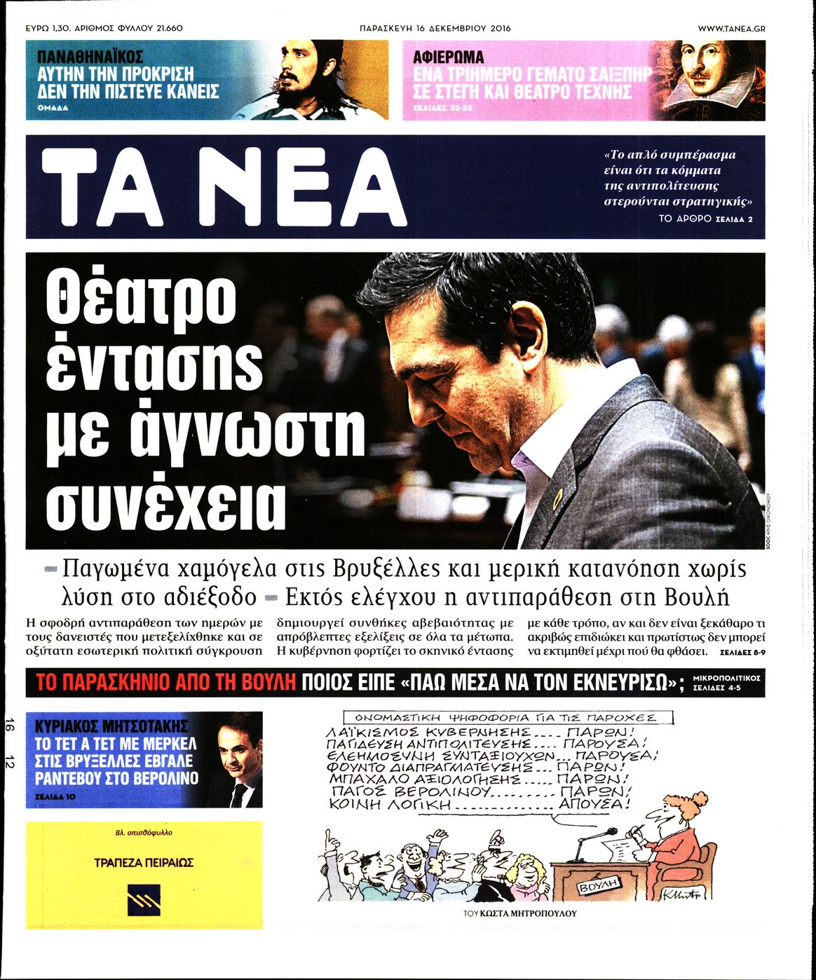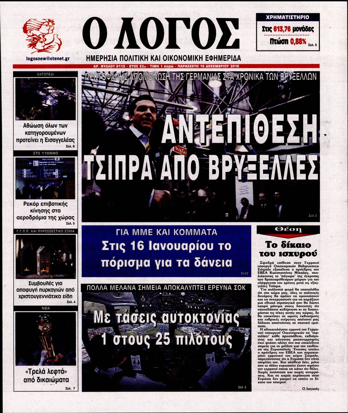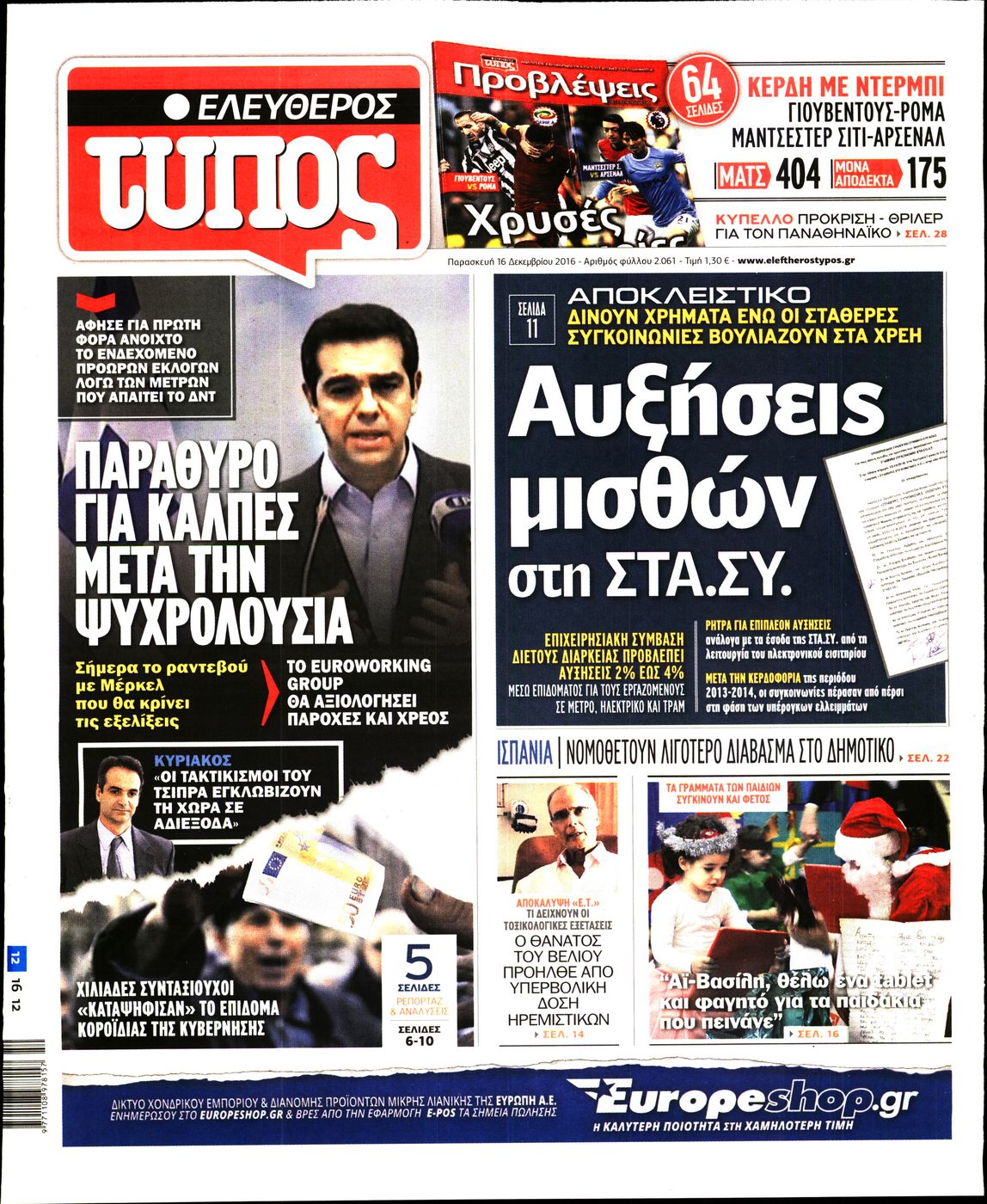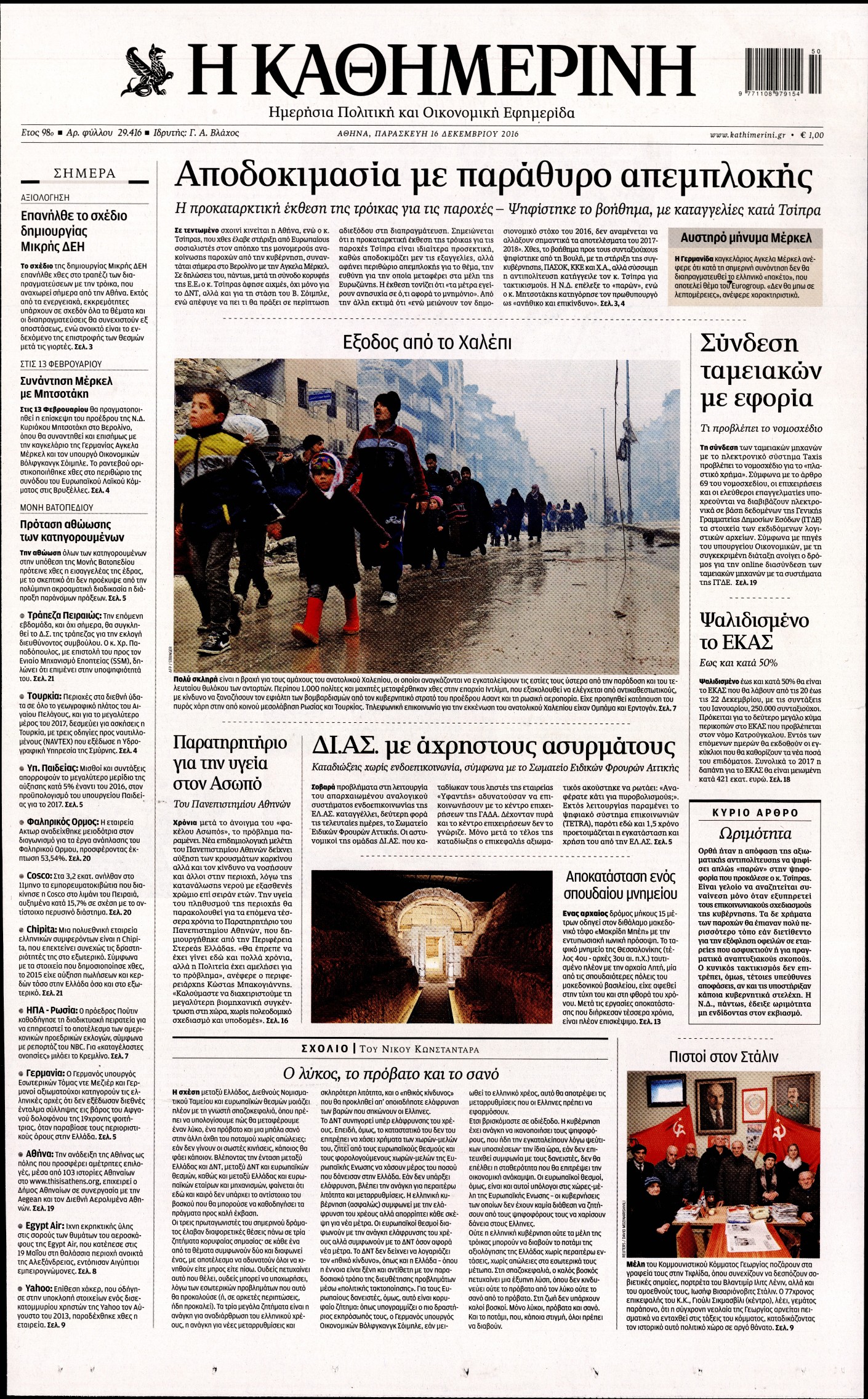 Οι πολιτικές εφημερίδες 16/12/2016 Enikos Newsroom 02:55, Παρασκευή 16 Δεκεμβρίου 2016 Media Διαβάστε τα σημερινά πρωτοσέλιδα των πολιτικών εφημερίδων: ΠΟΛΙΤΙΚΕΣ ΕΦΗΜΕΡΙΔΕΣ ΠΡΩΤΟΣΕΛΙΔΑ Μοιράσου το: σχολίασε κι εσύ (0 σχόλια) Ακολουθήστε το enikos.gr στο Google News και μάθετε πρώτοι όλες τις ειδήσεις Δείτε όλες τις τελευταίες ειδήσεις από την Ελλάδα και τον Κόσμο στο enikos.gr Ειδήσεις Ροή Ειδήσεων 1 ώρα πριν Χριστούγεννα στα μπλόκα: Επιμένουν στις κινητοποιήσεις τους οι αγρότες – Ανοίγουν τα διόδια το Σαββατοκύριακο 2 ώρες πριν Ουκρανία: Η άνευ προηγουμένου επίθεση σε ρωσικό τάνκερ στη Μεσόγειο και το μήνυμα προς στον Πούτιν – Το «μακρύ χέρι» του Κιέβου 1 ώρα πριν Πούτιν: Τα μηνύματα σε Ευρώπη και ΝΑΤΟ από το μαραθώνιο «σόου» του – Η απαίτηση για «σεβασμό» και η ειρήνη «με τους όρους» της Μόσχας 2 ώρες πριν Τραμπ: Δεν αποκλείει την πιθανότητα ενός πολέμου στη Βενεζουέλα – «Ο Μαδούρο ξέρει καλύτερα από τον καθένα τι ακριβώς θέλω» 3 ώρες πριν Συνεχίζει να προκαλεί ο Μίτσκοσκι: «Για μένα το όνομα Μακεδονία είναι ιερό» 1 ώρα πριν Ανακαλύφθηκαν αρχαία χρυσά νομίσματα 2.200 ετών που απεικονίζουν τον θεό Απόλλωνα – Η άγνωστη σύνδεση με τον Φίλιππο Β΄ της Μακεδονίας 2 ώρες πριν Ύπνος: Μια κρυφή κατάσταση του εγκεφάλου πριν από τον ύπνο μπορεί να είναι το “κλειδί” για υψηλή ευφυΐα και δημιουργικότητα 3 ώρες πριν Αριθμολογία: Οι άνθρωποι που έχουν γεννηθεί αυτές τις 4 ημερομηνίες, συχνά παρεξηγούνται – «Η καλοσύνη τους κρύβει τεράστια δύναμη» 4 ώρες πριν Ξεχάστε το καθάρισμα το Σαββατοκύριακο: Ο «κανόνας των 20 λεπτών» που θα σας λύσει τα χέρια 6 λεπτά πριν Πόλεμος στην Ουκρανία: Εφτά νεκροί από ρωσική πυραυλική επίθεση στο λιμάνι της Οδησσού 10 λεπτά πριν ΗΠΑ: Η κυβέρνηση του Ντόναλντ Τραμπ άρχισε να δημοσιοποιεί τα αρχεία Έπσταϊν 22 λεπτά πριν Σάμος: Άνοιξε το μπλόκο των αγροτών στον κόμβο Κοκκαρίου – Σε νέα συνεδρίαση θα καθορίσουν την στάση τους 30 λεπτά πριν Άνω Λιόσια: Πυροβολισμοί σε επιχείρηση με χαλιά – Εντοπίστηκαν 10 κάλυκες 37 λεπτά πριν Γάζα: Ισραηλινό πλήγμα σε σχολείο που είχαν καταφύγει εκτοπισμένοι – Τουλάχιστον έξι νεκροί ENIKOS NETWORK Το ΕΚΑΒ τιμήθηκε από την Ακαδημία Αθηνών για τα 40 χρόνια προσφοράς του Έχετε πραγματικά μεγάλη καρδιά; 10 χαρακτηριστικά όσων έχουν καλοσύνη Αναστολή μέτρων αναγκαστικής εκτέλεσης για κτηνοτρόφους που πλήττονται από την ευλογιά των αιγοπροβάτων Πλήρης επάρκεια προϊόντων στις λαϊκές της Αττικής, παρά τις αγροτικές κινητοποιήσεις – Τι απαντούν οι πωλητές Χαρτογραφώντας το «σημείο χωρίς επιστροφή»: Για πρώτη φορά αποκαλύπτεται με λεπτομέρεια το ακανθώδες όριο της ατμόσφαιρας τ... Η Google καταργεί τη λειτουργία «dark web report» – Πώς θα μπορούν οι χρήστες να διαγράφουν τα δεδομένα τους περισσότερα 22:42 , Παρασκευή 19 Δεκεμβρίου 2025 Γιώργος Γιαννόπουλος για “Το σόι σου”: “Είναι ευτυχία και ευλογία αυτή η σειρά” «Είναι ευτυχία και ευλογία η συγκυρία αυτής της σειράς», θα πει ο Γιώργος Γιαννόπουλος -ο αγαπ... 20:37 , Παρασκευή 19 Δεκεμβρίου 2025 Don’t Forget The Lyrics: Η Έλλη Κοκκίνου υποδέχεται 4 παίκτες που θα κάνουν τα πάντα για να μη χάσουν ούτε… μισή λέξη από τους στίχους Το «Don’t Forget The Lyrics» επιστρέφει απόψε, Παρασκευή 19 Δεκεμβρίου, στις 21:00 με νέο επει... 19:31 , Παρασκευή 19 Δεκεμβρίου 2025 GNTM: Απόψε ο μεγάλος τελικός για τους 4 φιναλίστ Έπειτα από μήνες γεμάτους μόδα, δημιουργία και έντονες αναμετρήσεις, το GNTM 2025 κορυφώνεται,... 18:11 , Παρασκευή 19 Δεκεμβρίου 2025 Το σόι σου: