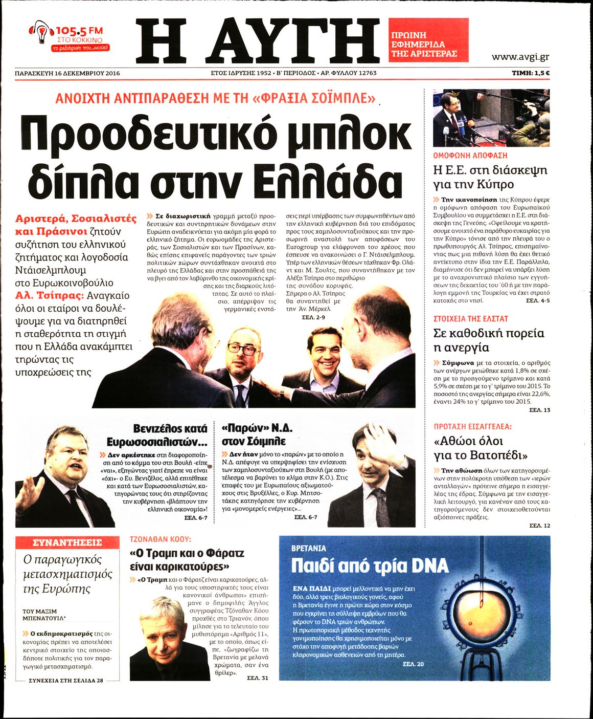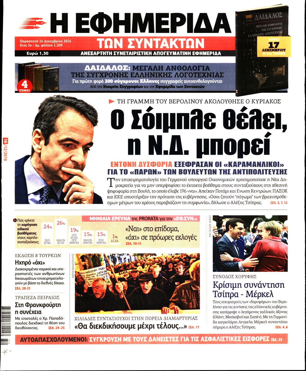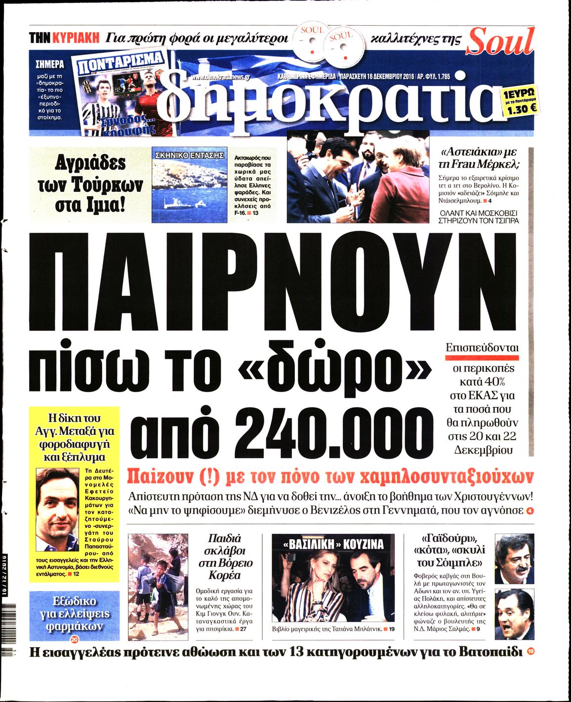 Οι πολιτικές εφημερίδες 16/12/2016 Enikos Newsroom 02:55, Παρασκευή 16 Δεκεμβρίου 2016 Media Διαβάστε τα σημερινά πρωτοσέλιδα των πολιτικών εφημερίδων: ΠΟΛΙΤΙΚΕΣ ΕΦΗΜΕΡΙΔΕΣ ΠΡΩΤΟΣΕΛΙΔΑ Μοιράσου το: σχολίασε κι εσύ (0 σχόλια) Ακολουθήστε το enikos.gr στο Google News και μάθετε πρώτοι όλες τις ειδήσεις Δείτε όλες τις τελευταίες ειδήσεις από την Ελλάδα και τον Κόσμο στο enikos.gr Ειδήσεις Ροή Ειδήσεων 1 ώρα πριν Χριστούγεννα στα μπλόκα: Επιμένουν στις κινητοποιήσεις τους οι αγρότες – Ανοίγουν τα διόδια το Σαββατοκύριακο 2 ώρες πριν Ουκρανία: Η άνευ προηγουμένου επίθεση σε ρωσικό τάνκερ στη Μεσόγειο και το μήνυμα προς στον Πούτιν – Το «μακρύ χέρι» του Κιέβου 1 ώρα πριν Πούτιν: Τα μηνύματα σε Ευρώπη και ΝΑΤΟ από το μαραθώνιο «σόου» του – Η απαίτηση για «σεβασμό» και η ειρήνη «με τους όρους» της Μόσχας 2 ώρες πριν Τραμπ: Δεν αποκλείει την πιθανότητα ενός πολέμου στη Βενεζουέλα – «Ο Μαδούρο ξέρει καλύτερα από τον καθένα τι ακριβώς θέλω» 3 ώρες πριν Συνεχίζει να προκαλεί ο Μίτσκοσκι: «Για μένα το όνομα Μακεδονία είναι ιερό» 1 ώρα πριν Ανακαλύφθηκαν αρχαία χρυσά νομίσματα 2.200 ετών που απεικονίζουν τον θεό Απόλλωνα – Η άγνωστη σύνδεση με τον Φίλιππο Β΄ της Μακεδονίας 2 ώρες πριν Ύπνος: Μια κρυφή κατάσταση του εγκεφάλου πριν από τον ύπνο μπορεί να είναι το “κλειδί” για υψηλή ευφυΐα και δημιουργικότητα 3 ώρες πριν Αριθμολογία: Οι άνθρωποι που έχουν γεννηθεί αυτές τις 4 ημερομηνίες, συχνά παρεξηγούνται – «Η καλοσύνη τους κρύβει τεράστια δύναμη» 4 ώρες πριν Ξεχάστε το καθάρισμα το Σαββατοκύριακο: Ο «κανόνας των 20 λεπτών» που θα σας λύσει τα χέρια 6 λεπτά πριν Πόλεμος στην Ουκρανία: Εφτά νεκροί από ρωσική πυραυλική επίθεση στο λιμάνι της Οδησσού 10 λεπτά πριν ΗΠΑ: Η κυβέρνηση του Ντόναλντ Τραμπ άρχισε να δημοσιοποιεί τα αρχεία Έπσταϊν 22 λεπτά πριν Σάμος: Άνοιξε το μπλόκο των αγροτών στον κόμβο Κοκκαρίου – Σε νέα συνεδρίαση θα καθορίσουν την στάση τους 30 λεπτά πριν Άνω Λιόσια: Πυροβολισμοί σε επιχείρηση με χαλιά – Εντοπίστηκαν 10 κάλυκες 37 λεπτά πριν Γάζα: Ισραηλινό πλήγμα σε σχολείο που είχαν καταφύγει εκτοπισμένοι – Τουλάχιστον έξι νεκροί ENIKOS NETWORK Το ΕΚΑΒ τιμήθηκε από την Ακαδημία Αθηνών για τα 40 χρόνια προσφοράς του Έχετε πραγματικά μεγάλη καρδιά; 10 χαρακτηριστικά όσων έχουν καλοσύνη Αναστολή μέτρων αναγκαστικής εκτέλεσης για κτηνοτρόφους που πλήττονται από την ευλογιά των αιγοπροβάτων Πλήρης επάρκεια προϊόντων στις λαϊκές της Αττικής, παρά τις αγροτικές κινητοποιήσεις – Τι απαντούν οι πωλητές Χαρτογραφώντας το «σημείο χωρίς επιστροφή»: Για πρώτη φορά αποκαλύπτεται με λεπτομέρεια το ακανθώδες όριο της ατμόσφαιρας τ... Η Google καταργεί τη λειτουργία «dark web report» – Πώς θα μπορούν οι χρήστες να διαγράφουν τα δεδομένα τους περισσότερα 22:42 , Παρασκευή 19 Δεκεμβρίου 2025 Γιώργος Γιαννόπουλος για “Το σόι σου”: “Είναι ευτυχία και ευλογία αυτή η σειρά” «Είναι ευτυχία και ευλογία η συγκυρία αυτής της σειράς», θα πει ο Γιώργος Γιαννόπουλος -ο αγαπ... 20:37 , Παρασκευή 19 Δεκεμβρίου 2025 Don’t Forget The Lyrics: Η Έλλη Κοκκίνου υποδέχεται 4 παίκτες που θα κάνουν τα πάντα για να μη χάσουν ούτε… μισή λέξη από τους στίχους Το «Don’t Forget The Lyrics» επιστρέφει απόψε, Παρασκευή 19 Δεκεμβρίου, στις 21:00 με νέο επει... 19:31 , Παρασκευή 19 Δεκεμβρίου 2025 GNTM: Απόψε ο μεγάλος τελικός για τους 4 φιναλίστ Έπειτα από μήνες γεμάτους μόδα, δημιουργία και έντονες αναμετρήσεις, το GNTM 2025 κορυφώνεται,... 18:11 , Παρασκευή 19 Δεκεμβρίου 2025 Το σόι σου: