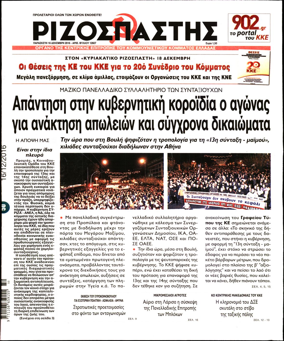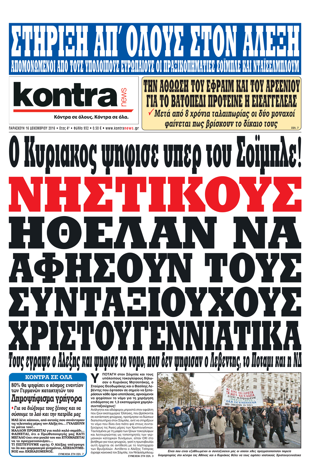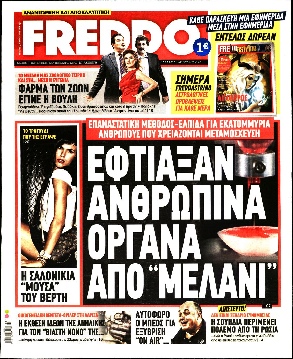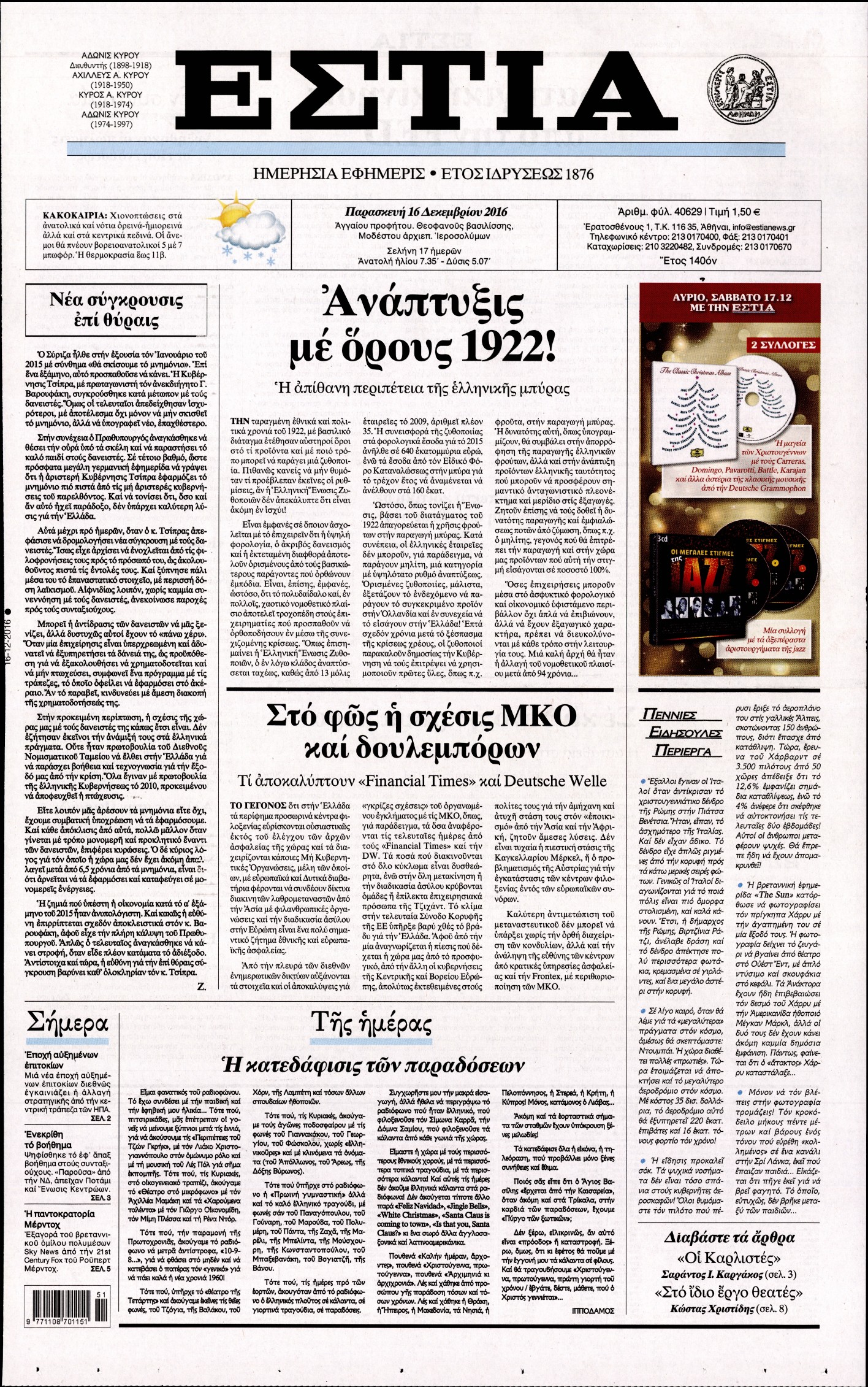 Οι πολιτικές εφημερίδες 16/12/2016 Enikos Newsroom 02:55, Παρασκευή 16 Δεκεμβρίου 2016 Media Διαβάστε τα σημερινά πρωτοσέλιδα των πολιτικών εφημερίδων: ΠΟΛΙΤΙΚΕΣ ΕΦΗΜΕΡΙΔΕΣ ΠΡΩΤΟΣΕΛΙΔΑ Μοιράσου το: σχολίασε κι εσύ (0 σχόλια) Ακολουθήστε το enikos.gr στο Google News και μάθετε πρώτοι όλες τις ειδήσεις Δείτε όλες τις τελευταίες ειδήσεις από την Ελλάδα και τον Κόσμο στο enikos.gr Ειδήσεις Ροή Ειδήσεων 1 ώρα πριν Χριστούγεννα στα μπλόκα: Επιμένουν στις κινητοποιήσεις τους οι αγρότες – Ανοίγουν τα διόδια το Σαββατοκύριακο 2 ώρες πριν Ουκρανία: Η άνευ προηγουμένου επίθεση σε ρωσικό τάνκερ στη Μεσόγειο και το μήνυμα προς στον Πούτιν – Το «μακρύ χέρι» του Κιέβου 1 ώρα πριν Πούτιν: Τα μηνύματα σε Ευρώπη και ΝΑΤΟ από το μαραθώνιο «σόου» του – Η απαίτηση για «σεβασμό» και η ειρήνη «με τους όρους» της Μόσχας 2 ώρες πριν Τραμπ: Δεν αποκλείει την πιθανότητα ενός πολέμου στη Βενεζουέλα – «Ο Μαδούρο ξέρει καλύτερα από τον καθένα τι ακριβώς θέλω» 3 ώρες πριν Συνεχίζει να προκαλεί ο Μίτσκοσκι: «Για μένα το όνομα Μακεδονία είναι ιερό» 1 ώρα πριν Ανακαλύφθηκαν αρχαία χρυσά νομίσματα 2.200 ετών που απεικονίζουν τον θεό Απόλλωνα – Η άγνωστη σύνδεση με τον Φίλιππο Β΄ της Μακεδονίας 2 ώρες πριν Ύπνος: Μια κρυφή κατάσταση του εγκεφάλου πριν από τον ύπνο μπορεί να είναι το “κλειδί” για υψηλή ευφυΐα και δημιουργικότητα 3 ώρες πριν Αριθμολογία: Οι άνθρωποι που έχουν γεννηθεί αυτές τις 4 ημερομηνίες, συχνά παρεξηγούνται – «Η καλοσύνη τους κρύβει τεράστια δύναμη» 4 ώρες πριν Ξεχάστε το καθάρισμα το Σαββατοκύριακο: Ο «κανόνας των 20 λεπτών» που θα σας λύσει τα χέρια 6 λεπτά πριν Πόλεμος στην Ουκρανία: Εφτά νεκροί από ρωσική πυραυλική επίθεση στο λιμάνι της Οδησσού 10 λεπτά πριν ΗΠΑ: Η κυβέρνηση του Ντόναλντ Τραμπ άρχισε να δημοσιοποιεί τα αρχεία Έπσταϊν 22 λεπτά πριν Σάμος: Άνοιξε το μπλόκο των αγροτών στον κόμβο Κοκκαρίου – Σε νέα συνεδρίαση θα καθορίσουν την στάση τους 30 λεπτά πριν Άνω Λιόσια: Πυροβολισμοί σε επιχείρηση με χαλιά – Εντοπίστηκαν 10 κάλυκες 37 λεπτά πριν Γάζα: Ισραηλινό πλήγμα σε σχολείο που είχαν καταφύγει εκτοπισμένοι – Τουλάχιστον έξι νεκροί ENIKOS NETWORK Το ΕΚΑΒ τιμήθηκε από την Ακαδημία Αθηνών για τα 40 χρόνια προσφοράς του Έχετε πραγματικά μεγάλη καρδιά; 10 χαρακτηριστικά όσων έχουν καλοσύνη Αναστολή μέτρων αναγκαστικής εκτέλεσης για κτηνοτρόφους που πλήττονται από την ευλογιά των αιγοπροβάτων Πλήρης επάρκεια προϊόντων στις λαϊκές της Αττικής, παρά τις αγροτικές κινητοποιήσεις – Τι απαντούν οι πωλητές Χαρτογραφώντας το «σημείο χωρίς επιστροφή»: Για πρώτη φορά αποκαλύπτεται με λεπτομέρεια το ακανθώδες όριο της ατμόσφαιρας τ... Η Google καταργεί τη λειτουργία «dark web report» – Πώς θα μπορούν οι χρήστες να διαγράφουν τα δεδομένα τους περισσότερα 22:42 , Παρασκευή 19 Δεκεμβρίου 2025 Γιώργος Γιαννόπουλος για “Το σόι σου”: “Είναι ευτυχία και ευλογία αυτή η σειρά” «Είναι ευτυχία και ευλογία η συγκυρία αυτής της σειράς», θα πει ο Γιώργος Γιαννόπουλος -ο αγαπ... 20:37 , Παρασκευή 19 Δεκεμβρίου 2025 Don’t Forget The Lyrics: Η Έλλη Κοκκίνου υποδέχεται 4 παίκτες που θα κάνουν τα πάντα για να μη χάσουν ούτε… μισή λέξη από τους στίχους Το «Don’t Forget The Lyrics» επιστρέφει απόψε, Παρασκευή 19 Δεκεμβρίου, στις 21:00 με νέο επει... 19:31 , Παρασκευή 19 Δεκεμβρίου 2025 GNTM: Απόψε ο μεγάλος τελικός για τους 4 φιναλίστ Έπειτα από μήνες γεμάτους μόδα, δημιουργία και έντονες αναμετρήσεις, το GNTM 2025 κορυφώνεται,... 18:11 , Παρασκευή 19 Δεκεμβρίου 2025 Το σόι σου: