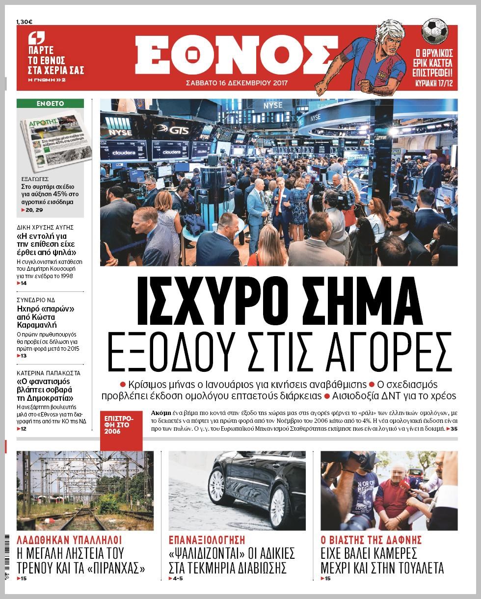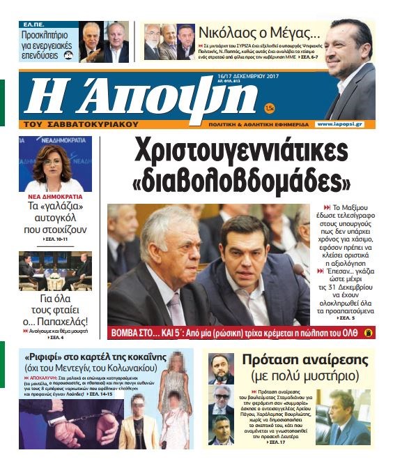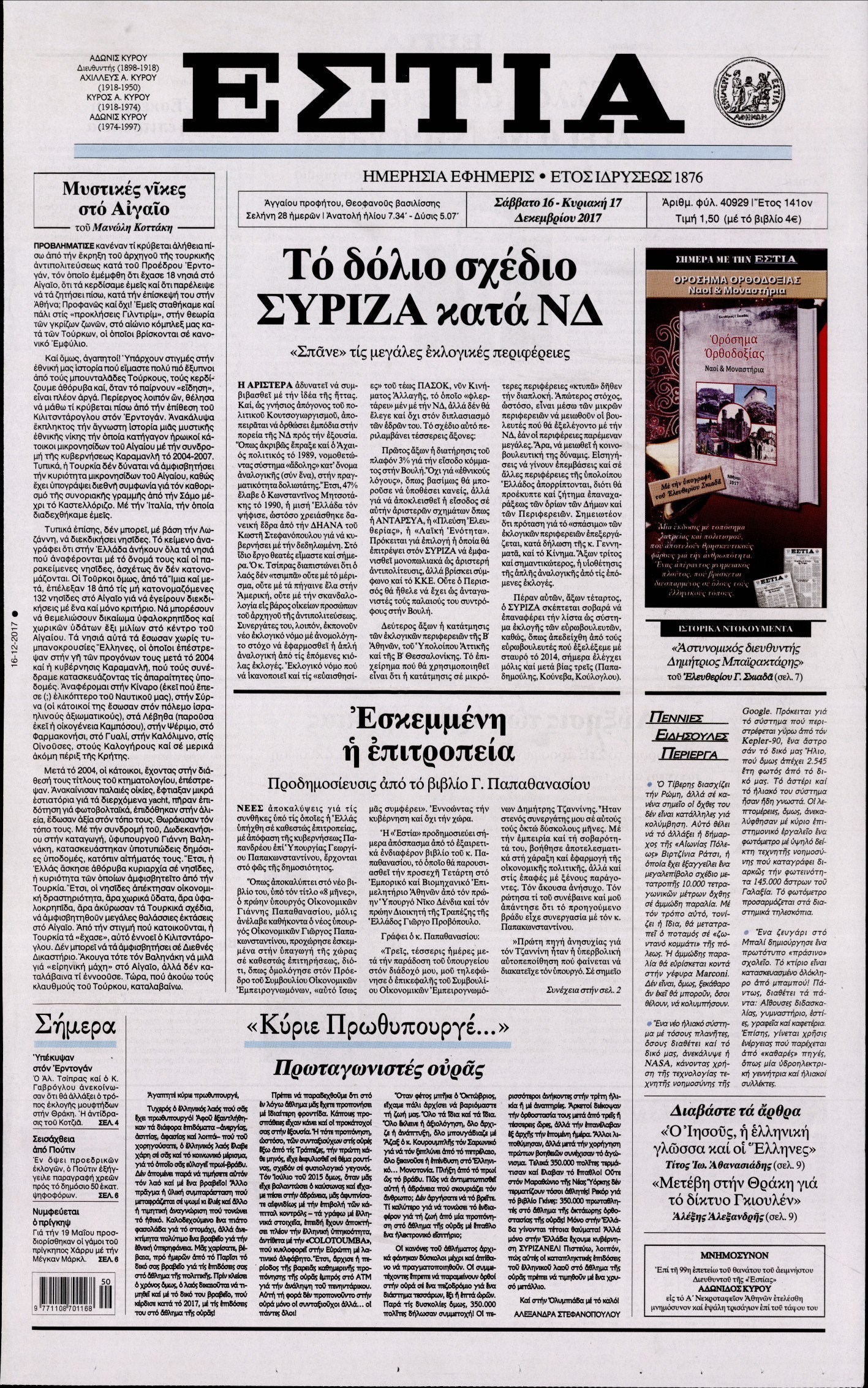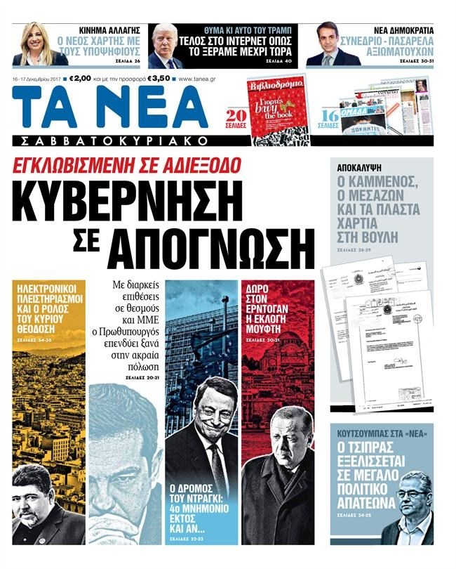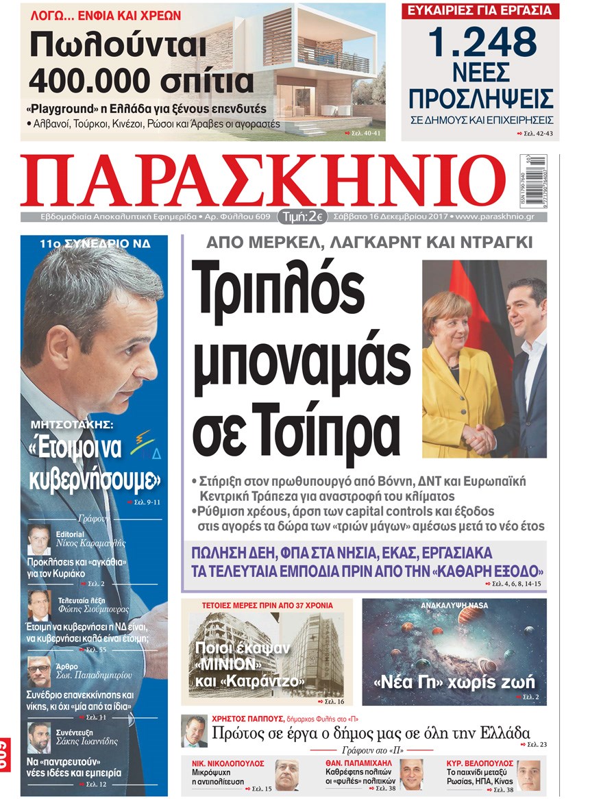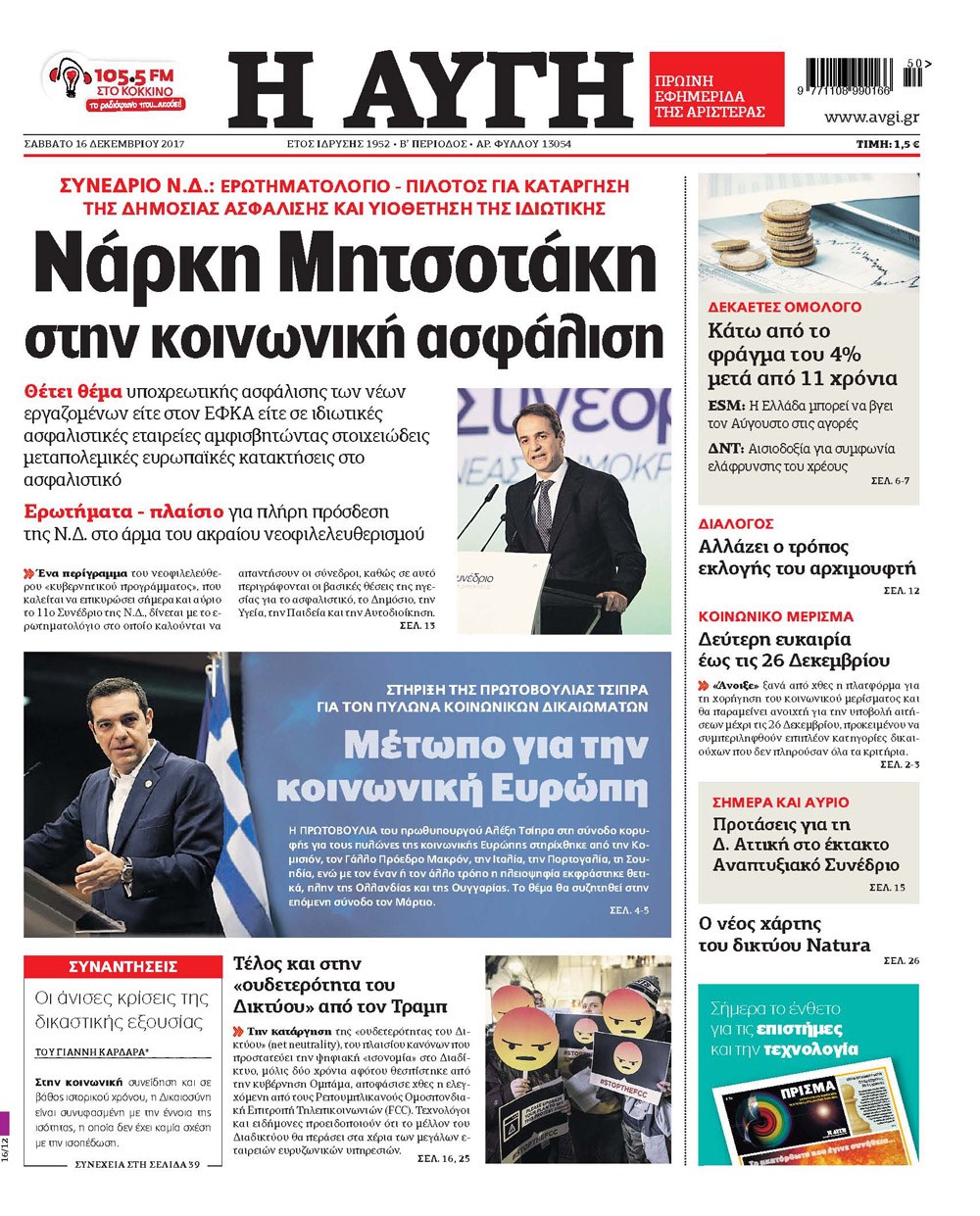 Οι πολιτικές εφημερίδες 16/12/2017 Κώστας Τεό 07:02, Σάββατο 16 Δεκεμβρίου 2017 Media Διαβάστε τα σημερινά πρωτοσέλιδα των πολιτικών εφημερίδων: ΠΟΛΙΤΙΚΕΣ ΕΦΗΜΕΡΙΔΕΣ ΠΡΩΤΟΣΕΛΙΔΑ Μοιράσου το: σχολίασε κι εσύ (0 σχόλια) Ακολουθήστε το enikos.gr στο Google News και μάθετε πρώτοι όλες τις ειδήσεις Δείτε όλες τις τελευταίες ειδήσεις από την Ελλάδα και τον Κόσμο στο enikos.gr Ειδήσεις Ροή Ειδήσεων 5 ώρες πριν Χριστούγεννα στα μπλόκα: Επιμένουν στις κινητοποιήσεις τους οι αγρότες – Ανοίγουν τα διόδια το Σαββατοκύριακο 6 ώρες πριν Ουκρανία: Η άνευ προηγουμένου επίθεση σε ρωσικό τάνκερ στη Μεσόγειο και το μήνυμα προς στον Πούτιν – Το «μακρύ χέρι» του Κιέβου 5 ώρες πριν Πούτιν: Τα μηνύματα σε Ευρώπη και ΝΑΤΟ από το μαραθώνιο «σόου» του – Η απαίτηση για «σεβασμό» και η ειρήνη «με τους όρους» της Μόσχας 6 ώρες πριν Τραμπ: Δεν αποκλείει την πιθανότητα ενός πολέμου στη Βενεζουέλα – «Ο Μαδούρο ξέρει καλύτερα από τον καθένα τι ακριβώς θέλω» 6 ώρες πριν Συνεχίζει να προκαλεί ο Μίτσκοσκι: «Για μένα το όνομα Μακεδονία είναι ιερό» 5 ώρες πριν Ανακαλύφθηκαν αρχαία χρυσά νομίσματα 2.200 ετών που απεικονίζουν τον θεό Απόλλωνα – Η άγνωστη σύνδεση με τον Φίλιππο Β΄ της Μακεδονίας 6 ώρες πριν Ύπνος: Μια κρυφή κατάσταση του εγκεφάλου πριν από τον ύπνο μπορεί να είναι το “κλειδί” για υψηλή ευφυΐα και δημιουργικότητα 7 ώρες πριν Αριθμολογία: Οι άνθρωποι που έχουν γεννηθεί αυτές τις 4 ημερομηνίες, συχνά παρεξηγούνται – «Η καλοσύνη τους κρύβει τεράστια δύναμη» 8 ώρες πριν Ξεχάστε το καθάρισμα το Σαββατοκύριακο: Ο «κανόνας των 20 λεπτών» που θα σας λύσει τα χέρια 3 λεπτά πριν Φως στο Τούνελ: Έφτασε η ώρα της αλήθειας για την δολοφονία της χήρας του πρώην υπουργού στο Κολωνάκι 19 λεπτά πριν Ντόναλντ Τραμπ: Προστέθηκε το όνομά του στην πρόσοψη του Κέντρου Κένεντι – Οργισμένη αντίδραση των συγγενών του JFK 34 λεπτά πριν Ταμίλα Κουλίεβα: «Δεν θέλω να είμαι κάποια που πορεύεται συνεχώς με τις ίδιες αναφορές» 49 λεπτά πριν Η Ελλάδα προσχωρεί στη Διεθνή Επιτροπή Αποζημιώσεων για την Ουκρανία 1 ώρα πριν GNTM: Η Ξένια Τσίρκοβα αναδείχθηκε μεγάλη νικήτρια και πήρε τις 50.000 ευρώ – Ποιος βρέθηκε σε απόσταση αναπνοής; ENIKOS NETWORK Το ΕΚΑΒ τιμήθηκε από την Ακαδημία Αθηνών για τα 40 χρόνια προσφοράς του Έχετε πραγματικά μεγάλη καρδιά; 10 χαρακτηριστικά όσων έχουν καλοσύνη Αναστολή μέτρων αναγκαστικής εκτέλεσης για κτηνοτρόφους που πλήττονται από την ευλογιά των αιγοπροβάτων Πλήρης επάρκεια προϊόντων στις λαϊκές της Αττικής, παρά τις αγροτικές κινητοποιήσεις – Τι απαντούν οι πωλητές Χαρτογραφώντας το «σημείο χωρίς επιστροφή»: Για πρώτη φορά αποκαλύπτεται με λεπτομέρεια το ακανθώδες όριο της ατμόσφαιρας τ... Η Google καταργεί τη λειτουργία «dark web report» – Πώς θα μπορούν οι χρήστες να διαγράφουν τα δεδομένα τους περισσότερα 02:50 , Σάββατο 20 Δεκεμβρίου 2025 GNTM: Η Ξένια Τσίρκοβα αναδείχθηκε μεγάλη νικήτρια και πήρε τις 50.000 ευρώ – Ποιος βρέθηκε σε απόσταση αναπνοής; Με φαντασμαγορικό τρόπο ολοκληρώθηκε το βράδυ της Παρασκευής ο μεγάλος τελικός του GNTM, μέσα ... 22:42 , Παρασκευή 19 Δεκεμβρίου 2025 Γιώργος Γιαννόπουλος για “Το σόι σου”: “Είναι ευτυχία και ευλογία αυτή η σειρά” «Είναι ευτυχία και ευλογία η συγκυρία αυτής της σειράς», θα πει ο Γιώργος Γιαννόπουλος -ο αγαπ... 20:37 , Παρασκευή 19 Δεκεμβρίου 2025 Don’t Forget The Lyrics: Η Έλλη Κοκκίνου υποδέχεται 4 παίκτες που θα κάνουν τα πάντα για να μη χάσουν ούτε… μισή λέξη από τους στίχους Το «Don’t Forget The Ly