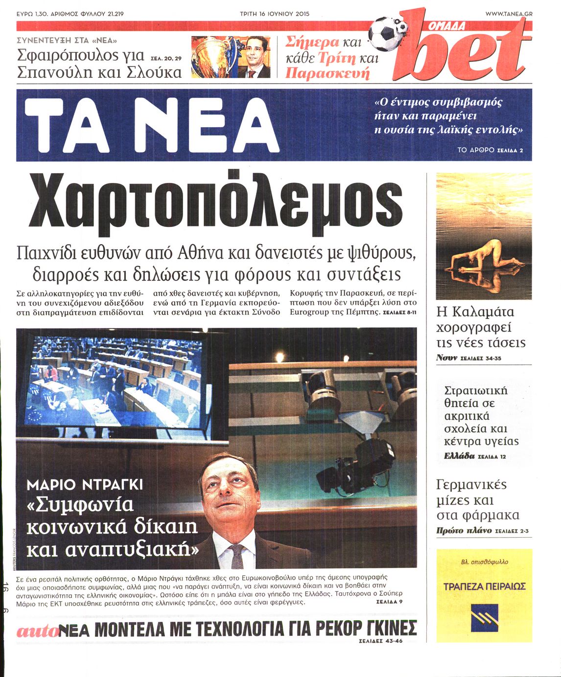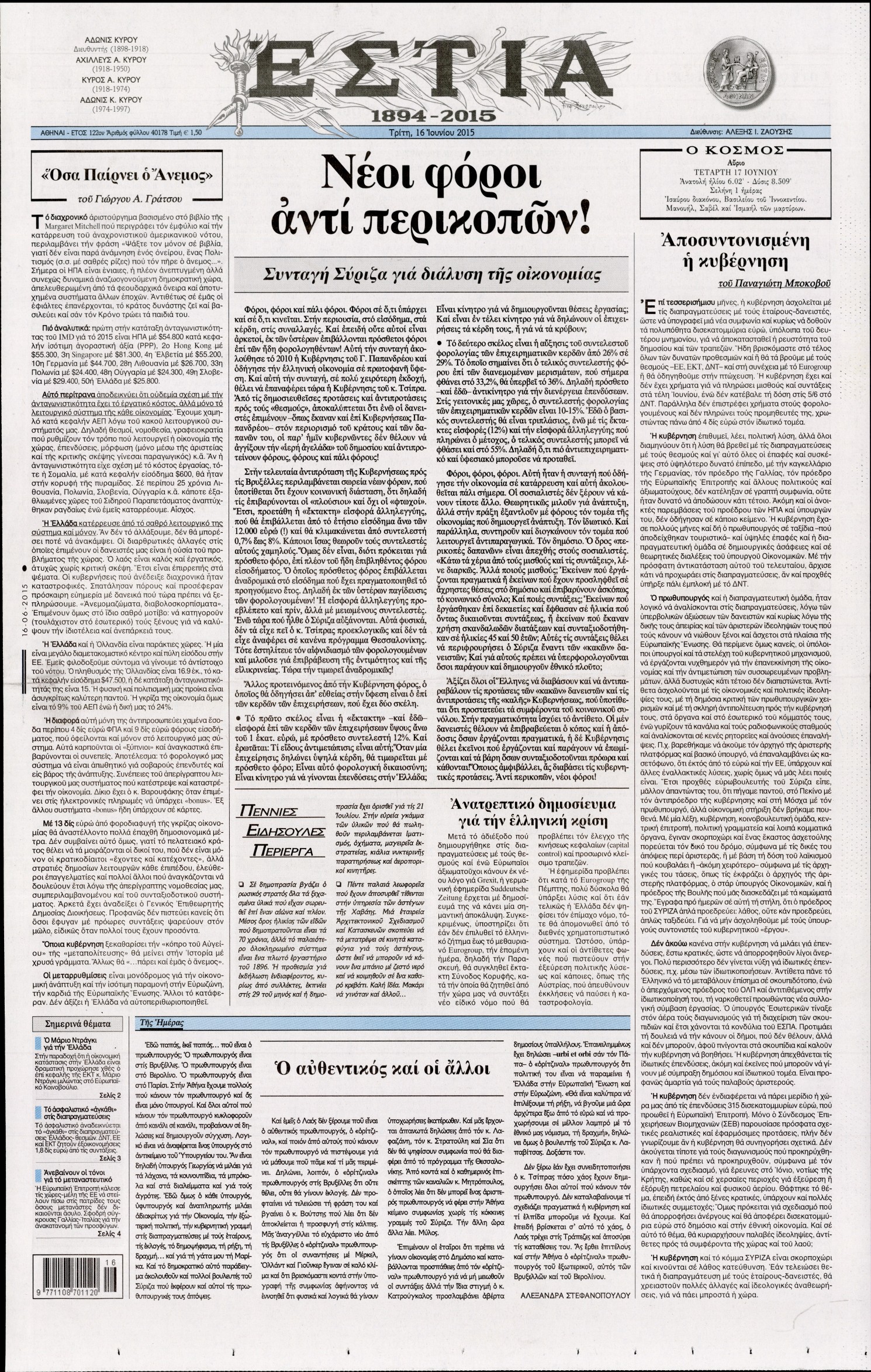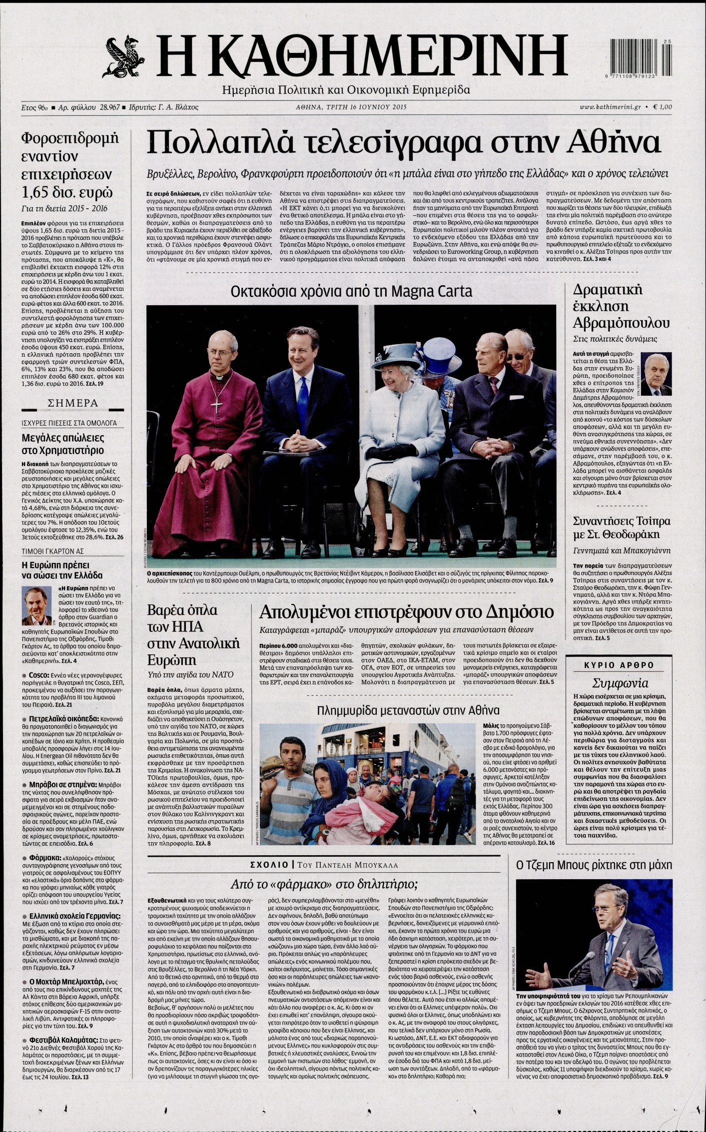 Οι πολιτικές εφημερίδες 16/6/2015 Enikos Newsroom 06:49, Τρίτη 16 Ιουνίου 2015 Media Διαβάστε τα σημερινά πρωτοσέλιδα των πολιτικών εφημερίδων: ΠΟΛΙΤΙΚΕΣ ΕΦΗΜΕΡΙΔΕΣ ΠΡΩΤΟΣΕΛΙΔΑ Μοιράσου το: σχολίασε κι εσύ (0 σχόλια) Ακολουθήστε το enikos.gr στο Google News και μάθετε πρώτοι όλες τις ειδήσεις Δείτε όλες τις τελευταίες ειδήσεις από την Ελλάδα και τον Κόσμο στο enikos.gr Ειδήσεις Ροή Ειδήσεων 58 λεπτά πριν Μεσόγειος: Η διαδρομή του ρωσικού τάνκερ «Qendil» και η στοχευμένη επίθεση της Ουκρανίας με drone – Ο Πούτιν προειδοποίησε για αντίποινα 53 λεπτά πριν Αττική: Θρίλερ με νεκρό βρέφος 5 μηνών – Κοιμόταν στο ίδιο κρεβάτι με τους γονείς του 2 ώρες πριν Από το Ορμένιο ως τα Μάλγαρα κι από τη Σιάτιστα μέχρι τη Νίκαια: Μπλόκα σε όλη την Ελλάδα – Το Σάββατο ανοίγουν τα διόδια οι αγρότες 2 ώρες πριν «Έλληνας Εσκομπάρ»: Φωτογραφίες με τους 4 τόνους κοκαΐνης που κατασχέθηκαν από το σκάφος «Ουρανία» 3 ώρες πριν Πούτιν: Σαρκαστικά μηνύματα, παράπονα και απρόοπτα στη συνέντευξη Τύπου – Η πρόταση γάμου on air και οι ερωτήσεις για τα αγγούρια και τους… εξωγήινους 3 ώρες πριν Τα 5 ζώδια που ευνοούνται στην ερωτική ζωή τους την επόμενη εβδομάδα – «Η ενέργεια του Αιγόκερου φέρνει αγάπη και σταθερότητα» 7 ώρες πριν Ειδικός μοιράζεται 6 κόλπα για να διατηρείστε σε φόρμα με πάνω από 40 ώρες εργασίας την εβδομάδα: «Προπονηθείτε πριν από τη δουλειά, όχι μετά» 4 ώρες πριν Αυτό το έξυπνο μαθηματικό κόλπο θα μπορούσε να αλλάξει τον τρόπο με τον οποίο οι επιστήμονες μελετούν τους σεισμούς 2 ώρες πριν Κουίζ για την παλιά Αθήνα: Αναγνωρίζετε την περιοχή; Έχετε περάσει 100% από εκεί 5 λεπτά πριν Τέμπη: Διεκόπη για τις 9 Ιανουαρίου η δίκη για τα χαμένα βίντεο της εμπορικής αμαξοστοιχίας – «Απαιτούμε να μας σέβονται» 10 λεπτά πριν Hellenic Train: Αλλαγές και καταργήσεις δρομολογίων λεωφορείων λόγω των αγροτικών κινητοποιήσεων 16 λεπτά πριν Ζελένσκι: «Δεν χρειάζεται αναθεώρηση του Συντάγματος» για να εγκαταλείψει η Ουκρανία τον στόχο ένταξης στο ΝΑΤΟ 21 λεπτά πριν Παναγιώτα Βλαντή: Η τρυφερή εξομολόγηση για τον σύζυγό της – «Πραγματικά ήταν για μένα αυτό που ήθελα σε όλη μου τη ζωή» 27 λεπτά πριν Επίσημη η «βόμβα»: Ο ΠΑΟΚ ανακοίνωσε την απόκτηση του Πάτρικ Μπέβερλι ENIKOS NETWORK «Η σούπερ» γρίπη εξαπλώνεται στην Ευρώπη-Στοιχεία για την αποτελεσματικότητα του εμβολίου από το ECDC ΕΛΣΤΑΤ: Αύξηση κατά 1,7% των επαγγελματιών υγείας το 2024 Η απάντηση της κυβέρνησης στα αιτήματα των αγροτών: 16 έχουν ικανοποιηθεί, 4 βρίσκονται υπό επεξεργασία και 7 δεν είναι εφι... Μισθολογική διαφάνεια: Το 68% των εργαζομένων αγνοεί τη νέα οδηγία – Αναλυτικά τα στοιχεία έρευνας Χαρτογραφώντας το «σημείο χωρίς επιστροφή»: Για πρώτη φορά αποκαλύπτεται με λεπτομέρεια το ακανθώδες όριο της ατμόσφαιρας τ... Η Google καταργεί τη λειτουργία «dark web report» – Πώς θα μπορούν οι χρήστες να διαγράφουν τα δεδομένα τους περισσότερα 18:11 , Παρασκευή 19 Δεκεμβρίου 2025 Το σόι σου: Ο Άρης έρχεται στην Ελλάδα για τις γιορτές των Χριστουγέννων – Τι θα δούμε στο αποψινό εορταστικό επεισόδιο Ένα απολαυστικό, εορταστικό επεισόδιο της σειράς “Το σόι σου”, γεμάτο ευτράπελα αλ... 15:15 , Παρασκευή 19 Δεκεμβρίου 2025 Την Κυριακή με τη Realnews: Ό,τι και αν αγοράσεις, σκανάρεις και κερδίζεις! Την Κυριακή με τη Realnews: Ό,τι και αν αγοράσεις, σκανάρεις και κερδίζεις! Με το PADU app, το... 08:00 , Παρασκευή 19 Δεκεμβρίου 2025 Την Κυριακή με τη Realnews: Δωροεπιταγή 10€ Δωροεπιταγή αξίας 10€ για αγορές άνω των 60€ από τα πολυκαταστήμα