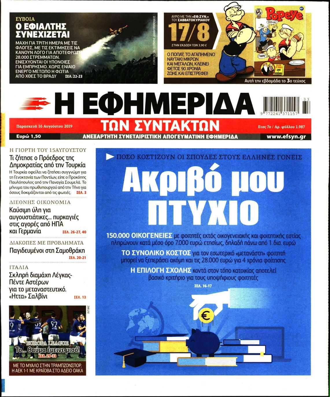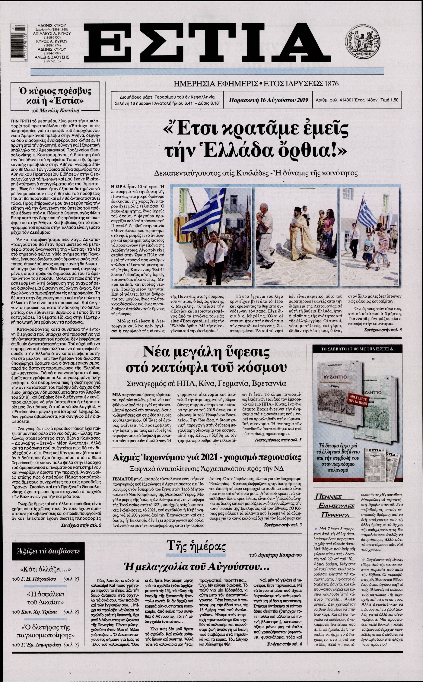Οι πολιτικές εφημερίδες 16/8/19 Διονύσης Νίκκας 06:11, Παρασκευή 16 Αυγούστου 2019 Media Διαβάστε τα πρωτοσέλιδα των πολιτικών εφημερίδων… ΕΦΗΜΕΡΙΔΩΝ ΠΡΩΤΟΣΕΛΙΔΑ Μοιράσου το: σχολίασε κι εσύ (0 σχόλια) Ακολουθήστε το enikos.gr στο Google News και μάθετε πρώτοι όλες τις ειδήσεις Δείτε όλες τις τελευταίες ειδήσεις από την Ελλάδα και τον Κόσμο στο enikos.gr Ειδήσεις Ροή Ειδήσεων 15 λεπτά πριν Η διαδρομή του σκάφους με την τεράστια ποσότητα κοκαΐνης που κατασχέθηκε στο λιμάνι του Πειραιά – Συνελήφθη και γνωστός «βαρώνος» 42 λεπτά πριν Τσιάρας για αγροτικές κινητοποιήσεις: Μονόδρομος ο διάλογος – Διαφάνεια με τη μεταφορά του ΟΠΕΚΕΠΕ στην ΑΑΔΕ 2 ώρες πριν Αυστραλία: Σχέσεις με το ISIS εκτιμάται πως είχαν οι δράστες της τρομοκρατικής επίθεσης στο Σίδνεϊ 2 ώρες πριν Σοκ στο Χόλιγουντ: Νεκροί από μαχαιριές ο σκηνοθέτης Ρομπ Ράινερ και η σύζυγός του – Αναφορές ότι τους σκότωσε ο γιος τους 2 ώρες πριν Αγρότες: Αμετακίνητοι από τα μπλόκα σε τελωνεία και εθνικές οδούς – Ο χάρτης των κινητοποιήσεων και τα αιτήματά τους 25 λεπτά πριν Τα 3 ζώδια που μπαίνουν σε μια νέα δυναμική εποχή – «Είστε έτοιμοι για όλα» 1 ώρα πριν Κληρονόμησε 2,8 εκατ. ευρώ και φοβάται ότι οι άνδρες θα την πλησιάζουν για τα λεφτά – «Μήπως καλύτερα να το κρατήσω μυστικό;» 2 ώρες πριν Κάτω από παλάτι κρυβόταν ένα άλλο μνημειώδες ανάκτορο: Οι ανασκαφές σε αρχαία πόλη αποκάλυψαν τα ερείπια και τα μυστικά του 4 ώρες πριν Διατροφή: Γιατρός προειδοποιεί για 2 απλά λάθη που αυξάνουν τον κίνδυνο χρόνιων παθήσεων 2 λεπτά πριν ΗΠΑ: Κινέζος δισεκατομμυριούχος απέκτησε πάνω από 100 παιδιά μέσω παρένθετης μητρότητας – Φαντασιώνεται… γάμους με την οικογένεια Μασκ 4 λεπτά πριν Δείτε LIVE το συνέδριο «Ελληνικός Τουρισμός, Μια Εθνική Υπόθεση!» 8 λεπτά πριν Ρωσία: Κατέρριψε 130 ουκρανικά drones κατά τη διάρκεια της νύχτας – Αεροδρόμια της Μόσχας ανέστειλαν τη λειτουργία τους 15 λεπτά πριν Η διαδρομή του σκάφους με την τεράστια ποσότητα κοκαΐνης που κατασχέθηκε στο λιμάνι του Πειραιά – Συνελήφθη και γνωστός «βαρώνος» 18 λεπτά πριν Αγροτικές κινητοποιήσεις: Αποκλεισμός του τελωνείου Νίκης στη Φλώρινα και του δρόμου προς Πτολεμαΐδα ENIKOS NETWORK Έλλειψη μαγνησίου: Ποια τα συμπτώματα που επηρεάζουν ύπνο, ενέργεια και διάθεση Έχετε καλή φυσική κατάσταση; Δείτε αν μπορείτε να κάνετε αυτές τις 5 κινήσεις ΦΠΑ: Αυξημένος κατά 57% ο αριθμός των ελέγχων για παράνομες επιστροφές και απάτες – Ποιοι βρίσκονται στο στόχαστρο της ΑΑΔΕ Δάνεια σε ελβετικό φράγκο: Ανακοινώνεται η ρύθμιση- Ποιοι και πόσο θα έχουν όφελος – Όλες οι λεπτομέρειες Σύγχρονος Νοστράδαμος: Προειδοποιεί για «μεγάλο γεγονός» τους επόμενους μήνες που θα συγκλονίσει τη Βρετανία και τον κόσμο Τεστ παρατηρητικότητας: Μπορείτε να βρείτε τις 3 διαφορές στις εικόνες με έναν πιγκουίνο σε 14 δευτερόλεπτα περισσότερα 10:21 , Δευτέρα 15 Δεκεμβρίου 2025 Δείτε LIVE το συνέδριο «Ελληνικός Τουρισμός, Μια Εθνική Υπόθεση!» Δείτε απευθείας το 7ο συνέδριο «Ελληνικός Τουρισμός, Μια Εθνική Υπόθεση!». Το συνέδριο συνδιορ... 09:15 , Δευτέρα 15 Δεκεμβρίου 2025 Την Κυριακή με τη Realnews: Ό,τι και αν αγοράσεις, σκανάρεις και κερδίζεις! Την Κυριακή με τη Realnews: Ό,τι και αν αγοράσεις, σκανάρεις και κερδίζεις! Με το PADU app, το... 07:42 , Δευτέρα 15 Δεκεμβρίου 2025 Την Κυριακή με τη Realnews: Δωροεπιταγή10€ Δωροεπιταγή αξίας 10€ για αγορές άνω των 60€ από τα πολυκαταστήματα FactoryOutlet H προσφορά ι... 07:17 , Δευτέρα 15 Δεκεμβρίου 2025 Αυτή την Κυριακή με τη Real