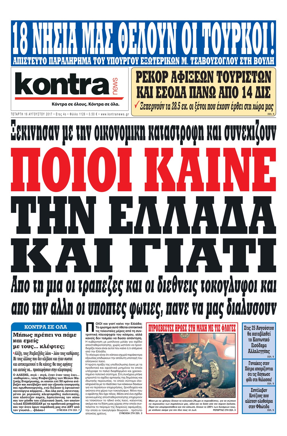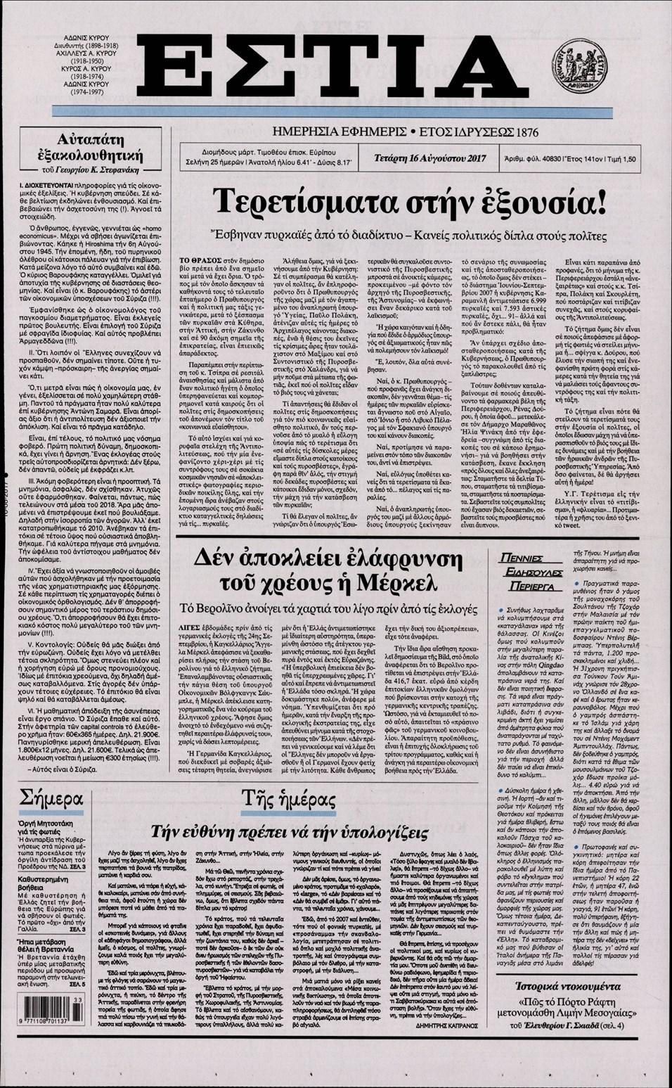 Οι πολιτικές εφημερίδες 16/8/2017 Enikos Newsroom 06:47, Τετάρτη 16 Αυγούστου 2017 Media Διαβάστε τα σημερινά πρωτοσέλιδα των πολιτικών εφημερίδων: ΠΟΛΙΤΙΚΕΣ ΕΦΗΜΕΡΙΔΕΣ ΠΡΩΤΟΣΕΛΙΔΑ Μοιράσου το: σχολίασε κι εσύ (0 σχόλια) Ακολουθήστε το enikos.gr στο Google News και μάθετε πρώτοι όλες τις ειδήσεις Δείτε όλες τις τελευταίες ειδήσεις από την Ελλάδα και τον Κόσμο στο enikos.gr Ειδήσεις Ροή Ειδήσεων 3 ώρες πριν Χριστούγεννα στα μπλόκα: Επιμένουν στις κινητοποιήσεις τους οι αγρότες – Ανοίγουν τα διόδια το Σαββατοκύριακο 3 ώρες πριν Ουκρανία: Η άνευ προηγουμένου επίθεση σε ρωσικό τάνκερ στη Μεσόγειο και το μήνυμα προς στον Πούτιν – Το «μακρύ χέρι» του Κιέβου 2 ώρες πριν Πούτιν: Τα μηνύματα σε Ευρώπη και ΝΑΤΟ από το μαραθώνιο «σόου» του – Η απαίτηση για «σεβασμό» και η ειρήνη «με τους όρους» της Μόσχας 3 ώρες πριν Τραμπ: Δεν αποκλείει την πιθανότητα ενός πολέμου στη Βενεζουέλα – «Ο Μαδούρο ξέρει καλύτερα από τον καθένα τι ακριβώς θέλω» 4 ώρες πριν Συνεχίζει να προκαλεί ο Μίτσκοσκι: «Για μένα το όνομα Μακεδονία είναι ιερό» 2 ώρες πριν Ανακαλύφθηκαν αρχαία χρυσά νομίσματα 2.200 ετών που απεικονίζουν τον θεό Απόλλωνα – Η άγνωστη σύνδεση με τον Φίλιππο Β΄ της Μακεδονίας 3 ώρες πριν Ύπνος: Μια κρυφή κατάσταση του εγκεφάλου πριν από τον ύπνο μπορεί να είναι το “κλειδί” για υψηλή ευφυΐα και δημιουργικότητα 4 ώρες πριν Αριθμολογία: Οι άνθρωποι που έχουν γεννηθεί αυτές τις 4 ημερομηνίες, συχνά παρεξηγούνται – «Η καλοσύνη τους κρύβει τεράστια δύναμη» 5 ώρες πριν Ξεχάστε το καθάρισμα το Σαββατοκύριακο: Ο «κανόνας των 20 λεπτών» που θα σας λύσει τα χέρια 12 λεπτά πριν Ουκρανία: Ολοκληρώθηκαν οι συνομιλίες με τους Αμερικανούς κι Ευρωπαίους διαπραγματευτές 27 λεπτά πριν Μπαρτσελόνα – Μπασκόνια 134-124: Οι «μπλαουγκράνα» πήραν το ματς της χρονιάς ύστερα από τρεις παρατάσεις 42 λεπτά πριν Φαίη Σκορδά: «Παλιότερα τα κομπλιμέντα τα προσπερνούσα, τώρα τα έχω ανάγκη» 58 λεπτά πριν Βασίλης Σπανούλης: Δεν εμφανίστηκε ούτε ένας δημοσιογράφος στην συνέντευξη Τύπου – «Καλησπέρα στον… κανέναν», δείτε βίντεο 1 ώρα πριν Πόλεμος στην Ουκρανία: Εφτά νεκροί από ρωσική πυραυλική επίθεση στο λιμάνι της Οδησσού ENIKOS NETWORK Το ΕΚΑΒ τιμήθηκε από την Ακαδημία Αθηνών για τα 40 χρόνια προσφοράς του Έχετε πραγματικά μεγάλη καρδιά; 10 χαρακτηριστικά όσων έχουν καλοσύνη Αναστολή μέτρων αναγκαστικής εκτέλεσης για κτηνοτρόφους που πλήττονται από την ευλογιά των αιγοπροβάτων Πλήρης επάρκεια προϊόντων στις λαϊκές της Αττικής, παρά τις αγροτικές κινητοποιήσεις – Τι απαντούν οι πωλητές Χαρτογραφώντας το «σημείο χωρίς επιστροφή»: Για πρώτη φορά αποκαλύπτεται με λεπτομέρεια το ακανθώδες όριο της ατμόσφαιρας τ... Η Google καταργεί τη λειτουργία «dark web report» – Πώς θα μπορούν οι χρήστες να διαγράφουν τα δεδομένα τους περισσότερα 22:42 , Παρασκευή 19 Δεκεμβρίου 2025 Γιώργος Γιαννόπουλος για “Το σόι σου”: “Είναι ευτυχία και ευλογία αυτή η σειρά” «Είναι ευτυχία και ευλογία η συγκυρία αυτής της σειράς», θα πει ο Γιώργος Γιαννόπουλος -ο αγαπ... 20:37 , Παρασκευή 19 Δεκεμβρίου 2025 Don’t Forget The Lyrics: Η Έλλη Κοκκίνου υποδέχεται 4 παίκτες που θα κάνουν τα πάντα για να μη χάσουν ούτε… μισή λέξη από τους στίχους Το «Don’t Forget The Lyrics» επιστρέφει απόψε, Παρασκευή 19 Δεκεμβρίου, στις 21:00 με νέο επει... 19:31 , Παρασκευή 19 Δεκεμβρίου 2025 GNTM: Απόψε ο μεγάλος τελικός για τους 4 φιναλίστ Έπειτα από μήνες γεμάτους μόδα, δημιουργία και έντονες αναμετρήσεις, το GNTM 2025 κορυφώνεται,...