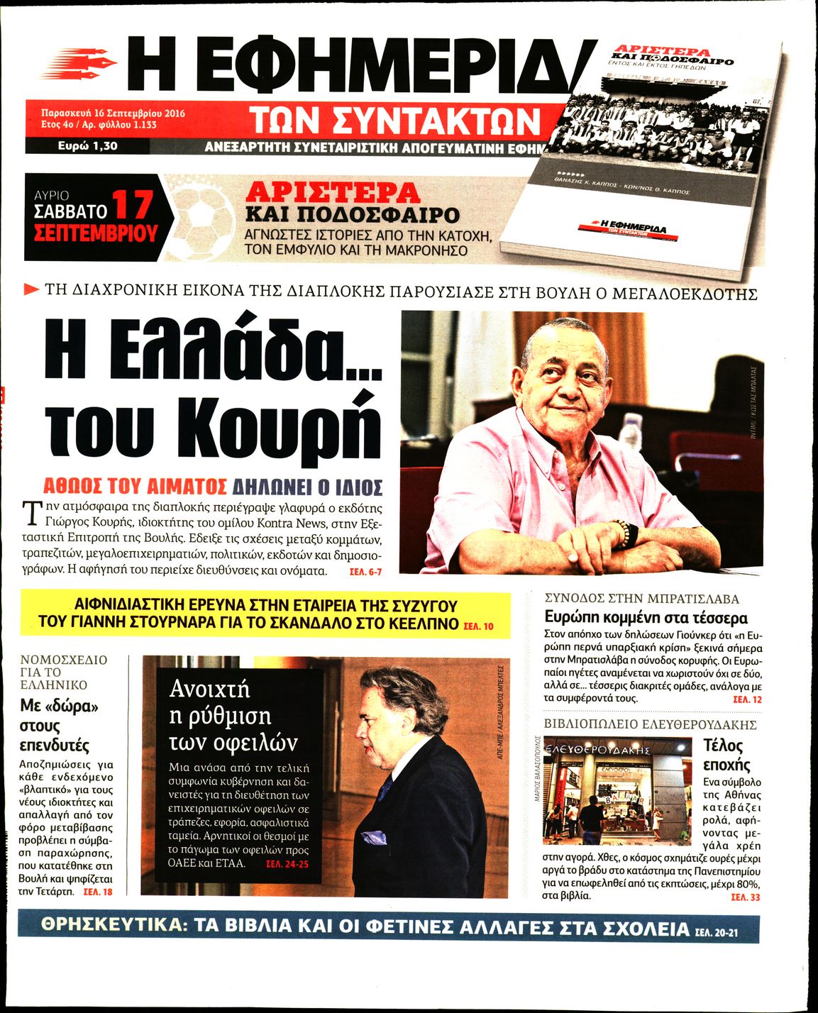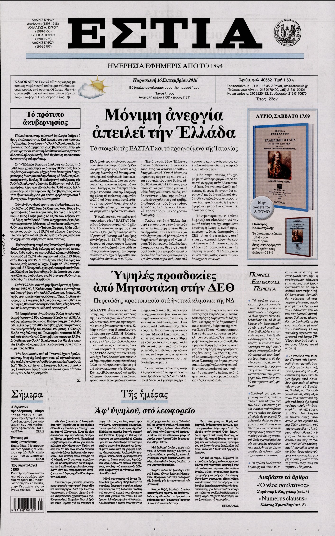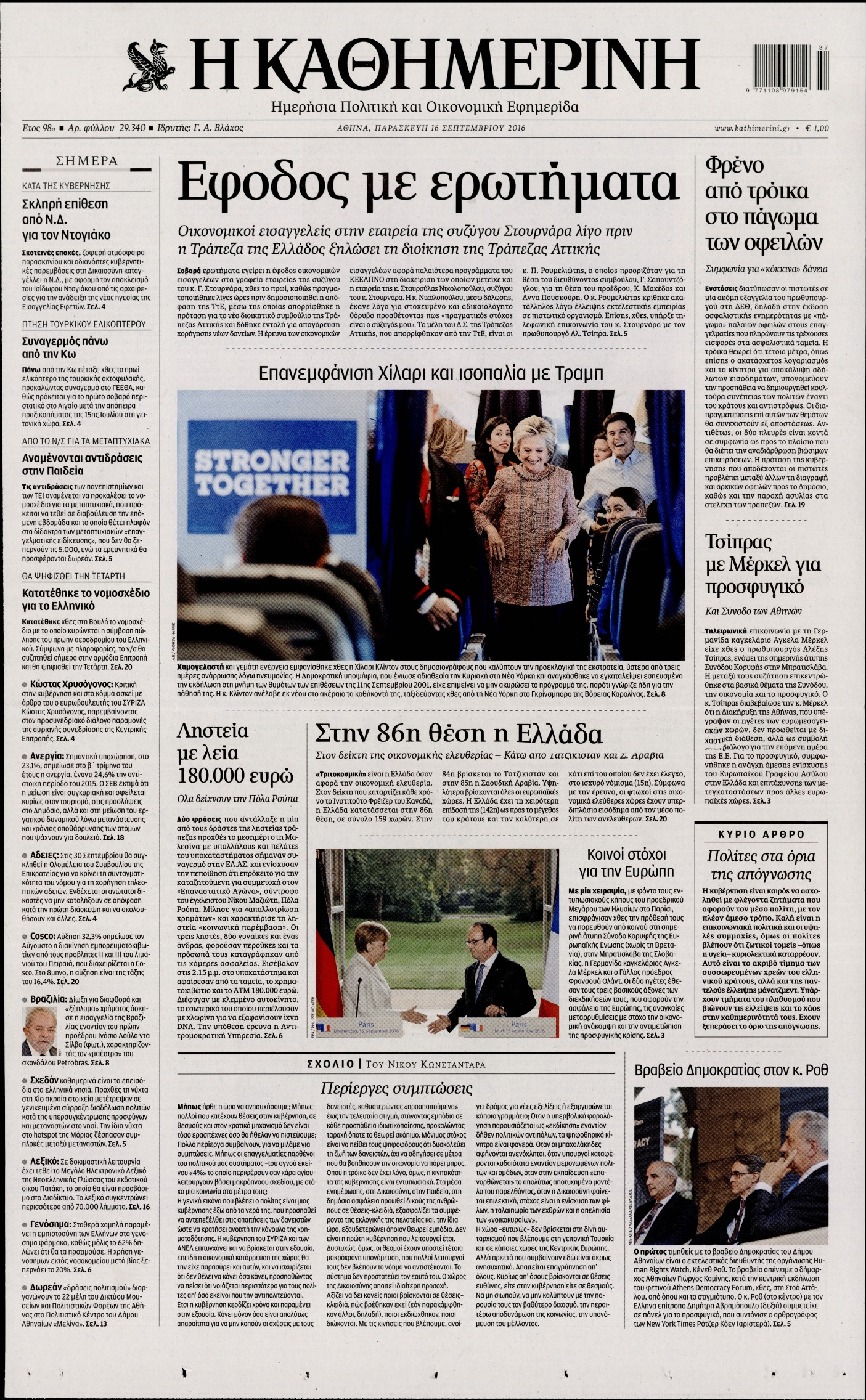Οι πολιτικές εφημερίδες 16/9/2016 Enikos Newsroom 05:11, Παρασκευή 16 Σεπτεμβρίου 2016 Media Διαβάστε τα σημερινά πρωτοσέλιδα των πολιτικών εφημερίδων: ΠΟΛΙΤΙΚΕΣ ΕΦΗΜΕΡΙΔΕΣ ΠΡΩΤΟΣΕΛΙΔΑ Μοιράσου το: σχολίασε κι εσύ (0 σχόλια) Ακολουθήστε το enikos.gr στο Google News και μάθετε πρώτοι όλες τις ειδήσεις Δείτε όλες τις τελευταίες ειδήσεις από την Ελλάδα και τον Κόσμο στο enikos.gr Ειδήσεις Ροή Ειδήσεων 7 ώρες πριν Χριστούγεννα στα μπλόκα: Επιμένουν στις κινητοποιήσεις τους οι αγρότες – Ανοίγουν τα διόδια το Σαββατοκύριακο 7 ώρες πριν Ουκρανία: Η άνευ προηγουμένου επίθεση σε ρωσικό τάνκερ στη Μεσόγειο και το μήνυμα προς στον Πούτιν – Το «μακρύ χέρι» του Κιέβου 6 ώρες πριν Πούτιν: Τα μηνύματα σε Ευρώπη και ΝΑΤΟ από το μαραθώνιο «σόου» του – Η απαίτηση για «σεβασμό» και η ειρήνη «με τους όρους» της Μόσχας 7 ώρες πριν Τραμπ: Δεν αποκλείει την πιθανότητα ενός πολέμου στη Βενεζουέλα – «Ο Μαδούρο ξέρει καλύτερα από τον καθένα τι ακριβώς θέλω» 8 ώρες πριν Συνεχίζει να προκαλεί ο Μίτσκοσκι: «Για μένα το όνομα Μακεδονία είναι ιερό» 6 ώρες πριν Ανακαλύφθηκαν αρχαία χρυσά νομίσματα 2.200 ετών που απεικονίζουν τον θεό Απόλλωνα – Η άγνωστη σύνδεση με τον Φίλιππο Β΄ της Μακεδονίας 7 ώρες πριν Ύπνος: Μια κρυφή κατάσταση του εγκεφάλου πριν από τον ύπνο μπορεί να είναι το “κλειδί” για υψηλή ευφυΐα και δημιουργικότητα 8 ώρες πριν Αριθμολογία: Οι άνθρωποι που έχουν γεννηθεί αυτές τις 4 ημερομηνίες, συχνά παρεξηγούνται – «Η καλοσύνη τους κρύβει τεράστια δύναμη» 9 ώρες πριν Ξεχάστε το καθάρισμα το Σαββατοκύριακο: Ο «κανόνας των 20 λεπτών» που θα σας λύσει τα χέρια 4 λεπτά πριν ΟΗΕ: Το Συμβούλιο Ασφαλείας παρατείνει για έναν χρόνο την εντολή της ειρηνευτικής δύναμης στο Κονγκό 19 λεπτά πριν Μοχάμεντ Σαλάχ: Ζήτησε «συγγνώμη» από τους συμπαίκτες του στη Λίβερπουλ για το ξέσπασμά του 34 λεπτά πριν Μάρκο Ρούμπιο: Ανθρωπιστική κατάπαυση του πυρός στο Σουδάν ζητά ο Αμερικανός υπουργός Εξωτερικών 49 λεπτά πριν Αγγελική Νικολούλη: Τα συλλυπητήρια για την απώλεια της Ειρήνης Μαρινάκη 1 ώρα πριν Βολιβία: Μαζική διαδηλώσεις εναντίον της κατάργησης των επιδοτήσεων των τιμών των καυσίμων ENIKOS NETWORK Το ΕΚΑΒ τιμήθηκε από την Ακαδημία Αθηνών για τα 40 χρόνια προσφοράς του Έχετε πραγματικά μεγάλη καρδιά; 10 χαρακτηριστικά όσων έχουν καλοσύνη Αναστολή μέτρων αναγκαστικής εκτέλεσης για κτηνοτρόφους που πλήττονται από την ευλογιά των αιγοπροβάτων Πλήρης επάρκεια προϊόντων στις λαϊκές της Αττικής, παρά τις αγροτικές κινητοποιήσεις – Τι απαντούν οι πωλητές Χαρτογραφώντας το «σημείο χωρίς επιστροφή»: Για πρώτη φορά αποκαλύπτεται με λεπτομέρεια το ακανθώδες όριο της ατμόσφαιρας τ... Η Google καταργεί τη λειτουργία «dark web report» – Πώς θα μπορούν οι χρήστες να διαγράφουν τα δεδομένα τους περισσότερα 04:20 , Σάββατο 20 Δεκεμβρίου 2025 Αγγελική Νικολούλη: Τα συλλυπητήρια για την απώλεια της Ειρήνης Μαρινάκη Τα συλληπητήρια στον πρόεδρο του Mega, τον Βαγγέλη Μαρινάκη, για την απώλεια της μητέρας του Ε... 02:50 , Σάββατο 20 Δεκεμβρίου 2025 GNTM: Η Ξένια Τσίρκοβα αναδείχθηκε μεγάλη νικήτρια και πήρε τις 50.000 ευρώ – Ποιος βρέθηκε σε απόσταση αναπνοής; Με φαντασμαγορικό τρόπο ολοκληρώθηκε το βράδυ της Παρασκευής ο μεγάλος τελικός του GNTM, μέσα ... 22:42 , Παρασκευή 19 Δεκεμβρίου 2025 Γιώργος Γιαννόπουλος για “Το σόι σου”: “Είναι ευτυχία και ευλογία αυτή η σειρά” «Είναι ευτυχία και ευλογία η συγκυρία αυτής της σειράς», θα πει ο Γιώργος Γιαννόπουλος -ο αγαπ