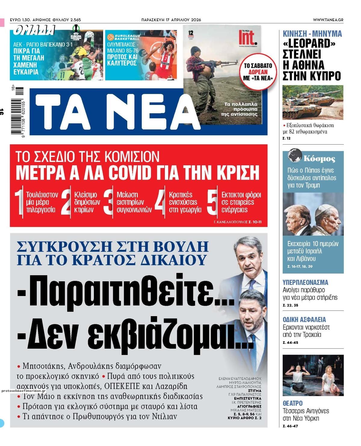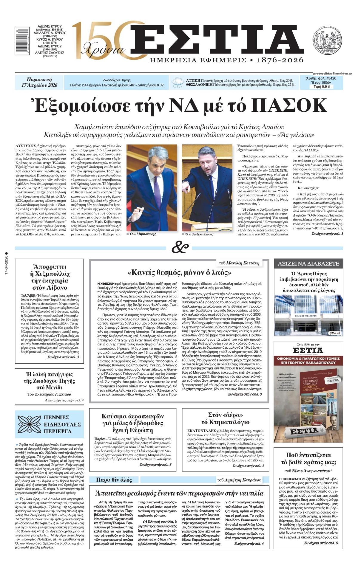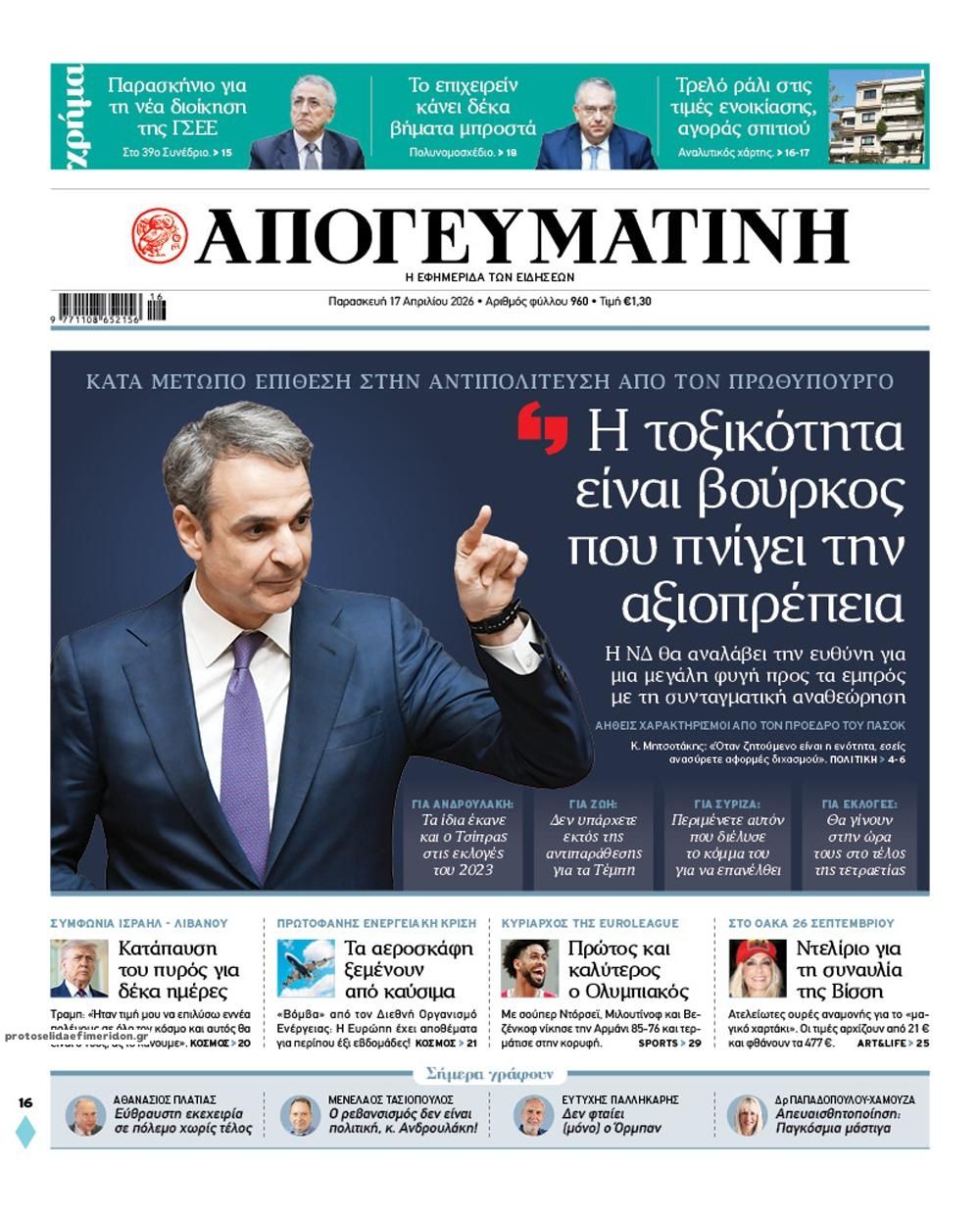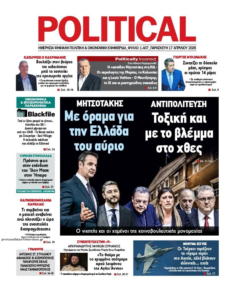Διαβάστε τα πρωτοσέλιδα από τις πολιτικές εφημερίδες, σήμερα 17/4/2026.