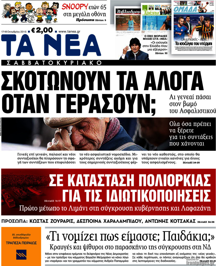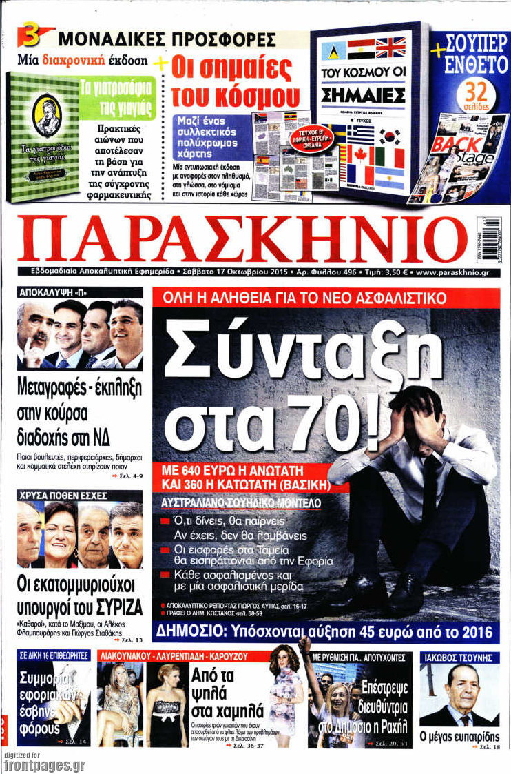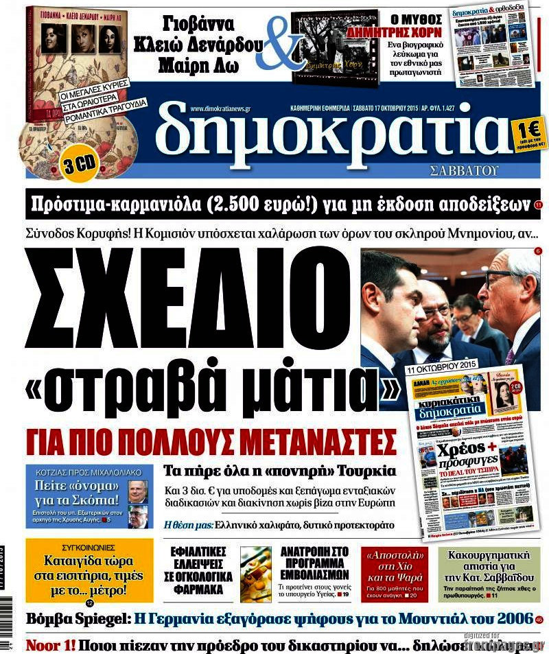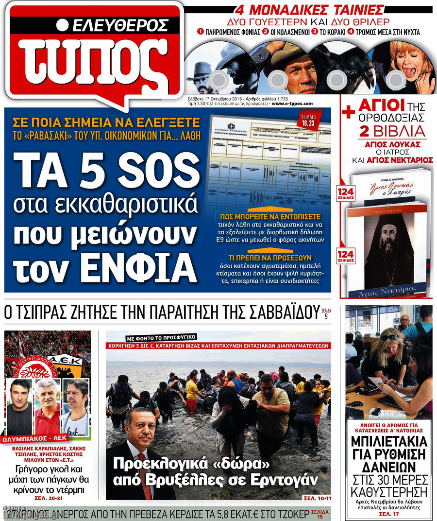 Οι πολιτικές εφημερίδες 17/10/2015 Enikos Newsroom 08:31, Σάββατο 17 Οκτωβρίου 2015 Media Διαβάστε τα σημερινά πρωτοσέλιδα των πολιτικών εφημερίδων: ΠΟΛΙΤΙΚΕΣ ΕΦΗΜΕΡΙΔΕΣ ΠΡΩΤΟΣΕΛΙΔΑ Μοιράσου το: σχολίασε κι εσύ (0 σχόλια) Ακολουθήστε το enikos.gr στο Google News και μάθετε πρώτοι όλες τις ειδήσεις Δείτε όλες τις τελευταίες ειδήσεις από την Ελλάδα και τον Κόσμο στο enikos.gr Ειδήσεις Ροή Ειδήσεων 54 λεπτά πριν Μεσόγειος: Η διαδρομή του ρωσικού τάνκερ «Qendil» και η στοχευμένη επίθεση της Ουκρανίας με drone – Ο Πούτιν προειδοποίησε για αντίποινα 48 λεπτά πριν Αττική: Θρίλερ με νεκρό βρέφος 5 μηνών – Κοιμόταν στο ίδιο κρεβάτι με τους γονείς του 2 ώρες πριν Από το Ορμένιο ως τα Μάλγαρα κι από τη Σιάτιστα μέχρι τη Νίκαια: Μπλόκα σε όλη την Ελλάδα – Το Σάββατο ανοίγουν τα διόδια οι αγρότες 2 ώρες πριν «Έλληνας Εσκομπάρ»: Φωτογραφίες με τους 4 τόνους κοκαΐνης που κατασχέθηκαν από το σκάφος «Ουρανία» 3 ώρες πριν Πούτιν: Σαρκαστικά μηνύματα, παράπονα και απρόοπτα στη συνέντευξη Τύπου – Η πρόταση γάμου on air και οι ερωτήσεις για τα αγγούρια και τους… εξωγήινους 3 ώρες πριν Τα 5 ζώδια που ευνοούνται στην ερωτική ζωή τους την επόμενη εβδομάδα – «Η ενέργεια του Αιγόκερου φέρνει αγάπη και σταθερότητα» 7 ώρες πριν Ειδικός μοιράζεται 6 κόλπα για να διατηρείστε σε φόρμα με πάνω από 40 ώρες εργασίας την εβδομάδα: «Προπονηθείτε πριν από τη δουλειά, όχι μετά» 4 ώρες πριν Αυτό το έξυπνο μαθηματικό κόλπο θα μπορούσε να αλλάξει τον τρόπο με τον οποίο οι επιστήμονες μελετούν τους σεισμούς 2 ώρες πριν Κουίζ για την παλιά Αθήνα: Αναγνωρίζετε την περιοχή; Έχετε περάσει 100% από εκεί 23 δευτερόλεπτα πριν Τέμπη: Διεκόπη για τις 9 Ιανουαρίου η δίκη για τα χαμένα βίντεο της εμπορικής αμαξοστοιχίας – «Απαιτούμε να μας σέβονται» 5 λεπτά πριν Hellenic Train: Αλλαγές και καταργήσεις δρομολογίων λεωφορείων λόγω των αγροτικών κινητοποιήσεων 12 λεπτά πριν Ζελένσκι: «Δεν χρειάζεται αναθεώρηση του Συντάγματος» για να εγκαταλείψει η Ουκρανία τον στόχο ένταξης στο ΝΑΤΟ 16 λεπτά πριν Παναγιώτα Βλαντή: Η τρυφερή εξομολόγηση για τον σύζυγό της – «Πραγματικά ήταν για μένα αυτό που ήθελα σε όλη μου τη ζωή» 23 λεπτά πριν Επίσημη η «βόμβα»: Ο ΠΑΟΚ ανακοίνωσε την απόκτηση του Πάτρικ Μπέβερλι ENIKOS NETWORK «Η σούπερ» γρίπη εξαπλώνεται στην Ευρώπη-Στοιχεία για την αποτελεσματικότητα του εμβολίου από το ECDC ΕΛΣΤΑΤ: Αύξηση κατά 1,7% των επαγγελματιών υγείας το 2024 Η απάντηση της κυβέρνησης στα αιτήματα των αγροτών: 16 έχουν ικανοποιηθεί, 4 βρίσκονται υπό επεξεργασία και 7 δεν είναι εφι... Μισθολογική διαφάνεια: Το 68% των εργαζομένων αγνοεί τη νέα οδηγία – Αναλυτικά τα στοιχεία έρευνας Χαρτογραφώντας το «σημείο χωρίς επιστροφή»: Για πρώτη φορά αποκαλύπτεται με λεπτομέρεια το ακανθώδες όριο της ατμόσφαιρας τ... Η Google καταργεί τη λειτουργία «dark web report» – Πώς θα μπορούν οι χρήστες να διαγράφουν τα δεδομένα τους περισσότερα 18:11 , Παρασκευή 19 Δεκεμβρίου 2025 Το σόι σου: Ο Άρης έρχεται στην Ελλάδα για τις γιορτές των Χριστουγέννων – Τι θα δούμε στο αποψινό εορταστικό επεισόδιο Ένα απολαυστικό, εορταστικό επεισόδιο της σειράς “Το σόι σου”, γεμάτο ευτράπελα αλ... 15:15 , Παρασκευή 19 Δεκεμβρίου 2025 Την Κυριακή με τη Realnews: Ό,τι και αν αγοράσεις, σκανάρεις και κερδίζεις! Την Κυριακή με τη Realnews: Ό,τι και αν αγοράσεις, σκανάρεις και κερδίζεις! Με το PADU app, το... 08:00 , Παρασκευή 19 Δεκεμβρίου 2025 Την Κυριακή με τη Realnews: Δωροεπιταγή 10€ Δωροεπιταγή αξίας 10€ για αγορές άνω των 60€ από τα π