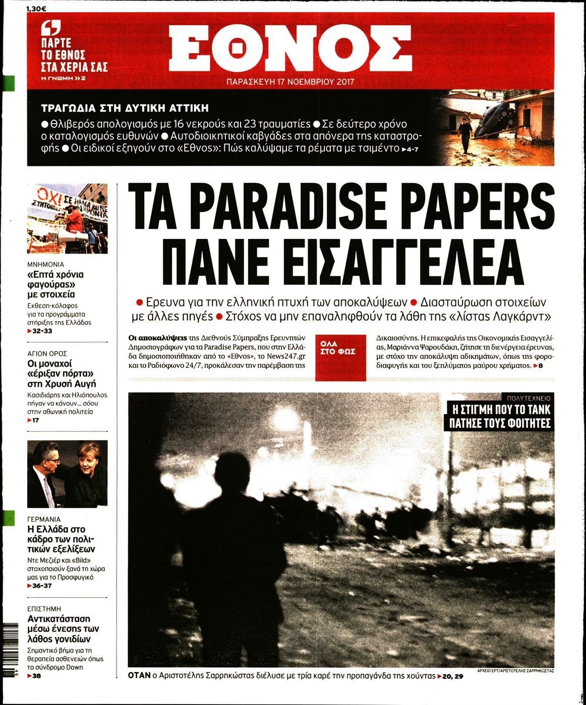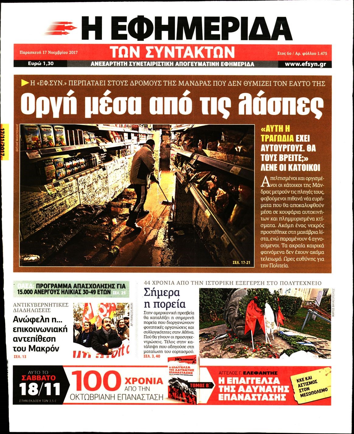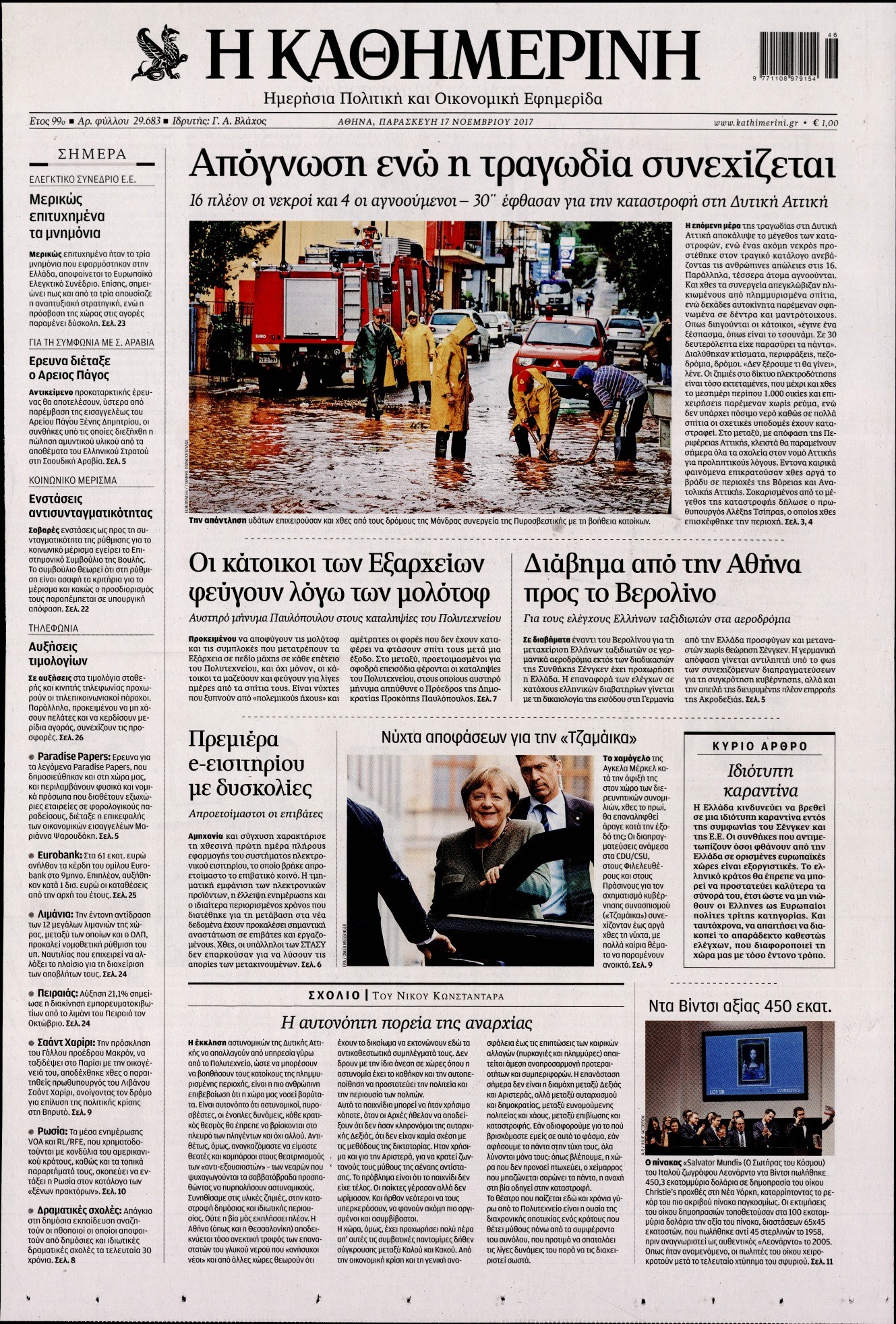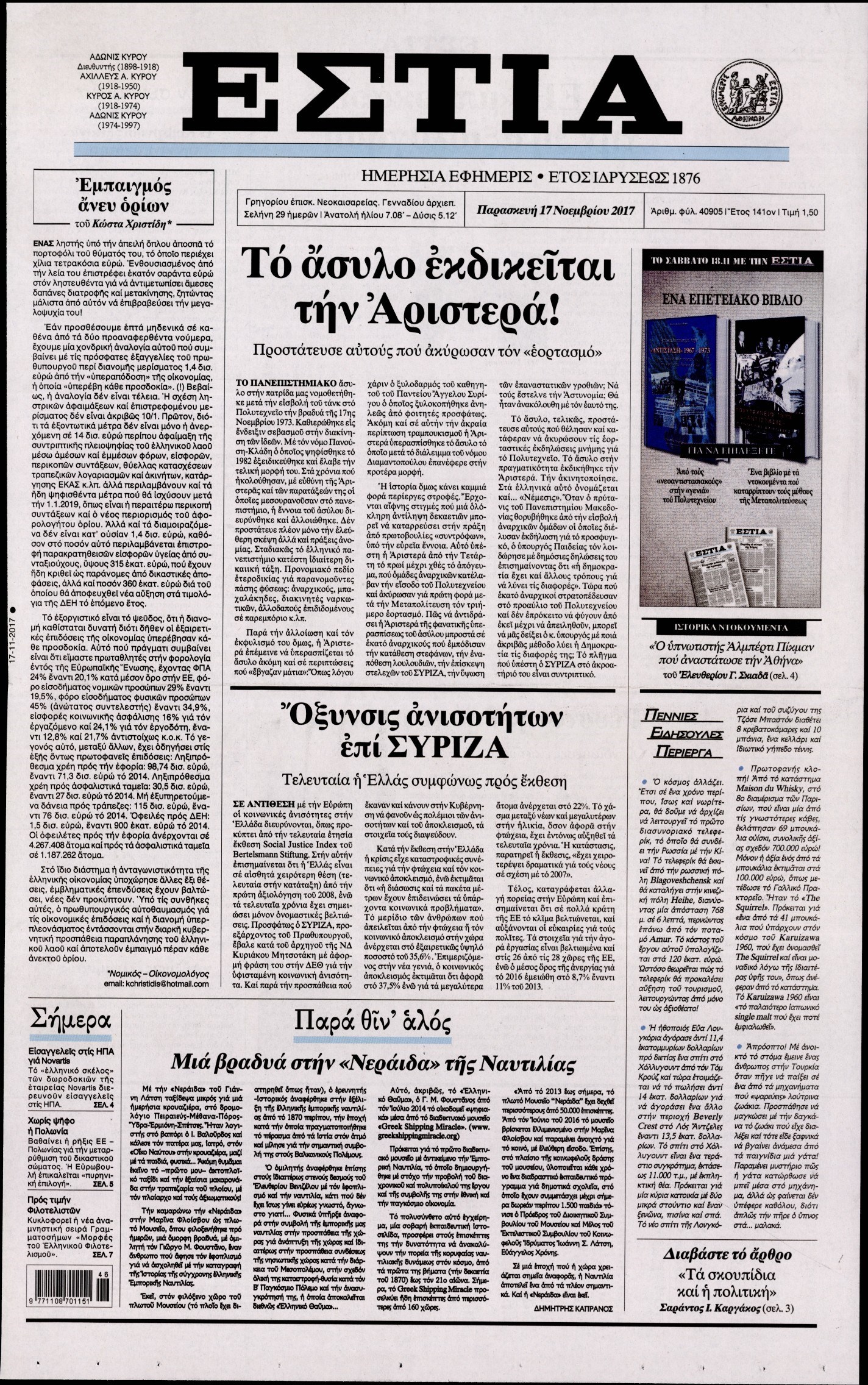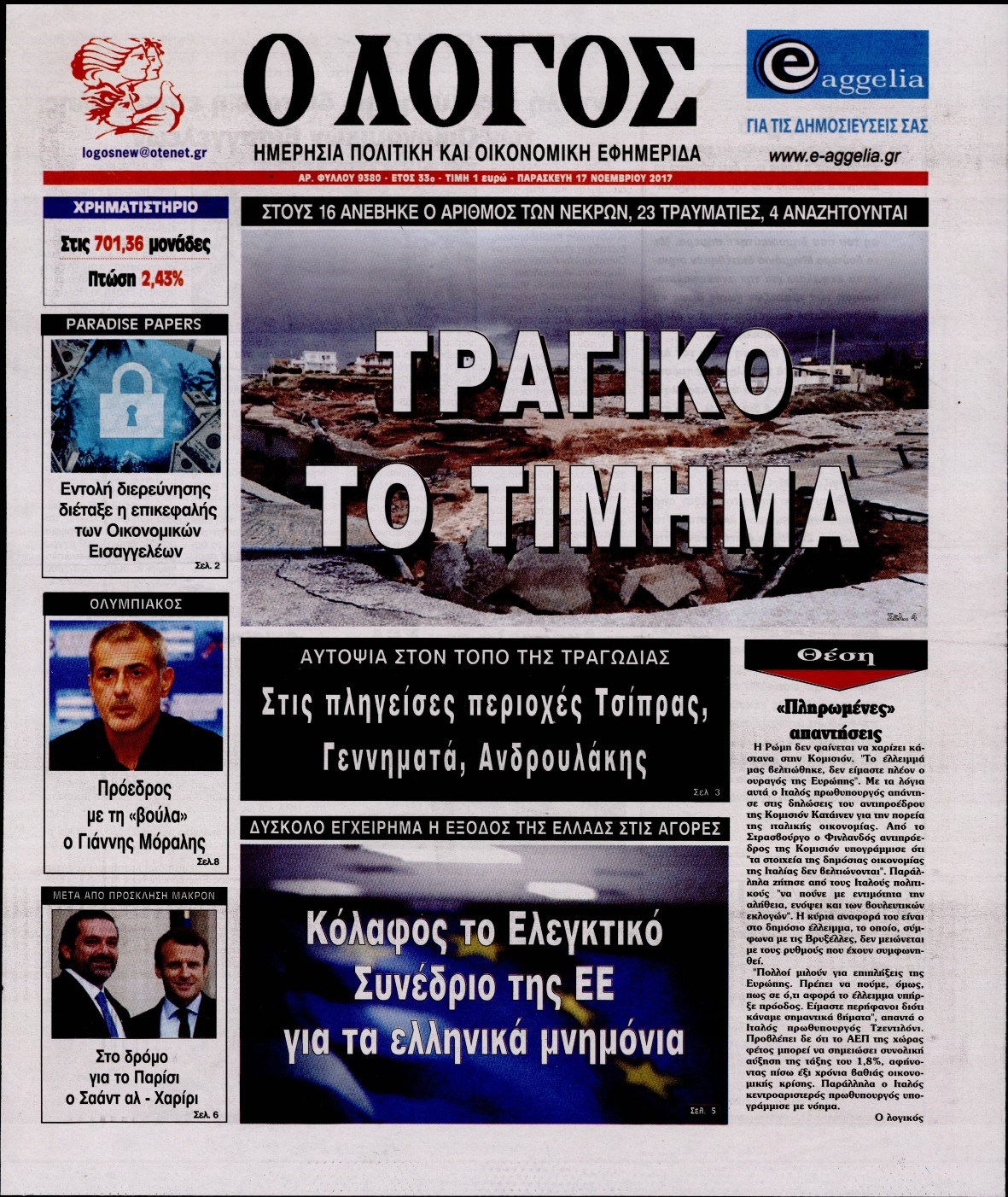 Οι πολιτικές εφημερίδες 17/11/2017 Enikos Newsroom 08:11, Παρασκευή 17 Νοεμβρίου 2017 Media Διαβάστε τα σημερινά πρωτοσέλιδα των πολιτικών εφημερίδων: ΠΟΛΙΤΙΚΕΣ ΕΦΗΜΕΡΙΔΕΣ ΠΡΩΤΟΣΕΛΙΔΑ Μοιράσου το: σχολίασε κι εσύ (0 σχόλια) Ακολουθήστε το enikos.gr στο Google News και μάθετε πρώτοι όλες τις ειδήσεις Δείτε όλες τις τελευταίες ειδήσεις από την Ελλάδα και τον Κόσμο στο enikos.gr Ειδήσεις Ροή Ειδήσεων 4 ώρες πριν Χριστούγεννα στα μπλόκα: Επιμένουν στις κινητοποιήσεις τους οι αγρότες – Ανοίγουν τα διόδια το Σαββατοκύριακο 4 ώρες πριν Ουκρανία: Η άνευ προηγουμένου επίθεση σε ρωσικό τάνκερ στη Μεσόγειο και το μήνυμα προς στον Πούτιν – Το «μακρύ χέρι» του Κιέβου 3 ώρες πριν Πούτιν: Τα μηνύματα σε Ευρώπη και ΝΑΤΟ από το μαραθώνιο «σόου» του – Η απαίτηση για «σεβασμό» και η ειρήνη «με τους όρους» της Μόσχας 4 ώρες πριν Τραμπ: Δεν αποκλείει την πιθανότητα ενός πολέμου στη Βενεζουέλα – «Ο Μαδούρο ξέρει καλύτερα από τον καθένα τι ακριβώς θέλω» 5 ώρες πριν Συνεχίζει να προκαλεί ο Μίτσκοσκι: «Για μένα το όνομα Μακεδονία είναι ιερό» 3 ώρες πριν Ανακαλύφθηκαν αρχαία χρυσά νομίσματα 2.200 ετών που απεικονίζουν τον θεό Απόλλωνα – Η άγνωστη σύνδεση με τον Φίλιππο Β΄ της Μακεδονίας 4 ώρες πριν Ύπνος: Μια κρυφή κατάσταση του εγκεφάλου πριν από τον ύπνο μπορεί να είναι το “κλειδί” για υψηλή ευφυΐα και δημιουργικότητα 5 ώρες πριν Αριθμολογία: Οι άνθρωποι που έχουν γεννηθεί αυτές τις 4 ημερομηνίες, συχνά παρεξηγούνται – «Η καλοσύνη τους κρύβει τεράστια δύναμη» 6 ώρες πριν Ξεχάστε το καθάρισμα το Σαββατοκύριακο: Ο «κανόνας των 20 λεπτών» που θα σας λύσει τα χέρια 14 λεπτά πριν ΗΠΑ: Τραγωδία στην Αλαμπάμα – Σκότωσε την δημοσιογράφο σύζυγό του και αυτοκτόνησε μπροστά στον 3χρονο γιο τους 29 λεπτά πριν Πρόταση γάμου στο ΣΕΦ κατά την διάρκεια του αγώνα Ολυμπιακός-Βιλερμπάν – Δείτε βίντεο 44 λεπτά πριν Euroleague: Επέστρεψε στις νίκες ο Ολυμπιακός, πήρε την ματσάρα της χρονιάς η Μπάρτσα – Τα αποτελέσματα και η βαθμολογία 59 λεπτά πριν Συρία: Μαζικά πλήγματα των ΗΠΑ σε θέσεις του Ισλαμικού Κράτους – Χέγκσεθ: «Δεν είναι αρχή πολέμου, είναι μια δήλωση εκδίκησης» για το θάνατο των στρατιωτών μας 1 ώρα πριν Ουκρανία: Ολοκληρώθηκαν οι συνομιλίες με τους Αμερικανούς κι Ευρωπαίους διαπραγματευτές ENIKOS NETWORK Το ΕΚΑΒ τιμήθηκε από την Ακαδημία Αθηνών για τα 40 χρόνια προσφοράς του Έχετε πραγματικά μεγάλη καρδιά; 10 χαρακτηριστικά όσων έχουν καλοσύνη Αναστολή μέτρων αναγκαστικής εκτέλεσης για κτηνοτρόφους που πλήττονται από την ευλογιά των αιγοπροβάτων Πλήρης επάρκεια προϊόντων στις λαϊκές της Αττικής, παρά τις αγροτικές κινητοποιήσεις – Τι απαντούν οι πωλητές Χαρτογραφώντας το «σημείο χωρίς επιστροφή»: Για πρώτη φορά αποκαλύπτεται με λεπτομέρεια το ακανθώδες όριο της ατμόσφαιρας τ... Η Google καταργεί τη λειτουργία «dark web report» – Πώς θα μπορούν οι χρήστες να διαγράφουν τα δεδομένα τους περισσότερα 22:42 , Παρασκευή 19 Δεκεμβρίου 2025 Γιώργος Γιαννόπουλος για “Το σόι σου”: “Είναι ευτυχία και ευλογία αυτή η σειρά” «Είναι ευτυχία και ευλογία η συγκυρία αυτής της σειράς», θα πει ο Γιώργος Γιαννόπουλος -ο αγαπ... 20:37 , Παρασκευή 19 Δεκεμβρίου 2025 Don’t Forget The Lyrics: Η Έλλη Κοκκίνου υποδέχεται 4 παίκτες που θα κάνουν τα πάντα για να μη χάσουν ούτε… μισή λέξη από τους στίχους Το «Don’t Forget The Lyrics» επιστρέφει απόψε, Παρασκευή 19 Δεκεμβρίου, στις 21:00 με νέο επει... 19:31 , Παρασκευή 19 Δεκεμβρίου 2025 GNTM: Απόψε ο μεγάλος τελικός για τους 4 φιναλίστ Έπειτα 