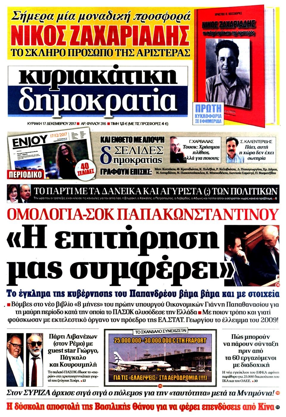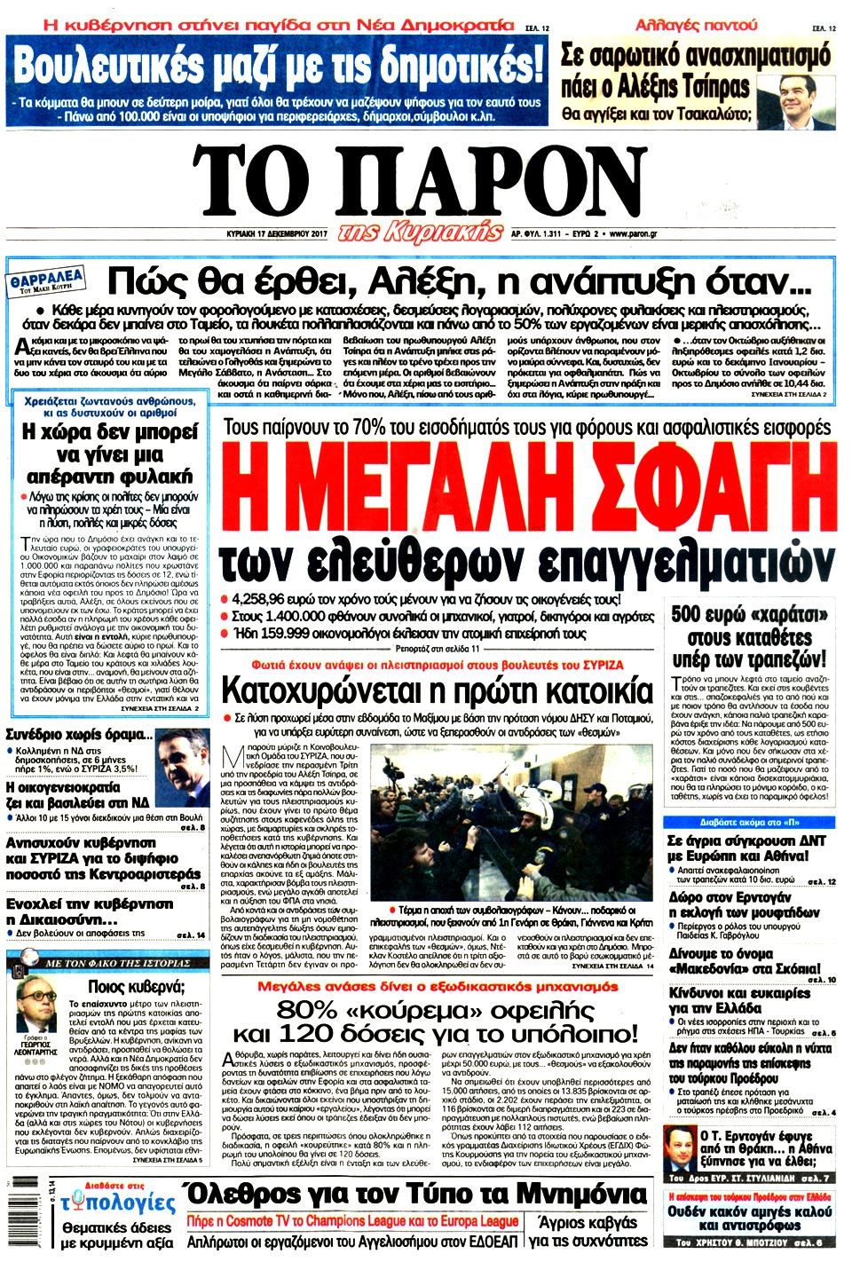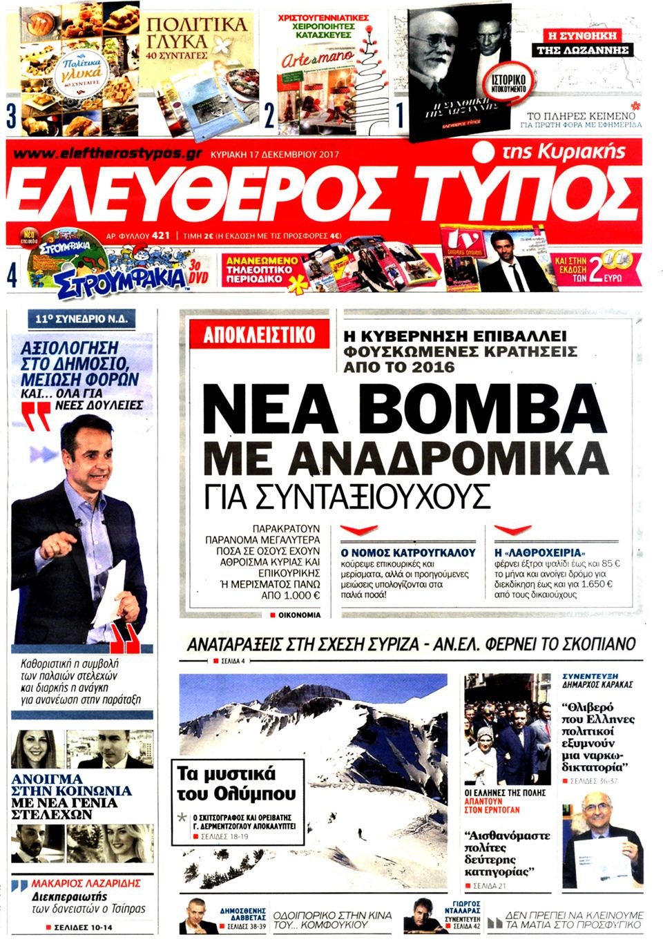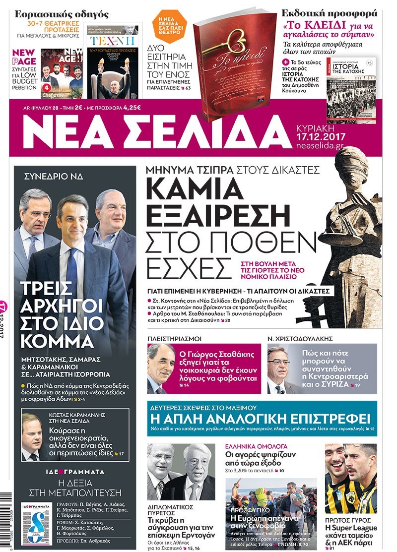 Οι πολιτικές εφημερίδες 17/12/2017 Κώστας Τεό 07:03, Κυριακή 17 Δεκεμβρίου 2017 Media Διαβάστε τα σημερινά πρωτοσέλιδα των πολιτικών εφημερίδων: ΠΟΛΙΤΙΚΕΣ ΕΦΗΜΕΡΙΔΕΣ ΠΡΩΤΟΣΕΛΙΔΑ Μοιράσου το: σχολίασε κι εσύ (0 σχόλια) Ακολουθήστε το enikos.gr στο Google News και μάθετε πρώτοι όλες τις ειδήσεις Δείτε όλες τις τελευταίες ειδήσεις από την Ελλάδα και τον Κόσμο στο enikos.gr Ειδήσεις Ροή Ειδήσεων 48 λεπτά πριν Μπλόκα: Οι αγρότες σηκώνουν τις μπάρες σε διόδια για τους εκδρομείς των Χριστουγέννων και μοιράζουν προϊόντα – Βίντεο 1 ώρα πριν Τσιάρας προς αγρότες: Τα μπλόκα και τα πείσματα δεν ωφελούν – Οι λύσεις περνούν μέσα από τον διάλογο 2 ώρες πριν Αρχεία Έπσταϊν: Οι συγκλονιστικές φωτογραφίες – Ο Μάικλ Τζάκσον, ο Μικ Τζάγκερ και ο Κέβιν Σπέισι ανάμεσα στους διάσημους που απεικονίζονται 7 λεπτά πριν Μαθητές διακινούσαν κοκαΐνη και χασίς σε σχολείο της Αττικής – 12 συλλήψεις 3 ώρες πριν Ινδία: Επτά ελέφαντες σκοτώθηκαν κατά τη σύγκρουση επιβατικού τρένου με κοπάδι 4 ώρες πριν Μία νέα «χρυσή» περίοδος αρχίζει για 3 ζώδια από σήμερα – «Μία αναπάντεχη ευκαιρία οδηγεί στην επιτυχία» 6 ώρες πριν Αγχώνεται για το χριστουγεννιάτικο δώρο που πήρε στην πλούσια σύντροφό του – «Φοβάμαι πως θα το βρει φθηνιάρικο, φοράει βραχιόλια Cartier» 3 ώρες πριν Διαιτολόγος αποκαλύπτει 9 πρωινές συνήθειες που «λιώνουν» το κοιλιακό λίπος – «Υποστηρίζουν την υγιεινή απώλεια βάρους» 4 ώρες πριν Οι 7 φράσεις που δεν λένε ποτέ οι συναισθηματικά έξυπνοι άνθρωποι κατά τη διάρκεια ενός καβγά 4 λεπτά πριν Γερμανού για Μαζωνάκη: «Η σχέση μας μετράει 30 χρόνια – Σαφώς και έχω άποψη» 7 λεπτά πριν Μαθητές διακινούσαν κοκαΐνη και χασίς σε σχολείο της Αττικής – 12 συλλήψεις 13 λεπτά πριν Βέλγιο: Άγνωστοι έριξαν κόκκινη μπογιά στο προξενείο της Πολωνίας στις Βρυξέλλες 20 λεπτά πριν Γρηγόρης Δημητριάδης: Χριστουγεννιάτικη συνάντηση με τα παιδιά της ΔΑΠ-ΝΔΦΚ και της ΟΝΝΕΔ 28 λεπτά πριν Στέφανος Παπαδόπουλος: Ξέσπασε σε κλάματα – «Θέλω να έρθει μπροστά μου και να μου πει ότι είμαι ψεύτης» ENIKOS NETWORK Η αποχή από την αναπαραγωγή παρατείνει τη ζωή στα ζώα, σύμφωνα με μελέτη – Τι ισχύει για τους ανθρώπους; Σημαντικές επαφές στις ΗΠΑ είχε ο υπουργός Υγείας Άδωνις Γεωργιάδης Τσιάρας προς αγρότες: Έχει ικανοποιηθεί το 74% των αιτημάτων – Τα μπλόκα και τα πείσματα δεν ωφελούν MyHealth App: Τα στοιχεία για τον Προσωπικό Βοηθό Υγείας Πολίτη – Τι ερωτήματα έγιναν μέσα σε 7 ημέρες Χαρτογραφώντας το «σημείο χωρίς επιστροφή»: Για πρώτη φορά αποκαλύπτεται με λεπτομέρεια το ακανθώδες όριο της ατμόσφαιρας τ... Η Google καταργεί τη λειτουργία «dark web report» – Πώς θα μπορούν οι χρήστες να διαγράφουν τα δεδομένα τους περισσότερα 14:04 , Σάββατο 20 Δεκεμβρίου 2025 Η Realnews αυτής της Κυριακής (21/12/2025) Με τίτλο: «Ασπίδα προστασίας για την Ελλάδα» κυκλοφορεί, αυτήν την Κυριακή, η Realnews. Σημαντ... 12:53 , Σάββατο 20 Δεκεμβρίου 2025 Να μ’ αγαπάς: Το παρελθόν έρχεται στο φως – Καταιγιστικές εξελίξεις στα τελευταία επεισόδια του 2025 Ο Άγγελος αποκαλύπτεται, η Φωτεινή ανησυχεί για τον Λευτέρη και η Ζωή έρχεται αντιμέτωπη με το... 11:41 , Σάββατο 20 Δεκεμβρίου 2025 «Η αγάπη δεν χάνεται ποτέ»: Η μικρού μήκους ταινία κινουμένων σχεδίων που θέτει ερωτήματα για τη ζωή και τον θάνατο Ο θάνατος είναι ένα από τα πιο σκληρά θέματα που καλείται να διαχειριστεί κάποιος στη διάρκεια... 09:30 , Σάββατο 20 Δεκεμβρίου 2025 «Porto Leone: Στη γειτονιά με τα κόκκινα φανάρια» – Ο Χρόνης αποκαλύπτει στην Αλεξάνδρα τ