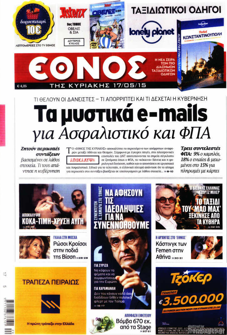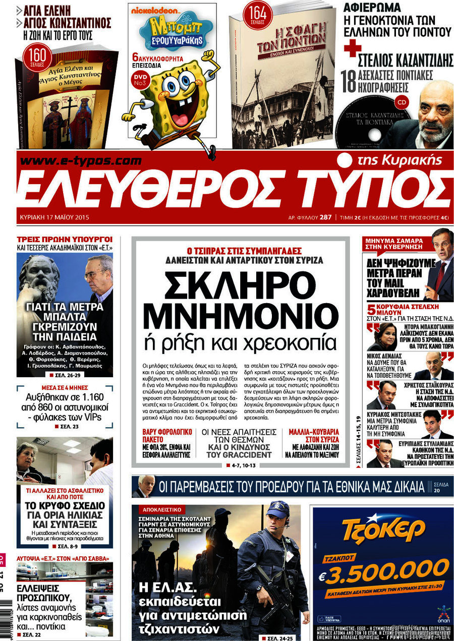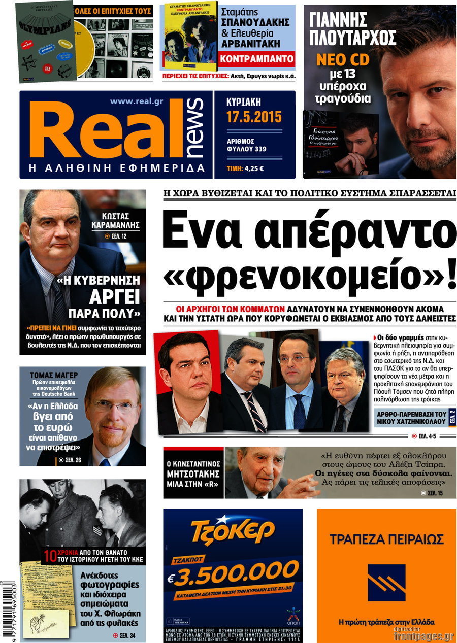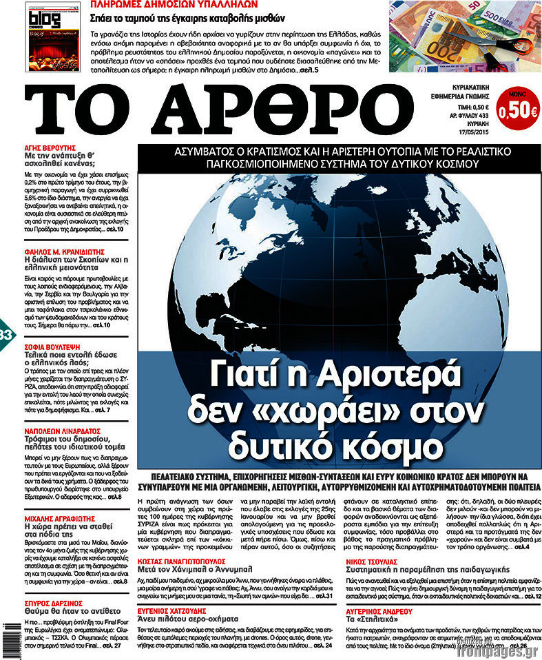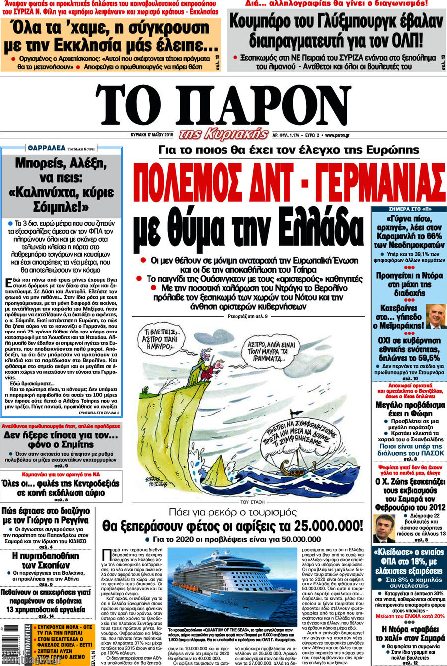 Οι πολιτικές εφημερίδες 17/5/2015 Enikos Newsroom 07:43, Κυριακή 17 Μαΐου 2015 Media Διαβάστε τα σημερινά πρωτοσέλιδα των πολιτικών εφημερίδων: ΠΟΛΙΤΙΚΕΣ ΕΦΗΜΕΡΙΔΕΣ ΠΡΩΤΟΣΕΛΙΔΑ Μοιράσου το: σχολίασε κι εσύ (0 σχόλια) Ακολουθήστε το enikos.gr στο Google News και μάθετε πρώτοι όλες τις ειδήσεις Δείτε όλες τις τελευταίες ειδήσεις από την Ελλάδα και τον Κόσμο στο enikos.gr Ειδήσεις Ροή Ειδήσεων 56 λεπτά πριν Χριστούγεννα στα μπλόκα: Επιμένουν στις κινητοποιήσεις τους οι αγρότες – Ανοίγουν τα διόδια το Σαββατοκύριακο 1 ώρα πριν Ουκρανία: Η άνευ προηγουμένου επίθεση σε ρωσικό τάνκερ στη Μεσόγειο και το μήνυμα προς στον Πούτιν – Το «μακρύ χέρι» του Κιέβου 33 λεπτά πριν Πούτιν: Τα μηνύματα σε Ευρώπη και ΝΑΤΟ από το μαραθώνιο «σόου» του – Η απαίτηση για «σεβασμό» και η ειρήνη «με τους όρους» της Μόσχας 1 ώρα πριν Τραμπ: Δεν αποκλείει την πιθανότητα ενός πολέμου στη Βενεζουέλα – «Ο Μαδούρο ξέρει καλύτερα από τον καθένα τι ακριβώς θέλω» 2 ώρες πριν Συνεχίζει να προκαλεί ο Μίτσκοσκι: «Για μένα το όνομα Μακεδονία είναι ιερό» 4 ώρες πριν Πούτιν: «Ναι, είμαι ερωτευμένος» – Βίντεο από τη σπάνια προσωπική παραδοχή του 3 ώρες πριν Αριθμολογία: Οι άνθρωποι που έχουν γεννηθεί αυτές τις 4 ημερομηνίες, συχνά παρεξηγούνται – «Η καλοσύνη τους κρύβει τεράστια δύναμη» 2 ώρες πριν Ύπνος: Μια κρυφή κατάσταση του εγκεφάλου πριν από τον ύπνο μπορεί να είναι το “κλειδί” για υψηλή ευφυΐα και δημιουργικότητα 4 ώρες πριν Ξεχάστε το καθάρισμα το Σαββατοκύριακο: Ο «κανόνας των 20 λεπτών» που θα σας λύσει τα χέρια 34 λεπτά πριν Ανακαλύφθηκαν αρχαία χρυσά νομίσματα 2.200 ετών που απεικονίζουν τον θεό Απόλλωνα – Η άγνωστη σύνδεση με τον Φίλιππο Β΄ της Μακεδονίας 4 λεπτά πριν Γάζα: Ισραηλινό πλήγμα σε σχολείο που είχαν καταφύγει εκτοπισμένοι – Τουλάχιστον έξι νεκροί 18 λεπτά πριν Ολυμπιακός – Βιλερμπάν 107-84: Επιστροφή στις νίκες με… προπόνηση 24 λεπτά πριν Νέος Κόσμος: Συνελήφθη 41χρονος με ένταλμα από την Τουρκία για εμπόριο ναρκωτικών και ληστεία 33 λεπτά πριν Πούτιν: Τα μηνύματα σε Ευρώπη και ΝΑΤΟ από το μαραθώνιο «σόου» του – Η απαίτηση για «σεβασμό» και η ειρήνη «με τους όρους» της Μόσχας 34 λεπτά πριν Ανακαλύφθηκαν αρχαία χρυσά νομίσματα 2.200 ετών που απεικονίζουν τον θεό Απόλλωνα – Η άγνωστη σύνδεση με τον Φίλιππο Β΄ της Μακεδονίας ENIKOS NETWORK Το ΕΚΑΒ τιμήθηκε από την Ακαδημία Αθηνών για τα 40 χρόνια προσφοράς του Έχετε πραγματικά μεγάλη καρδιά; 10 χαρακτηριστικά όσων έχουν καλοσύνη Αναστολή μέτρων αναγκαστικής εκτέλεσης για κτηνοτρόφους που πλήττονται από την ευλογιά των αιγοπροβάτων Πλήρης επάρκεια προϊόντων στις λαϊκές της Αττικής, παρά τις αγροτικές κινητοποιήσεις – Τι απαντούν οι πωλητές Χαρτογραφώντας το «σημείο χωρίς επιστροφή»: Για πρώτη φορά αποκαλύπτεται με λεπτομέρεια το ακανθώδες όριο της ατμόσφαιρας τ... Η Google καταργεί τη λειτουργία «dark web report» – Πώς θα μπορούν οι χρήστες να διαγράφουν τα δεδομένα τους περισσότερα 22:42 , Παρασκευή 19 Δεκεμβρίου 2025 Γιώργος Γιαννόπουλος για “Το σόι σου”: “Είναι ευτυχία και ευλογία αυτή η σειρά” «Είναι ευτυχία και ευλογία η συγκυρία αυτής της σειράς», θα πει ο Γιώργος Γιαννόπουλος -ο αγαπ... 20:37 , Παρασκευή 19 Δεκεμβρίου 2025 Don’t Forget The Lyrics: Η Έλλη Κοκκίνου υποδέχεται 4 παίκτες που θα κάνουν τα πάντα για να μη χάσουν ούτε… μισή λέξη από τους στίχους Το «Don’t Forget The Lyrics» επιστρέφει απόψε, Παρασκευή 19 Δεκεμβρίου, στις 21:00 με νέο επει... 19:31 , Παρασκευή 19 Δεκεμβρίου 2025 GNTM: Απόψε ο 