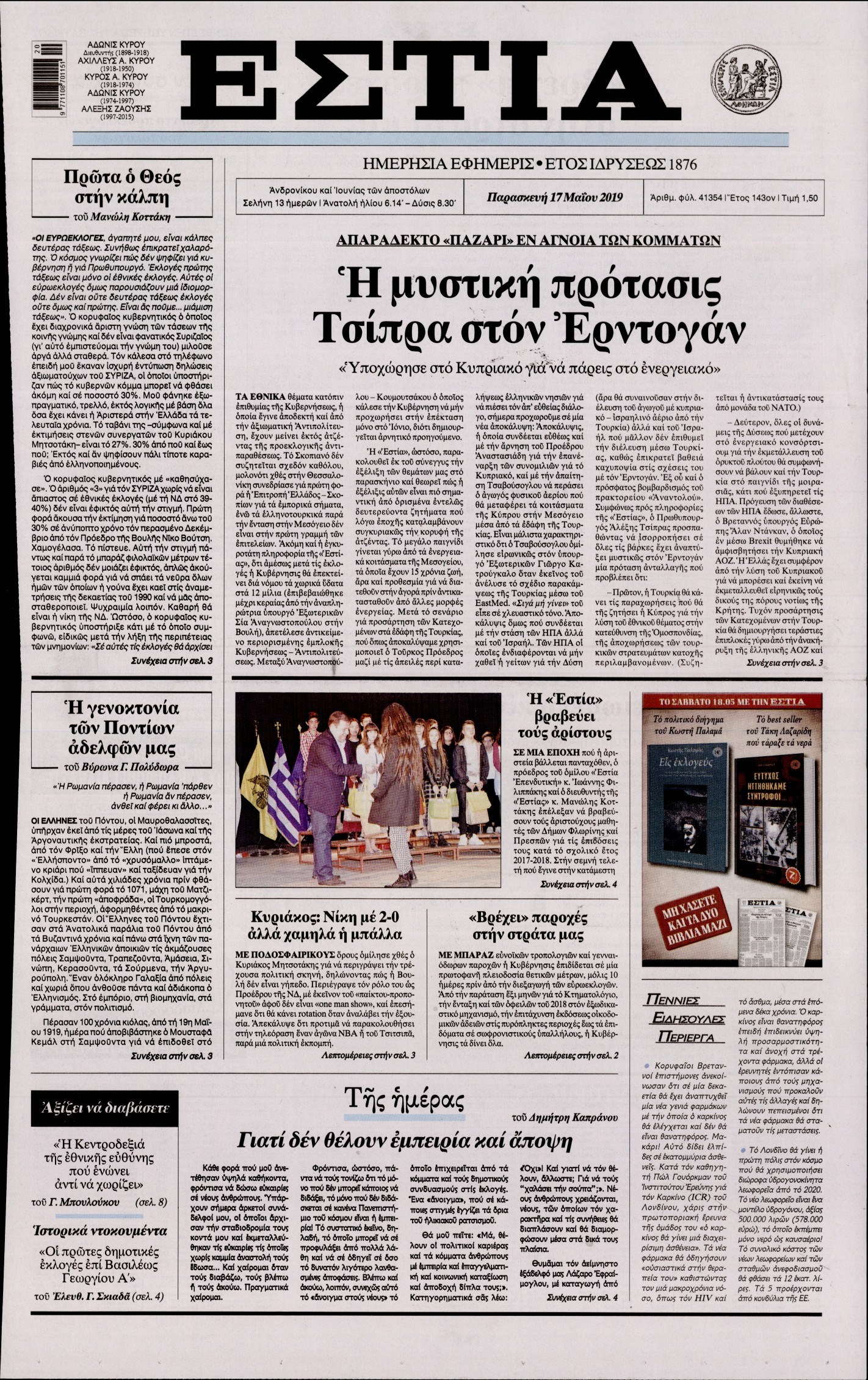 Οι πολιτικές εφημερίδες 17/5/2019 Enikos Newsroom 06:52, Παρασκευή 17 Μαΐου 2019 Media Διαβάστε τα πρωτοσέλιδα των πολιτικών εφημερίδων: ΠΟΛΙΤΙΚΕΣ ΕΦΗΜΕΡΙΔΕΣ ΠΡΩΤΟΣΕΛΙΔΑ Μοιράσου το: σχολίασε κι εσύ (0 σχόλια) Ακολουθήστε το enikos.gr στο Google News και μάθετε πρώτοι όλες τις ειδήσεις Δείτε όλες τις τελευταίες ειδήσεις από την Ελλάδα και τον Κόσμο στο enikos.gr Ειδήσεις Ροή Ειδήσεων 5 ώρες πριν Θετικοί οι αγρότες στη νέα πρόσκληση για διάλογο με τον Πρωθυπουργό – Αποφασίζουν την Παρασκευή εάν θα «σπάσουν» τον 48ωρο αποκλεισμό 5 ώρες πριν Πάτρα: Την Παρασκευή οι απολογίες των 4 εμπλεκομένων για τον θανάσιμο ξυλοδαρμό του 30χρονου – Το ξέσπασμα της μητέρας του θύματος και το βίντεο-σοκ 5 ώρες πριν Μινεάπολη: Η εκτέλεση της 37χρονης Ρενέ Γκουντ αποκαλύπτει δύο εντελώς αντίθετες διαχωριστικές γραμμές στην αμερικανική πολιτική 7 ώρες πριν Κύπρος: Πολιτικές αντιδράσεις μετά την διαρροή του βίντεο με «χρηματοδοτήσεις» και «επενδυτές» – Κυβέρνηση: Υβριδική επίθεση με κακόβουλο μοντάζ 2 ώρες πριν Χρήστος Πολίτης: Το πραγματικό του όνομα, η καριέρα και το… φαινόμενο «Γιάγκος Δράκος» 7 ώρες πριν Αριθμολογία 2026: Οι άτυχοι μήνες της χρονιάς, με βάση την ημερομηνία γέννησής σας 8 ώρες πριν Περιορίστε τη σκόνη στο σπίτι σας με μια απλή και οικονομική λύση – Ο ρόλος της υγρασίας 6 ώρες πριν Ύπνος: Δυσκολεύεστε να κοιμηθείτε; Γιατρός μοιράζεται ένα «μυστικό» συστατικό που βοηθάει στη χαλάρωση 5 ώρες πριν Ανακαλύφθηκε εντυπωσιακός τάφος 1.300 ετών – Τα τεχνουργήματα που περιείχε ρίχνουν φως στη ζωή των ελίτ της δυναστείας Τανγκ 28 λεπτά πριν Eurovision 2026: Η Tianora που διαγωνιστεί στον Εθνικό τελικό, αποκαλύπτει – «Έχω σπουδάσει βυζαντινή μουσική, το τραγούδι που έστειλα έχει μέσα το στοιχείο της Ελλάδας» 44 λεπτά πριν Συρία: Έκκληση του απεσταλμένου των ΗΠΑ για αποκλιμάκωση των συγκρούσεων στο Χαλέπι 58 λεπτά πριν Ιωάννα Μαλέσκου: «Δεν θα επιτρέψω σε κανέναν να εισβάλλει με το έτσι θέλω στο σπίτι μου και στη ζωή μου» 1 ώρα πριν Μάκης Δελαπόρτας: Ξέρω πράγματα για τη Ρένα Παγκράτη που δεν τα ‘χω πει ποτέ 1 ώρα πριν Φιλιππίνες: Ένας νεκρός και 27 αγνοούμενοι από κατάρρευση εγκατάστασης απορριμμάτων ENIKOS NETWORK Γιατί κάποιοι κρεμάνε φύλλα δάφνης στην πόρτα της κρεβατοκάμαρας; Το μυστικό για καλύτερο ύπνο ΠΟΕΔΗΝ: Σήμα κινδύνου εκπέμπει η Πνευμονολογική Κλινική του Νοσοκομείου Άρτας ΣΑΤΑ: 48ωρη απεργία για τις 13 και 14 Ιανουαρίου αποφάσισαν οι αυτοκινητιστές των ταξί στην Αττική ΔΥΠΑ: Αρχίζει η υποβολή προγραμμάτων κατάρτισης για άνεργους δικαιούχους του Ελάχιστου Εγγυημένου Εισοδήματος – Όλες οι λεπ... Ο Google Assistant θα παραμείνει λίγο περισσότερο για ορισμένους χρήστες Android Τεστ προσωπικότητας: Το βάζο που θα επιλέξετε αποκαλύπτει πώς λύνετε προβλήματα στη ζωή σας περισσότερα 18:15 , Πέμπτη 08 Ιανουαρίου 2026 Άγιος Έρωτας: Ο πατήρ Νικόλαος σώζει τη μικρή Ελευθερία και ο Παύλος παθαίνει καρδιακή προσβολή – Καθηλώνουν τα επόμενα επεισόδια Η αγαπημένη δραματική σειρά “Άγιος ‘Ερωτας” επιστρέφει στις οθόνες μας με νέ... 17:43 , Πέμπτη 08 Ιανουαρίου 2026 Οι Αθώοι: Η μουσική της μεγάλης παραγωγής του Mega – Νέο lyrics video Η σειρά εποχής, που έχει ήδη κλέψει τις εντυπώσεις από τις πρώτες κιόλας εικόνες των τρέιλερ π... 17:04 , Πέμπτη 08 Ιανουαρίου 2026 Νέα δυναμική διεθνής επένδυση του Θοδωρή Κυριακού στις ΗΠΑ Ο Πρόεδρος του Ομίλου Antenna, Θοδωρής Κυριακού, συνεχίζει να ενισχύει δυναμικά την παγκόσμια ... 12:40 , Πέμπτη 08 Ιανουαρίου 2026 Ακού
