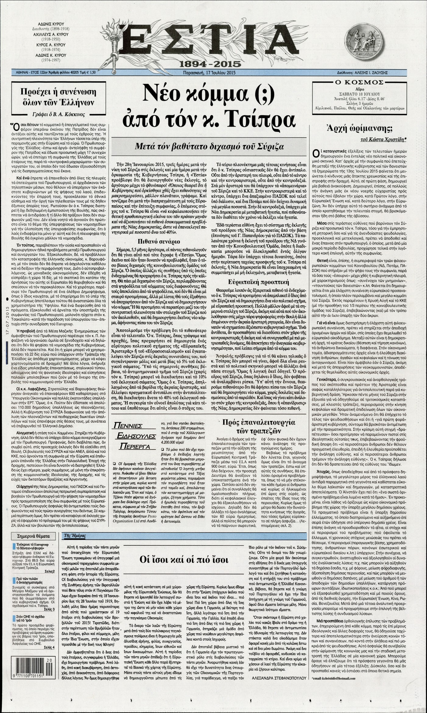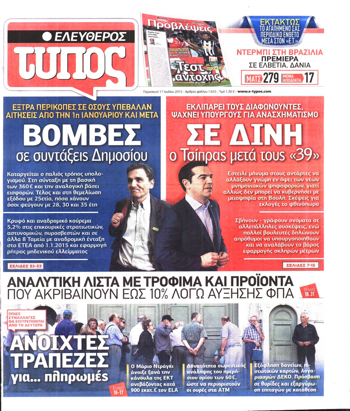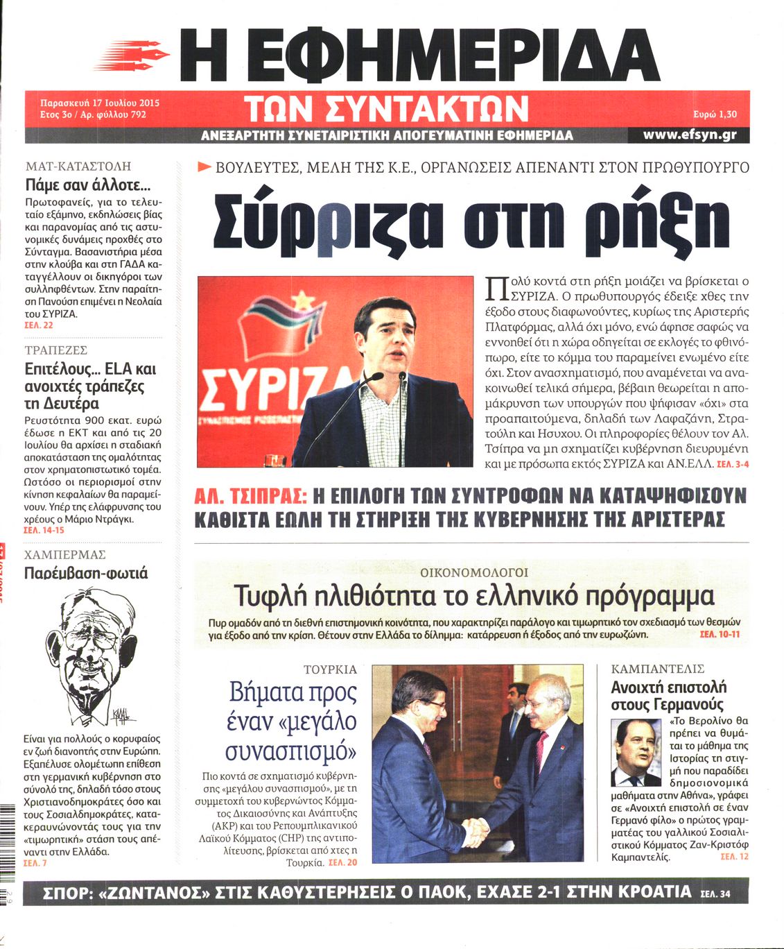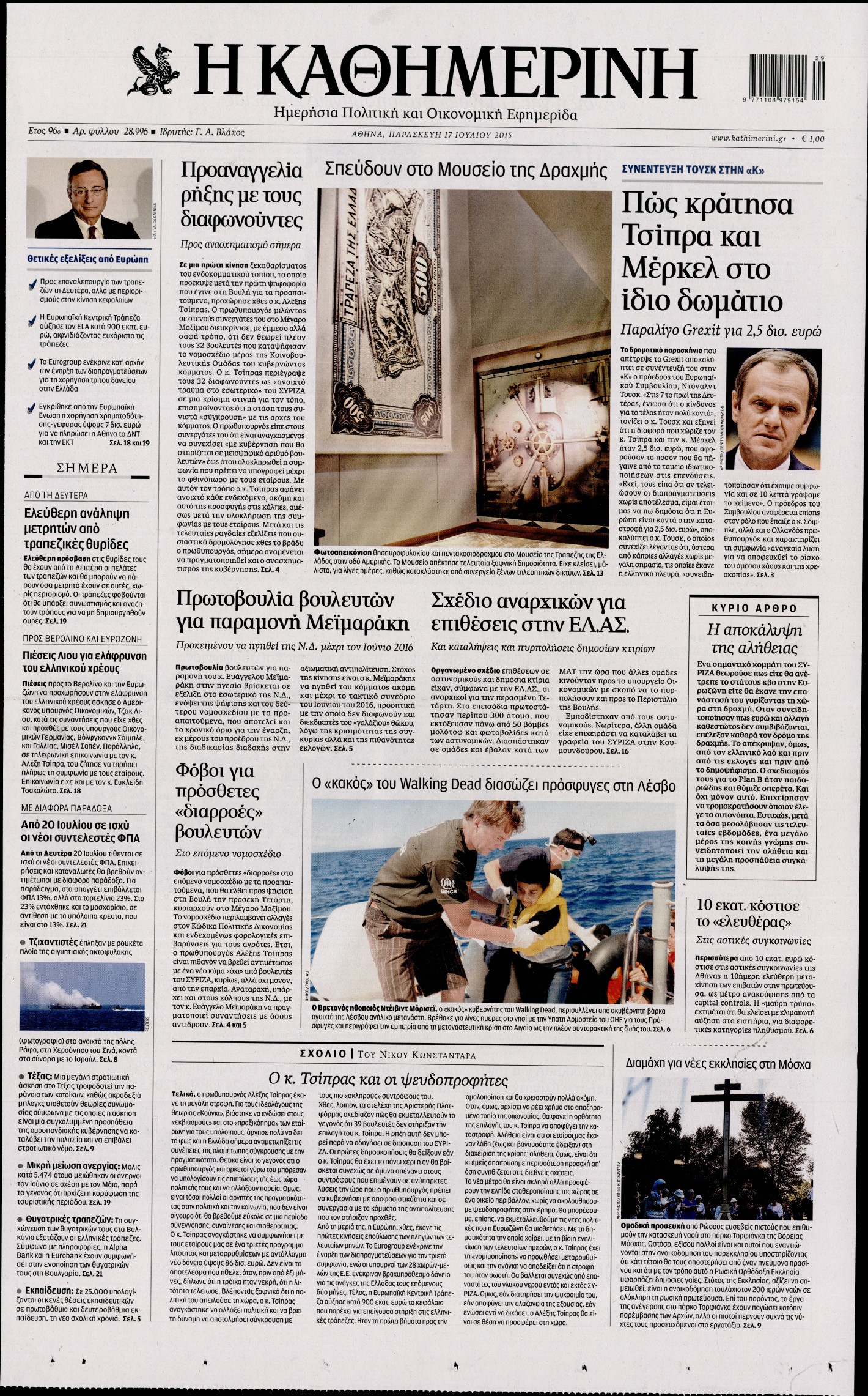 Οι πολιτικές εφημερίδες 17/7/2015 Enikos Newsroom 06:46, Παρασκευή 17 Ιουλίου 2015 Media Διαβάστε τα σημερινά πρωτοσέλιδα των πολιτικών εφημερίδων: ΠΟΛΙΤΙΚΕΣ ΕΦΗΜΕΡΙΔΕΣ ΠΡΩΤΟΣΕΛΙΔΑ Μοιράσου το: σχολίασε κι εσύ (0 σχόλια) Ακολουθήστε το enikos.gr στο Google News και μάθετε πρώτοι όλες τις ειδήσεις Δείτε όλες τις τελευταίες ειδήσεις από την Ελλάδα και τον Κόσμο στο enikos.gr Ειδήσεις Ροή Ειδήσεων 4 ώρες πριν Χριστούγεννα στα μπλόκα: Επιμένουν στις κινητοποιήσεις τους οι αγρότες – Ανοίγουν τα διόδια το Σαββατοκύριακο 4 ώρες πριν Ουκρανία: Η άνευ προηγουμένου επίθεση σε ρωσικό τάνκερ στη Μεσόγειο και το μήνυμα προς στον Πούτιν – Το «μακρύ χέρι» του Κιέβου 3 ώρες πριν Πούτιν: Τα μηνύματα σε Ευρώπη και ΝΑΤΟ από το μαραθώνιο «σόου» του – Η απαίτηση για «σεβασμό» και η ειρήνη «με τους όρους» της Μόσχας 4 ώρες πριν Τραμπ: Δεν αποκλείει την πιθανότητα ενός πολέμου στη Βενεζουέλα – «Ο Μαδούρο ξέρει καλύτερα από τον καθένα τι ακριβώς θέλω» 5 ώρες πριν Συνεχίζει να προκαλεί ο Μίτσκοσκι: «Για μένα το όνομα Μακεδονία είναι ιερό» 3 ώρες πριν Ανακαλύφθηκαν αρχαία χρυσά νομίσματα 2.200 ετών που απεικονίζουν τον θεό Απόλλωνα – Η άγνωστη σύνδεση με τον Φίλιππο Β΄ της Μακεδονίας 4 ώρες πριν Ύπνος: Μια κρυφή κατάσταση του εγκεφάλου πριν από τον ύπνο μπορεί να είναι το “κλειδί” για υψηλή ευφυΐα και δημιουργικότητα 5 ώρες πριν Αριθμολογία: Οι άνθρωποι που έχουν γεννηθεί αυτές τις 4 ημερομηνίες, συχνά παρεξηγούνται – «Η καλοσύνη τους κρύβει τεράστια δύναμη» 6 ώρες πριν Ξεχάστε το καθάρισμα το Σαββατοκύριακο: Ο «κανόνας των 20 λεπτών» που θα σας λύσει τα χέρια 16 λεπτά πριν Εξάρχεια: Ένταση με μολότοφ, χημικά και κρότου λάμψης 31 λεπτά πριν ΗΠΑ: Τραγωδία στην Αλαμπάμα – Σκότωσε την δημοσιογράφο σύζυγό του και αυτοκτόνησε μπροστά στον 3χρονο γιο τους 46 λεπτά πριν Πρόταση γάμου στο ΣΕΦ κατά την διάρκεια του αγώνα Ολυμπιακός-Βιλερμπάν – Δείτε βίντεο 1 ώρα πριν Euroleague: Επέστρεψε στις νίκες ο Ολυμπιακός, πήρε την ματσάρα της χρονιάς η Μπάρτσα – Τα αποτελέσματα και η βαθμολογία 1 ώρα πριν Συρία: Μαζικά πλήγματα των ΗΠΑ σε θέσεις του Ισλαμικού Κράτους – Χέγκσεθ: «Δεν είναι αρχή πολέμου, είναι μια δήλωση εκδίκησης» για το θάνατο των στρατιωτών μας ENIKOS NETWORK Το ΕΚΑΒ τιμήθηκε από την Ακαδημία Αθηνών για τα 40 χρόνια προσφοράς του Έχετε πραγματικά μεγάλη καρδιά; 10 χαρακτηριστικά όσων έχουν καλοσύνη Αναστολή μέτρων αναγκαστικής εκτέλεσης για κτηνοτρόφους που πλήττονται από την ευλογιά των αιγοπροβάτων Πλήρης επάρκεια προϊόντων στις λαϊκές της Αττικής, παρά τις αγροτικές κινητοποιήσεις – Τι απαντούν οι πωλητές Χαρτογραφώντας το «σημείο χωρίς επιστροφή»: Για πρώτη φορά αποκαλύπτεται με λεπτομέρεια το ακανθώδες όριο της ατμόσφαιρας τ... Η Google καταργεί τη λειτουργία «dark web report» – Πώς θα μπορούν οι χρήστες να διαγράφουν τα δεδομένα τους περισσότερα 22:42 , Παρασκευή 19 Δεκεμβρίου 2025 Γιώργος Γιαννόπουλος για “Το σόι σου”: “Είναι ευτυχία και ευλογία αυτή η σειρά” «Είναι ευτυχία και ευλογία η συγκυρία αυτής της σειράς», θα πει ο Γιώργος Γιαννόπουλος -ο αγαπ... 20:37 , Παρασκευή 19 Δεκεμβρίου 2025 Don’t Forget The Lyrics: Η Έλλη Κοκκίνου υποδέχεται 4 παίκτες που θα κάνουν τα πάντα για να μη χάσουν ούτε… μισή λέξη από τους στίχους Το «Don’t Forget The Lyrics» επιστρέφει απόψε, Παρασκευή 19 Δεκεμβρίου, στις 21:00 με νέο επει... 19:31 , Παρασκευή 19 Δεκεμβρίου 2025 GNTM: Απόψε ο μεγάλος τελικός για τους 4 φιναλίστ Έπειτα από μήνες γεμάτους μόδα, δημιουργία και έν