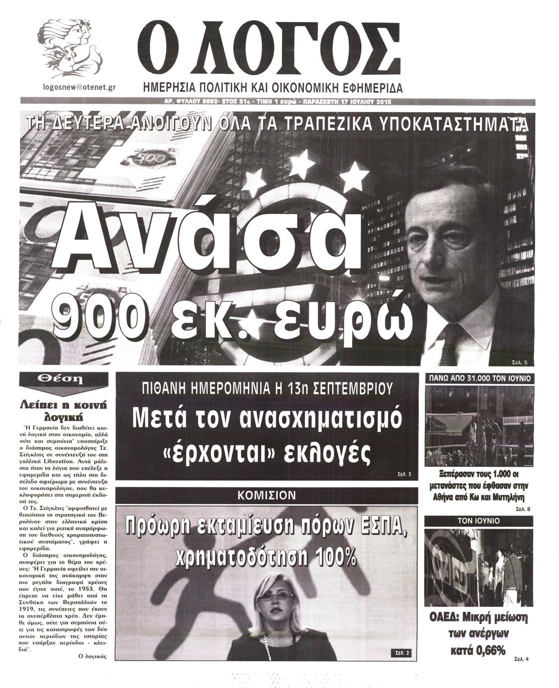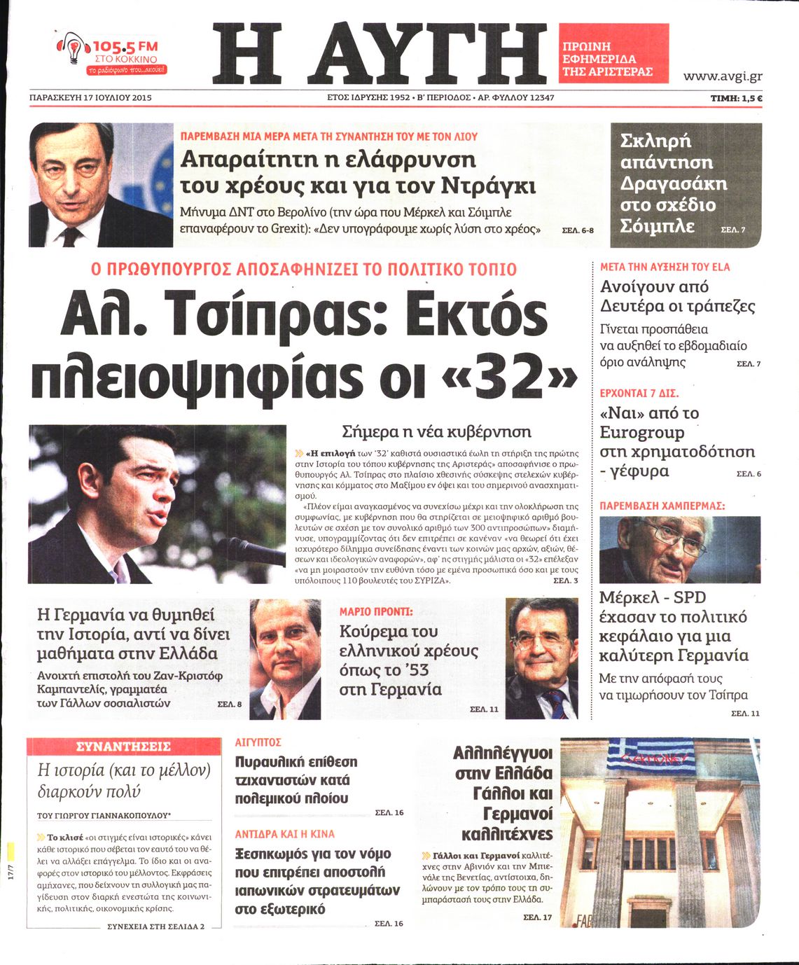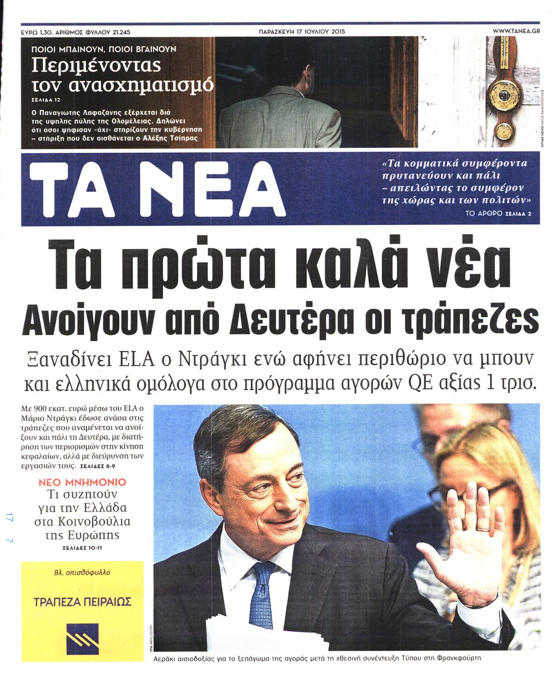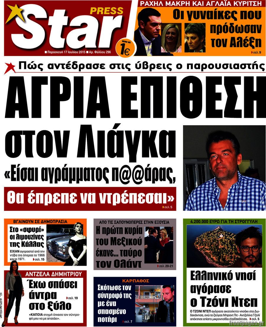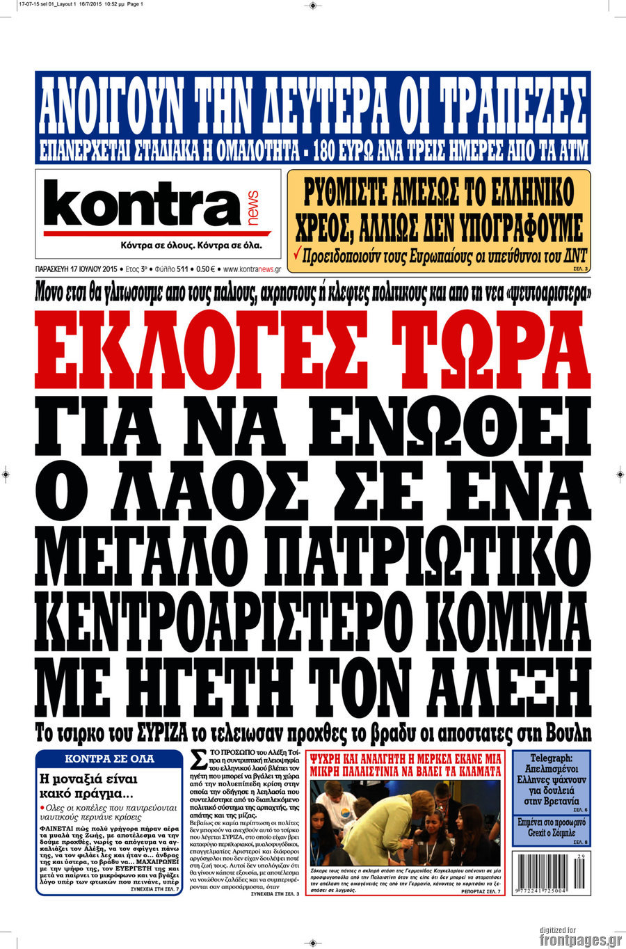 Οι πολιτικές εφημερίδες 17/7/2015 Enikos Newsroom 06:46, Παρασκευή 17 Ιουλίου 2015 Media Διαβάστε τα σημερινά πρωτοσέλιδα των πολιτικών εφημερίδων: ΠΟΛΙΤΙΚΕΣ ΕΦΗΜΕΡΙΔΕΣ ΠΡΩΤΟΣΕΛΙΔΑ Μοιράσου το: σχολίασε κι εσύ (0 σχόλια) Ακολουθήστε το enikos.gr στο Google News και μάθετε πρώτοι όλες τις ειδήσεις Δείτε όλες τις τελευταίες ειδήσεις από την Ελλάδα και τον Κόσμο στο enikos.gr Ειδήσεις Ροή Ειδήσεων 4 ώρες πριν Χριστούγεννα στα μπλόκα: Επιμένουν στις κινητοποιήσεις τους οι αγρότες – Ανοίγουν τα διόδια το Σαββατοκύριακο 4 ώρες πριν Ουκρανία: Η άνευ προηγουμένου επίθεση σε ρωσικό τάνκερ στη Μεσόγειο και το μήνυμα προς στον Πούτιν – Το «μακρύ χέρι» του Κιέβου 3 ώρες πριν Πούτιν: Τα μηνύματα σε Ευρώπη και ΝΑΤΟ από το μαραθώνιο «σόου» του – Η απαίτηση για «σεβασμό» και η ειρήνη «με τους όρους» της Μόσχας 4 ώρες πριν Τραμπ: Δεν αποκλείει την πιθανότητα ενός πολέμου στη Βενεζουέλα – «Ο Μαδούρο ξέρει καλύτερα από τον καθένα τι ακριβώς θέλω» 5 ώρες πριν Συνεχίζει να προκαλεί ο Μίτσκοσκι: «Για μένα το όνομα Μακεδονία είναι ιερό» 3 ώρες πριν Ανακαλύφθηκαν αρχαία χρυσά νομίσματα 2.200 ετών που απεικονίζουν τον θεό Απόλλωνα – Η άγνωστη σύνδεση με τον Φίλιππο Β΄ της Μακεδονίας 4 ώρες πριν Ύπνος: Μια κρυφή κατάσταση του εγκεφάλου πριν από τον ύπνο μπορεί να είναι το “κλειδί” για υψηλή ευφυΐα και δημιουργικότητα 5 ώρες πριν Αριθμολογία: Οι άνθρωποι που έχουν γεννηθεί αυτές τις 4 ημερομηνίες, συχνά παρεξηγούνται – «Η καλοσύνη τους κρύβει τεράστια δύναμη» 6 ώρες πριν Ξεχάστε το καθάρισμα το Σαββατοκύριακο: Ο «κανόνας των 20 λεπτών» που θα σας λύσει τα χέρια 16 λεπτά πριν Εξάρχεια: Ένταση με μολότοφ, χημικά και κρότου λάμψης 31 λεπτά πριν ΗΠΑ: Τραγωδία στην Αλαμπάμα – Σκότωσε την δημοσιογράφο σύζυγό του και αυτοκτόνησε μπροστά στον 3χρονο γιο τους 46 λεπτά πριν Πρόταση γάμου στο ΣΕΦ κατά την διάρκεια του αγώνα Ολυμπιακός-Βιλερμπάν – Δείτε βίντεο 1 ώρα πριν Euroleague: Επέστρεψε στις νίκες ο Ολυμπιακός, πήρε την ματσάρα της χρονιάς η Μπάρτσα – Τα αποτελέσματα και η βαθμολογία 1 ώρα πριν Συρία: Μαζικά πλήγματα των ΗΠΑ σε θέσεις του Ισλαμικού Κράτους – Χέγκσεθ: «Δεν είναι αρχή πολέμου, είναι μια δήλωση εκδίκησης» για το θάνατο των στρατιωτών μας ENIKOS NETWORK Το ΕΚΑΒ τιμήθηκε από την Ακαδημία Αθηνών για τα 40 χρόνια προσφοράς του Έχετε πραγματικά μεγάλη καρδιά; 10 χαρακτηριστικά όσων έχουν καλοσύνη Αναστολή μέτρων αναγκαστικής εκτέλεσης για κτηνοτρόφους που πλήττονται από την ευλογιά των αιγοπροβάτων Πλήρης επάρκεια προϊόντων στις λαϊκές της Αττικής, παρά τις αγροτικές κινητοποιήσεις – Τι απαντούν οι πωλητές Χαρτογραφώντας το «σημείο χωρίς επιστροφή»: Για πρώτη φορά αποκαλύπτεται με λεπτομέρεια το ακανθώδες όριο της ατμόσφαιρας τ... Η Google καταργεί τη λειτουργία «dark web report» – Πώς θα μπορούν οι χρήστες να διαγράφουν τα δεδομένα τους περισσότερα 22:42 , Παρασκευή 19 Δεκεμβρίου 2025 Γιώργος Γιαννόπουλος για “Το σόι σου”: “Είναι ευτυχία και ευλογία αυτή η σειρά” «Είναι ευτυχία και ευλογία η συγκυρία αυτής της σειράς», θα πει ο Γιώργος Γιαννόπουλος -ο αγαπ... 20:37 , Παρασκευή 19 Δεκεμβρίου 2025 Don’t Forget The Lyrics: Η Έλλη Κοκκίνου υποδέχεται 4 παίκτες που θα κάνουν τα πάντα για να μη χάσουν ούτε… μισή λέξη από τους στίχους Το «Don’t Forget The Lyrics» επιστρέφει απόψε, Παρασκευή 19 Δεκεμβρίου, στις 21:00 με νέο επει... 19:31 , Παρασκευή 19 Δεκεμβρίου 2025 GNTM: Απόψε ο μεγάλος τελικός για τους 4 φιναλίστ Έπειτα από μήνες γεμάτους μόδα, δημιουργία και έν