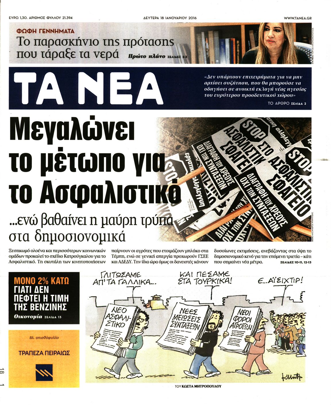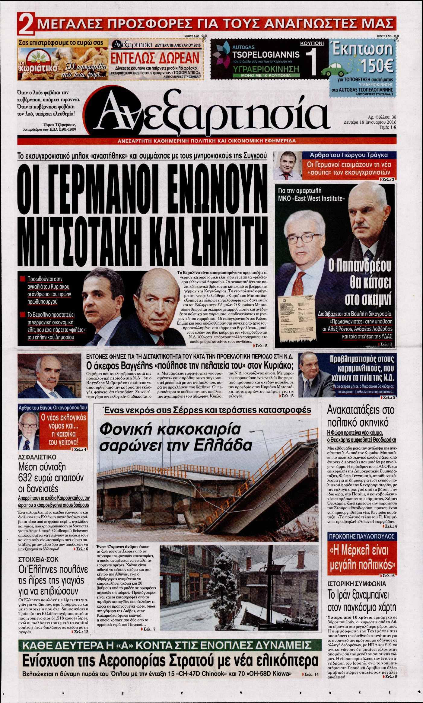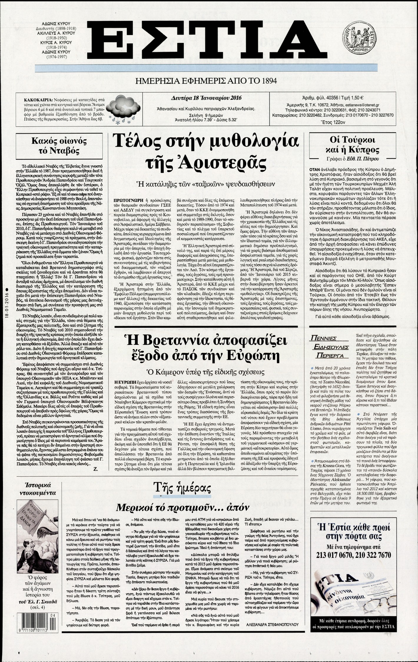 Οι πολιτικές εφημερίδες 18/1/2016 Enikos Newsroom 06:30, Δευτέρα 18 Ιανουαρίου 2016 Media Διαβάστε τα σημερινά πρωτοσέλιδα των πολιτικών εφημερίδων. ΕΦΗΜΕΡΙΔΕΣ ΠΟΛΙΤΙΚΕΣ ΕΦΗΜΕΡΙΔΕΣ Μοιράσου το: σχολίασε κι εσύ (0 σχόλια) Ακολουθήστε το enikos.gr στο Google News και μάθετε πρώτοι όλες τις ειδήσεις Δείτε όλες τις τελευταίες ειδήσεις από την Ελλάδα και τον Κόσμο στο enikos.gr Ειδήσεις Ροή Ειδήσεων 2 ώρες πριν Μπλόκα: Οι αγρότες σηκώνουν τις μπάρες σε διόδια για τους εκδρομείς των Χριστουγέννων και μοιράζουν προϊόντα – Βίντεο 2 ώρες πριν Τσιάρας προς αγρότες: Τα μπλόκα και τα πείσματα δεν ωφελούν – Οι λύσεις περνούν μέσα από τον διάλογο 3 ώρες πριν Αρχεία Έπσταϊν: Οι συγκλονιστικές φωτογραφίες – Ο Μάικλ Τζάκσον, ο Μικ Τζάγκερ και ο Κέβιν Σπέισι ανάμεσα στους διάσημους που απεικονίζονται 60 λεπτά πριν Μαθητές διακινούσαν κοκαΐνη και χασίς σε σχολείο της Αττικής – 12 συλλήψεις 1 ώρα πριν Βέλγιο: Άγνωστοι έριξαν κόκκινη μπογιά στο προξενείο της Πολωνίας στις Βρυξέλλες 5 ώρες πριν Μία νέα «χρυσή» περίοδος αρχίζει για 3 ζώδια από σήμερα – «Μία αναπάντεχη ευκαιρία οδηγεί στην επιτυχία» 4 ώρες πριν Διαιτολόγος αποκαλύπτει 9 πρωινές συνήθειες που «λιώνουν» το κοιλιακό λίπος – «Υποστηρίζουν την υγιεινή απώλεια βάρους» 5 ώρες πριν Οι 7 φράσεις που δεν λένε ποτέ οι συναισθηματικά έξυπνοι άνθρωποι κατά τη διάρκεια ενός καβγά 7 ώρες πριν Enerwave: Το νέο «ρεύμα» στη λιανική ενέργειας που αλλάζει την εμπειρία του καταναλωτή 8 λεπτά πριν Μαρινάκης στον Realfm 97,8: Η κυβέρνηση σέβεται κάθε λογική διεκδίκηση των αγροτών, αλλά και το αίτημα των πολιτών να μην ταλαιπωρούνται 15 λεπτά πριν O Πάντερ MVP της 17ης αγωνιστικής στην Euroleague 23 λεπτά πριν Πέθανε η τραγουδίστρια Κλαούντια Ντελμέρ 31 λεπτά πριν Μία ανεκμετάλλευτη πηγή θα μπορούσε να προσφέρει ανεξάντλητη ενέργεια – Οι επιστήμονες ίσως γνωρίζουν πώς να την ξεκλειδώσουν 39 λεπτά πριν Θεσσαλονίκη: Ανήλικος που είχε εξαφανιστεί βρέθηκε στο σπίτι Τούρκων μετά από αστυνομική επιχείρηση ENIKOS NETWORK Η αποχή από την αναπαραγωγή παρατείνει τη ζωή στα ζώα, σύμφωνα με μελέτη – Τι ισχύει για τους ανθρώπους; Σημαντικές επαφές στις ΗΠΑ είχε ο υπουργός Υγείας Άδωνις Γεωργιάδης Ευλογιά αιγοπροβάτων: Παρατεταμένη επιζωοτία, αυστηρά μέτρα – Τι ισχύει για τον εμβολιασμό και την ανασύσταση του ζωικού κε... Τσιάρας προς αγρότες: Έχει ικανοποιηθεί το 74% των αιτημάτων – Τα μπλόκα και τα πείσματα δεν ωφελούν Χαρτογραφώντας το «σημείο χωρίς επιστροφή»: Για πρώτη φορά αποκαλύπτεται με λεπτομέρεια το ακανθώδες όριο της ατμόσφαιρας τ... Η Google καταργεί τη λειτουργία «dark web report» – Πώς θα μπορούν οι χρήστες να διαγράφουν τα δεδομένα τους περισσότερα 14:04 , Σάββατο 20 Δεκεμβρίου 2025 Η Realnews αυτής της Κυριακής (21/12/2025) Με τίτλο: «Ασπίδα προστασίας για την Ελλάδα» κυκλοφορεί, αυτήν την Κυριακή, η Realnews. Σημαντ... 12:53 , Σάββατο 20 Δεκεμβρίου 2025 Να μ’ αγαπάς: Το παρελθόν έρχεται στο φως – Καταιγιστικές εξελίξεις στα τελευταία επεισόδια του 2025 Ο Άγγελος αποκαλύπτεται, η Φωτεινή ανησυχεί για τον Λευτέρη και η Ζωή έρχεται αντιμέτωπη με το... 11:41 , Σάββατο 20 Δεκεμβρίου 2025 «Η αγάπη δεν χάνεται ποτέ»: Η μικρού μήκους ταινία κινουμένων σχεδίων που θέτει ερωτήματα για τη ζωή και τον θάνατο Ο θάνατος είναι ένα από τα πιο σκληρά θέματα που καλείται να διαχειριστεί κάποιος στη διάρκεια... 09:30 , Σάββατο 20 Δεκεμβρίου 2025 «Porto Leone: Στη γειτονιά με τα κόκκινα φανάρια» – Ο Χρόνης αποκαλύπτει στην Αλεξάνδρα το μυστικ