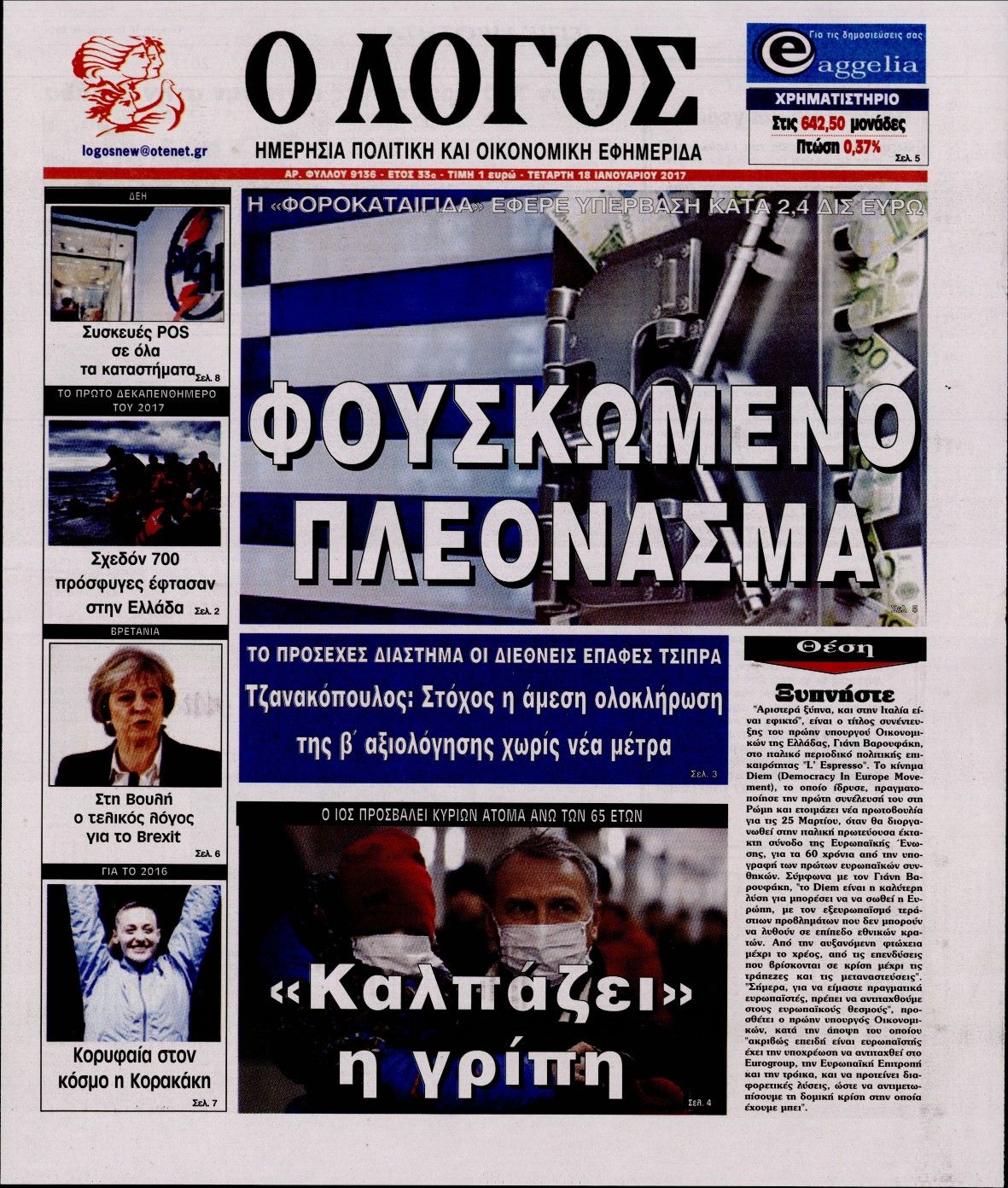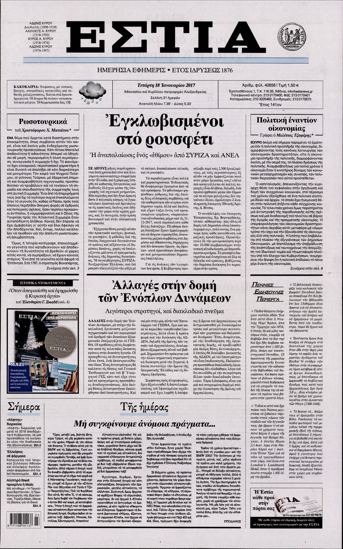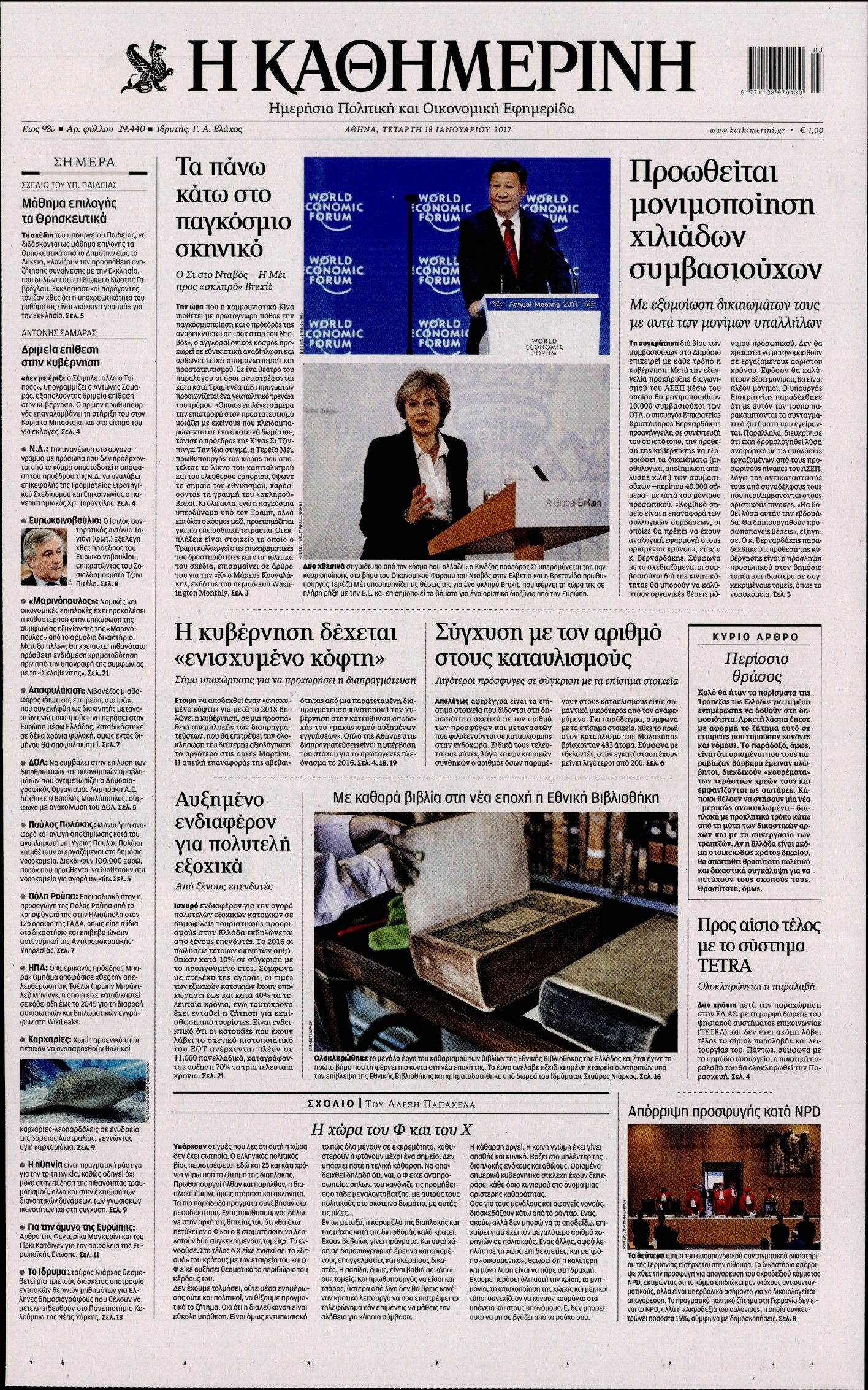 Οι πολιτικές εφημερίδες 18/1/2017 Enikos Newsroom 02:15, Τετάρτη 18 Ιανουαρίου 2017 Media Διαβάστε τα σημερινά πρωτοσέλιδα των πολιτικών εφημερίδων: ΠΟΛΙΤΙΚΕΣ ΕΦΗΜΕΡΙΔΕΣ ΠΡΩΤΟΣΕΛΙΔΑ Μοιράσου το: σχολίασε κι εσύ (0 σχόλια) Ακολουθήστε το enikos.gr στο Google News και μάθετε πρώτοι όλες τις ειδήσεις Δείτε όλες τις τελευταίες ειδήσεις από την Ελλάδα και τον Κόσμο στο enikos.gr Ειδήσεις Ροή Ειδήσεων 4 ώρες πριν Πώς δρούσε το κύκλωμα που διακινούσε ναρκωτικά σε σχολεία – Υπέβαλαν σε βασανιστήρια όσους δεν τηρούσαν τους «κανόνες πειθαρχίας» 4 ώρες πριν Αγρότες: Γιορτές στα μπλόκα με ανοιχτά διόδια – Δικογραφία στα Ιωάννινα για το σήκωμα των μπαρών 4 ώρες πριν Ζελένσκι: Οι Αμερικανοί πρότειναν συνάντηση Ουκρανίας, ΗΠΑ, Ρωσίας στο Μαϊάμι 2 ώρες πριν Τραμπ: Πώς περνάει τις γιορτές των Χριστουγέννων – Τα δώρα που κάνει στα εγγόνια του 3 ώρες πριν Μικαέλα Μπέντχαους: Ο πρώτος άνθρωπος σε αναπηρικό αμαξίδιο που ταξίδεψε στο διάστημα – ΒΙΝΤΕΟ 5 ώρες πριν Η τύχη χαμογελά σε 3 ζώδια έως τις 28 Δεκεμβρίου – «Προσέξτε τις επιλογές σας και η επιμονή σας θα ανταμειφθεί» 6 ώρες πριν Μία ανεκμετάλλευτη πηγή θα μπορούσε να προσφέρει ανεξάντλητη ενέργεια – Οι επιστήμονες ίσως γνωρίζουν πώς να την ξεκλειδώσουν 2 ώρες πριν Μήπως οι γιορτές σας δεν είναι τόσο τέλειες; 7 χριστουγεννιάτικες συνήθειες που μαρτυρούν ότι μια οικογένεια είναι δυσλειτουργική 12 ώρες πριν Enerwave: Το νέο «ρεύμα» στη λιανική ενέργειας που αλλάζει την εμπειρία του καταναλωτή 9 λεπτά πριν Super League: Ο Σιαμπάνης «κατέβασε ρολά» και ο Βόλος νίκησε 1-0 τον Παναιτωλικό 18 λεπτά πριν Αυτή την Κυριακή με τη Realnews: Instyle, μαζί Drive και Realnews Geopolitics 20 λεπτά πριν Ο ΑΝΤ1 γεμίζει τις γιορτές με μουσική – Ποιους καλλιτέχνες θα απολαύσουμε 30 λεπτά πριν Πάπας Λέων: Όταν έχει αϋπνίες επενδύει παραγωγικά τον χρόνο του – Ποιο παιχνίδι παίζει στο κινητό 38 λεπτά πριν Πέθανε η σπουδαία αρχαιολόγος Λίλα Μαραγκού ENIKOS NETWORK Οι γυναίκες αποκαλύπτουν το πιο ελκυστικό πράγμα που μπορεί να κάνει ένας άνδρας Ομορφιά και αντιγήρανση: Ειδικοί μιλούν για συσκευές περιποίησης του δέρματος Πορτοκαλί τιμολόγια ρεύματος: Τα σημεία που πρέπει να προσέξουν οι καταναλωτές – Πότε θα εφαρμοστούν Θεοδωρικάκος: Εθνική στρατηγική για τους ημιαγωγούς – Πρώτο βήμα η χρηματοδότηση του πρώτου Κέντρου Ικανοτήτων, με 3,63 εκα... Χαρτογραφώντας το «σημείο χωρίς επιστροφή»: Για πρώτη φορά αποκαλύπτεται με λεπτομέρεια το ακανθώδες όριο της ατμόσφαιρας τ... Η Google καταργεί τη λειτουργία «dark web report» – Πώς θα μπορούν οι χρήστες να διαγράφουν τα δεδομένα τους περισσότερα 20:30 , Σάββατο 20 Δεκεμβρίου 2025 Αυτή την Κυριακή με τη Realnews: Instyle, μαζί Drive και Realnews Geopolitics Αυτή την Κυριακή με τη Realnews: Instyle, μαζί Drive και Realnews Geopolitics Instyle Η Άννα Ρ... 20:28 , Σάββατο 20 Δεκεμβρίου 2025 Ο ΑΝΤ1 γεμίζει τις γιορτές με μουσική – Ποιους καλλιτέχνες θα απολαύσουμε Φέτος στον ΑΝΤ1 γιορτάζουμε τις νύχτες μας παρέα με αγαπημένους καλλιτέχνες και μεγάλες μουσι... 18:19 , Σάββατο 20 Δεκεμβρίου 2025 HOTΕΛ ΕΛVIRA: Η Ελβίρα μαθαίνει πως ο Χάρι μένει κρυφά στο ξενοδοχείο του Παντελή Συνεχίζονται οι εκλογές για πρόεδρο, στο νέο επεισόδιο της κωμικής σειράς του MEGA, HOTΕΛ ΕΛVI... 14:04 , Σάββατο 20 Δεκεμβρίου 2025 Η Realnews αυτής της Κυριακής (21/12/2025) Με τίτλο: «Ασπίδα προστασίας για την Ελλάδα» κυκλοφορεί, αυτήν την Κυριακή, η Realnews. Σημαντ... ΤΕΛΕΥΤΑΙΕΣ ΕΙΔΗΣΕΙΣ 9 λεπτά πριν Super League: Ο Σιαμπάνης «κατέβασε ρολά» και ο Βόλος νίκησε... 18 λεπτά πριν Αυτή την Κυριακή με τη Real