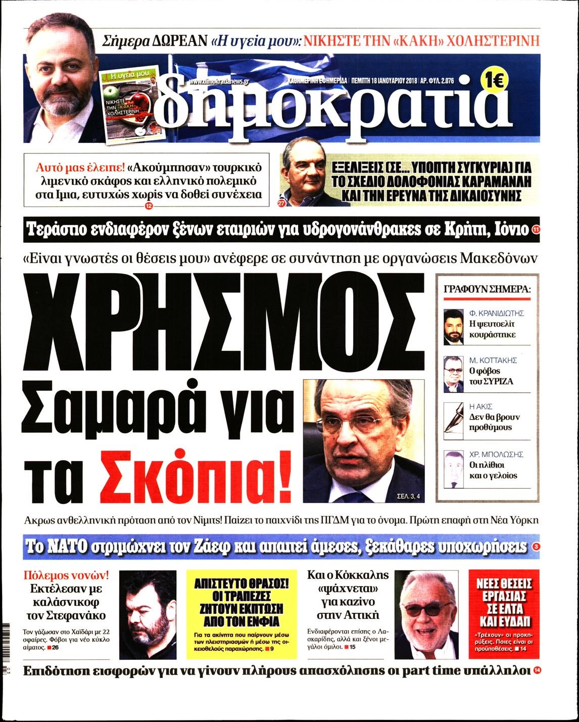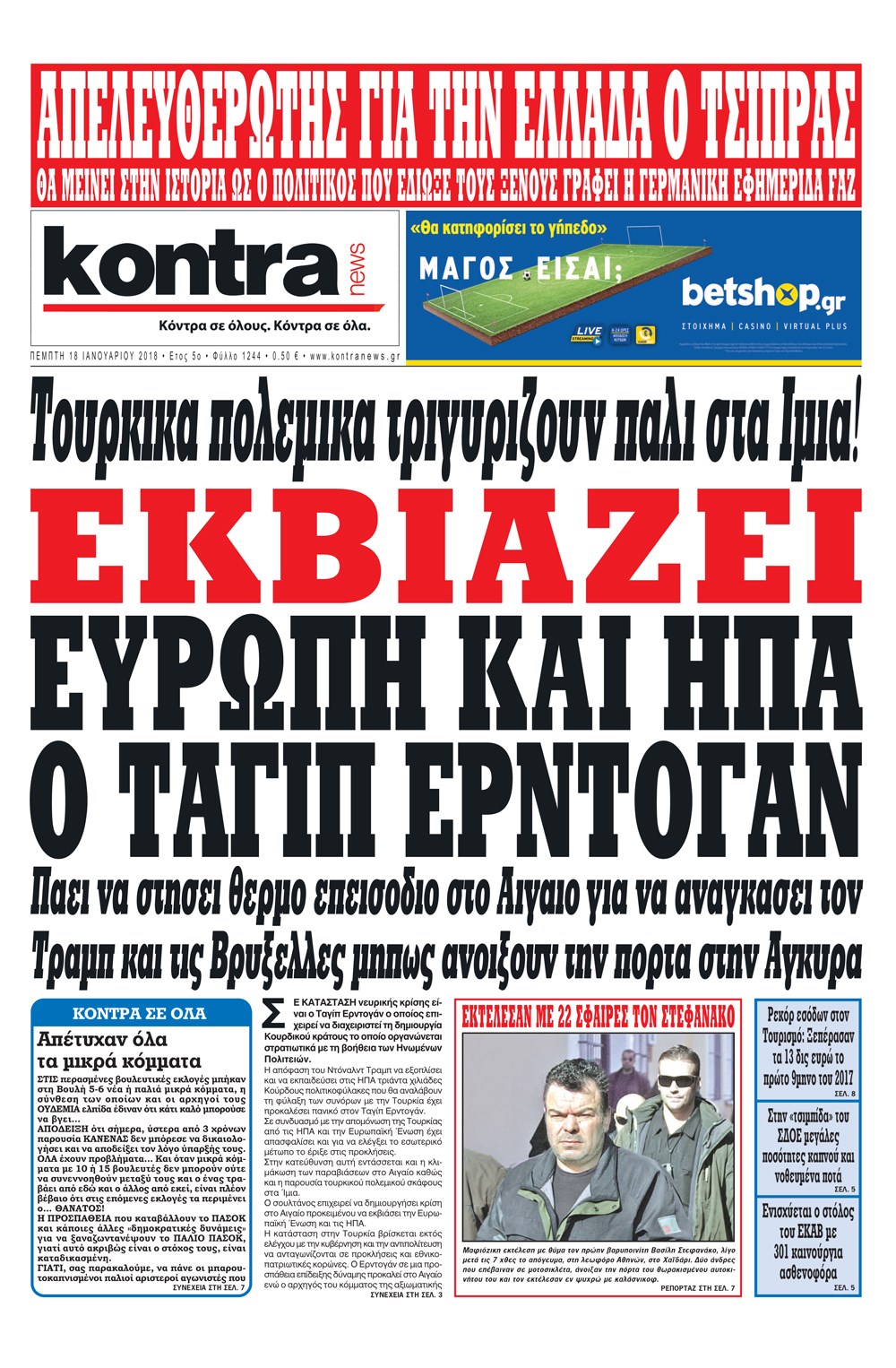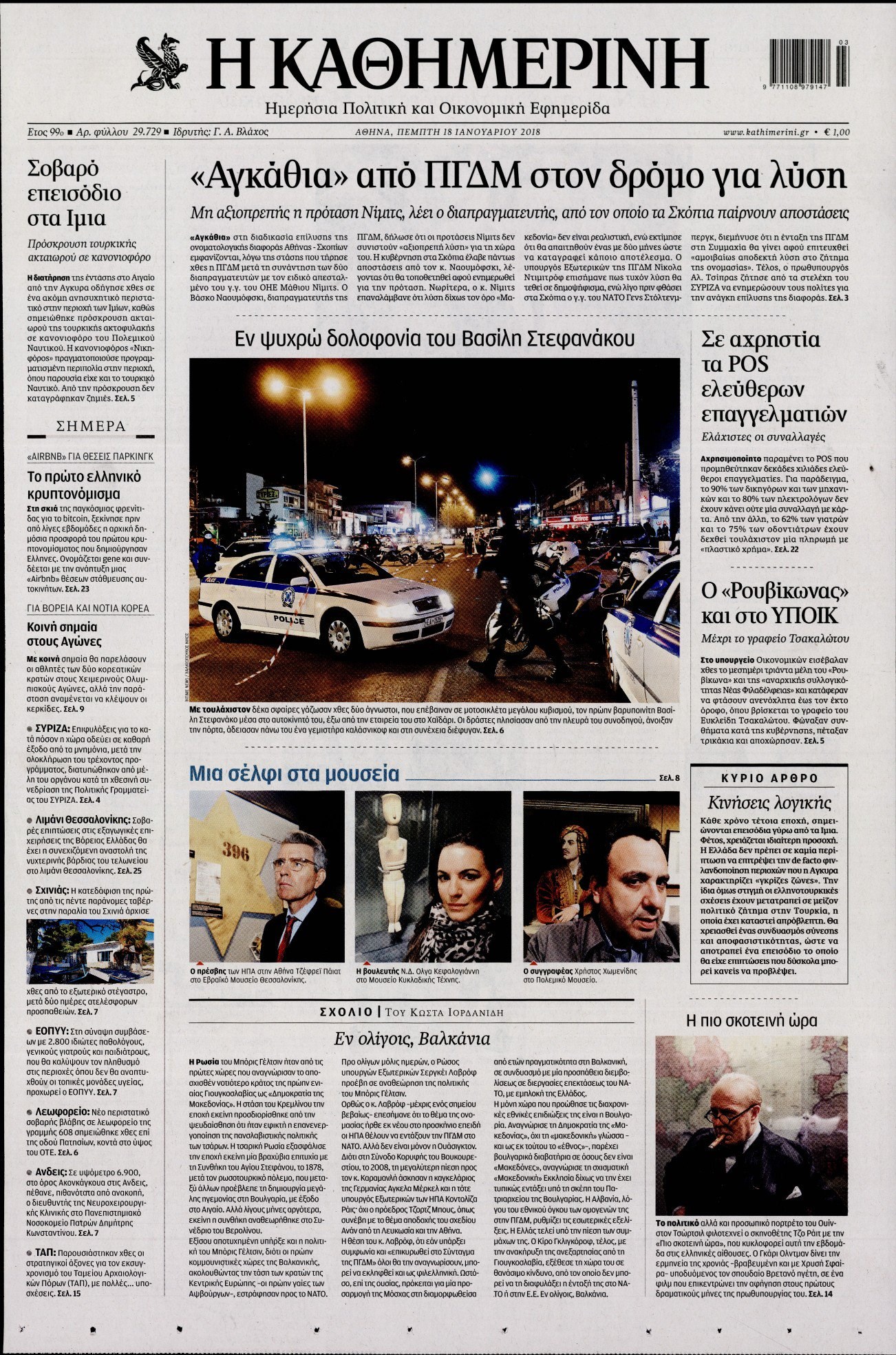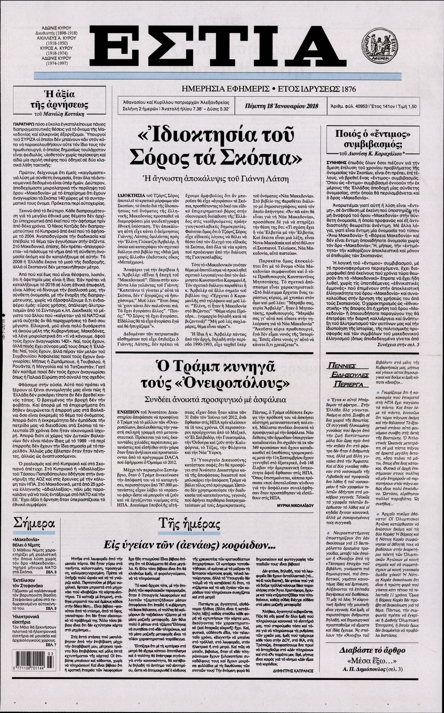 Οι πολιτικές εφημερίδες 18/1/2018 Enikos Newsroom 07:30, Πέμπτη 18 Ιανουαρίου 2018 Media Διαβάστε τα σημερινά πρωτοσέλιδα των πολιτικών εφημερίδων: ΠΟΛΙΤΙΚΕΣ ΕΦΗΜΕΡΙΔΕΣ ΠΡΩΤΟΣΕΛΙΔΑ Μοιράσου το: σχολίασε κι εσύ (0 σχόλια) Ακολουθήστε το enikos.gr στο Google News και μάθετε πρώτοι όλες τις ειδήσεις Δείτε όλες τις τελευταίες ειδήσεις από την Ελλάδα και τον Κόσμο στο enikos.gr Ειδήσεις Ροή Ειδήσεων 4 ώρες πριν Χριστούγεννα στα μπλόκα: Επιμένουν στις κινητοποιήσεις τους οι αγρότες – Ανοίγουν τα διόδια το Σαββατοκύριακο 4 ώρες πριν Ουκρανία: Η άνευ προηγουμένου επίθεση σε ρωσικό τάνκερ στη Μεσόγειο και το μήνυμα προς στον Πούτιν – Το «μακρύ χέρι» του Κιέβου 4 ώρες πριν Πούτιν: Τα μηνύματα σε Ευρώπη και ΝΑΤΟ από το μαραθώνιο «σόου» του – Η απαίτηση για «σεβασμό» και η ειρήνη «με τους όρους» της Μόσχας 4 ώρες πριν Τραμπ: Δεν αποκλείει την πιθανότητα ενός πολέμου στη Βενεζουέλα – «Ο Μαδούρο ξέρει καλύτερα από τον καθένα τι ακριβώς θέλω» 5 ώρες πριν Συνεχίζει να προκαλεί ο Μίτσκοσκι: «Για μένα το όνομα Μακεδονία είναι ιερό» 4 ώρες πριν Ανακαλύφθηκαν αρχαία χρυσά νομίσματα 2.200 ετών που απεικονίζουν τον θεό Απόλλωνα – Η άγνωστη σύνδεση με τον Φίλιππο Β΄ της Μακεδονίας 5 ώρες πριν Ύπνος: Μια κρυφή κατάσταση του εγκεφάλου πριν από τον ύπνο μπορεί να είναι το “κλειδί” για υψηλή ευφυΐα και δημιουργικότητα 6 ώρες πριν Αριθμολογία: Οι άνθρωποι που έχουν γεννηθεί αυτές τις 4 ημερομηνίες, συχνά παρεξηγούνται – «Η καλοσύνη τους κρύβει τεράστια δύναμη» 7 ώρες πριν Ξεχάστε το καθάρισμα το Σαββατοκύριακο: Ο «κανόνας των 20 λεπτών» που θα σας λύσει τα χέρια 7 λεπτά πριν Ντόναλντ Τραμπ: «Πολύ βαριά αντίποινα» στη Συρία – «Πλήττουμε πολύ δυνατά οχυρά του Ισλαμικού Κράτους» 21 λεπτά πριν Εξάρχεια: Ένταση με μολότοφ, χημικά και κρότου λάμψης 37 λεπτά πριν ΗΠΑ: Τραγωδία στην Αλαμπάμα – Σκότωσε την δημοσιογράφο σύζυγό του και αυτοκτόνησε μπροστά στον 3χρονο γιο τους 51 λεπτά πριν Πρόταση γάμου στο ΣΕΦ κατά την διάρκεια του αγώνα Ολυμπιακός-Βιλερμπάν – Δείτε βίντεο 1 ώρα πριν Euroleague: Επέστρεψε στις νίκες ο Ολυμπιακός, πήρε την ματσάρα της χρονιάς η Μπάρτσα – Τα αποτελέσματα και η βαθμολογία ENIKOS NETWORK Το ΕΚΑΒ τιμήθηκε από την Ακαδημία Αθηνών για τα 40 χρόνια προσφοράς του Έχετε πραγματικά μεγάλη καρδιά; 10 χαρακτηριστικά όσων έχουν καλοσύνη Αναστολή μέτρων αναγκαστικής εκτέλεσης για κτηνοτρόφους που πλήττονται από την ευλογιά των αιγοπροβάτων Πλήρης επάρκεια προϊόντων στις λαϊκές της Αττικής, παρά τις αγροτικές κινητοποιήσεις – Τι απαντούν οι πωλητές Χαρτογραφώντας το «σημείο χωρίς επιστροφή»: Για πρώτη φορά αποκαλύπτεται με λεπτομέρεια το ακανθώδες όριο της ατμόσφαιρας τ... Η Google καταργεί τη λειτουργία «dark web report» – Πώς θα μπορούν οι χρήστες να διαγράφουν τα δεδομένα τους περισσότερα 22:42 , Παρασκευή 19 Δεκεμβρίου 2025 Γιώργος Γιαννόπουλος για “Το σόι σου”: “Είναι ευτυχία και ευλογία αυτή η σειρά” «Είναι ευτυχία και ευλογία η συγκυρία αυτής της σειράς», θα πει ο Γιώργος Γιαννόπουλος -ο αγαπ... 20:37 , Παρασκευή 19 Δεκεμβρίου 2025 Don’t Forget The Lyrics: Η Έλλη Κοκκίνου υποδέχεται 4 παίκτες που θα κάνουν τα πάντα για να μη χάσουν ούτε… μισή λέξη από τους στίχους Το «Don’t Forget The Lyrics» επιστρέφει απόψε, Παρασκευή 19 Δεκεμβρίου, στις 21:00 με νέο επει... 19:31 , Παρασκευή 19 Δεκεμβρίου 2025 GNTM: Απόψε ο μεγάλος τελικός για τους 4 φιναλίστ Έπειτα από μήνες γεμάτους μόδα, δημιουργία και έντονες αναμετρήσεις, το GNTM 2025 κορυφώνεται,... 18:11 , Παρασ