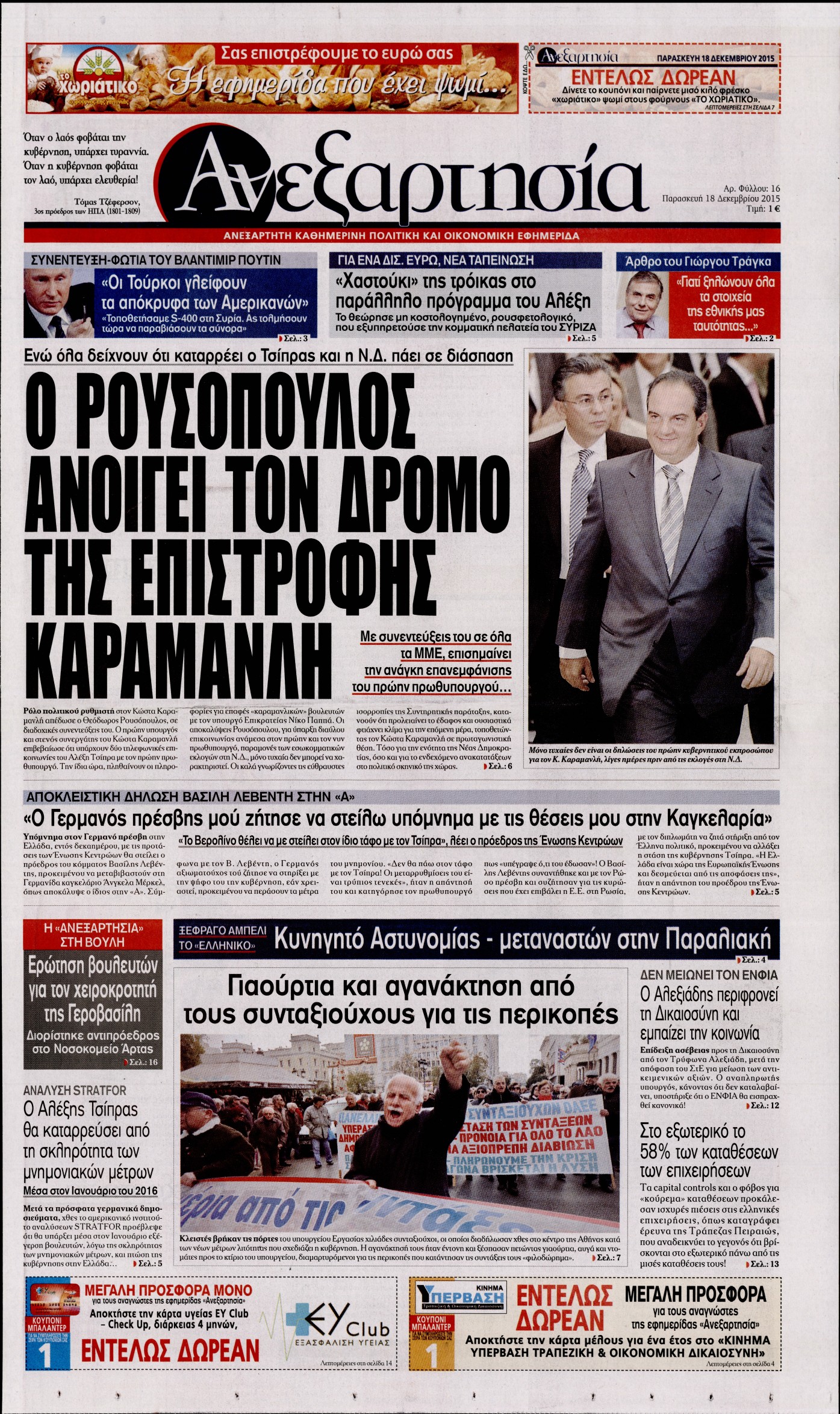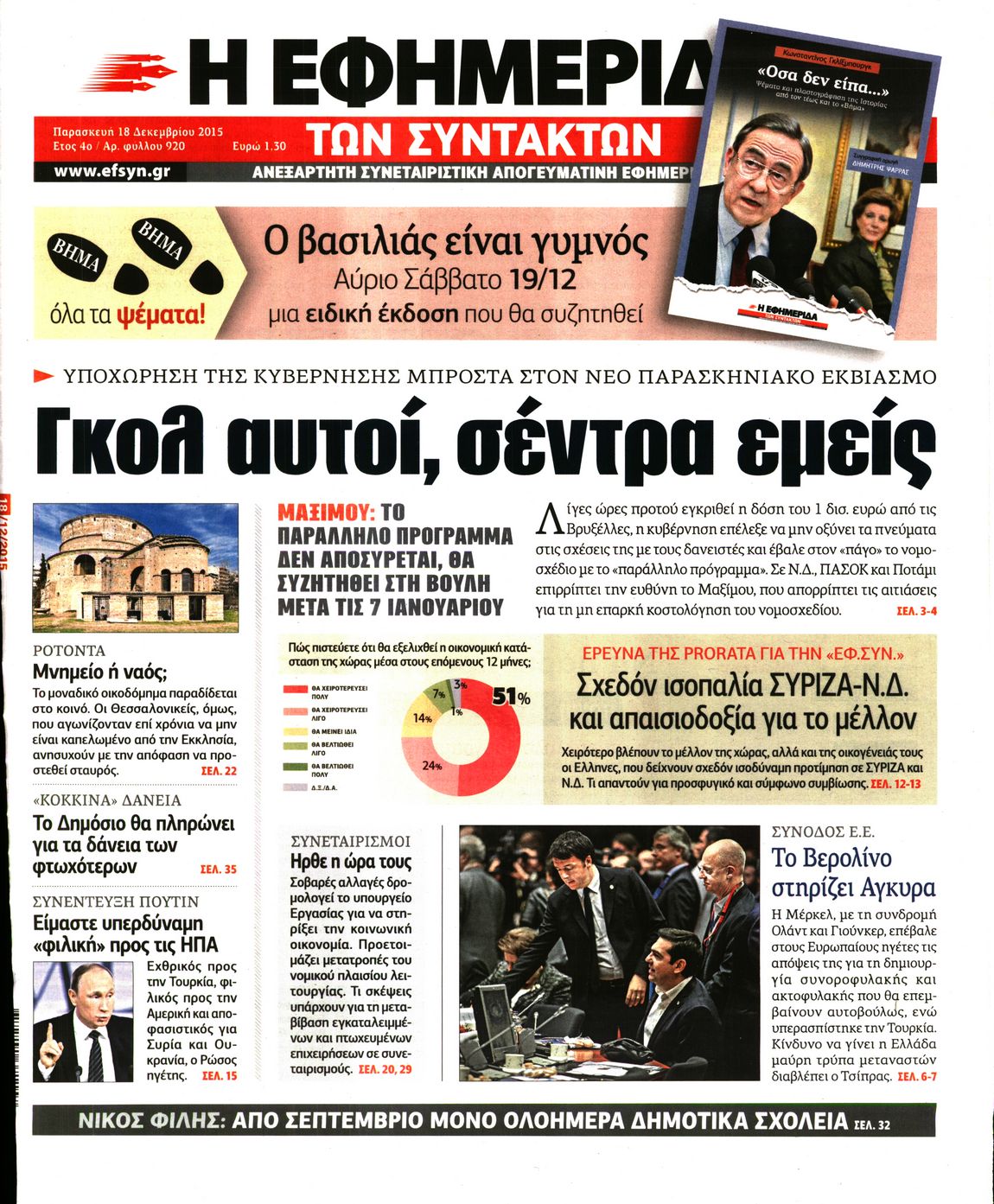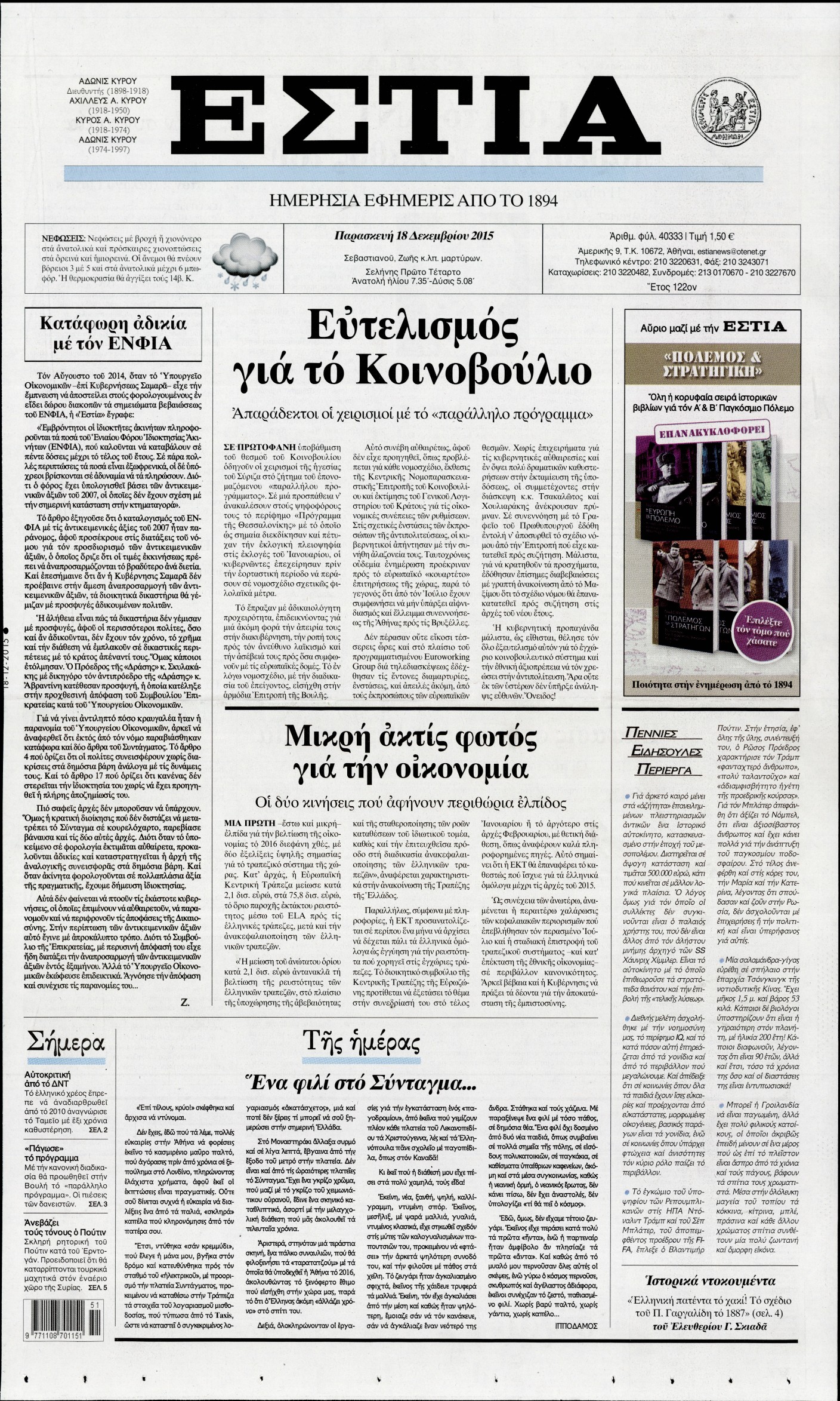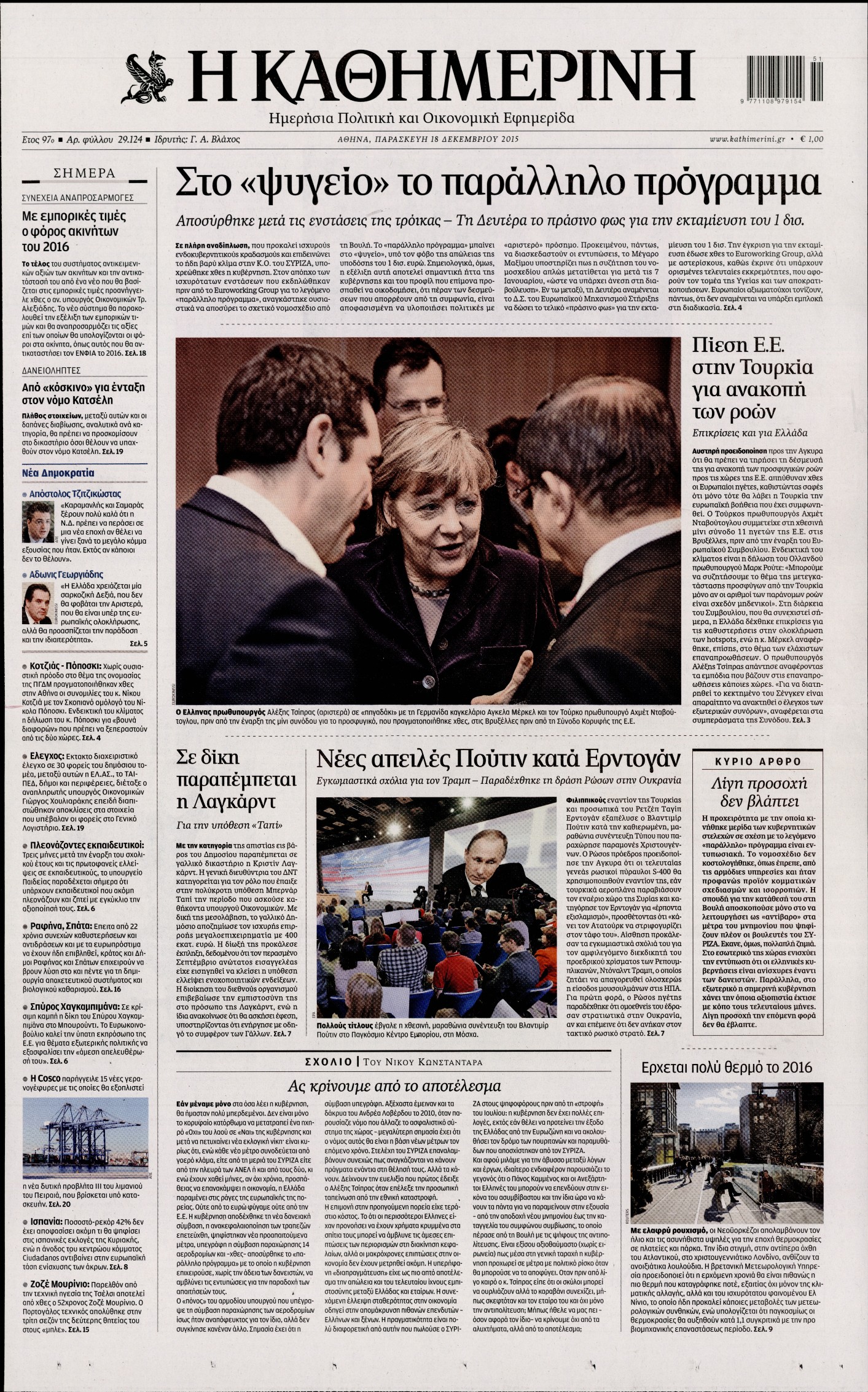Οι πολιτικές εφημερίδες 18/12/2015 Enikos Newsroom 06:47, Παρασκευή 18 Δεκεμβρίου 2015 Media Διαβάστε τα σημερινά πρωτοσέλιδα των πολιτικών εφημερίδων: ΠΟΛΙΤΙΚΕΣ ΕΦΗΜΕΡΙΔΕΣ ΠΡΩΤΟΣΕΛΙΔΑ Μοιράσου το: σχολίασε κι εσύ (0 σχόλια) Ακολουθήστε το enikos.gr στο Google News και μάθετε πρώτοι όλες τις ειδήσεις Δείτε όλες τις τελευταίες ειδήσεις από την Ελλάδα και τον Κόσμο στο enikos.gr Ειδήσεις Ροή Ειδήσεων 4 ώρες πριν Χριστούγεννα στα μπλόκα: Επιμένουν στις κινητοποιήσεις τους οι αγρότες – Ανοίγουν τα διόδια το Σαββατοκύριακο 5 ώρες πριν Ουκρανία: Η άνευ προηγουμένου επίθεση σε ρωσικό τάνκερ στη Μεσόγειο και το μήνυμα προς στον Πούτιν – Το «μακρύ χέρι» του Κιέβου 4 ώρες πριν Πούτιν: Τα μηνύματα σε Ευρώπη και ΝΑΤΟ από το μαραθώνιο «σόου» του – Η απαίτηση για «σεβασμό» και η ειρήνη «με τους όρους» της Μόσχας 5 ώρες πριν Τραμπ: Δεν αποκλείει την πιθανότητα ενός πολέμου στη Βενεζουέλα – «Ο Μαδούρο ξέρει καλύτερα από τον καθένα τι ακριβώς θέλω» 5 ώρες πριν Συνεχίζει να προκαλεί ο Μίτσκοσκι: «Για μένα το όνομα Μακεδονία είναι ιερό» 4 ώρες πριν Ανακαλύφθηκαν αρχαία χρυσά νομίσματα 2.200 ετών που απεικονίζουν τον θεό Απόλλωνα – Η άγνωστη σύνδεση με τον Φίλιππο Β΄ της Μακεδονίας 5 ώρες πριν Ύπνος: Μια κρυφή κατάσταση του εγκεφάλου πριν από τον ύπνο μπορεί να είναι το “κλειδί” για υψηλή ευφυΐα και δημιουργικότητα 6 ώρες πριν Αριθμολογία: Οι άνθρωποι που έχουν γεννηθεί αυτές τις 4 ημερομηνίες, συχνά παρεξηγούνται – «Η καλοσύνη τους κρύβει τεράστια δύναμη» 7 ώρες πριν Ξεχάστε το καθάρισμα το Σαββατοκύριακο: Ο «κανόνας των 20 λεπτών» που θα σας λύσει τα χέρια 22 λεπτά πριν Θεσσαλονίκη: Εξαφανίστηκε 13χρονος από χώρο φιλοξενίας ασυνόδευτων ανηλίκων στο Ωραιόκαστρο 32 λεπτά πριν Ντόναλντ Τραμπ: «Πολύ βαριά αντίποινα» στη Συρία – «Πλήττουμε πολύ δυνατά οχυρά του Ισλαμικού Κράτους» 47 λεπτά πριν Εξάρχεια: Ένταση με μολότοφ, χημικά και κρότου λάμψης 1 ώρα πριν ΗΠΑ: Τραγωδία στην Αλαμπάμα – Σκότωσε την δημοσιογράφο σύζυγό του και αυτοκτόνησε μπροστά στον 3χρονο γιο τους 1 ώρα πριν Πρόταση γάμου στο ΣΕΦ κατά την διάρκεια του αγώνα Ολυμπιακός-Βιλερμπάν – Δείτε βίντεο ENIKOS NETWORK Το ΕΚΑΒ τιμήθηκε από την Ακαδημία Αθηνών για τα 40 χρόνια προσφοράς του Έχετε πραγματικά μεγάλη καρδιά; 10 χαρακτηριστικά όσων έχουν καλοσύνη Αναστολή μέτρων αναγκαστικής εκτέλεσης για κτηνοτρόφους που πλήττονται από την ευλογιά των αιγοπροβάτων Πλήρης επάρκεια προϊόντων στις λαϊκές της Αττικής, παρά τις αγροτικές κινητοποιήσεις – Τι απαντούν οι πωλητές Χαρτογραφώντας το «σημείο χωρίς επιστροφή»: Για πρώτη φορά αποκαλύπτεται με λεπτομέρεια το ακανθώδες όριο της ατμόσφαιρας τ... Η Google καταργεί τη λειτουργία «dark web report» – Πώς θα μπορούν οι χρήστες να διαγράφουν τα δεδομένα τους περισσότερα 22:42 , Παρασκευή 19 Δεκεμβρίου 2025 Γιώργος Γιαννόπουλος για “Το σόι σου”: “Είναι ευτυχία και ευλογία αυτή η σειρά” «Είναι ευτυχία και ευλογία η συγκυρία αυτής της σειράς», θα πει ο Γιώργος Γιαννόπουλος -ο αγαπ... 20:37 , Παρασκευή 19 Δεκεμβρίου 2025 Don’t Forget The Lyrics: Η Έλλη Κοκκίνου υποδέχεται 4 παίκτες που θα κάνουν τα πάντα για να μη χάσουν ούτε… μισή λέξη από τους στίχους Το «Don’t Forget The Lyrics» επιστρέφει απόψε, Παρασκευή 19 Δεκεμβρίου, στις 21:00 με νέο επει... 19:31 , Παρασκευή 19 Δεκεμβρίου 2025 GNTM: Απόψε ο μεγάλος τελικός για τους 4 φιναλίστ Έπειτα από μήνες γεμάτους μόδα, δημιουργία και έντονες αναμετρήσεις, το GNTM 2025 κορυφώνεται,... 18:11 , Παρασκευή 19 Δεκεμβρίου 2025 