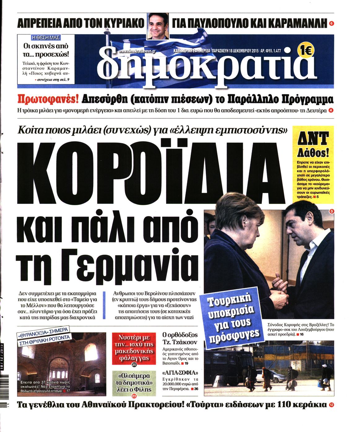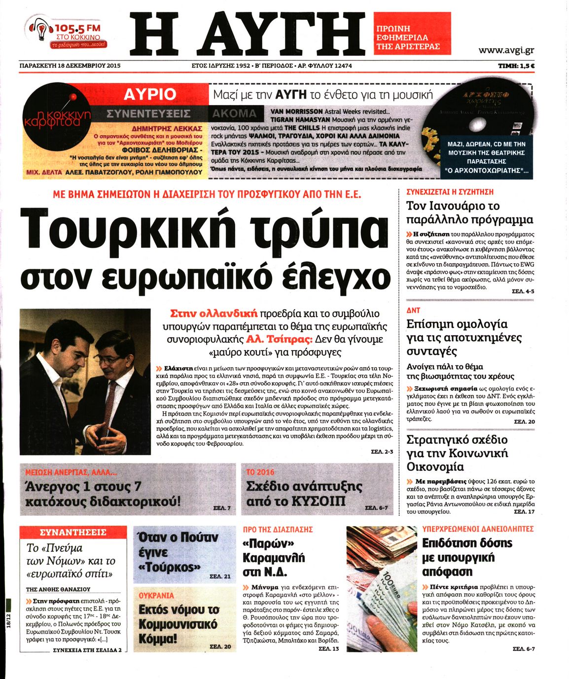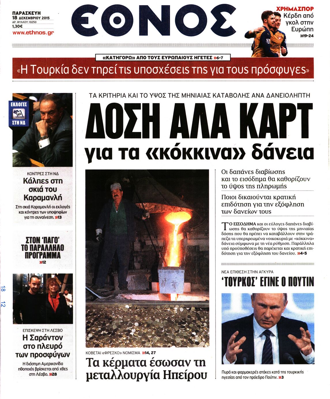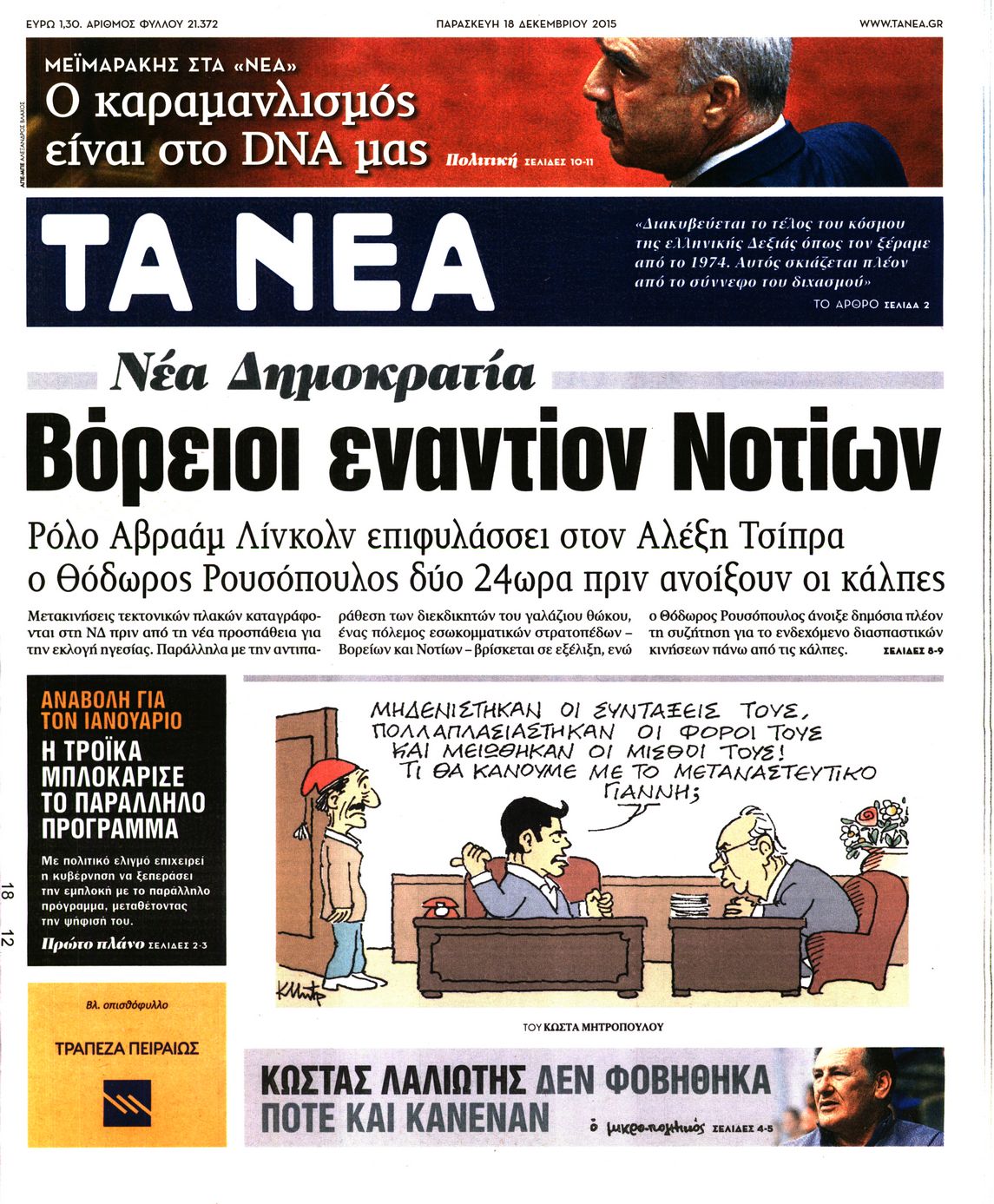Οι πολιτικές εφημερίδες 18/12/2015 Enikos Newsroom 06:47, Παρασκευή 18 Δεκεμβρίου 2015 Media Διαβάστε τα σημερινά πρωτοσέλιδα των πολιτικών εφημερίδων: ΠΟΛΙΤΙΚΕΣ ΕΦΗΜΕΡΙΔΕΣ ΠΡΩΤΟΣΕΛΙΔΑ Μοιράσου το: σχολίασε κι εσύ (0 σχόλια) Ακολουθήστε το enikos.gr στο Google News και μάθετε πρώτοι όλες τις ειδήσεις Δείτε όλες τις τελευταίες ειδήσεις από την Ελλάδα και τον Κόσμο στο enikos.gr Ειδήσεις Ροή Ειδήσεων 4 ώρες πριν Χριστούγεννα στα μπλόκα: Επιμένουν στις κινητοποιήσεις τους οι αγρότες – Ανοίγουν τα διόδια το Σαββατοκύριακο 5 ώρες πριν Ουκρανία: Η άνευ προηγουμένου επίθεση σε ρωσικό τάνκερ στη Μεσόγειο και το μήνυμα προς στον Πούτιν – Το «μακρύ χέρι» του Κιέβου 4 ώρες πριν Πούτιν: Τα μηνύματα σε Ευρώπη και ΝΑΤΟ από το μαραθώνιο «σόου» του – Η απαίτηση για «σεβασμό» και η ειρήνη «με τους όρους» της Μόσχας 5 ώρες πριν Τραμπ: Δεν αποκλείει την πιθανότητα ενός πολέμου στη Βενεζουέλα – «Ο Μαδούρο ξέρει καλύτερα από τον καθένα τι ακριβώς θέλω» 5 ώρες πριν Συνεχίζει να προκαλεί ο Μίτσκοσκι: «Για μένα το όνομα Μακεδονία είναι ιερό» 4 ώρες πριν Ανακαλύφθηκαν αρχαία χρυσά νομίσματα 2.200 ετών που απεικονίζουν τον θεό Απόλλωνα – Η άγνωστη σύνδεση με τον Φίλιππο Β΄ της Μακεδονίας 5 ώρες πριν Ύπνος: Μια κρυφή κατάσταση του εγκεφάλου πριν από τον ύπνο μπορεί να είναι το “κλειδί” για υψηλή ευφυΐα και δημιουργικότητα 6 ώρες πριν Αριθμολογία: Οι άνθρωποι που έχουν γεννηθεί αυτές τις 4 ημερομηνίες, συχνά παρεξηγούνται – «Η καλοσύνη τους κρύβει τεράστια δύναμη» 7 ώρες πριν Ξεχάστε το καθάρισμα το Σαββατοκύριακο: Ο «κανόνας των 20 λεπτών» που θα σας λύσει τα χέρια 22 λεπτά πριν Θεσσαλονίκη: Εξαφανίστηκε 13χρονος από χώρο φιλοξενίας ασυνόδευτων ανηλίκων στο Ωραιόκαστρο 32 λεπτά πριν Ντόναλντ Τραμπ: «Πολύ βαριά αντίποινα» στη Συρία – «Πλήττουμε πολύ δυνατά οχυρά του Ισλαμικού Κράτους» 47 λεπτά πριν Εξάρχεια: Ένταση με μολότοφ, χημικά και κρότου λάμψης 1 ώρα πριν ΗΠΑ: Τραγωδία στην Αλαμπάμα – Σκότωσε την δημοσιογράφο σύζυγό του και αυτοκτόνησε μπροστά στον 3χρονο γιο τους 1 ώρα πριν Πρόταση γάμου στο ΣΕΦ κατά την διάρκεια του αγώνα Ολυμπιακός-Βιλερμπάν – Δείτε βίντεο ENIKOS NETWORK Το ΕΚΑΒ τιμήθηκε από την Ακαδημία Αθηνών για τα 40 χρόνια προσφοράς του Έχετε πραγματικά μεγάλη καρδιά; 10 χαρακτηριστικά όσων έχουν καλοσύνη Αναστολή μέτρων αναγκαστικής εκτέλεσης για κτηνοτρόφους που πλήττονται από την ευλογιά των αιγοπροβάτων Πλήρης επάρκεια προϊόντων στις λαϊκές της Αττικής, παρά τις αγροτικές κινητοποιήσεις – Τι απαντούν οι πωλητές Χαρτογραφώντας το «σημείο χωρίς επιστροφή»: Για πρώτη φορά αποκαλύπτεται με λεπτομέρεια το ακανθώδες όριο της ατμόσφαιρας τ... Η Google καταργεί τη λειτουργία «dark web report» – Πώς θα μπορούν οι χρήστες να διαγράφουν τα δεδομένα τους περισσότερα 22:42 , Παρασκευή 19 Δεκεμβρίου 2025 Γιώργος Γιαννόπουλος για “Το σόι σου”: “Είναι ευτυχία και ευλογία αυτή η σειρά” «Είναι ευτυχία και ευλογία η συγκυρία αυτής της σειράς», θα πει ο Γιώργος Γιαννόπουλος -ο αγαπ... 20:37 , Παρασκευή 19 Δεκεμβρίου 2025 Don’t Forget The Lyrics: Η Έλλη Κοκκίνου υποδέχεται 4 παίκτες που θα κάνουν τα πάντα για να μη χάσουν ούτε… μισή λέξη από τους στίχους Το «Don’t Forget The Lyrics» επιστρέφει απόψε, Παρασκευή 19 Δεκεμβρίου, στις 21:00 με νέο επει... 19:31 , Παρασκευή 19 Δεκεμβρίου 2025 GNTM: Απόψε ο μεγάλος τελικός για τους 4 φιναλίστ Έπειτα από μήνες γεμάτους μόδα, δημιουργία και έντονες αναμετρήσεις, το GNTM 2025 κορυφώνεται,... 18:11 , Παρασκευή 19 Δεκεμβρίου 2025 