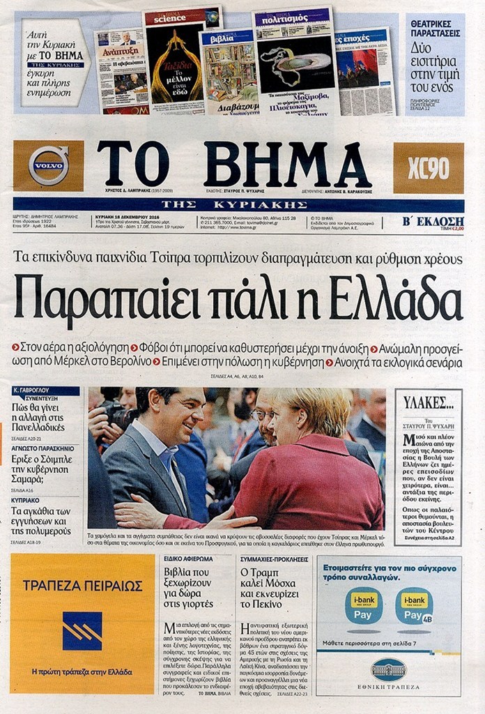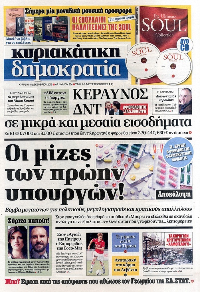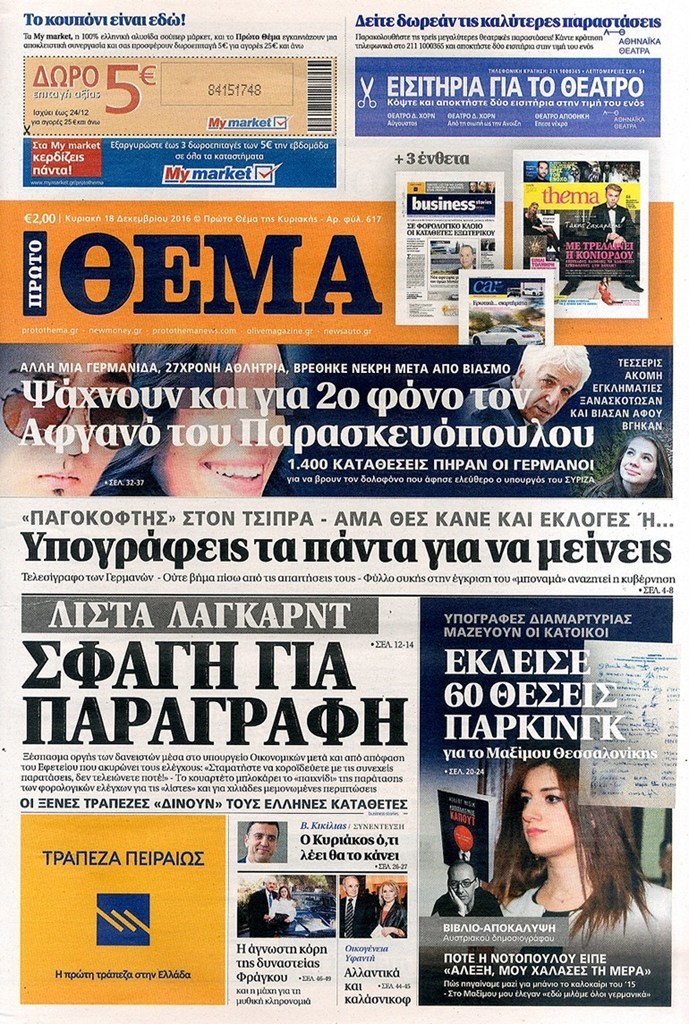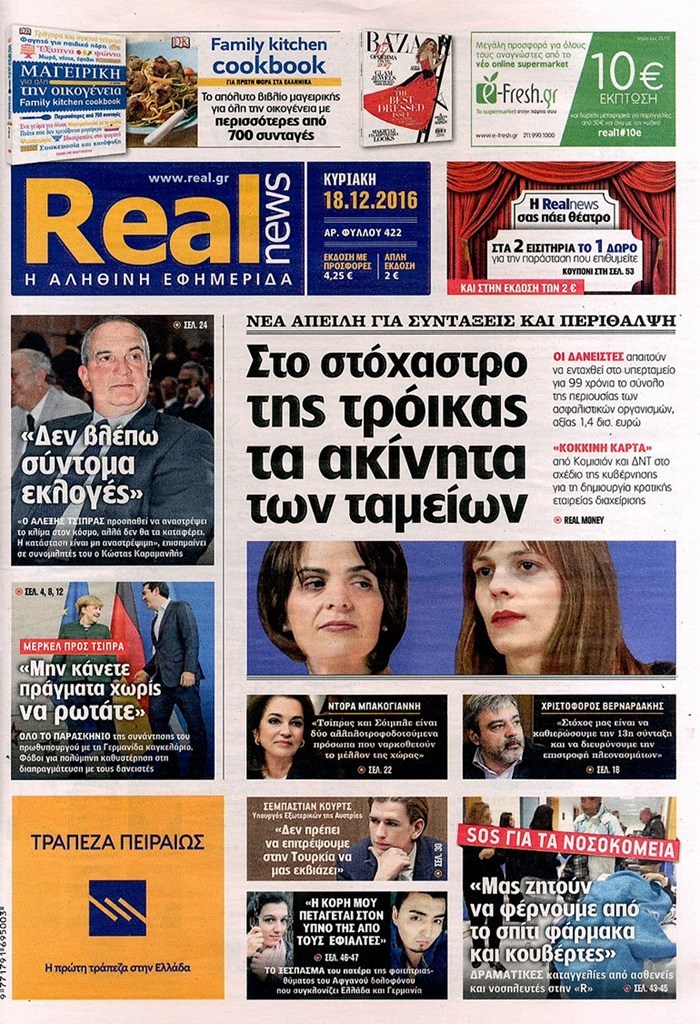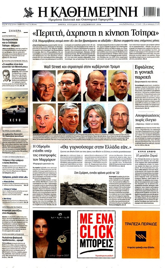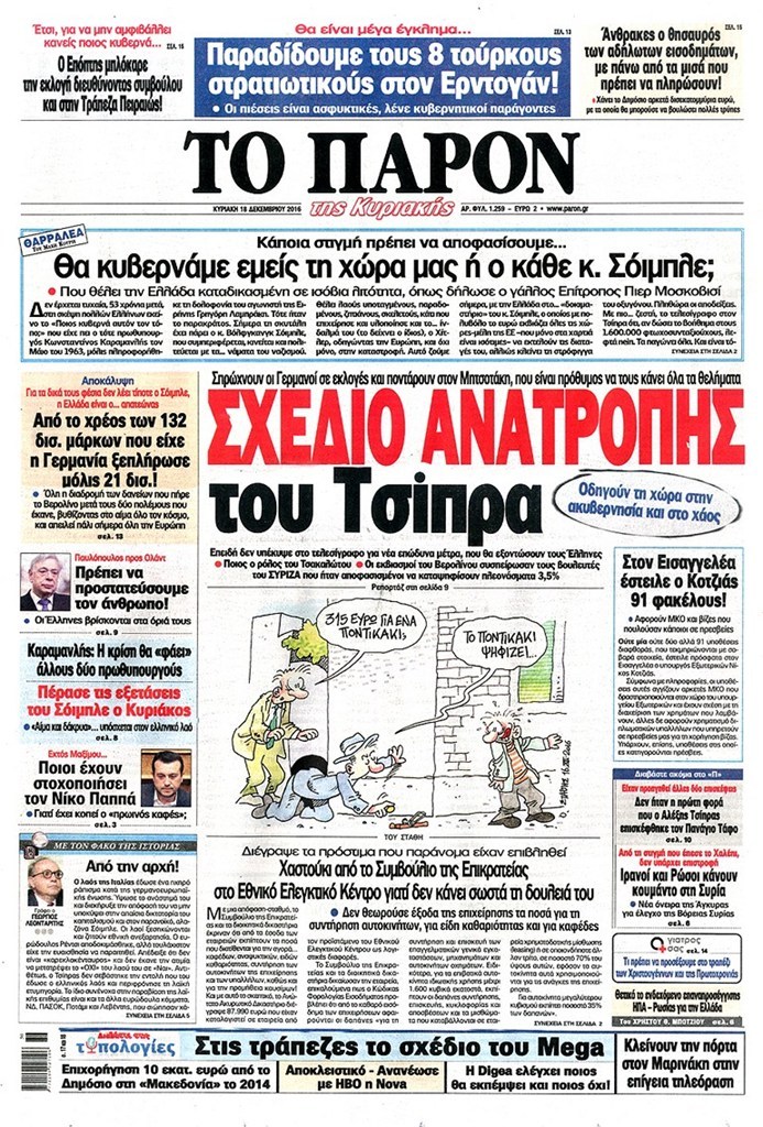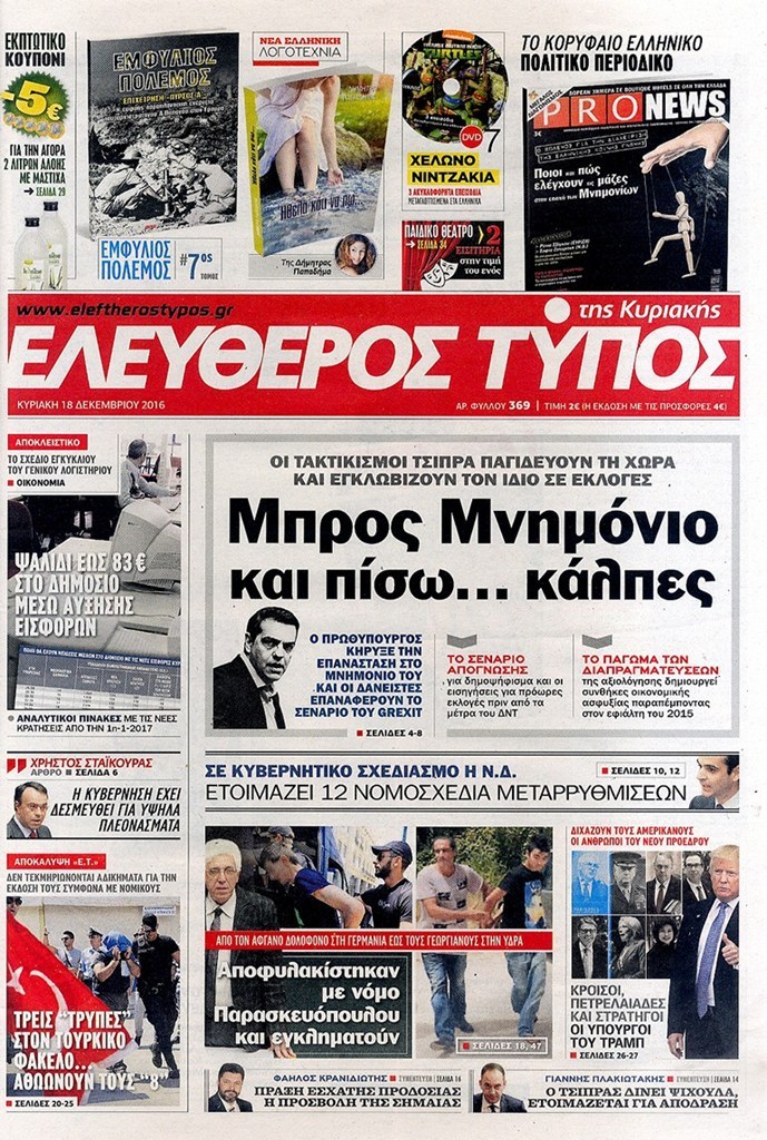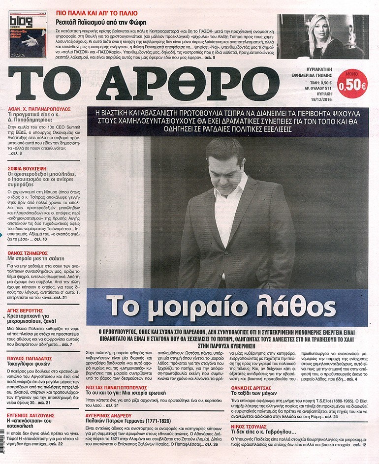 Οι πολιτικές εφημερίδες 18/12/2016 Κώστας Τεό 03:05, Κυριακή 18 Δεκεμβρίου 2016 Media Διαβάστε τα σημερινά πρωτοσέλιδα των πολιτικών εφημερίδων: ΠΟΛΙΤΙΚΕΣ ΕΦΗΜΕΡΙΔΕΣ ΠΡΩΤΟΣΕΛΙΔΑ Μοιράσου το: σχολίασε κι εσύ (0 σχόλια) Ακολουθήστε το enikos.gr στο Google News και μάθετε πρώτοι όλες τις ειδήσεις Δείτε όλες τις τελευταίες ειδήσεις από την Ελλάδα και τον Κόσμο στο enikos.gr Ειδήσεις Ροή Ειδήσεων 3 ώρες πριν Χριστούγεννα στα μπλόκα: Επιμένουν στις κινητοποιήσεις τους οι αγρότες – Ανοίγουν τα διόδια το Σαββατοκύριακο 3 ώρες πριν Ουκρανία: Η άνευ προηγουμένου επίθεση σε ρωσικό τάνκερ στη Μεσόγειο και το μήνυμα προς στον Πούτιν – Το «μακρύ χέρι» του Κιέβου 2 ώρες πριν Πούτιν: Τα μηνύματα σε Ευρώπη και ΝΑΤΟ από το μαραθώνιο «σόου» του – Η απαίτηση για «σεβασμό» και η ειρήνη «με τους όρους» της Μόσχας 3 ώρες πριν Τραμπ: Δεν αποκλείει την πιθανότητα ενός πολέμου στη Βενεζουέλα – «Ο Μαδούρο ξέρει καλύτερα από τον καθένα τι ακριβώς θέλω» 4 ώρες πριν Συνεχίζει να προκαλεί ο Μίτσκοσκι: «Για μένα το όνομα Μακεδονία είναι ιερό» 2 ώρες πριν Ανακαλύφθηκαν αρχαία χρυσά νομίσματα 2.200 ετών που απεικονίζουν τον θεό Απόλλωνα – Η άγνωστη σύνδεση με τον Φίλιππο Β΄ της Μακεδονίας 3 ώρες πριν Ύπνος: Μια κρυφή κατάσταση του εγκεφάλου πριν από τον ύπνο μπορεί να είναι το “κλειδί” για υψηλή ευφυΐα και δημιουργικότητα 4 ώρες πριν Αριθμολογία: Οι άνθρωποι που έχουν γεννηθεί αυτές τις 4 ημερομηνίες, συχνά παρεξηγούνται – «Η καλοσύνη τους κρύβει τεράστια δύναμη» 5 ώρες πριν Ξεχάστε το καθάρισμα το Σαββατοκύριακο: Ο «κανόνας των 20 λεπτών» που θα σας λύσει τα χέρια 8 λεπτά πριν Συρία: Μαζικά πλήγματα των ΗΠΑ σε θέσεις του Ισλαμικού Κράτους – Χέγκσεθ: «Δεν είναι αρχή πολέμου, είναι μια δήλωση εκδίκησης» για το θάνατο των στρατιωτών μας 21 λεπτά πριν Ουκρανία: Ολοκληρώθηκαν οι συνομιλίες με τους Αμερικανούς κι Ευρωπαίους διαπραγματευτές 36 λεπτά πριν Μπαρτσελόνα – Μπασκόνια 134-124: Οι «μπλαουγκράνα» πήραν το ματς της χρονιάς ύστερα από τρεις παρατάσεις 51 λεπτά πριν Φαίη Σκορδά: «Παλιότερα τα κομπλιμέντα τα προσπερνούσα, τώρα τα έχω ανάγκη» 1 ώρα πριν Βασίλης Σπανούλης: Δεν εμφανίστηκε ούτε ένας δημοσιογράφος στην συνέντευξη Τύπου – «Καλησπέρα στον… κανέναν», δείτε βίντεο ENIKOS NETWORK Το ΕΚΑΒ τιμήθηκε από την Ακαδημία Αθηνών για τα 40 χρόνια προσφοράς του Έχετε πραγματικά μεγάλη καρδιά; 10 χαρακτηριστικά όσων έχουν καλοσύνη Αναστολή μέτρων αναγκαστικής εκτέλεσης για κτηνοτρόφους που πλήττονται από την ευλογιά των αιγοπροβάτων Πλήρης επάρκεια προϊόντων στις λαϊκές της Αττικής, παρά τις αγροτικές κινητοποιήσεις – Τι απαντούν οι πωλητές Χαρτογραφώντας το «σημείο χωρίς επιστροφή»: Για πρώτη φορά αποκαλύπτεται με λεπτομέρεια το ακανθώδες όριο της ατμόσφαιρας τ... Η Google καταργεί τη λειτουργία «dark web report» – Πώς θα μπορούν οι χρήστες να διαγράφουν τα δεδομένα τους περισσότερα 22:42 , Παρασκευή 19 Δεκεμβρίου 2025 Γιώργος Γιαννόπουλος για “Το σόι σου”: “Είναι ευτυχία και ευλογία αυτή η σειρά” «Είναι ευτυχία και ευλογία η συγκυρία αυτής της σειράς», θα πει ο Γιώργος Γιαννόπουλος -ο αγαπ... 20:37 , Παρασκευή 19 Δεκεμβρίου 2025 Don’t Forget The Lyrics: Η Έλλη Κοκκίνου υποδέχεται 4 παίκτες που θα κάνουν τα πάντα για να μη χάσουν ούτε… μισή λέξη από τους στίχους Το «Don’t Forget The Lyrics» επιστρέφει απόψε, Παρασκευή 19 Δεκεμβρίου, στις 21:00 με νέο επει... 19:31 , Παρασκευή 19 Δεκεμβρίου 2025 GNTM: Απόψε ο μεγάλος τελικός για τους 4 φιναλίστ Έπειτα από μήνες