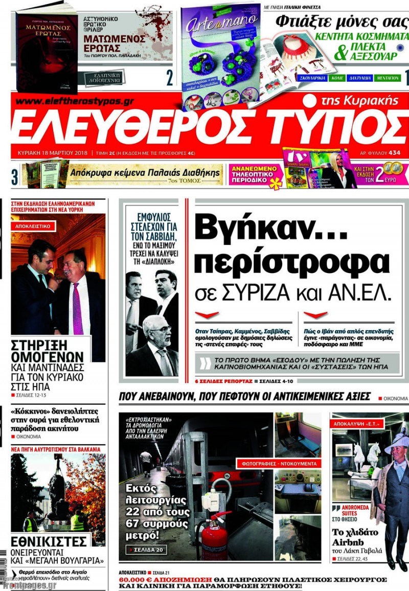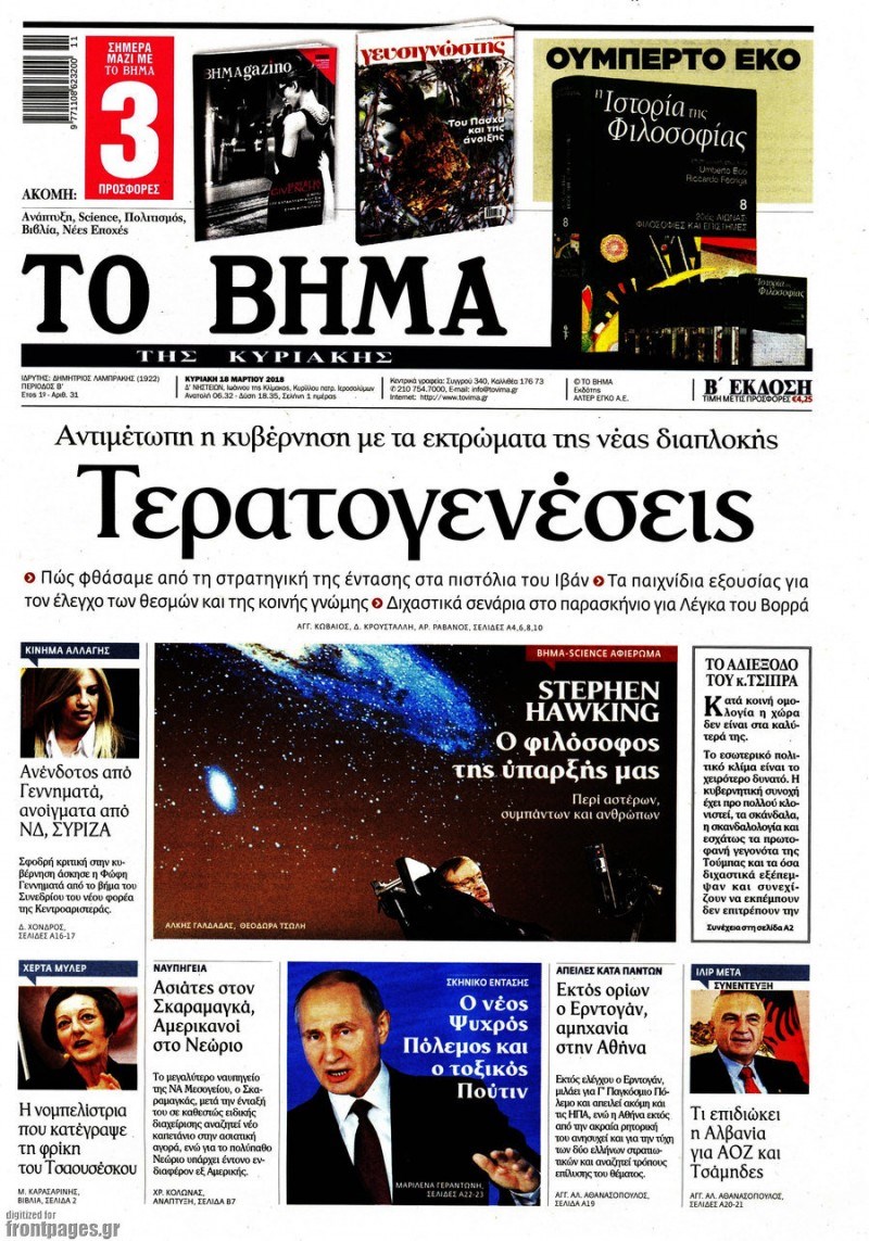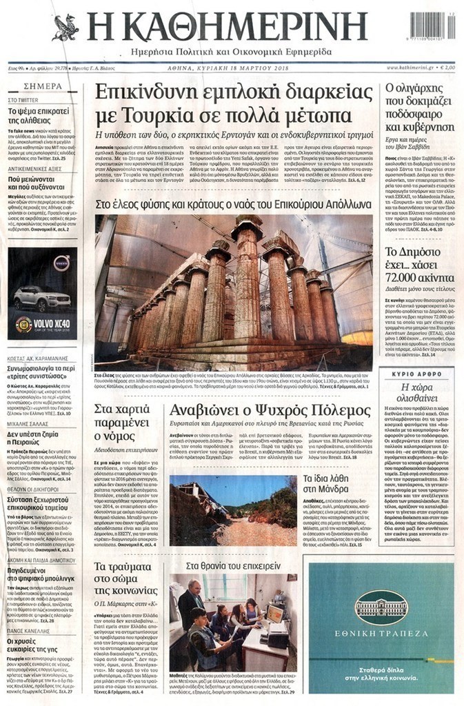 Οι πολιτικές εφημερίδες 18/3/2018 Κώστας Τεό 06:32, Κυριακή 18 Μαρτίου 2018 Media Διαβάστε τα σημερινά πρωτοσέλιδα των πολιτικών εφημερίδων: ΠΟΛΙΤΙΚΕΣ ΕΦΗΜΕΡΙΔΕΣ ΠΡΩΤΟΣΕΛΙΔΑ Μοιράσου το: σχολίασε κι εσύ (0 σχόλια) Ακολουθήστε το enikos.gr στο Google News και μάθετε πρώτοι όλες τις ειδήσεις Δείτε όλες τις τελευταίες ειδήσεις από την Ελλάδα και τον Κόσμο στο enikos.gr Ειδήσεις Ροή Ειδήσεων 7 ώρες πριν Χριστούγεννα στα μπλόκα: Επιμένουν στις κινητοποιήσεις τους οι αγρότες – Ανοίγουν τα διόδια το Σαββατοκύριακο 7 ώρες πριν Ουκρανία: Η άνευ προηγουμένου επίθεση σε ρωσικό τάνκερ στη Μεσόγειο και το μήνυμα προς στον Πούτιν – Το «μακρύ χέρι» του Κιέβου 6 ώρες πριν Πούτιν: Τα μηνύματα σε Ευρώπη και ΝΑΤΟ από το μαραθώνιο «σόου» του – Η απαίτηση για «σεβασμό» και η ειρήνη «με τους όρους» της Μόσχας 7 ώρες πριν Τραμπ: Δεν αποκλείει την πιθανότητα ενός πολέμου στη Βενεζουέλα – «Ο Μαδούρο ξέρει καλύτερα από τον καθένα τι ακριβώς θέλω» 8 ώρες πριν Συνεχίζει να προκαλεί ο Μίτσκοσκι: «Για μένα το όνομα Μακεδονία είναι ιερό» 6 ώρες πριν Ανακαλύφθηκαν αρχαία χρυσά νομίσματα 2.200 ετών που απεικονίζουν τον θεό Απόλλωνα – Η άγνωστη σύνδεση με τον Φίλιππο Β΄ της Μακεδονίας 7 ώρες πριν Ύπνος: Μια κρυφή κατάσταση του εγκεφάλου πριν από τον ύπνο μπορεί να είναι το “κλειδί” για υψηλή ευφυΐα και δημιουργικότητα 8 ώρες πριν Αριθμολογία: Οι άνθρωποι που έχουν γεννηθεί αυτές τις 4 ημερομηνίες, συχνά παρεξηγούνται – «Η καλοσύνη τους κρύβει τεράστια δύναμη» 9 ώρες πριν Ξεχάστε το καθάρισμα το Σαββατοκύριακο: Ο «κανόνας των 20 λεπτών» που θα σας λύσει τα χέρια 9 λεπτά πριν ΟΗΕ: Το Συμβούλιο Ασφαλείας παρατείνει για έναν χρόνο την εντολή της ειρηνευτικής δύναμης στο Κονγκό 24 λεπτά πριν Μοχάμεντ Σαλάχ: Ζήτησε «συγγνώμη» από τους συμπαίκτες του στη Λίβερπουλ για το ξέσπασμά του 39 λεπτά πριν Μάρκο Ρούμπιο: Ανθρωπιστική κατάπαυση του πυρός στο Σουδάν ζητά ο Αμερικανός υπουργός Εξωτερικών 54 λεπτά πριν Αγγελική Νικολούλη: Τα συλλυπητήρια για την απώλεια της Ειρήνης Μαρινάκη 1 ώρα πριν Βολιβία: Μαζική διαδηλώσεις εναντίον της κατάργησης των επιδοτήσεων των τιμών των καυσίμων ENIKOS NETWORK Το ΕΚΑΒ τιμήθηκε από την Ακαδημία Αθηνών για τα 40 χρόνια προσφοράς του Έχετε πραγματικά μεγάλη καρδιά; 10 χαρακτηριστικά όσων έχουν καλοσύνη Αναστολή μέτρων αναγκαστικής εκτέλεσης για κτηνοτρόφους που πλήττονται από την ευλογιά των αιγοπροβάτων Πλήρης επάρκεια προϊόντων στις λαϊκές της Αττικής, παρά τις αγροτικές κινητοποιήσεις – Τι απαντούν οι πωλητές Χαρτογραφώντας το «σημείο χωρίς επιστροφή»: Για πρώτη φορά αποκαλύπτεται με λεπτομέρεια το ακανθώδες όριο της ατμόσφαιρας τ... Η Google καταργεί τη λειτουργία «dark web report» – Πώς θα μπορούν οι χρήστες να διαγράφουν τα δεδομένα τους περισσότερα 04:20 , Σάββατο 20 Δεκεμβρίου 2025 Αγγελική Νικολούλη: Τα συλλυπητήρια για την απώλεια της Ειρήνης Μαρινάκη Τα συλληπητήρια στον πρόεδρο του Mega, τον Βαγγέλη Μαρινάκη, για την απώλεια της μητέρας του Ε... 02:50 , Σάββατο 20 Δεκεμβρίου 2025 GNTM: Η Ξένια Τσίρκοβα αναδείχθηκε μεγάλη νικήτρια και πήρε τις 50.000 ευρώ – Ποιος βρέθηκε σε απόσταση αναπνοής; Με φαντασμαγορικό τρόπο ολοκληρώθηκε το βράδυ της Παρασκευής ο μεγάλος τελικός του GNTM, μέσα ... 22:42 , Παρασκευή 19 Δεκεμβρίου 2025 Γιώργος Γιαννόπουλος για “Το σόι σου”: “Είναι ευτυχία και ευλογία αυτή η σειρά” «Είναι ευτυχία και ευλογία η συγκυρία αυτής της σειράς», θα πει ο Γιώργος Γιαννόπουλος -ο αγαπ... 20:3