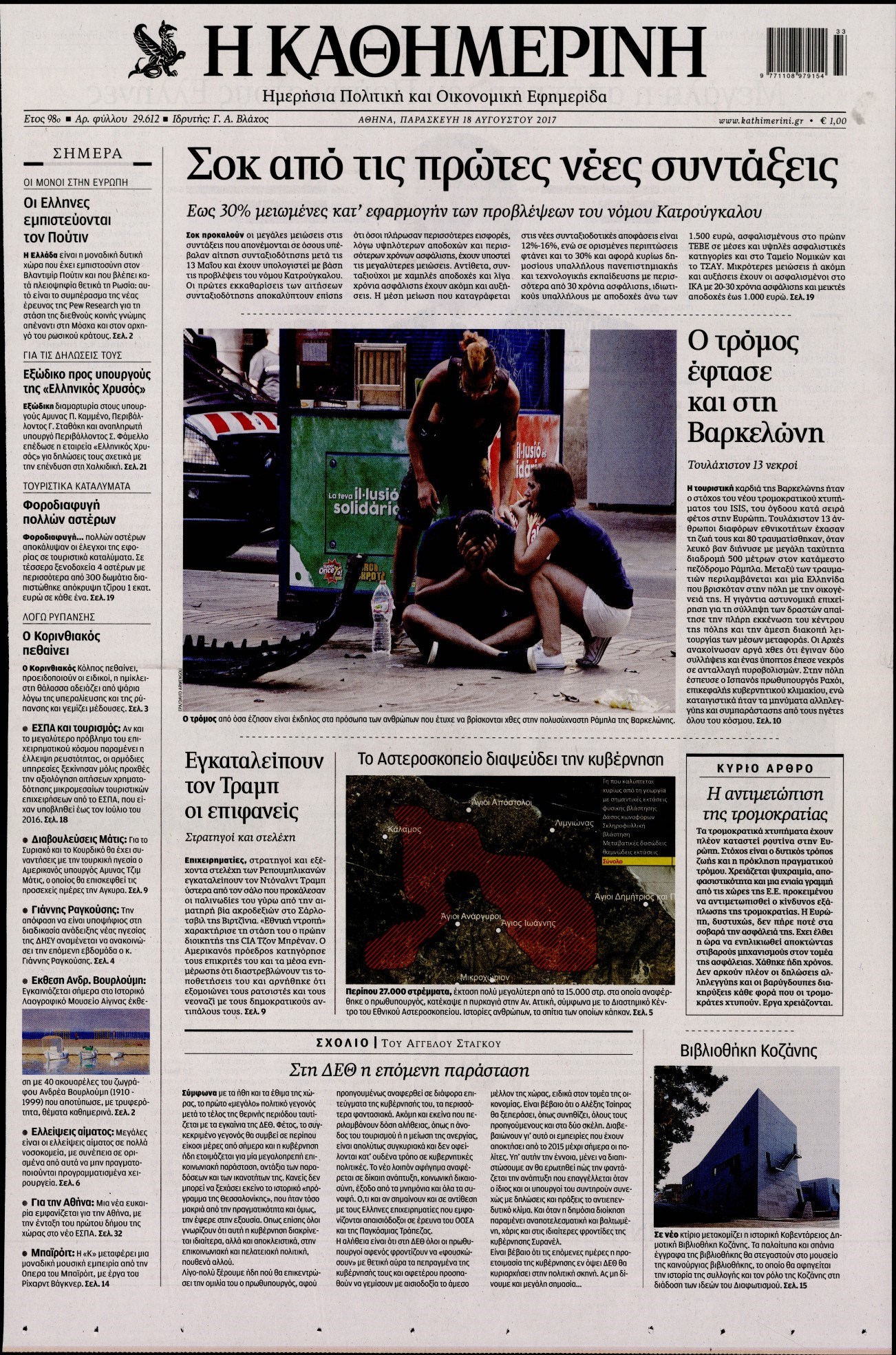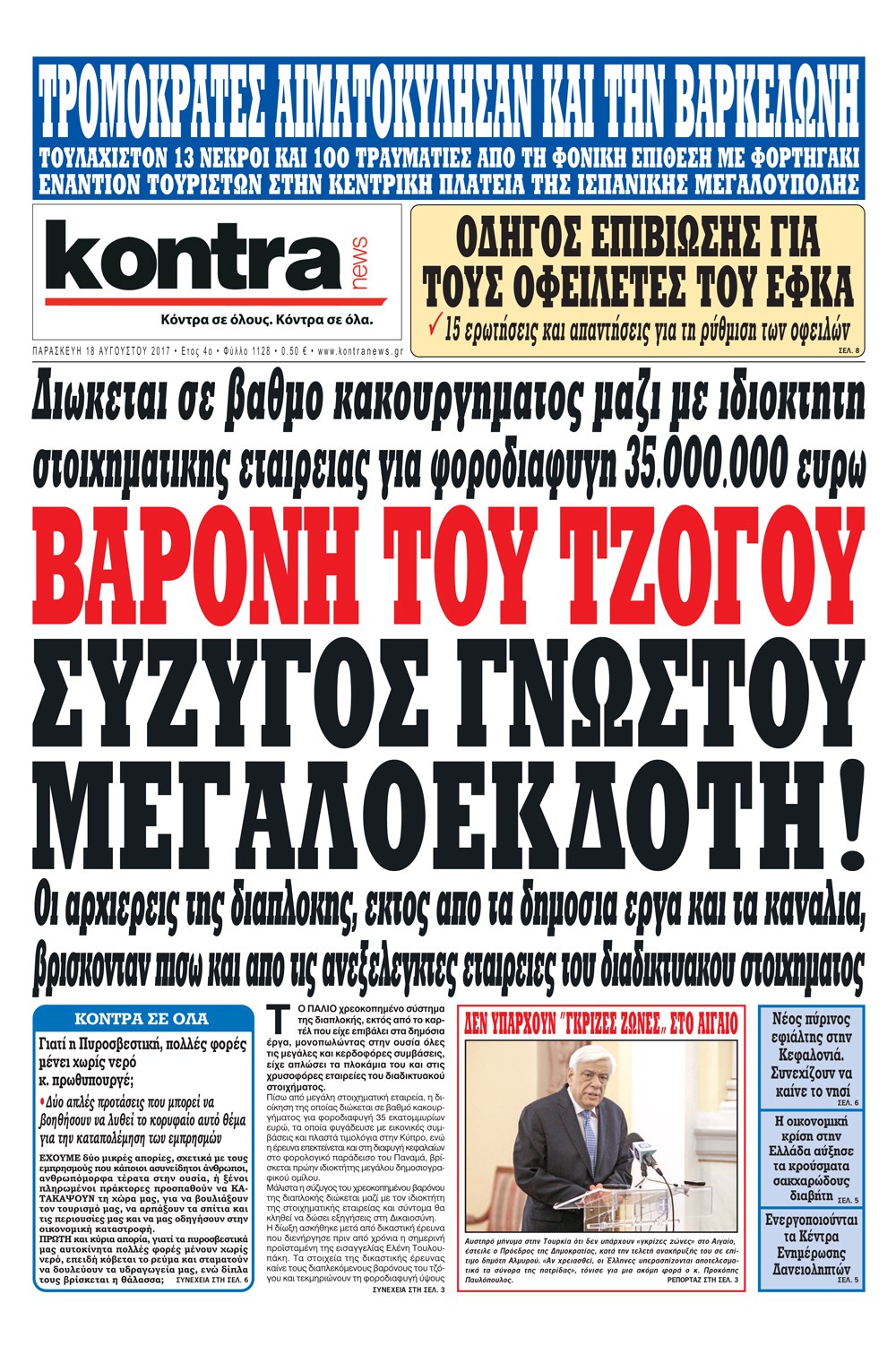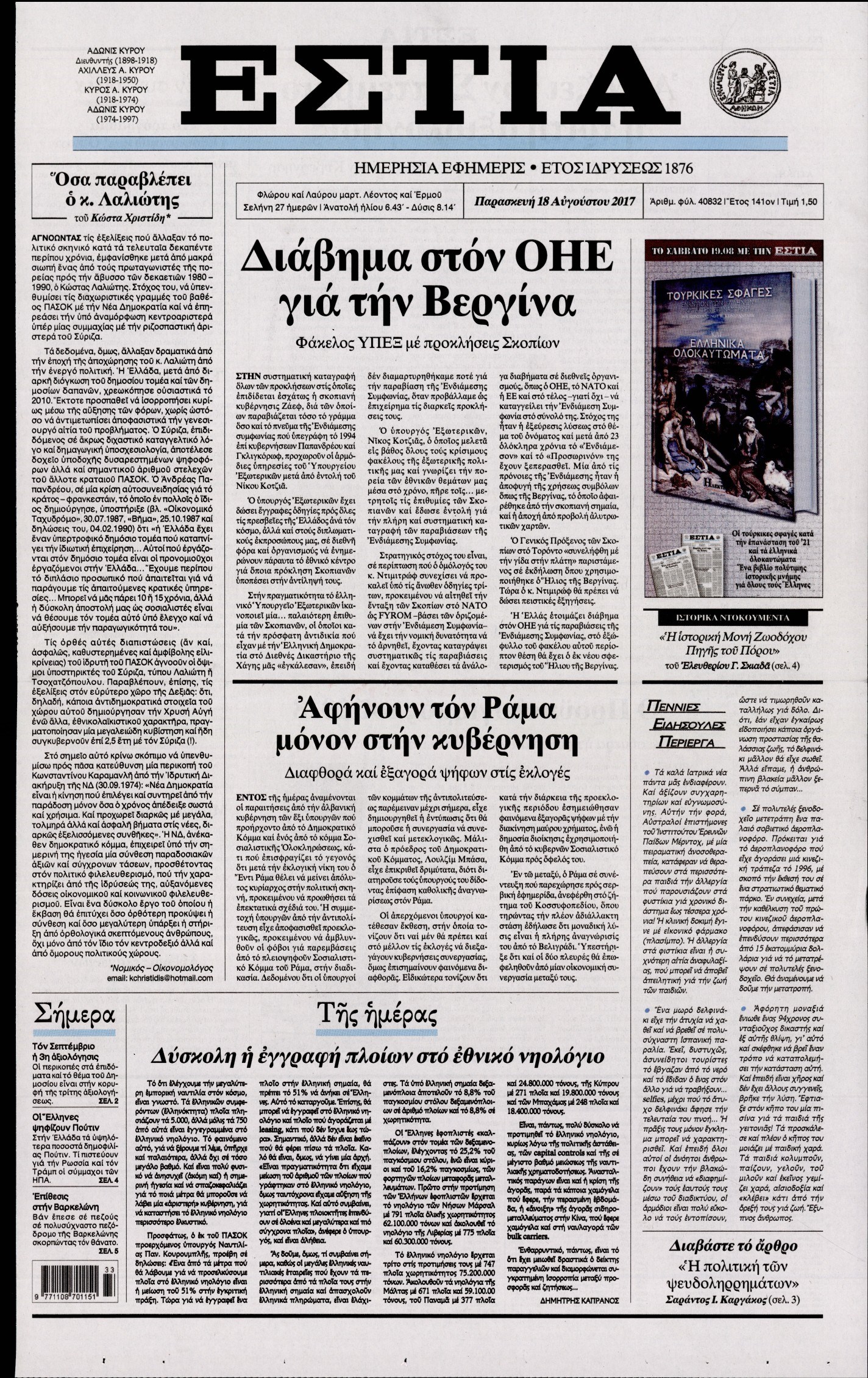 Οι πολιτικές εφημερίδες 18/8/2017 Enikos Newsroom 07:30, Παρασκευή 18 Αυγούστου 2017 Media Διαβάστε τα σημερινά πρωτοσέλιδα των πολιτικών εφημερίδων: ΠΟΛΙΤΙΚΕΣ ΕΦΗΜΕΡΙΔΕΣ ΠΡΩΤΟΣΕΛΙΔΑ Μοιράσου το: σχολίασε κι εσύ (0 σχόλια) Ακολουθήστε το enikos.gr στο Google News και μάθετε πρώτοι όλες τις ειδήσεις Δείτε όλες τις τελευταίες ειδήσεις από την Ελλάδα και τον Κόσμο στο enikos.gr Ειδήσεις Ροή Ειδήσεων 2 λεπτά πριν Καμία «ανακωχή» για τους αγρότες: Γενική συνέλευση σήμερα στο μπλόκο της Νίκαιας – Ο σχεδιασμός για ανοιχτούς δρόμους τα Χριστούγεννα 8 ώρες πριν Ρετζέπ Ταγίπ Ερντογάν: Δεν έχουμε καμία βλέψη στα εδάφη ή την κυριαρχία κανενός – Δεν θα επιτρέψουμε να παραβιαστούν τα δικαιώματά μας 55 λεπτά πριν LEGEND: Ο διάδοχος της φρεγάτας Constellation έρχεται από την ακτοφυλακή των ΗΠΑ 23 λεπτά πριν Τζορτζ Κλούνεϊ: Πέθανε η αδελφή του, Άντα Ζάιντλερ – «Η ηρωίδα μου» 9 ώρες πριν Αρχεία Επστάιν: Οι 500 σελίδες που λείπουν, τα αναπάντητα ερωτήματα και οι επώνυμοι – Τι έπεται 2 ώρες πριν Οπτική ψευδαίσθηση: Μόνο το 2% των ανθρώπων θα βρει την πεταλούδα σε 15 δευτερόλεπτα 2 ώρες πριν Μήλο vs μπανάνα: Ποιο φρούτο έχει περισσότερες φυτικές ίνες, σύμφωνα με διαιτολόγους – Τα οφέλη τους για την υγεία 3 ώρες πριν Τα ζώδια σήμερα, Κυριακή 21 Δεκεμβρίου: Αιγόκεροι, αποφασίζετε για το επόμενο κεφάλαιο της ζωής σας 23 ώρες πριν Enerwave: Το νέο «ρεύμα» στη λιανική ενέργειας που αλλάζει την εμπειρία του καταναλωτή 2 λεπτά πριν Καμία «ανακωχή» για τους αγρότες: Γενική συνέλευση σήμερα στο μπλόκο της Νίκαιας – Ο σχεδιασμός για ανοιχτούς δρόμους τα Χριστούγεννα 4 λεπτά πριν Άγιος έρωτας: Ένας καταστροφικός σεισμός χτυπά τη Στέρνα 12 λεπτά πριν Συνταγή για σκορδόψωμο – Πώς να φτιάξετε δύο συνοδευτικά με τσένταρ και πιπεριές 17 λεπτά πριν Σήμερα με τη Realnews: Ό,τι και αν αγοράσεις, σκανάρεις και κερδίζεις! 23 λεπτά πριν Τζορτζ Κλούνεϊ: Πέθανε η αδελφή του, Άντα Ζάιντλερ – «Η ηρωίδα μου» ENIKOS NETWORK Λίπος στο συκώτι: Τα καλύτερα και τα χειρότερα ροφήματα για το λιπώδες ήπαρ Τεστ προσωπικότητας: Είναι το πρόσωπό σας οβάλ, τετράγωνο, στρογγυλό ή σε σχήμα καρδιάς – Τι σημαίνει; Πρωτοχρονιά 2026: Πόσο κοστίζει φέτος η βασιλόπιτα «Πολεμική» προετοιμασία από την ευρωπαϊκή βιομηχανία ενέργειας – Η Eurelectric ζητεί «ομπρέλα» προστασίας για τις υποδομές Χαρτογραφώντας το «σημείο χωρίς επιστροφή»: Για πρώτη φορά αποκαλύπτεται με λεπτομέρεια το ακανθώδες όριο της ατμόσφαιρας τ... Η Google καταργεί τη λειτουργία «dark web report» – Πώς θα μπορούν οι χρήστες να διαγράφουν τα δεδομένα τους περισσότερα 08:13 , Κυριακή 21 Δεκεμβρίου 2025 Άγιος έρωτας: Ένας καταστροφικός σεισμός χτυπά τη Στέρνα Καταιγιστικές είναι οι εξελίξεις στα δυο τελευταία, συγκλονιστικά επεισόδια του 2025 της σειρά... 08:00 , Κυριακή 21 Δεκεμβρίου 2025 Σήμερα με τη Realnews: Ό,τι και αν αγοράσεις, σκανάρεις και κερδίζεις! Σήμερα με τη Realnews: Ό,τι και αν αγοράσεις, σκανάρεις και κερδίζεις! Με το PADU app, το κορυ... 07:00 , Κυριακή 21 Δεκεμβρίου 2025 Σήμερα με τη Realnews: Instyle, μαζί Drive και Realnews Geopolitics Σήμερα με τη Realnews: Instyle, μαζί Drive και Realnews Geopolitics Instyle Η Άννα Ρεζάν, η Ch... 06:55 , Κυριακή 21 Δεκεμβρίου 2025 Η Realnews στο www.pressreader.com Διαβάστε την ψηφιακή έκδοση της εφημερίδας στην οθόνη του κινητού, του tablet και του υπολογισ... ΤΕΛΕΥΤΑΙΕΣ ΕΙΔΗΣΕΙΣ 4 λεπτά πριν Άγιος έρωτας: Ένας καταστροφικός σεισμός χτυπά τη... 12 λεπτά πριν Συνταγή για σκορδόψωμο – Πώς να φτιάξετε δύο... 17 λεπτά πριν Σήμερα με τη Realnews: Ό,τι και αν αγοράσεις, σκανάρεις και... 23 λεπτ