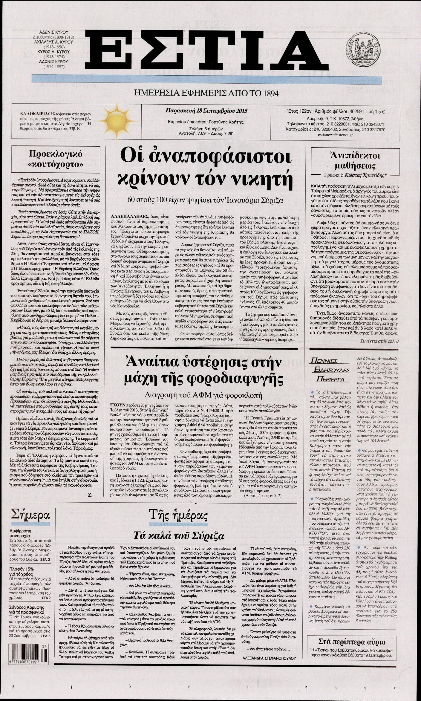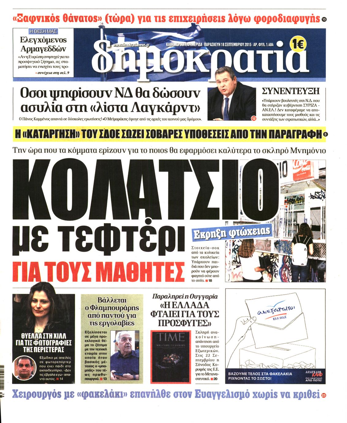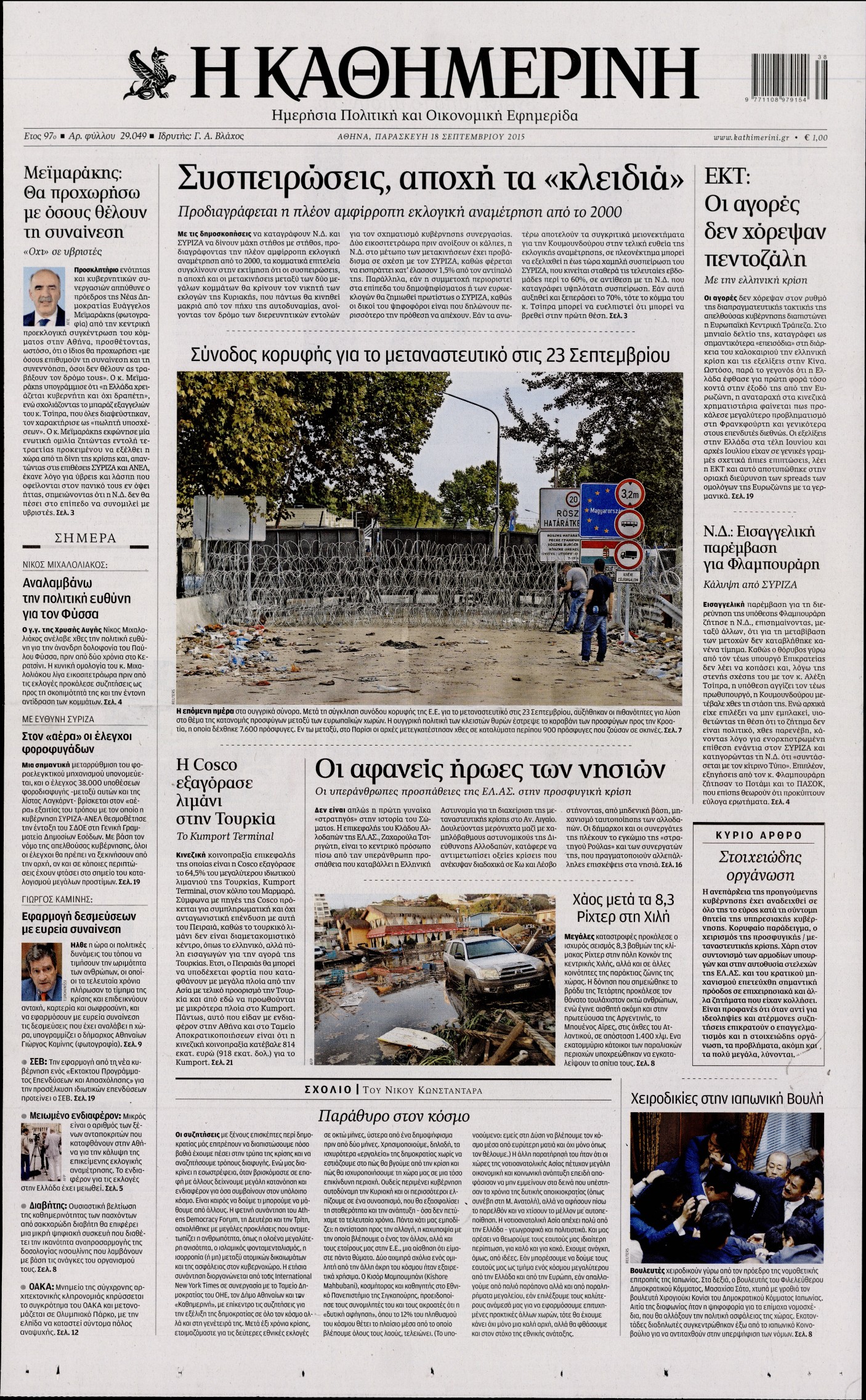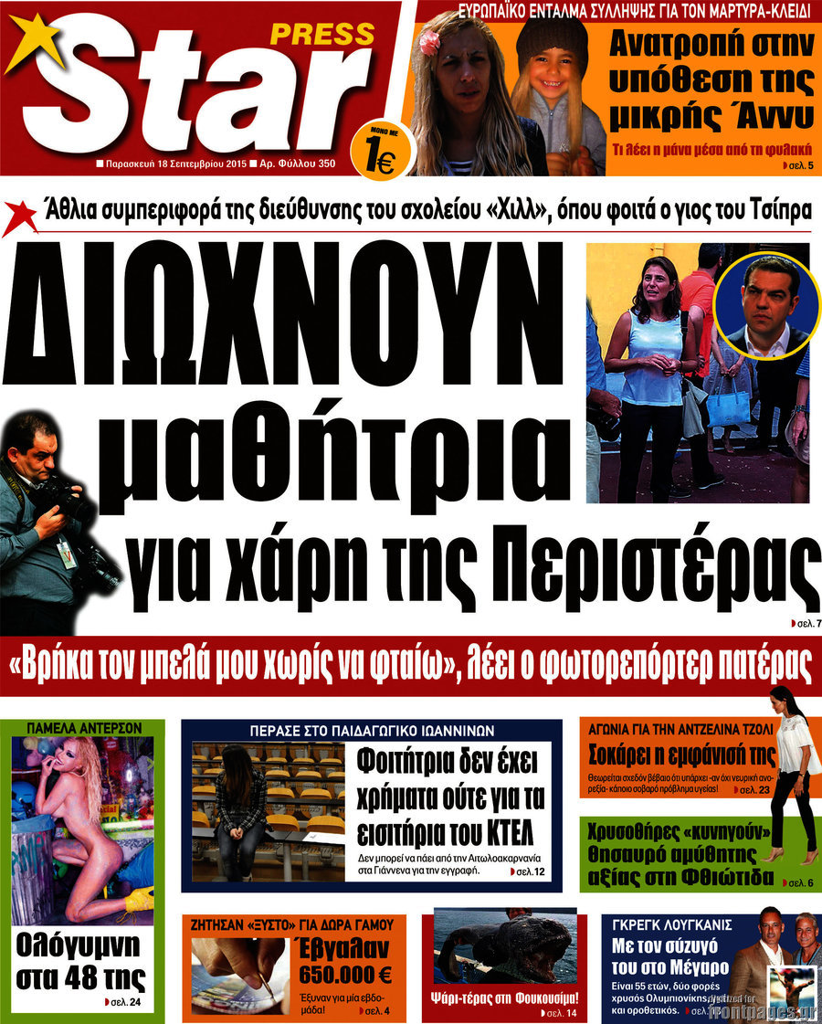 Oι πολιτικές εφημερίδες 18/9/2015 Enikos Newsroom 07:22, Παρασκευή 18 Σεπτεμβρίου 2015 Media Διαβάστε τα σημερινά πρωτοσέλιδα των πολιτικών εφημερίδων: ΠΟΛΙΤΙΚΕΣ ΕΦΗΜΕΡΙΔΕΣ ΠΡΩΤΟΣΕΛΙΔΑ Μοιράσου το: σχολίασε κι εσύ (0 σχόλια) Ακολουθήστε το enikos.gr στο Google News και μάθετε πρώτοι όλες τις ειδήσεις Δείτε όλες τις τελευταίες ειδήσεις από την Ελλάδα και τον Κόσμο στο enikos.gr Ειδήσεις Ροή Ειδήσεων 2 ώρες πριν Χριστούγεννα στα μπλόκα: Επιμένουν στις κινητοποιήσεις τους οι αγρότες – Ανοίγουν τα διόδια το Σαββατοκύριακο 2 ώρες πριν Ουκρανία: Η άνευ προηγουμένου επίθεση σε ρωσικό τάνκερ στη Μεσόγειο και το μήνυμα προς στον Πούτιν – Το «μακρύ χέρι» του Κιέβου 1 ώρα πριν Πούτιν: Τα μηνύματα σε Ευρώπη και ΝΑΤΟ από το μαραθώνιο «σόου» του – Η απαίτηση για «σεβασμό» και η ειρήνη «με τους όρους» της Μόσχας 2 ώρες πριν Τραμπ: Δεν αποκλείει την πιθανότητα ενός πολέμου στη Βενεζουέλα – «Ο Μαδούρο ξέρει καλύτερα από τον καθένα τι ακριβώς θέλω» 3 ώρες πριν Συνεχίζει να προκαλεί ο Μίτσκοσκι: «Για μένα το όνομα Μακεδονία είναι ιερό» 1 ώρα πριν Ανακαλύφθηκαν αρχαία χρυσά νομίσματα 2.200 ετών που απεικονίζουν τον θεό Απόλλωνα – Η άγνωστη σύνδεση με τον Φίλιππο Β΄ της Μακεδονίας 2 ώρες πριν Ύπνος: Μια κρυφή κατάσταση του εγκεφάλου πριν από τον ύπνο μπορεί να είναι το “κλειδί” για υψηλή ευφυΐα και δημιουργικότητα 3 ώρες πριν Αριθμολογία: Οι άνθρωποι που έχουν γεννηθεί αυτές τις 4 ημερομηνίες, συχνά παρεξηγούνται – «Η καλοσύνη τους κρύβει τεράστια δύναμη» 4 ώρες πριν Ξεχάστε το καθάρισμα το Σαββατοκύριακο: Ο «κανόνας των 20 λεπτών» που θα σας λύσει τα χέρια 1 λεπτό πριν Βασίλης Σπανούλης: Δεν εμφανίστηκε ούτε ένας δημοσιογράφος στην συνέντευξη Τύπου – «Καλησπέρα στον… κανέναν», δείτε βίντεο 12 λεπτά πριν Πόλεμος στην Ουκρανία: Εφτά νεκροί από ρωσική πυραυλική επίθεση στο λιμάνι της Οδησσού 16 λεπτά πριν ΗΠΑ: Η κυβέρνηση του Ντόναλντ Τραμπ άρχισε να δημοσιοποιεί τα αρχεία Έπσταϊν 28 λεπτά πριν Σάμος: Άνοιξε το μπλόκο των αγροτών στον κόμβο Κοκκαρίου – Σε νέα συνεδρίαση θα καθορίσουν την στάση τους 36 λεπτά πριν Άνω Λιόσια: Πυροβολισμοί σε επιχείρηση με χαλιά – Εντοπίστηκαν 10 κάλυκες ENIKOS NETWORK Το ΕΚΑΒ τιμήθηκε από την Ακαδημία Αθηνών για τα 40 χρόνια προσφοράς του Έχετε πραγματικά μεγάλη καρδιά; 10 χαρακτηριστικά όσων έχουν καλοσύνη Αναστολή μέτρων αναγκαστικής εκτέλεσης για κτηνοτρόφους που πλήττονται από την ευλογιά των αιγοπροβάτων Πλήρης επάρκεια προϊόντων στις λαϊκές της Αττικής, παρά τις αγροτικές κινητοποιήσεις – Τι απαντούν οι πωλητές Χαρτογραφώντας το «σημείο χωρίς επιστροφή»: Για πρώτη φορά αποκαλύπτεται με λεπτομέρεια το ακανθώδες όριο της ατμόσφαιρας τ... Η Google καταργεί τη λειτουργία «dark web report» – Πώς θα μπορούν οι χρήστες να διαγράφουν τα δεδομένα τους περισσότερα 22:42 , Παρασκευή 19 Δεκεμβρίου 2025 Γιώργος Γιαννόπουλος για “Το σόι σου”: “Είναι ευτυχία και ευλογία αυτή η σειρά” «Είναι ευτυχία και ευλογία η συγκυρία αυτής της σειράς», θα πει ο Γιώργος Γιαννόπουλος -ο αγαπ... 20:37 , Παρασκευή 19 Δεκεμβρίου 2025 Don’t Forget The Lyrics: Η Έλλη Κοκκίνου υποδέχεται 4 παίκτες που θα κάνουν τα πάντα για να μη χάσουν ούτε… μισή λέξη από τους στίχους Το «Don’t Forget The Lyrics» επιστρέφει απόψε, Παρασκευή 19 Δεκεμβρίου, στις 21:00 με νέο επει... 19:31 , Παρασκευή 19 Δεκεμβρίου 2025 GNTM: Απόψε ο μεγάλος τελικός για τους 4 φιναλίστ Έπειτα από μήνες γεμάτους μόδα, δημιουργία και έντονες αναμετρήσεις, το GNTM 2025 κορυφώνεται,... 18:11 , Παρ