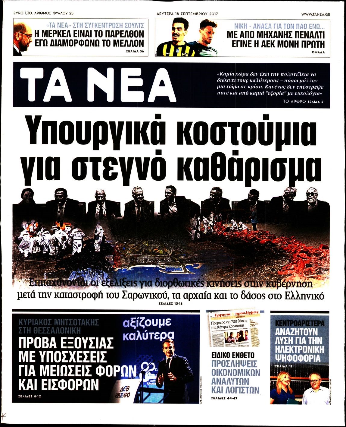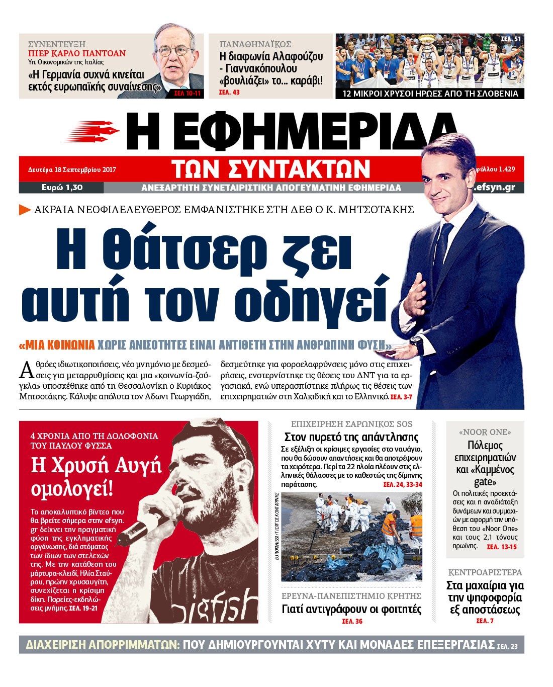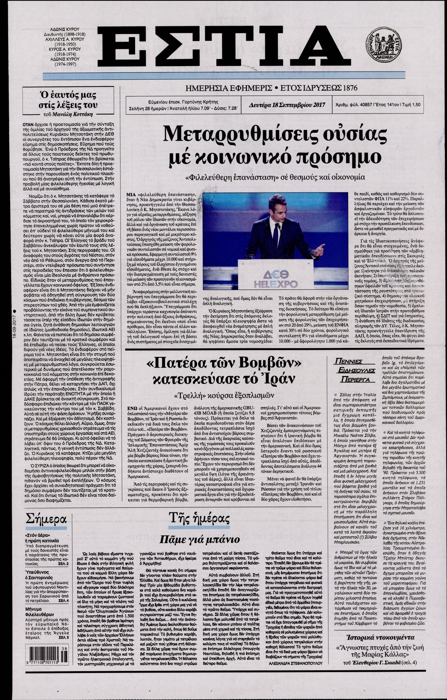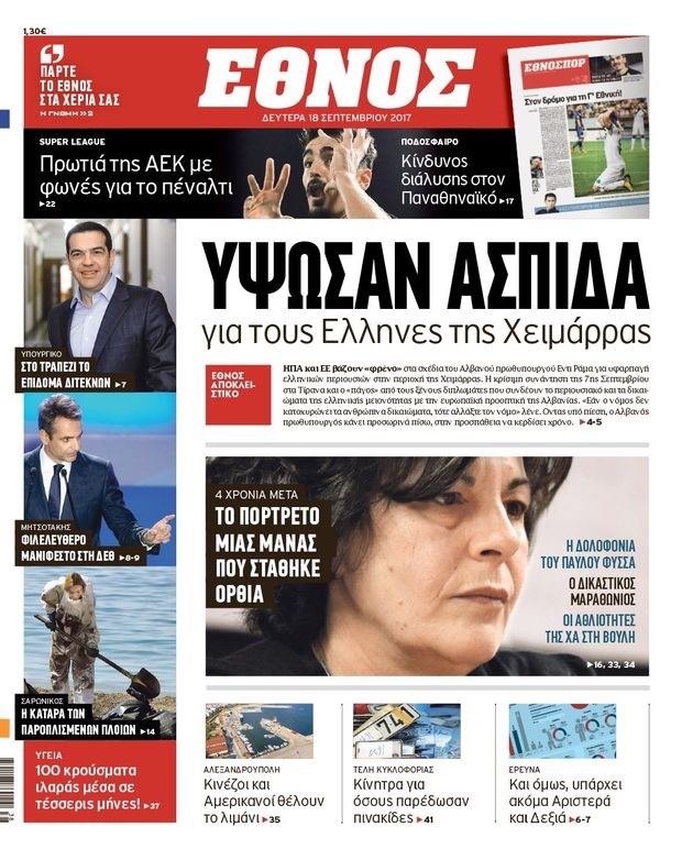 Οι πολιτικές εφημερίδες 18/9/2017 Κώστας Τεό 06:28, Δευτέρα 18 Σεπτεμβρίου 2017 Media Διαβάστε τα σημερινά πρωτοσέλιδα των πολιτικών εφημερίδων: ΠΟΛΙΤΙΚΕΣ ΕΦΗΜΕΡΙΔΕΣ ΠΡΩΤΟΣΕΛΙΔΑ Μοιράσου το: σχολίασε κι εσύ (0 σχόλια) Ακολουθήστε το enikos.gr στο Google News και μάθετε πρώτοι όλες τις ειδήσεις Δείτε όλες τις τελευταίες ειδήσεις από την Ελλάδα και τον Κόσμο στο enikos.gr Ειδήσεις Ροή Ειδήσεων 3 ώρες πριν Χριστούγεννα στα μπλόκα: Επιμένουν στις κινητοποιήσεις τους οι αγρότες – Ανοίγουν τα διόδια το Σαββατοκύριακο 4 ώρες πριν Ουκρανία: Η άνευ προηγουμένου επίθεση σε ρωσικό τάνκερ στη Μεσόγειο και το μήνυμα προς στον Πούτιν – Το «μακρύ χέρι» του Κιέβου 3 ώρες πριν Πούτιν: Τα μηνύματα σε Ευρώπη και ΝΑΤΟ από το μαραθώνιο «σόου» του – Η απαίτηση για «σεβασμό» και η ειρήνη «με τους όρους» της Μόσχας 4 ώρες πριν Τραμπ: Δεν αποκλείει την πιθανότητα ενός πολέμου στη Βενεζουέλα – «Ο Μαδούρο ξέρει καλύτερα από τον καθένα τι ακριβώς θέλω» 5 ώρες πριν Συνεχίζει να προκαλεί ο Μίτσκοσκι: «Για μένα το όνομα Μακεδονία είναι ιερό» 3 ώρες πριν Ανακαλύφθηκαν αρχαία χρυσά νομίσματα 2.200 ετών που απεικονίζουν τον θεό Απόλλωνα – Η άγνωστη σύνδεση με τον Φίλιππο Β΄ της Μακεδονίας 4 ώρες πριν Ύπνος: Μια κρυφή κατάσταση του εγκεφάλου πριν από τον ύπνο μπορεί να είναι το “κλειδί” για υψηλή ευφυΐα και δημιουργικότητα 5 ώρες πριν Αριθμολογία: Οι άνθρωποι που έχουν γεννηθεί αυτές τις 4 ημερομηνίες, συχνά παρεξηγούνται – «Η καλοσύνη τους κρύβει τεράστια δύναμη» 6 ώρες πριν Ξεχάστε το καθάρισμα το Σαββατοκύριακο: Ο «κανόνας των 20 λεπτών» που θα σας λύσει τα χέρια 21 λεπτά πριν Πρόταση γάμου στο ΣΕΦ κατά την διάρκεια του αγώνα Ολυμπιακός-Βιλερμπάν – Δείτε βίντεο 36 λεπτά πριν Euroleague: Επέστρεψε στις νίκες ο Ολυμπιακός, πήρε την ματσάρα της χρονιάς η Μπάρτσα – Τα αποτελέσματα και η βαθμολογία 51 λεπτά πριν Συρία: Μαζικά πλήγματα των ΗΠΑ σε θέσεις του Ισλαμικού Κράτους – Χέγκσεθ: «Δεν είναι αρχή πολέμου, είναι μια δήλωση εκδίκησης» για το θάνατο των στρατιωτών μας 1 ώρα πριν Ουκρανία: Ολοκληρώθηκαν οι συνομιλίες με τους Αμερικανούς κι Ευρωπαίους διαπραγματευτές 1 ώρα πριν Μπαρτσελόνα – Μπασκόνια 134-124: Οι «μπλαουγκράνα» πήραν το ματς της χρονιάς ύστερα από τρεις παρατάσεις ENIKOS NETWORK Το ΕΚΑΒ τιμήθηκε από την Ακαδημία Αθηνών για τα 40 χρόνια προσφοράς του Έχετε πραγματικά μεγάλη καρδιά; 10 χαρακτηριστικά όσων έχουν καλοσύνη Αναστολή μέτρων αναγκαστικής εκτέλεσης για κτηνοτρόφους που πλήττονται από την ευλογιά των αιγοπροβάτων Πλήρης επάρκεια προϊόντων στις λαϊκές της Αττικής, παρά τις αγροτικές κινητοποιήσεις – Τι απαντούν οι πωλητές Χαρτογραφώντας το «σημείο χωρίς επιστροφή»: Για πρώτη φορά αποκαλύπτεται με λεπτομέρεια το ακανθώδες όριο της ατμόσφαιρας τ... Η Google καταργεί τη λειτουργία «dark web report» – Πώς θα μπορούν οι χρήστες να διαγράφουν τα δεδομένα τους περισσότερα 22:42 , Παρασκευή 19 Δεκεμβρίου 2025 Γιώργος Γιαννόπουλος για “Το σόι σου”: “Είναι ευτυχία και ευλογία αυτή η σειρά” «Είναι ευτυχία και ευλογία η συγκυρία αυτής της σειράς», θα πει ο Γιώργος Γιαννόπουλος -ο αγαπ... 20:37 , Παρασκευή 19 Δεκεμβρίου 2025 Don’t Forget The Lyrics: Η Έλλη Κοκκίνου υποδέχεται 4 παίκτες που θα κάνουν τα πάντα για να μη χάσουν ούτε… μισή λέξη από τους στίχους Το «Don’t Forget The Lyrics» επιστρέφει απόψε, Παρασκευή 19 Δεκεμβρίου, στις 21:00 με νέο επει... 19:31 , Παρασκευή 19 Δεκεμβρίου 2025 GNTM: Απόψε ο μεγάλος τελικός για τους 4 φιναλίστ Έπειτα από μήνες 
