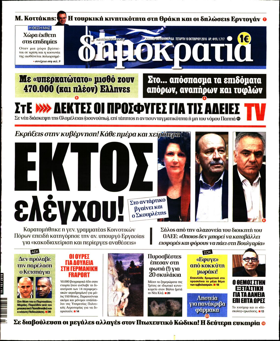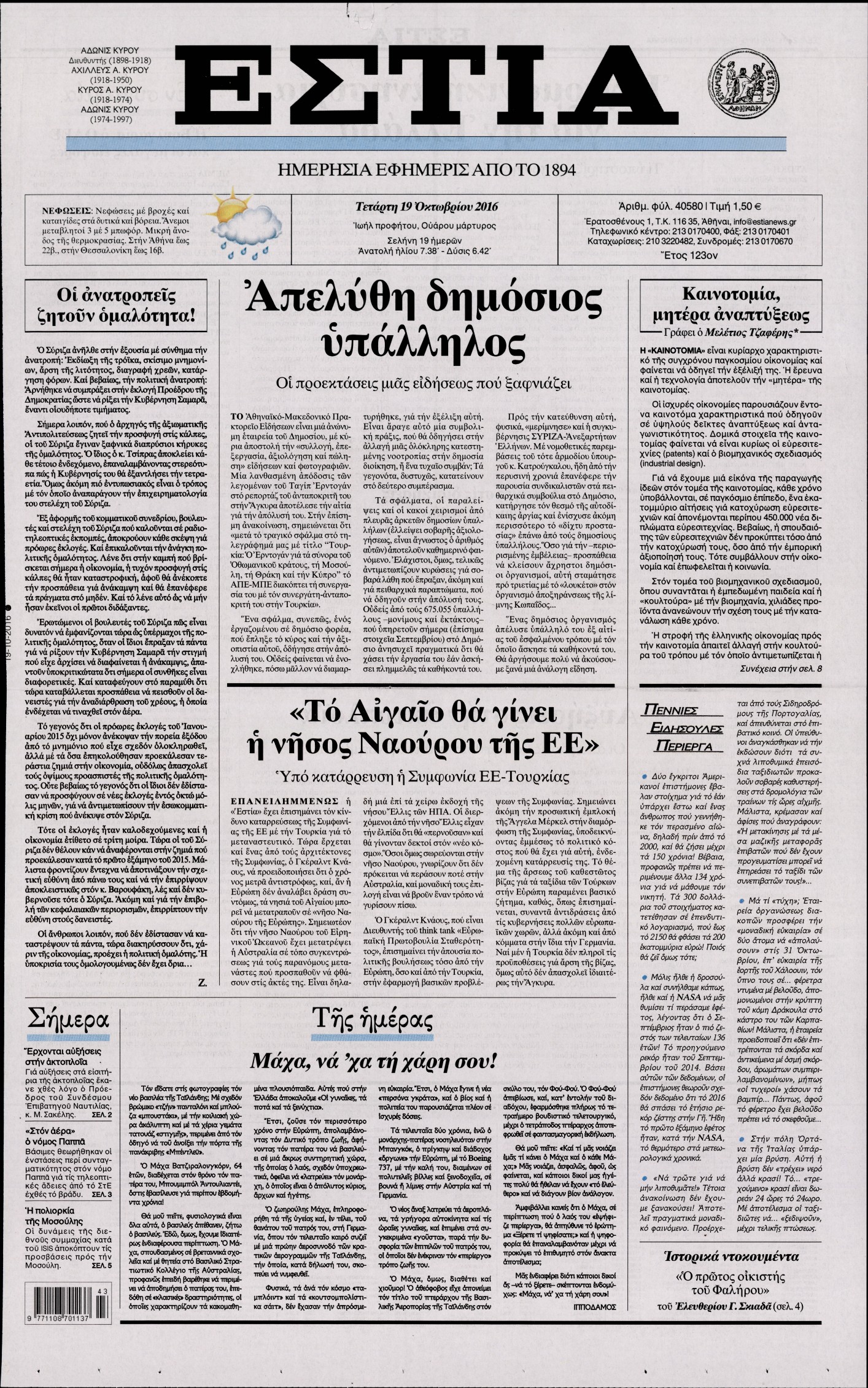 Οι πολιτικές εφημερίδες 19-10-2016 Κώστας Τεό 05:11, Τετάρτη 19 Οκτωβρίου 2016 Media Διαβάστε τα σημερινά πρωτοσέλιδα των πολιτικών εφημερίδων: ΠΟΛΙΤΙΚΕΣ ΕΦΗΜΕΡΙΔΕΣ ΠΡΩΤΟΣΕΛΙΔΑ Μοιράσου το: σχολίασε κι εσύ (0 σχόλια) Ακολουθήστε το enikos.gr στο Google News και μάθετε πρώτοι όλες τις ειδήσεις Δείτε όλες τις τελευταίες ειδήσεις από την Ελλάδα και τον Κόσμο στο enikos.gr Ειδήσεις Ροή Ειδήσεων 1 ώρα πριν Γιορτές με μπλόκα για τους αγρότες: Ανοίγουν διόδια και μοιράζουν προϊόντα στους ταξιδιώτες 2 ώρες πριν Τα αρχεία του Έπσταϊν αποκαλύπτουν φωτογραφία του έκπτωτου πρίγκιπα Άντριου – Είναι ξαπλωμένος στην αγκαλιά 5 γυναικών 48 λεπτά πριν Νέες ταυτότητες: Μεγάλη αναμονή για ραντεβού στην Αττική – Τέλος τα ταξίδια εκτός Ελλάδος από τον Αύγουστο για όσους δεν έχουν αλλάξει 2 ώρες πριν Εξαφάνιση 33χρονου γιατρού στην Κρήτη: «Άναψα τα φώτα, τρόμαξε και άρχισε να τρέχει στα χωράφια» – Η τελευταία διαδρομή και η μαρτυρία «κλειδί» 3 ώρες πριν Ο «χάρτης» με τις αυξήσεις και τις φοροελαφρύνσεις του 2026 – Ποιοι και πόσα κερδίζουν 2 ώρες πριν Μία νέα «χρυσή» περίοδος αρχίζει για 3 ζώδια από σήμερα – «Μία αναπάντεχη ευκαιρία οδηγεί στην επιτυχία» 6 ώρες πριν Αυγά: Πόσα μπορείτε να τρώτε την ημέρα με ασφάλεια για μέγιστη πρόσληψη πρωτεΐνης 4 ώρες πριν Αρχαιολόγοι ανακάλυψαν σε χωράφι απεικόνιση 600 ετών ενός Αγίου – Τα στοιχεία που δείχνουν ότι μαρτύρησε 3 ώρες πριν Αγχώνεται για το χριστουγεννιάτικο δώρο που πήρε στην πλούσια σύντροφό του – «Φοβάμαι πως θα το βρει φθηνιάρικο, φοράει βραχιόλια Cartier» 9 λεπτά πριν Βούλα: Συνελήφθη 24χρονος με 69 κιλά ακατέργαστης κάνναβης – Κυκλοφορούσε με κλεμμένο αυτοκίνητο 17 λεπτά πριν «Η αγάπη δεν χάνεται ποτέ»: Η μικρού μήκους ταινία κινουμένων σχεδίων που θέτει ερωτήματα για τη ζωή και τον θάνατο 25 λεπτά πριν Στέφανος Παπαδόπουλος: Η συνέντευξη μετά τη μήνυση στον Γιώργο Μαζωνάκη – «Δεν θέλω να τα βρούμε εξωδικαστικά» 33 λεπτά πριν Τραγωδία στην άσφαλτο στα Χανιά: Νεκρός 37χρονος οδηγός ΙΧ – Τον βρήκαν ώρες μετά το τροχαίο 41 λεπτά πριν Τα Labubu «μετακομίζουν» στο Χόλιγουντ: Η Sony Pictures ετοιμάζει live-action ταινία με τον σκηνοθέτη του «Wonka» ENIKOS NETWORK Είστε μόνιμα απρόσεκτοι; 3 σημάδια που δείχνουν ότι μπορεί να είναι σύμπτωμα πάθησης Πόσα κιλά παίρνουμε πραγματικά τα Χριστούγεννα, σύμφωνα με την επιστήμη – Πώς να το αποτρέψουμε; e-ΕΦΚΑ και ΔΥΠΑ: Έρχονται νέες πληρωμές έως τις 24 Δεκεμβρίου – Ποιοι πάνε ταμείο Επίδομα παιδιού: Τι αλλάζει από το 2026 – Το όφελος από τις φορολογικές ελαφρύνσεις Χαρτογραφώντας το «σημείο χωρίς επιστροφή»: Για πρώτη φορά αποκαλύπτεται με λεπτομέρεια το ακανθώδες όριο της ατμόσφαιρας τ... Η Google καταργεί τη λειτουργία «dark web report» – Πώς θα μπορούν οι χρήστες να διαγράφουν τα δεδομένα τους περισσότερα 11:41 , Σάββατο 20 Δεκεμβρίου 2025 «Η αγάπη δεν χάνεται ποτέ»: Η μικρού μήκους ταινία κινουμένων σχεδίων που θέτει ερωτήματα για τη ζωή και τον θάνατο Ο θάνατος είναι ένα από τα πιο σκληρά θέματα που καλείται να διαχειριστεί κάποιος στη διάρκεια... 09:30 , Σάββατο 20 Δεκεμβρίου 2025 «Porto Leone: Στη γειτονιά με τα κόκκινα φανάρια» – Ο Χρόνης αποκαλύπτει στην Αλεξάνδρα το μυστικό για το παιδί της Λένας Η μεγάλη δραματική σειρά του Apha «Porto Leone: Στη γειτονιά με τα κόκκινα φανάρια» μας μεταφέ... 08:14 , Σάββατο 20 Δεκεμβρίου 2025 Τρομεροί γονείς: Η Μαρία Καβογιάννη εισβάλλει στο σπίτι της οικογένειας Στεφανίδη Όσα θα δούμε στο νέο διπλό επεισόδιο της σειράς «Τρομερ
