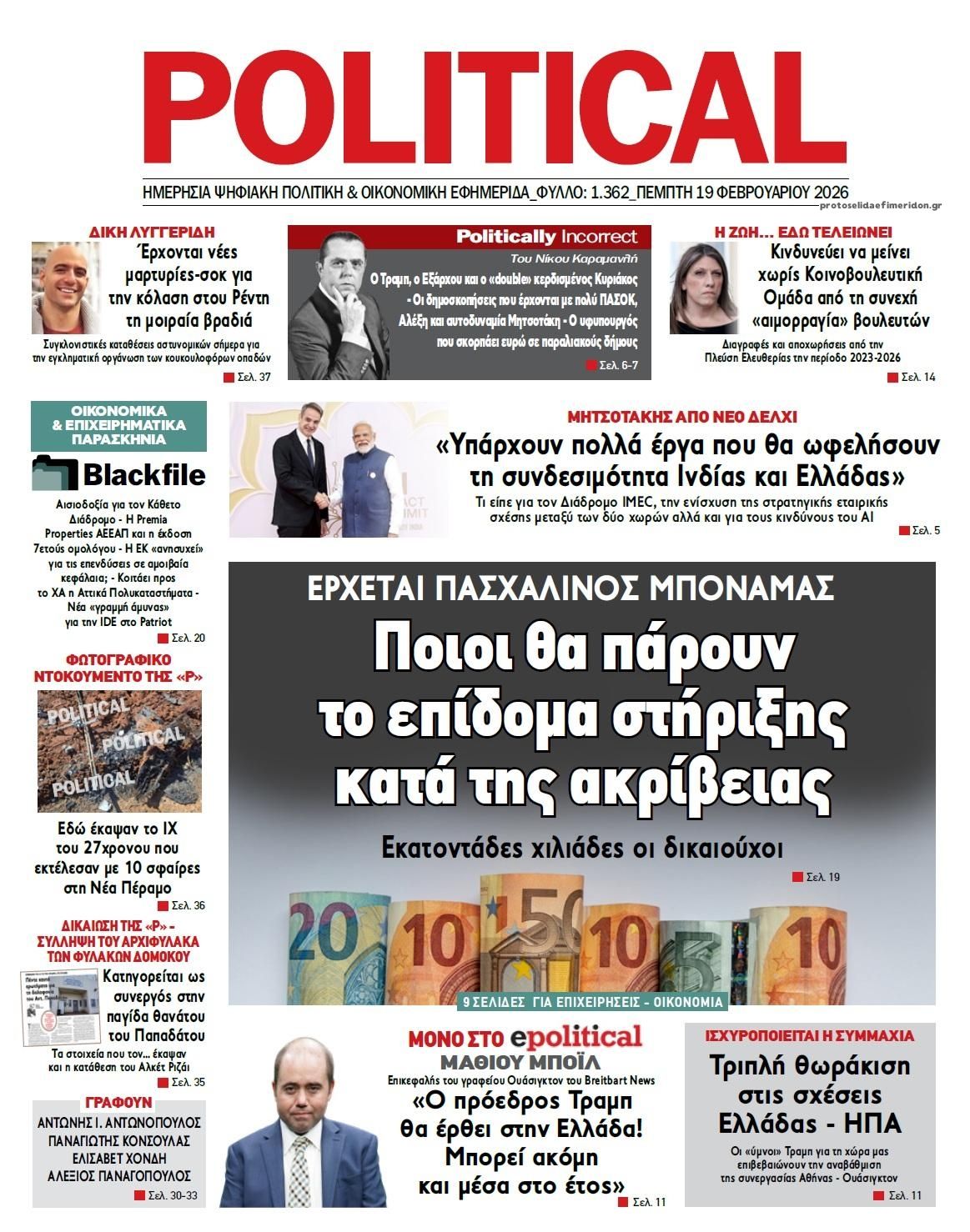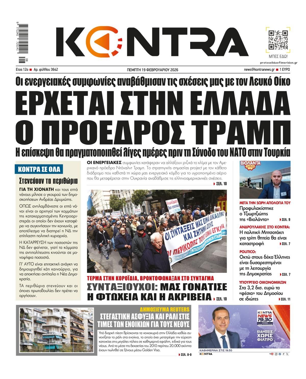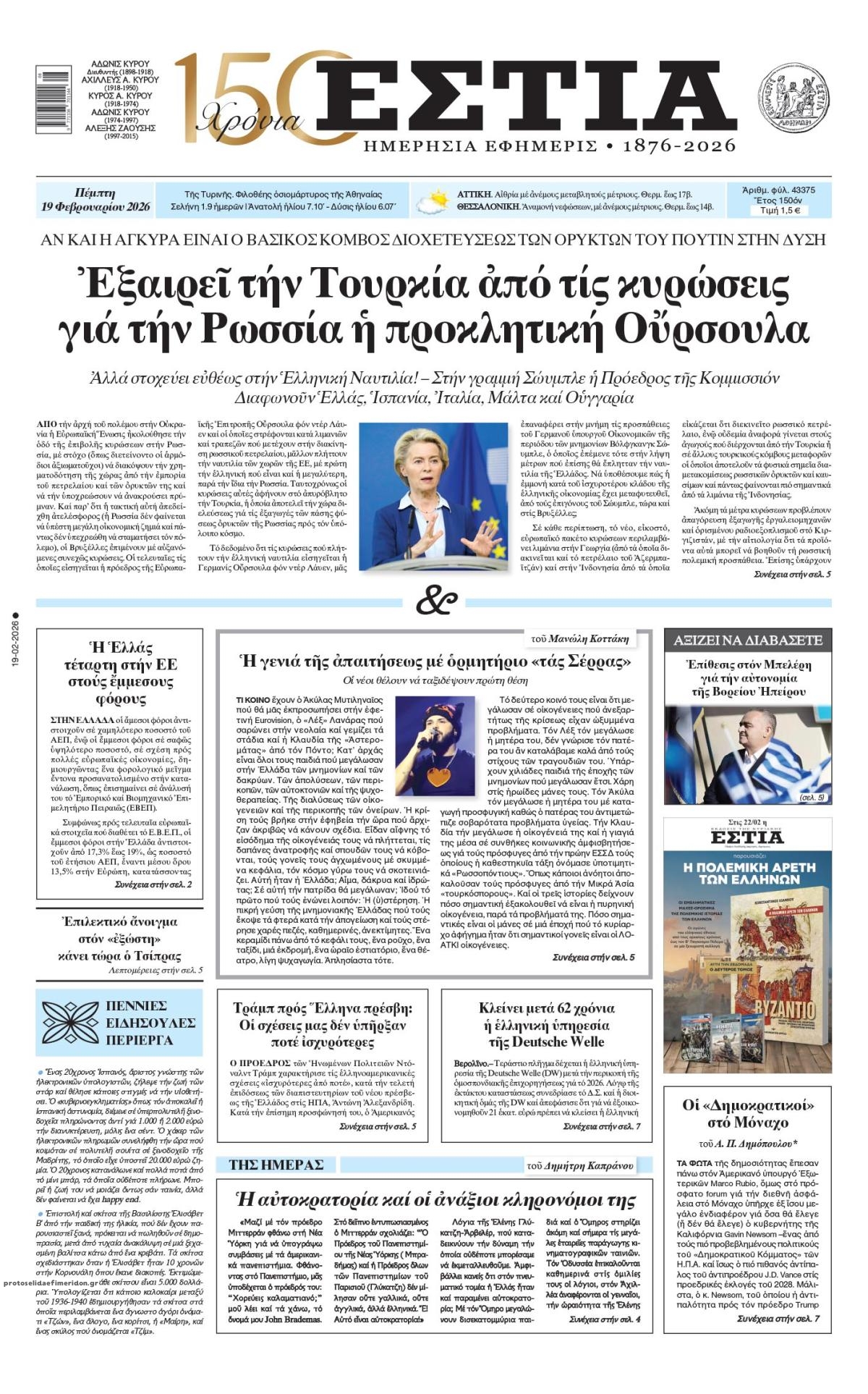 Οι πολιτικές εφημερίδες 19/2/2026 Enikos Newsroom 05:38, Πέμπτη 19 Φεβρουαρίου 2026 Media Διαβάστε τα πρωτοσέλιδα από τις πολιτικές εφημερίδες, σήμερα 19/2/2026. ΕΦΗΜΕΡΙΔΕΣ ΠΟΛΙΤΙΚΕΣ ΕΦΗΜΕΡΙΔΕΣ ΠΡΩΤΟΣΕΛΙΔΑ Μοιράσου το: CNN: Ο αμερικάνικος στρατός είναι έτοιμος για στρατιωτικά πλήγματα στο Ιράν από αυτό το Σαββατοκύριακο – Ο Τραμπ δεν έχει λάβει ακόμα την τελική απόφαση Ισραήλ: Επίσκεψη του Μάρκο Ρούμπιο στις 28 Φεβρουαρίου και συνάντηση με Νετανιάχου εν μέσω κλιμάκωσης της έντασης με Ιράν ΗΠΑ: Προσωρινή αναστολή πτήσεων στο αεροδρόμιο Νιούαρκ – Δείτε βιντεο σχολίασε κι εσύ (0 σχόλια) Ακολουθήστε το enikos.gr στο Google News και μάθετε πρώτοι όλες τις ειδήσεις Δείτε όλες τις τελευταίες ειδήσεις από την Ελλάδα και τον Κόσμο στο enikos.gr Ειδήσεις Ροή Ειδήσεων 1 ώρα πριν Βιολάντα: «Φωτιά» η κατάθεση του μηχανικού που είχε κάνει προσφορά για αλλαγές στις εγκαταστάσεις προπανίου – Οι τεχνικές ελλείψεις και ο κίνδυνος για ακαριαία ανάφλεξη 4 ώρες πριν CNN: Ο αμερικάνικος στρατός είναι έτοιμος για στρατιωτικά πλήγματα στο Ιράν από αυτό το Σαββατοκύριακο – Ο Τραμπ δεν έχει λάβει ακόμα την τελική απόφαση 2 ώρες πριν Έκρηξη στον Κορυδαλλό από χειροβομβίδα αμυντικού τύπου – Ζημιές σε ένα διαμέρισμα και έξι οχήματα 9 ώρες πριν ΟΠΕΚΑ: Πώς στήθηκε η κομπίνα με τα παράνομα επιδόματα – Οι χειρόγραφες αιτήσεις και τα κενά που εκμεταλλεύτηκαν οι εμπλεκόμενοι 9 ώρες πριν Λαμία: Με αλεξίσφαιρο γιλέκο στα δικαστήρια ο αρχιφύλακας των Φυλακών Δομοκού – Θα απολογηθεί την Παρασκευή 8 ώρες πριν Τουρίστες μπορούν να περπατήσουν για πρώτη φορά έπειτα από 2.000 χρόνια τον Δρόμο των Προσκυνητών – Το ιστορικό μονοπάτι χρονολογείται από την εποχή του Ιησού. 10 ώρες πριν Αριθμολογία: Οι άνθρωποι που έχουν γεννηθεί αυτές τις 4 ημερομηνίες, είναι αξιαγάπητοι από τη φύση τους 9 ώρες πριν Έλλειψη ύπνου: Πώς αυξάνει κατακόρυφα τον κίνδυνο βλάβης στις αρθρώσεις, σύμφωνα με μελέτη 19 ώρες πριν Από το χωράφι στο πιάτο χωρίς απώλειες – Το success story της Cantharella στην Καλαμάτα δείχνει τον δρόμο για ένα πιο βιώσιμο μοντέλο λειτουργίας 4 λεπτά πριν Σεισμός 4,2 Rίχτερ στα Φιλιατρά 5 λεπτά πριν Εορτολόγιο: Ποιοι γιορτάζουν σήμερα 19 Φεβρουαρίου 23 λεπτά πριν Ισχυρός σεισμός μεγέθους 5,5 Ρίχτερ στο νότιο Ιράν 39 λεπτά πριν ΔΕΔΔΗΕ: Διακοπές ρεύματος σήμερα (19/2) στην Αθήνα και σε άλλες 13 περιοχές της Αττικής 54 λεπτά πριν Οπτική ψευδαίσθηση: Μόνο αν έχετε παρατηρητικότητα ντετέκτιβ, θα εντοπίσετε το πτηνό στην εικόνα σε 11 δευτερόλεπτα ENIKOS NETWORK Κάποιος μας κοροϊδεύει σε αυτό το τεστ παρατηρητικότητας: Μπορείτε να εντοπίσετε ποιος δεν είναι αληθινός κομμωτής σε 20 δε... Οι σπόροι από τον μύθο της Περσεφόνης που μπορεί να ενισχύσουν τα οστά και είναι πλούσιοι σε αντιοξειδωτικά Κυρανάκης: Με το railway.gov.gr ο σιδηρόδρομος αποκτά μια ισχυρή δικλείδα ασφαλείας που δεν υπήρχε Χρηματιστήριο Αθηνών: Αύξηση κερδών 82,7% το 2025, στα 31,6 εκατ. ευρώ Ευπάθεια στο moltbook ai αποκαλύπτει email, tokens σύνδεσης και api keys Αυτός είναι ο ρόλος της μικρής τρύπας στους νυχοκόπτες – «Είμαι ο μόνος που δεν το ήξερε;»» περισσότερα 05:48 , Πέμπτη 19 Φεβρουαρίου 2026 Οι οικονομικές εφημερίδες 19/2/2026 Διαβάστε τα πρωτοσέλιδα από τις οικονομικές εφημερίδες, σήμερα 19/2/2026. 22:14 , Τετάρτη 18 Φεβρουαρίου 2026 Το Σπίτι Δίπλα Στο Ποτάμι: Ο Οδυσσέας κάνει πρόταση γάμου στη Μαγδαληνή Συγκρούσεις αλλά και δεύτερες ευκαιρίες σε σχέσεις έρχονται στο νέο επεισόδιο της σειράς ̶... 20:30 , Τετάρτη 18 Φεβρουαρίου 202
