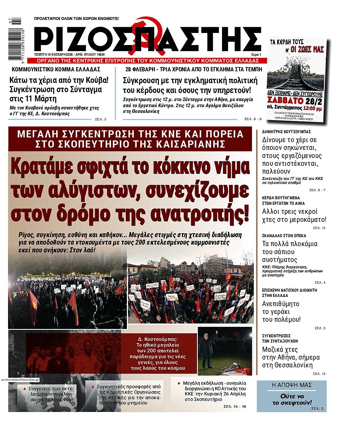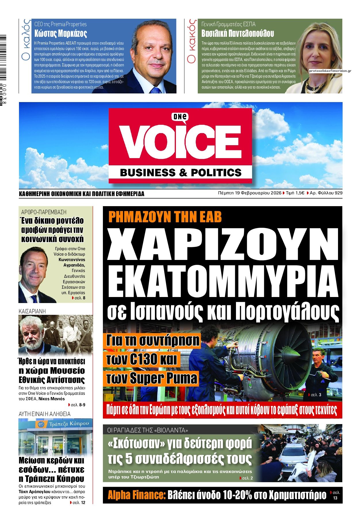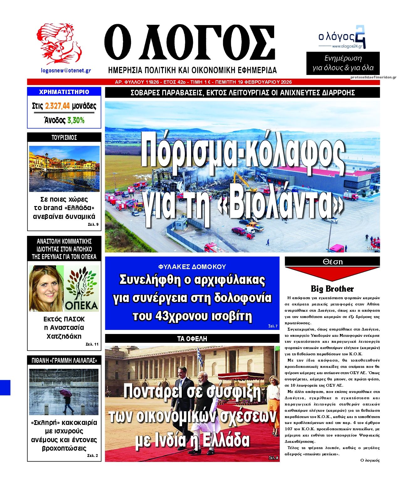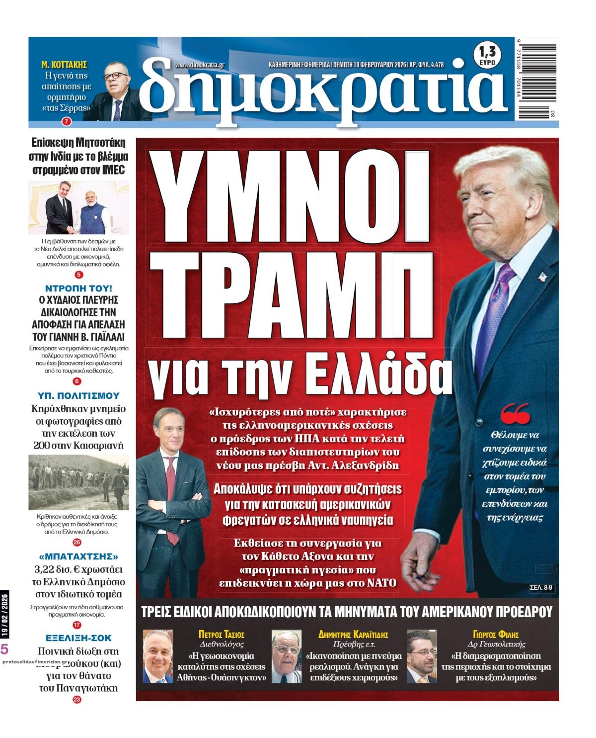 Οι πολιτικές εφημερίδες 19/2/2026 Enikos Newsroom 05:38, Πέμπτη 19 Φεβρουαρίου 2026 Media Διαβάστε τα πρωτοσέλιδα από τις πολιτικές εφημερίδες, σήμερα 19/2/2026. ΕΦΗΜΕΡΙΔΕΣ ΠΟΛΙΤΙΚΕΣ ΕΦΗΜΕΡΙΔΕΣ ΠΡΩΤΟΣΕΛΙΔΑ Μοιράσου το: CNN: Ο αμερικάνικος στρατός είναι έτοιμος για στρατιωτικά πλήγματα στο Ιράν από αυτό το Σαββατοκύριακο – Ο Τραμπ δεν έχει λάβει ακόμα την τελική απόφαση Ισραήλ: Επίσκεψη του Μάρκο Ρούμπιο στις 28 Φεβρουαρίου και συνάντηση με Νετανιάχου εν μέσω κλιμάκωσης της έντασης με Ιράν ΗΠΑ: Προσωρινή αναστολή πτήσεων στο αεροδρόμιο Νιούαρκ – Δείτε βιντεο σχολίασε κι εσύ (0 σχόλια) Ακολουθήστε το enikos.gr στο Google News και μάθετε πρώτοι όλες τις ειδήσεις Δείτε όλες τις τελευταίες ειδήσεις από την Ελλάδα και τον Κόσμο στο enikos.gr Ειδήσεις Ροή Ειδήσεων 1 ώρα πριν Βιολάντα: «Φωτιά» η κατάθεση του μηχανικού που είχε κάνει προσφορά για αλλαγές στις εγκαταστάσεις προπανίου – Οι τεχνικές ελλείψεις και ο κίνδυνος για ακαριαία ανάφλεξη 4 ώρες πριν CNN: Ο αμερικάνικος στρατός είναι έτοιμος για στρατιωτικά πλήγματα στο Ιράν από αυτό το Σαββατοκύριακο – Ο Τραμπ δεν έχει λάβει ακόμα την τελική απόφαση 2 ώρες πριν Έκρηξη στον Κορυδαλλό από χειροβομβίδα αμυντικού τύπου – Ζημιές σε ένα διαμέρισμα και έξι οχήματα 9 ώρες πριν ΟΠΕΚΑ: Πώς στήθηκε η κομπίνα με τα παράνομα επιδόματα – Οι χειρόγραφες αιτήσεις και τα κενά που εκμεταλλεύτηκαν οι εμπλεκόμενοι 9 ώρες πριν Λαμία: Με αλεξίσφαιρο γιλέκο στα δικαστήρια ο αρχιφύλακας των Φυλακών Δομοκού – Θα απολογηθεί την Παρασκευή 8 ώρες πριν Τουρίστες μπορούν να περπατήσουν για πρώτη φορά έπειτα από 2.000 χρόνια τον Δρόμο των Προσκυνητών – Το ιστορικό μονοπάτι χρονολογείται από την εποχή του Ιησού. 10 ώρες πριν Αριθμολογία: Οι άνθρωποι που έχουν γεννηθεί αυτές τις 4 ημερομηνίες, είναι αξιαγάπητοι από τη φύση τους 9 ώρες πριν Έλλειψη ύπνου: Πώς αυξάνει κατακόρυφα τον κίνδυνο βλάβης στις αρθρώσεις, σύμφωνα με μελέτη 19 ώρες πριν Από το χωράφι στο πιάτο χωρίς απώλειες – Το success story της Cantharella στην Καλαμάτα δείχνει τον δρόμο για ένα πιο βιώσιμο μοντέλο λειτουργίας 4 λεπτά πριν Σεισμός 4,2 Rίχτερ στα Φιλιατρά 5 λεπτά πριν Εορτολόγιο: Ποιοι γιορτάζουν σήμερα 19 Φεβρουαρίου 23 λεπτά πριν Ισχυρός σεισμός μεγέθους 5,5 Ρίχτερ στο νότιο Ιράν 39 λεπτά πριν ΔΕΔΔΗΕ: Διακοπές ρεύματος σήμερα (19/2) στην Αθήνα και σε άλλες 13 περιοχές της Αττικής 54 λεπτά πριν Οπτική ψευδαίσθηση: Μόνο αν έχετε παρατηρητικότητα ντετέκτιβ, θα εντοπίσετε το πτηνό στην εικόνα σε 11 δευτερόλεπτα ENIKOS NETWORK Κάποιος μας κοροϊδεύει σε αυτό το τεστ παρατηρητικότητας: Μπορείτε να εντοπίσετε ποιος δεν είναι αληθινός κομμωτής σε 20 δε... Οι σπόροι από τον μύθο της Περσεφόνης που μπορεί να ενισχύσουν τα οστά και είναι πλούσιοι σε αντιοξειδωτικά Κυρανάκης: Με το railway.gov.gr ο σιδηρόδρομος αποκτά μια ισχυρή δικλείδα ασφαλείας που δεν υπήρχε Χρηματιστήριο Αθηνών: Αύξηση κερδών 82,7% το 2025, στα 31,6 εκατ. ευρώ Ευπάθεια στο moltbook ai αποκαλύπτει email, tokens σύνδεσης και api keys Αυτός είναι ο ρόλος της μικρής τρύπας στους νυχοκόπτες – «Είμαι ο μόνος που δεν το ήξερε;»» περισσότερα 05:48 , Πέμπτη 19 Φεβρουαρίου 2026 Οι οικονομικές εφημερίδες 19/2/2026 Διαβάστε τα πρωτοσέλιδα από τις οικονομικές εφημερίδες, σήμερα 19/2/2026. 22:14 , Τετάρτη 18 Φεβρουαρίου 2026 Το Σπίτι Δίπλα Στο Ποτάμι: Ο Οδυσσέας κάνει πρόταση γάμου στη Μαγδαληνή Συγκρούσεις αλλά και δεύτερες ευκαιρίες σε σχέσεις έρχονται στο νέο επεισόδιο της σειράς ̶... 20:30 , Τετάρτη 18 Φεβρουαρίου 202