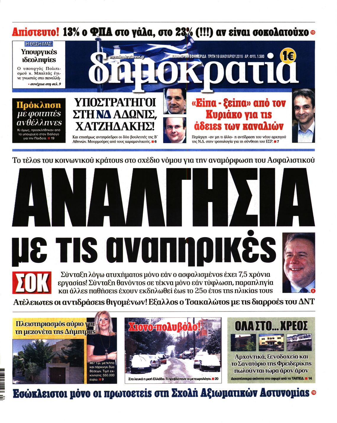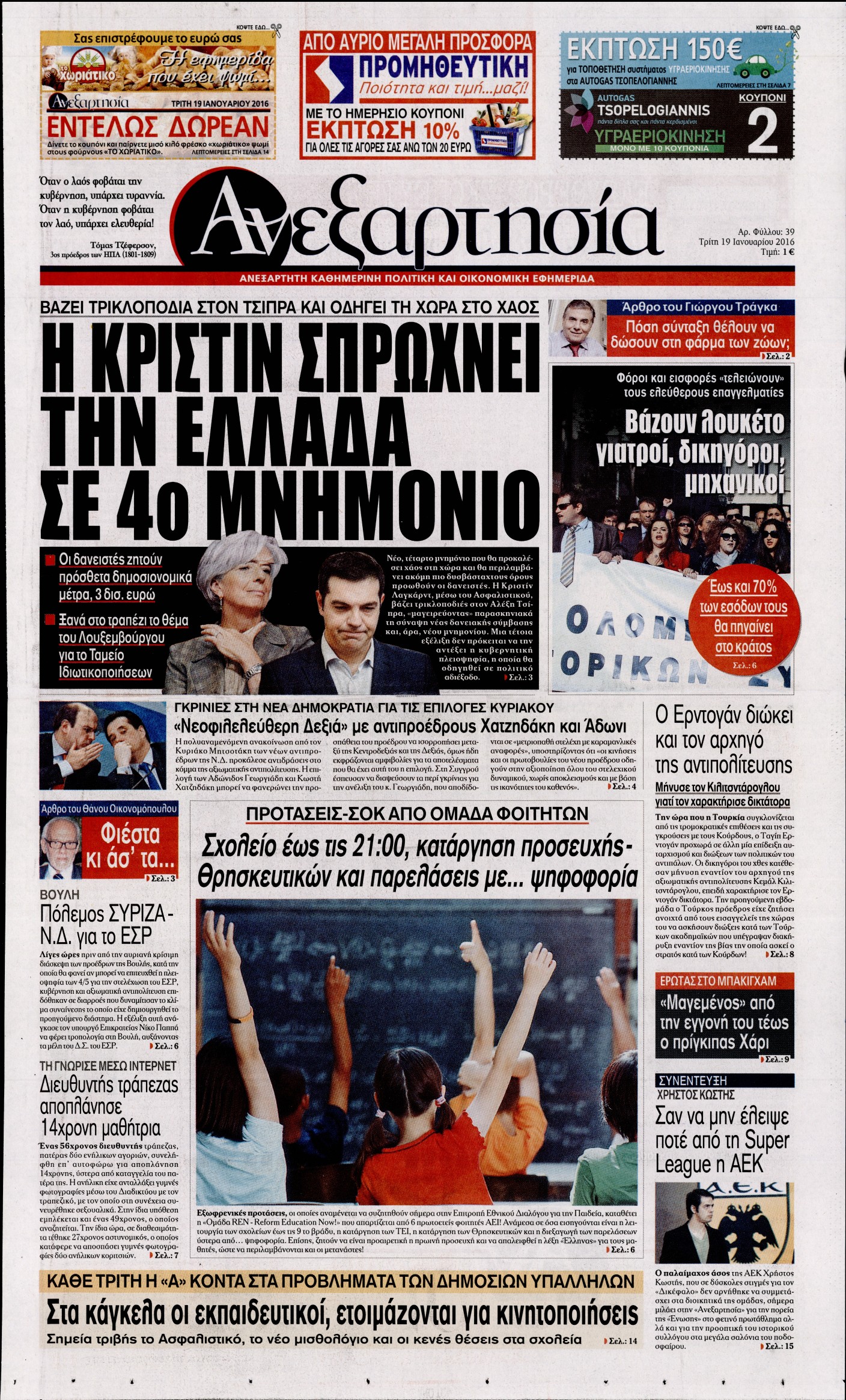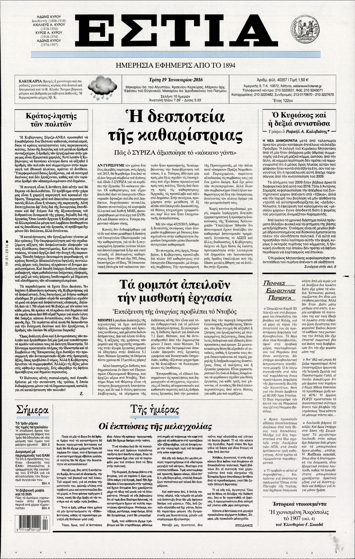 Οι πολιτικές εφημερίδες 19/1/2016 Enikos Newsroom 06:14, Τρίτη 19 Ιανουαρίου 2016 Media Διαβάστε τα σημερινά πρωτοσέλιδα των πολιτικών εφημερίδων: ΠΟΛΙΤΙΚΕΣ ΕΦΗΜΕΡΙΔΕΣ ΠΡΩΤΟΣΕΛΙΔΑ Μοιράσου το: σχολίασε κι εσύ (0 σχόλια) Ακολουθήστε το enikos.gr στο Google News και μάθετε πρώτοι όλες τις ειδήσεις Δείτε όλες τις τελευταίες ειδήσεις από την Ελλάδα και τον Κόσμο στο enikos.gr Ειδήσεις Ροή Ειδήσεων 2 ώρες πριν Μπλόκα: Οι αγρότες σηκώνουν τις μπάρες σε διόδια για τους εκδρομείς των Χριστουγέννων και μοιράζουν προϊόντα – Βίντεο 2 ώρες πριν Τσιάρας προς αγρότες: Τα μπλόκα και τα πείσματα δεν ωφελούν – Οι λύσεις περνούν μέσα από τον διάλογο 3 ώρες πριν Αρχεία Έπσταϊν: Οι συγκλονιστικές φωτογραφίες – Ο Μάικλ Τζάκσον, ο Μικ Τζάγκερ και ο Κέβιν Σπέισι ανάμεσα στους διάσημους που απεικονίζονται 59 λεπτά πριν Μαθητές διακινούσαν κοκαΐνη και χασίς σε σχολείο της Αττικής – 12 συλλήψεις 1 ώρα πριν Βέλγιο: Άγνωστοι έριξαν κόκκινη μπογιά στο προξενείο της Πολωνίας στις Βρυξέλλες 5 ώρες πριν Μία νέα «χρυσή» περίοδος αρχίζει για 3 ζώδια από σήμερα – «Μία αναπάντεχη ευκαιρία οδηγεί στην επιτυχία» 4 ώρες πριν Διαιτολόγος αποκαλύπτει 9 πρωινές συνήθειες που «λιώνουν» το κοιλιακό λίπος – «Υποστηρίζουν την υγιεινή απώλεια βάρους» 5 ώρες πριν Οι 7 φράσεις που δεν λένε ποτέ οι συναισθηματικά έξυπνοι άνθρωποι κατά τη διάρκεια ενός καβγά 7 ώρες πριν Enerwave: Το νέο «ρεύμα» στη λιανική ενέργειας που αλλάζει την εμπειρία του καταναλωτή 7 λεπτά πριν Μαρινάκης στον Realfm 97,8: Η κυβέρνηση σέβεται κάθε λογική διεκδίκηση των αγροτών, αλλά και το αίτημα των πολιτών να μην ταλαιπωρούνται 14 λεπτά πριν O Πάντερ MVP της 17ης αγωνιστικής στην Euroleague 22 λεπτά πριν Πέθανε η τραγουδίστρια Κλαούντια Ντελμέρ 30 λεπτά πριν Μία ανεκμετάλλευτη πηγή θα μπορούσε να προσφέρει ανεξάντλητη ενέργεια – Οι επιστήμονες ίσως γνωρίζουν πώς να την ξεκλειδώσουν 39 λεπτά πριν Θεσσαλονίκη: Ανήλικος που είχε εξαφανιστεί βρέθηκε στο σπίτι Τούρκων μετά από αστυνομική επιχείρηση ENIKOS NETWORK Η αποχή από την αναπαραγωγή παρατείνει τη ζωή στα ζώα, σύμφωνα με μελέτη – Τι ισχύει για τους ανθρώπους; Σημαντικές επαφές στις ΗΠΑ είχε ο υπουργός Υγείας Άδωνις Γεωργιάδης Ευλογιά αιγοπροβάτων: Παρατεταμένη επιζωοτία, αυστηρά μέτρα – Τι ισχύει για τον εμβολιασμό και την ανασύσταση του ζωικού κε... Τσιάρας προς αγρότες: Έχει ικανοποιηθεί το 74% των αιτημάτων – Τα μπλόκα και τα πείσματα δεν ωφελούν Χαρτογραφώντας το «σημείο χωρίς επιστροφή»: Για πρώτη φορά αποκαλύπτεται με λεπτομέρεια το ακανθώδες όριο της ατμόσφαιρας τ... Η Google καταργεί τη λειτουργία «dark web report» – Πώς θα μπορούν οι χρήστες να διαγράφουν τα δεδομένα τους περισσότερα 14:04 , Σάββατο 20 Δεκεμβρίου 2025 Η Realnews αυτής της Κυριακής (21/12/2025) Με τίτλο: «Ασπίδα προστασίας για την Ελλάδα» κυκλοφορεί, αυτήν την Κυριακή, η Realnews. Σημαντ... 12:53 , Σάββατο 20 Δεκεμβρίου 2025 Να μ’ αγαπάς: Το παρελθόν έρχεται στο φως – Καταιγιστικές εξελίξεις στα τελευταία επεισόδια του 2025 Ο Άγγελος αποκαλύπτεται, η Φωτεινή ανησυχεί για τον Λευτέρη και η Ζωή έρχεται αντιμέτωπη με το... 11:41 , Σάββατο 20 Δεκεμβρίου 2025 «Η αγάπη δεν χάνεται ποτέ»: Η μικρού μήκους ταινία κινουμένων σχεδίων που θέτει ερωτήματα για τη ζωή και τον θάνατο Ο θάνατος είναι ένα από τα πιο σκληρά θέματα που καλείται να διαχειριστεί κάποιος στη διάρκεια... 09:30 , Σάββατο 20 Δεκεμβρίου 2025 «Porto Leone: Στη γειτονιά με τα κόκκινα φανάρια» – Ο Χρόνης αποκαλύπτει στην Αλεξάνδρα το μυστικό
