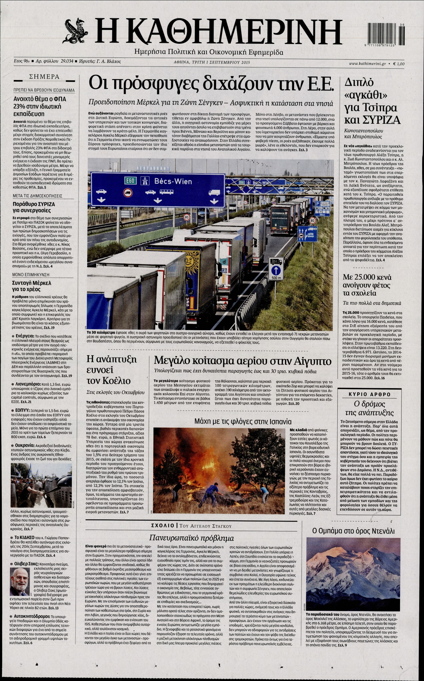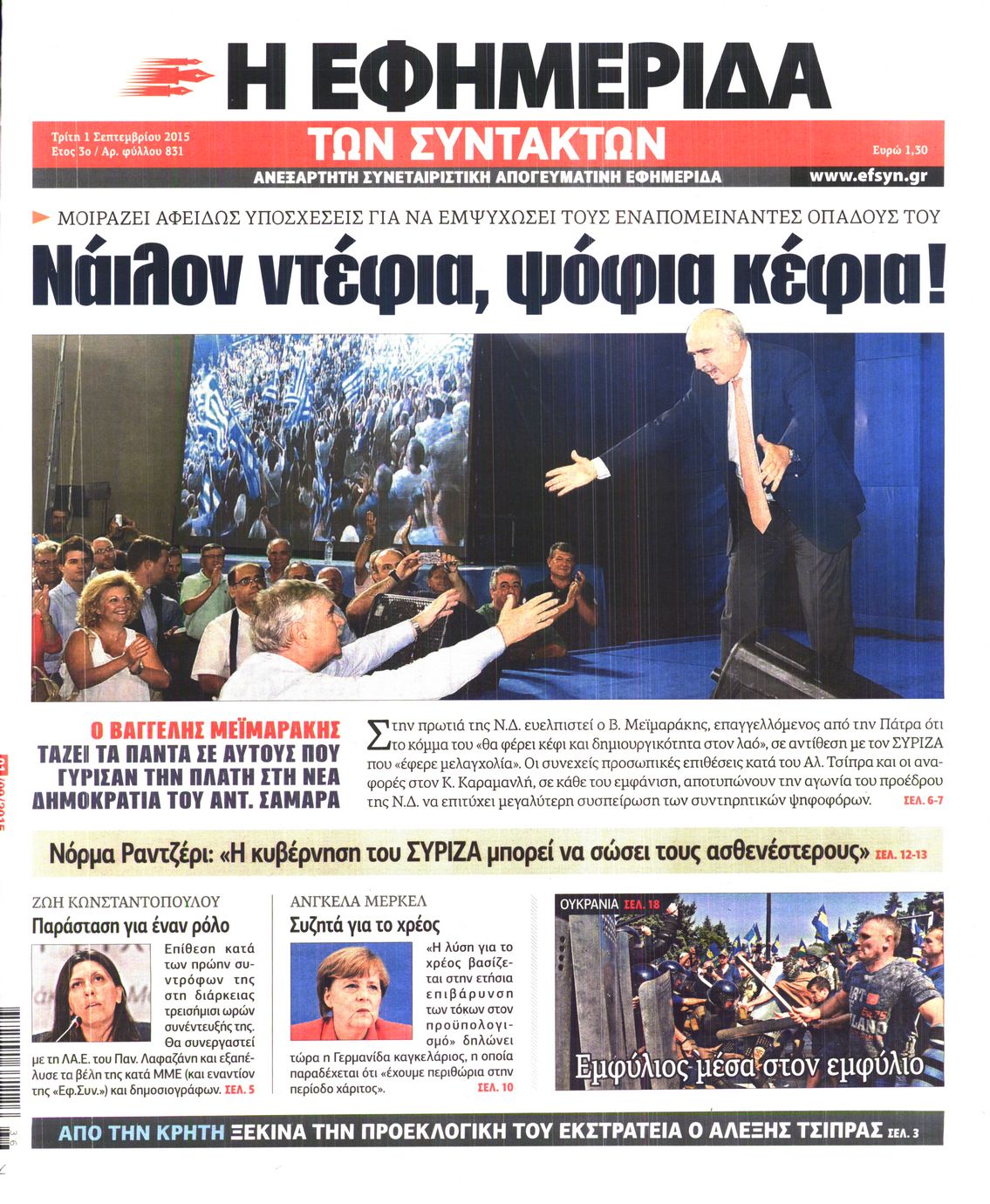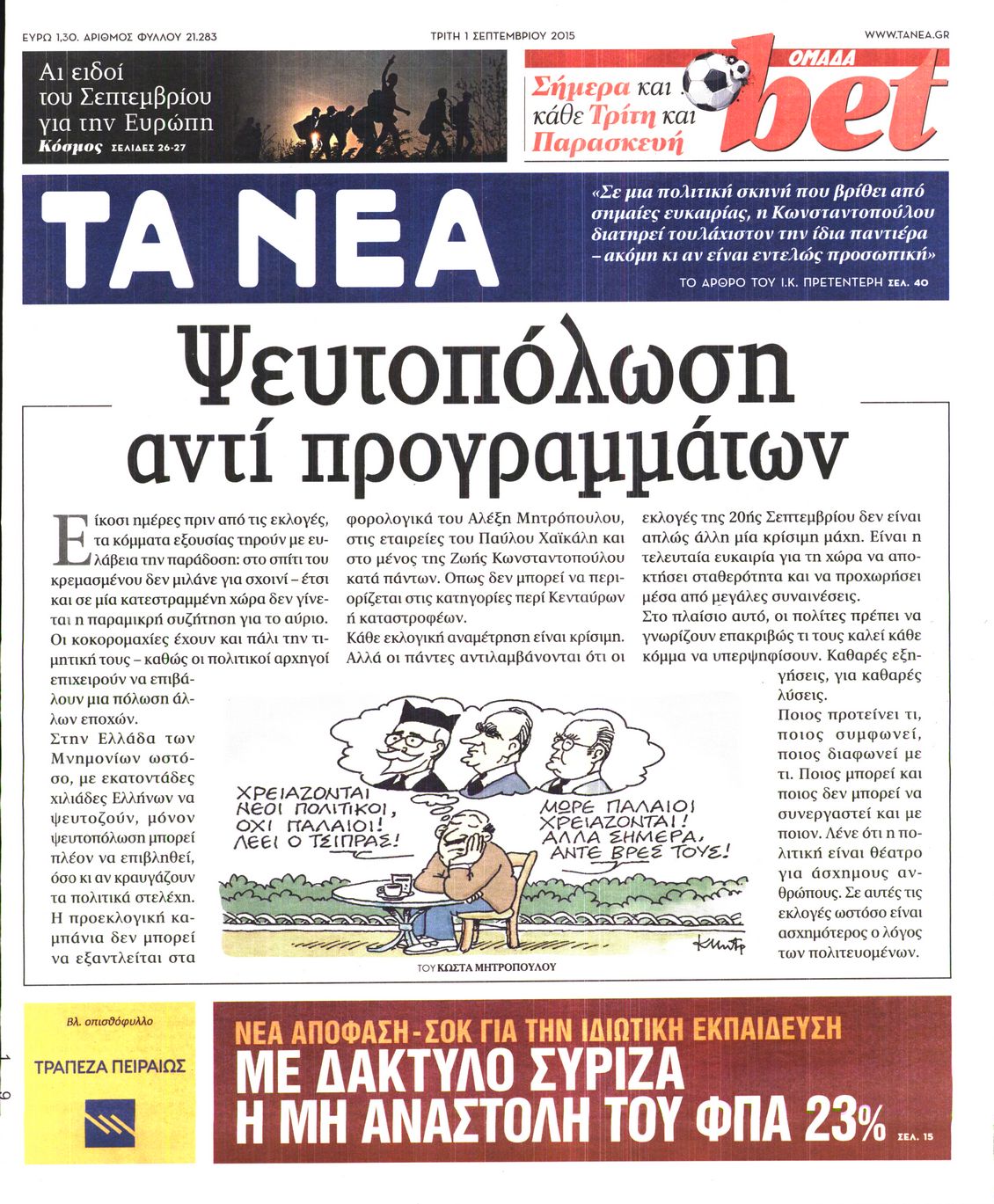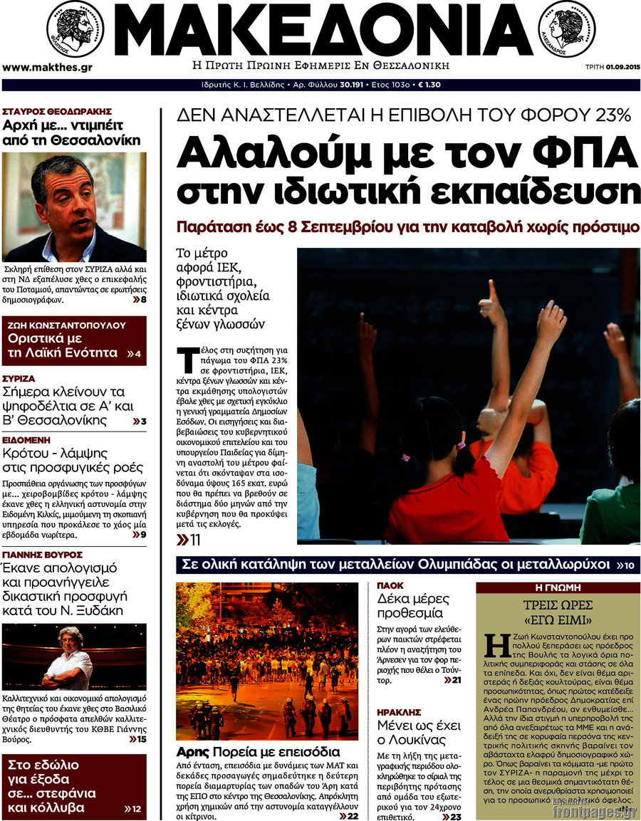 Οι πολιτικές εφημερίδες 1/9/2015 Enikos Newsroom 08:03, Τρίτη 01 Σεπτεμβρίου 2015 Media Διαβάστε τα σημερινά πρωτοσέλιδα των πολιτικών εφημερίδων. ΠΟΛΙΤΙΚΕΣ ΕΦΗΜΕΡΙΔΕΣ ΠΡΩΤΟΣΕΛΙΔΑ Μοιράσου το: σχολίασε κι εσύ (0 σχόλια) Ακολουθήστε το enikos.gr στο Google News και μάθετε πρώτοι όλες τις ειδήσεις Δείτε όλες τις τελευταίες ειδήσεις από την Ελλάδα και τον Κόσμο στο enikos.gr Ειδήσεις Ροή Ειδήσεων 4 ώρες πριν Χριστούγεννα στα μπλόκα: Επιμένουν στις κινητοποιήσεις τους οι αγρότες – Ανοίγουν τα διόδια το Σαββατοκύριακο 5 ώρες πριν Ουκρανία: Η άνευ προηγουμένου επίθεση σε ρωσικό τάνκερ στη Μεσόγειο και το μήνυμα προς στον Πούτιν – Το «μακρύ χέρι» του Κιέβου 4 ώρες πριν Πούτιν: Τα μηνύματα σε Ευρώπη και ΝΑΤΟ από το μαραθώνιο «σόου» του – Η απαίτηση για «σεβασμό» και η ειρήνη «με τους όρους» της Μόσχας 5 ώρες πριν Τραμπ: Δεν αποκλείει την πιθανότητα ενός πολέμου στη Βενεζουέλα – «Ο Μαδούρο ξέρει καλύτερα από τον καθένα τι ακριβώς θέλω» 5 ώρες πριν Συνεχίζει να προκαλεί ο Μίτσκοσκι: «Για μένα το όνομα Μακεδονία είναι ιερό» 4 ώρες πριν Ανακαλύφθηκαν αρχαία χρυσά νομίσματα 2.200 ετών που απεικονίζουν τον θεό Απόλλωνα – Η άγνωστη σύνδεση με τον Φίλιππο Β΄ της Μακεδονίας 5 ώρες πριν Ύπνος: Μια κρυφή κατάσταση του εγκεφάλου πριν από τον ύπνο μπορεί να είναι το “κλειδί” για υψηλή ευφυΐα και δημιουργικότητα 6 ώρες πριν Αριθμολογία: Οι άνθρωποι που έχουν γεννηθεί αυτές τις 4 ημερομηνίες, συχνά παρεξηγούνται – «Η καλοσύνη τους κρύβει τεράστια δύναμη» 7 ώρες πριν Ξεχάστε το καθάρισμα το Σαββατοκύριακο: Ο «κανόνας των 20 λεπτών» που θα σας λύσει τα χέρια 15 λεπτά πριν Θεσσαλονίκη: Εξαφανίστηκε 13χρονος από χώρο φιλοξενίας ασυνόδευτων ανηλίκων στο Ωραιόκαστρο 26 λεπτά πριν Ντόναλντ Τραμπ: «Πολύ βαριά αντίποινα» στη Συρία – «Πλήττουμε πολύ δυνατά οχυρά του Ισλαμικού Κράτους» 40 λεπτά πριν Εξάρχεια: Ένταση με μολότοφ, χημικά και κρότου λάμψης 56 λεπτά πριν ΗΠΑ: Τραγωδία στην Αλαμπάμα – Σκότωσε την δημοσιογράφο σύζυγό του και αυτοκτόνησε μπροστά στον 3χρονο γιο τους 1 ώρα πριν Πρόταση γάμου στο ΣΕΦ κατά την διάρκεια του αγώνα Ολυμπιακός-Βιλερμπάν – Δείτε βίντεο ENIKOS NETWORK Το ΕΚΑΒ τιμήθηκε από την Ακαδημία Αθηνών για τα 40 χρόνια προσφοράς του Έχετε πραγματικά μεγάλη καρδιά; 10 χαρακτηριστικά όσων έχουν καλοσύνη Αναστολή μέτρων αναγκαστικής εκτέλεσης για κτηνοτρόφους που πλήττονται από την ευλογιά των αιγοπροβάτων Πλήρης επάρκεια προϊόντων στις λαϊκές της Αττικής, παρά τις αγροτικές κινητοποιήσεις – Τι απαντούν οι πωλητές Χαρτογραφώντας το «σημείο χωρίς επιστροφή»: Για πρώτη φορά αποκαλύπτεται με λεπτομέρεια το ακανθώδες όριο της ατμόσφαιρας τ... Η Google καταργεί τη λειτουργία «dark web report» – Πώς θα μπορούν οι χρήστες να διαγράφουν τα δεδομένα τους περισσότερα 22:42 , Παρασκευή 19 Δεκεμβρίου 2025 Γιώργος Γιαννόπουλος για “Το σόι σου”: “Είναι ευτυχία και ευλογία αυτή η σειρά” «Είναι ευτυχία και ευλογία η συγκυρία αυτής της σειράς», θα πει ο Γιώργος Γιαννόπουλος -ο αγαπ... 20:37 , Παρασκευή 19 Δεκεμβρίου 2025 Don’t Forget The Lyrics: Η Έλλη Κοκκίνου υποδέχεται 4 παίκτες που θα κάνουν τα πάντα για να μη χάσουν ούτε… μισή λέξη από τους στίχους Το «Don’t Forget The Lyrics» επιστρέφει απόψε, Παρασκευή 19 Δεκεμβρίου, στις 21:00 με νέο επει... 19:31 , Παρασκευή 19 Δεκεμβρίου 2025 GNTM: Απόψε ο μεγάλος τελικός για τους 4 φιναλίστ Έπειτα από μήνες γεμάτους μόδα, δημιουργία και έντονες αναμετρήσεις, το GNTM 2025 κορυφώνεται,... 18:11 , Παρασκευή 19 Δεκεμβρίου 2025 Τ